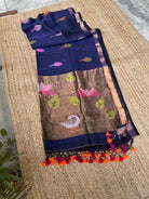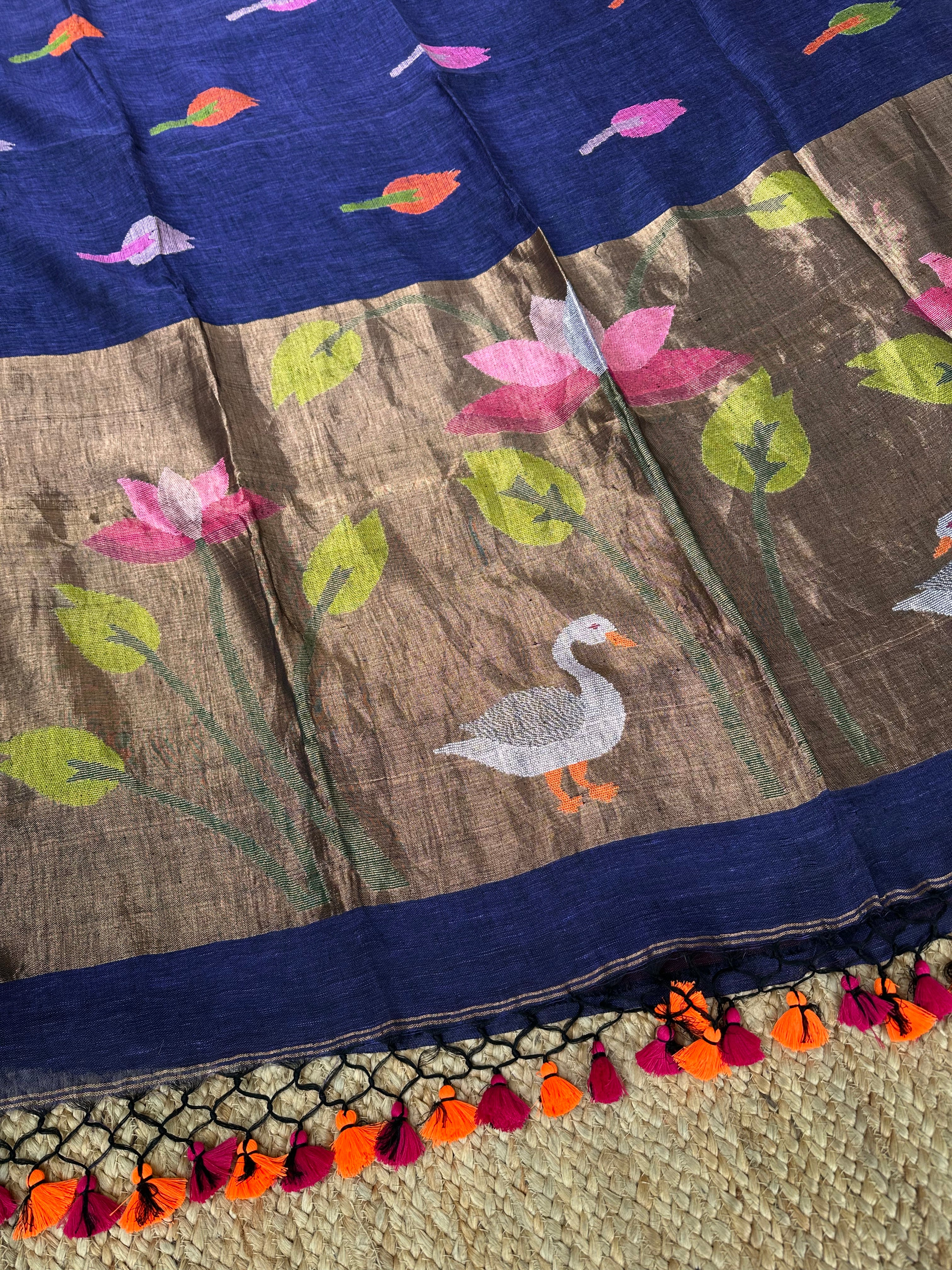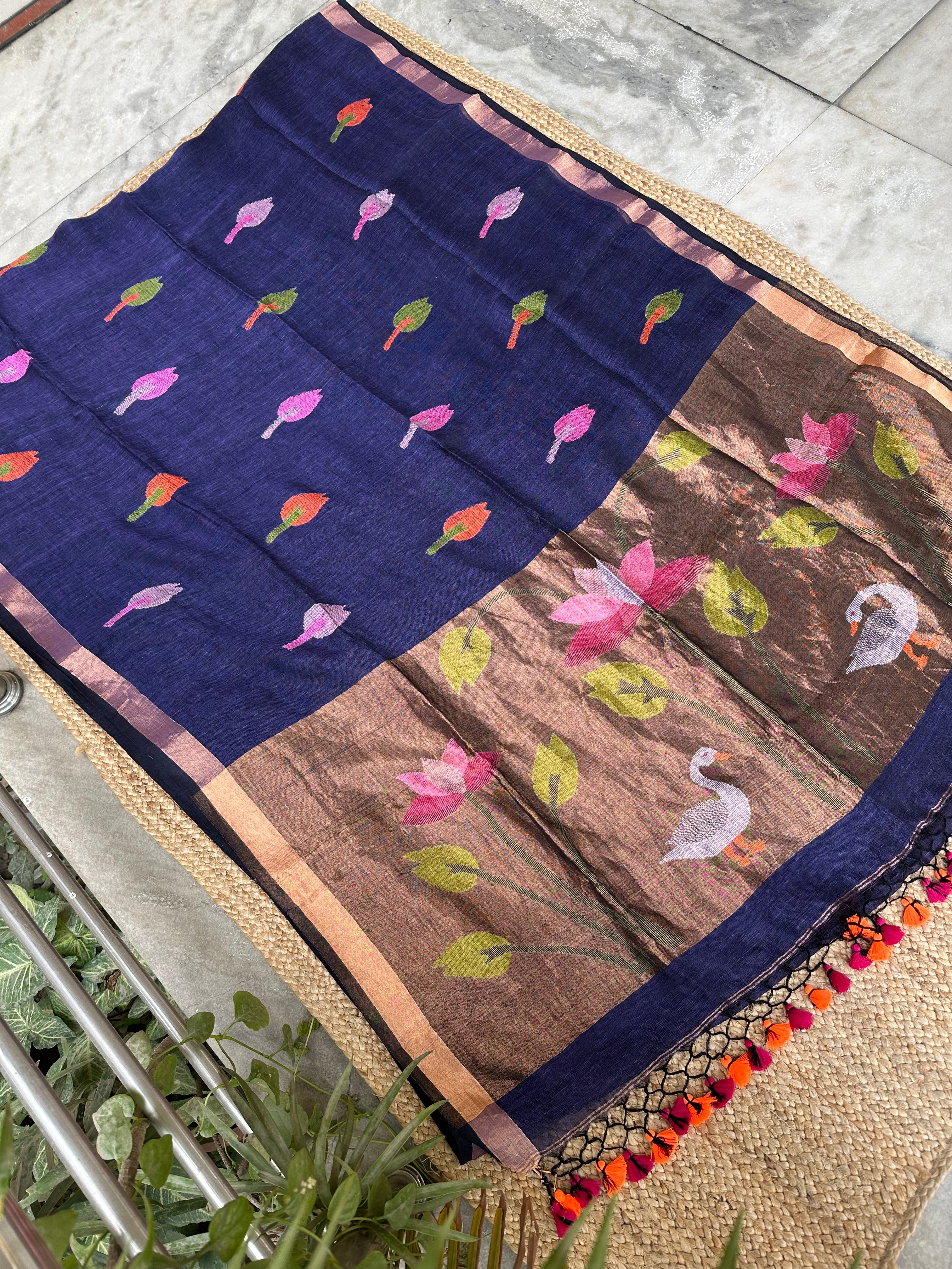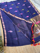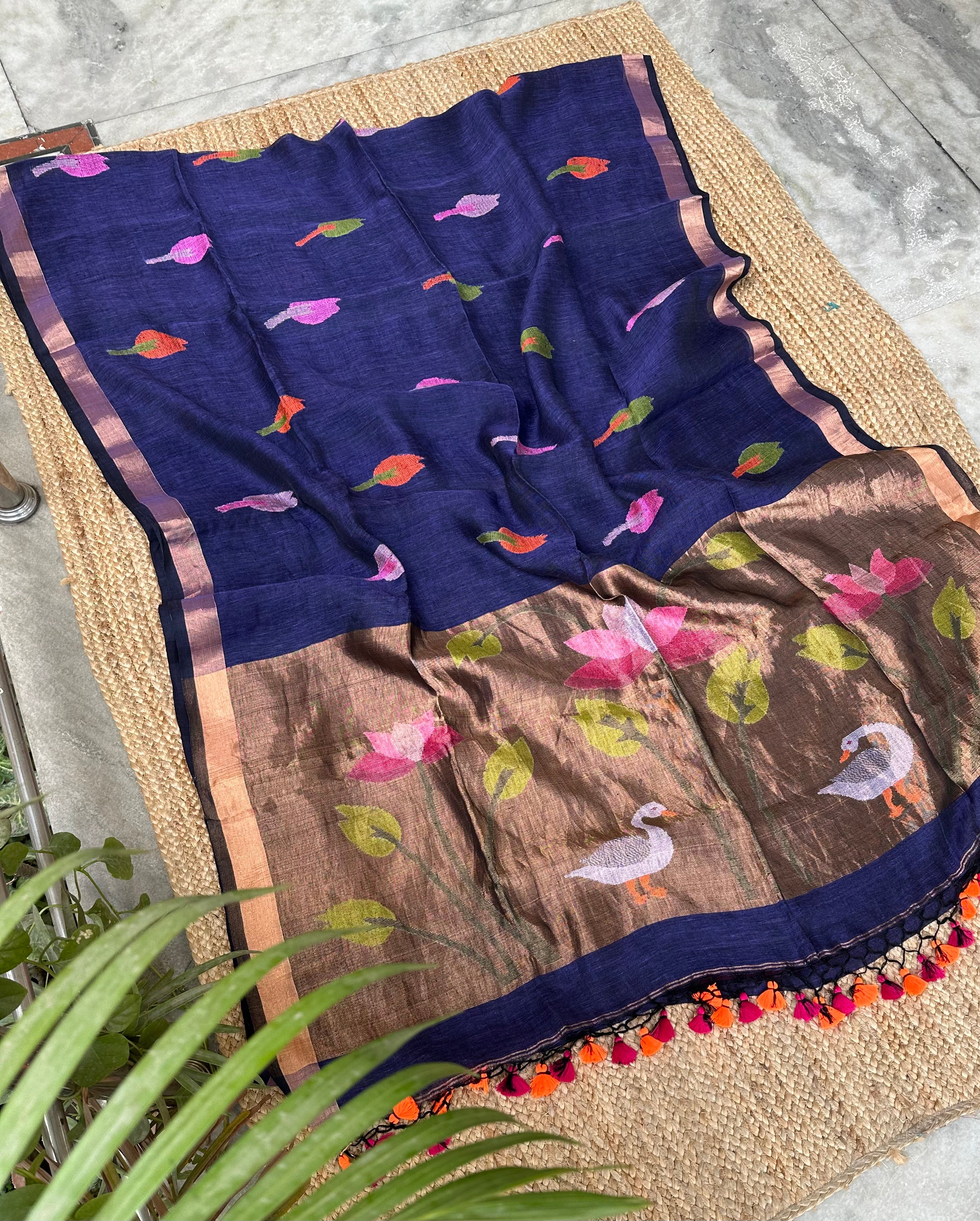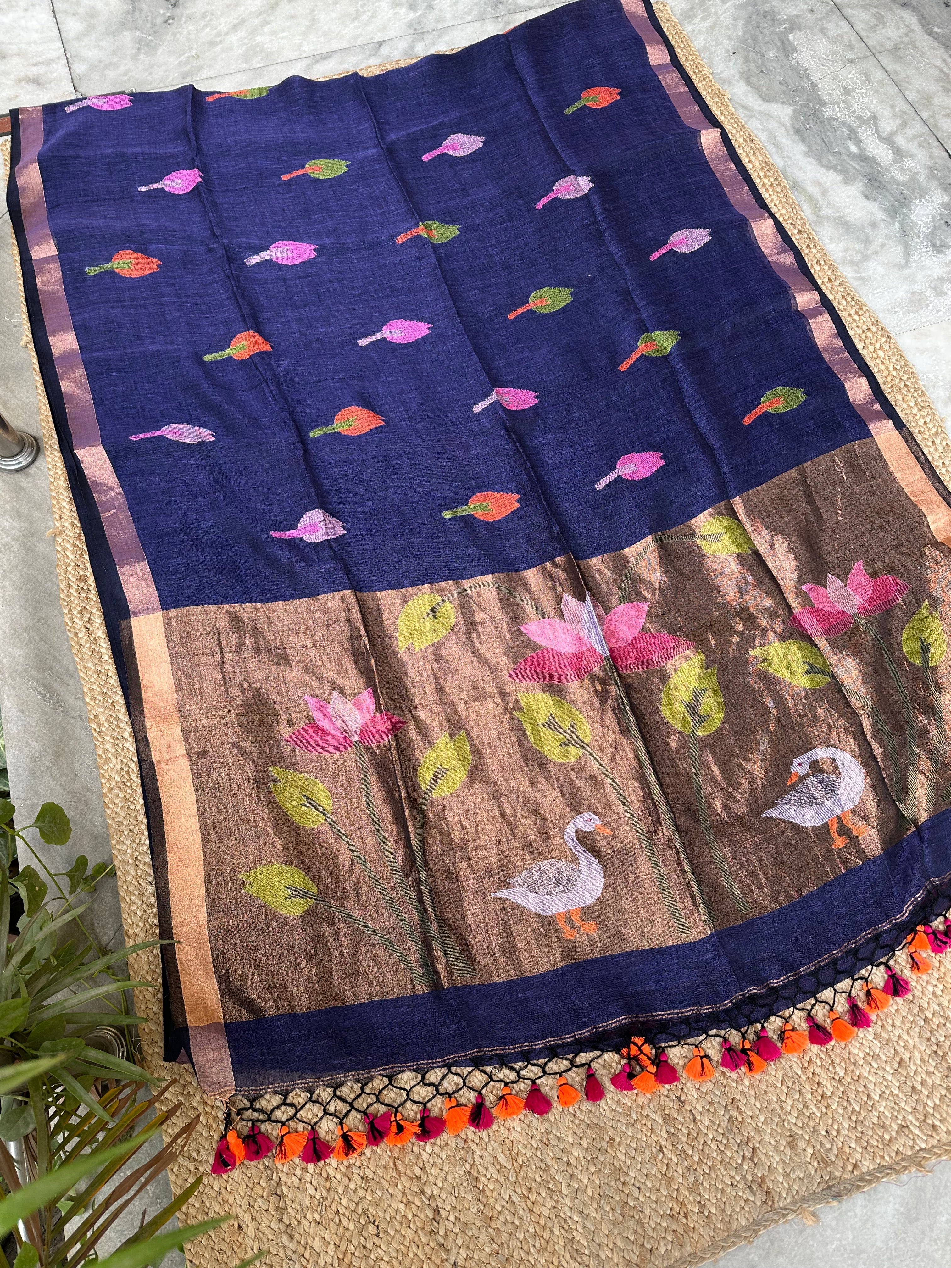 Navy Blue Pure Linen Handloom Paithani Jamdani Saree