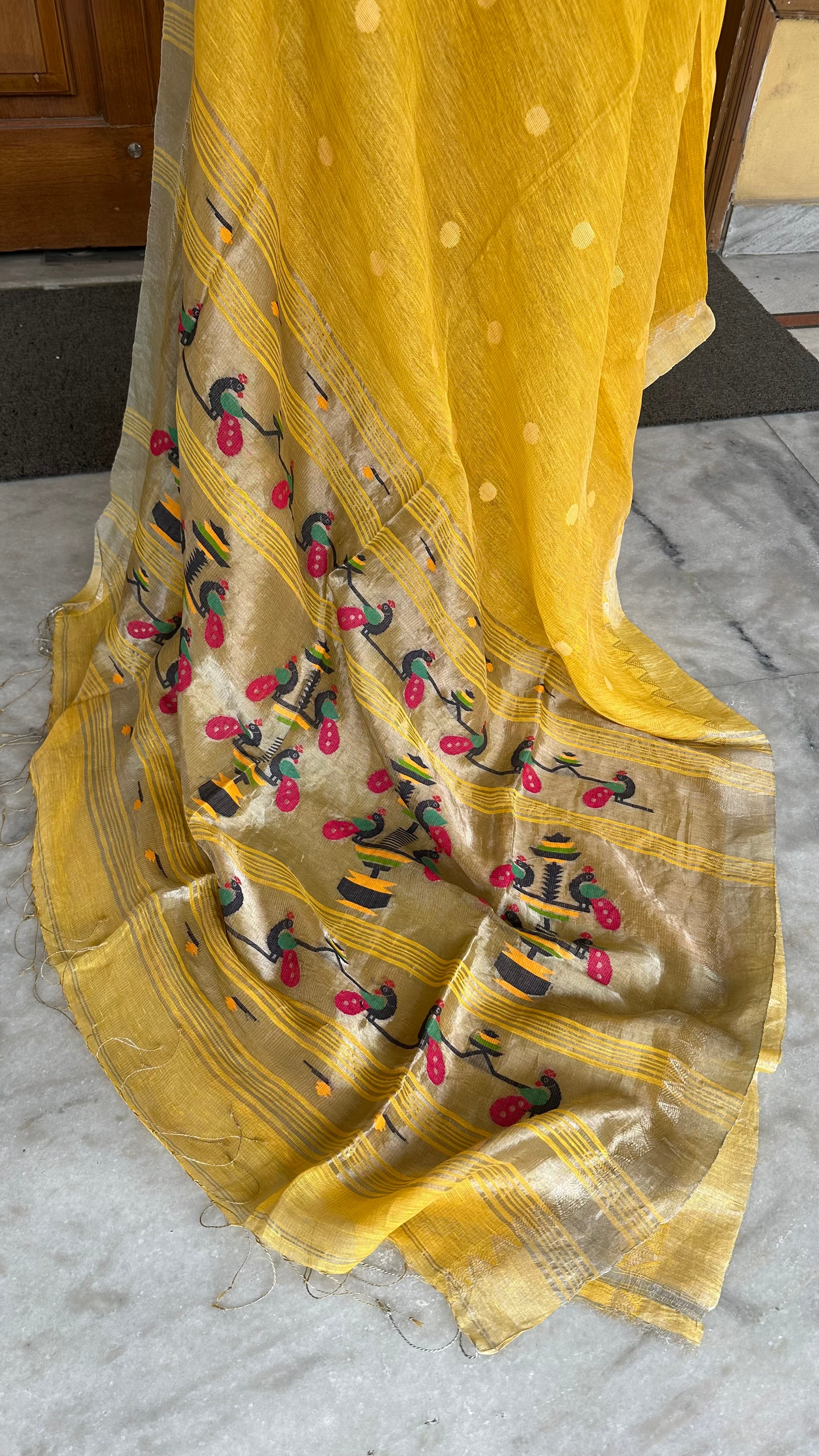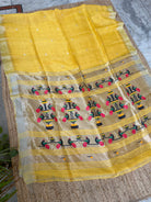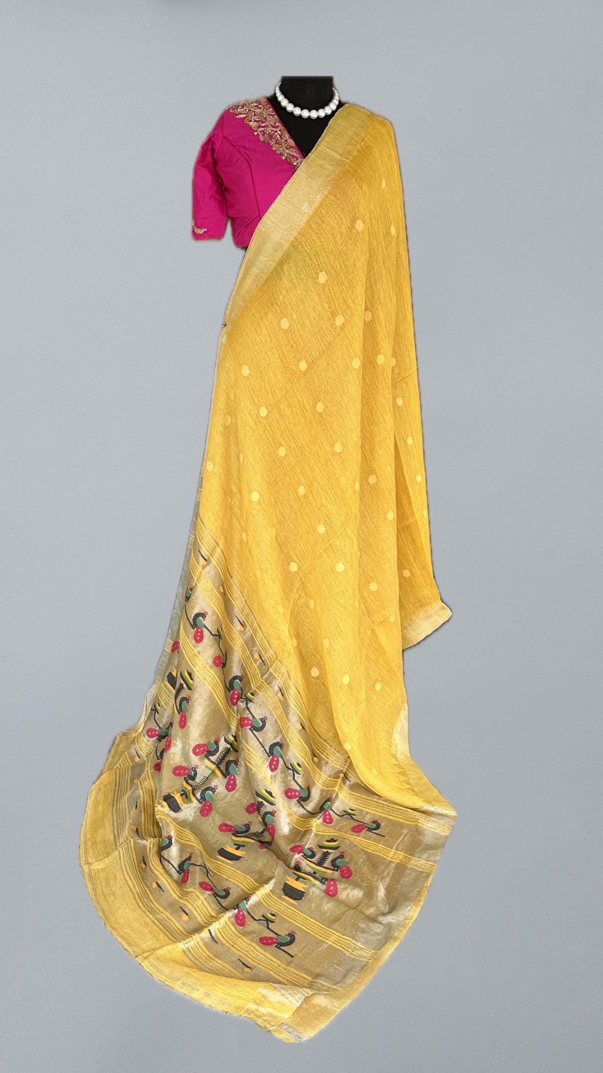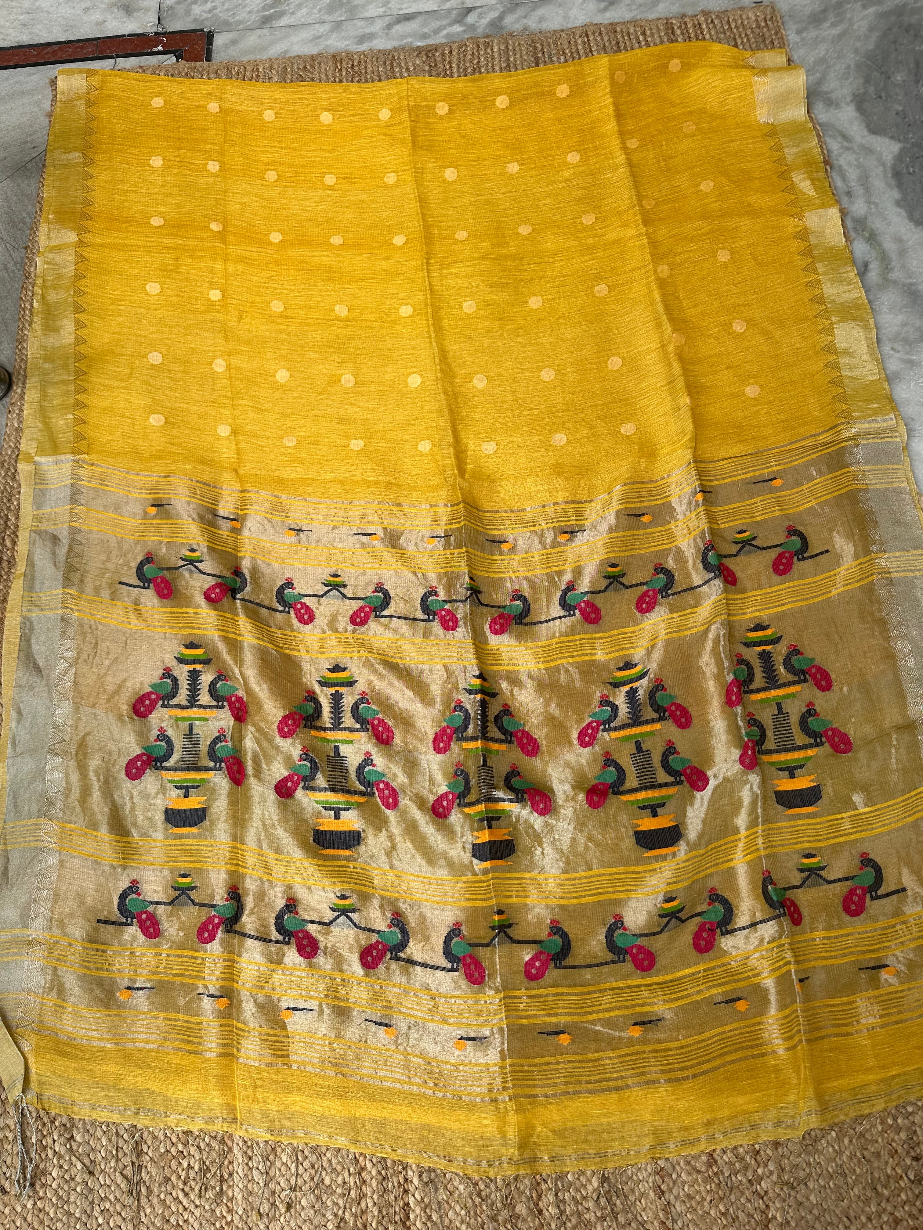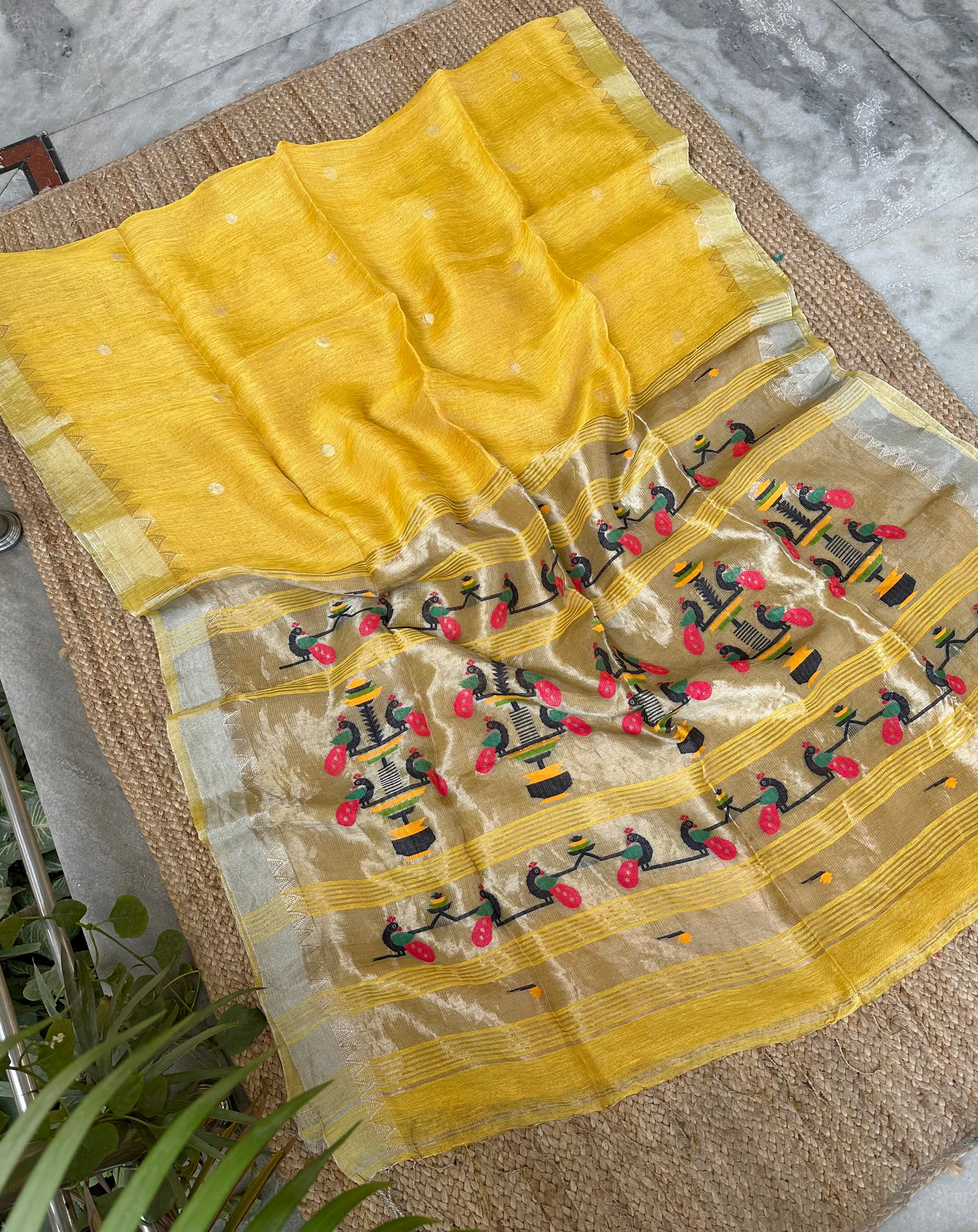 Yellow Linen Tissue Handloom Paithani Jamdani Pallu Saree