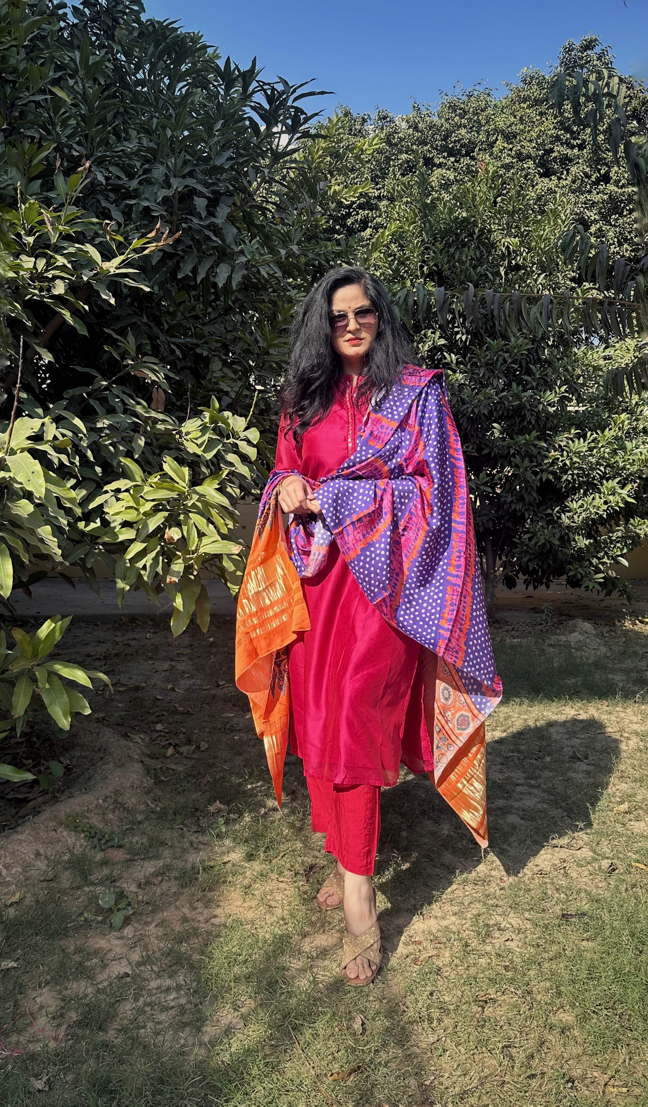 Pure Mashru Silk Ajrakh Dark Red Coord set (Unstitched)