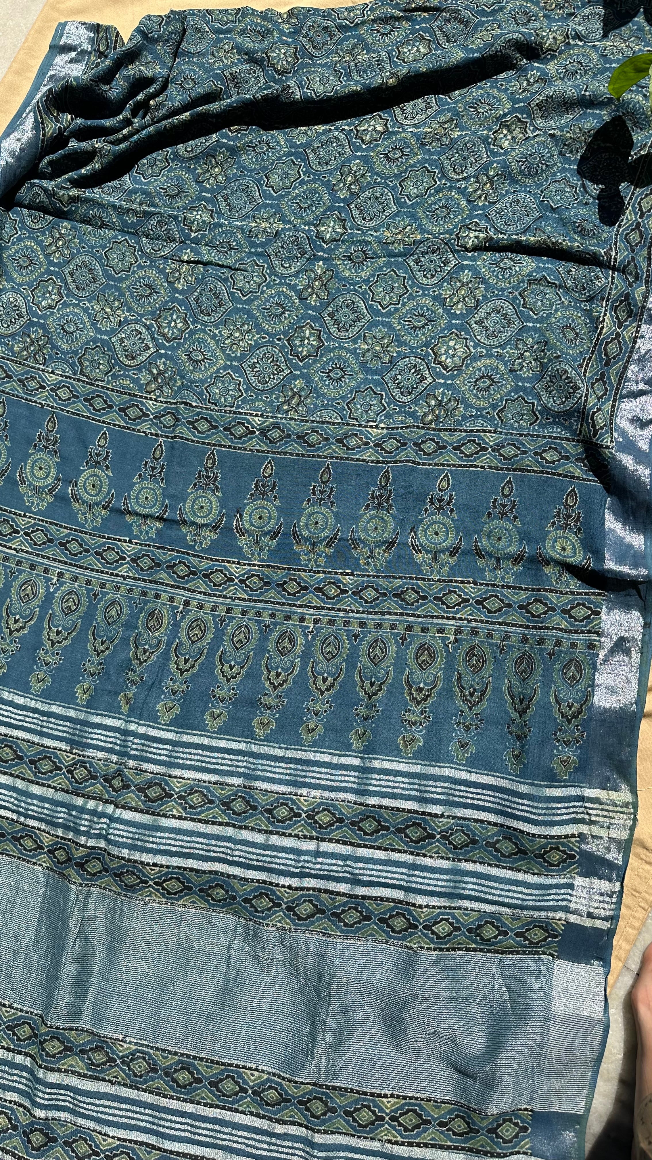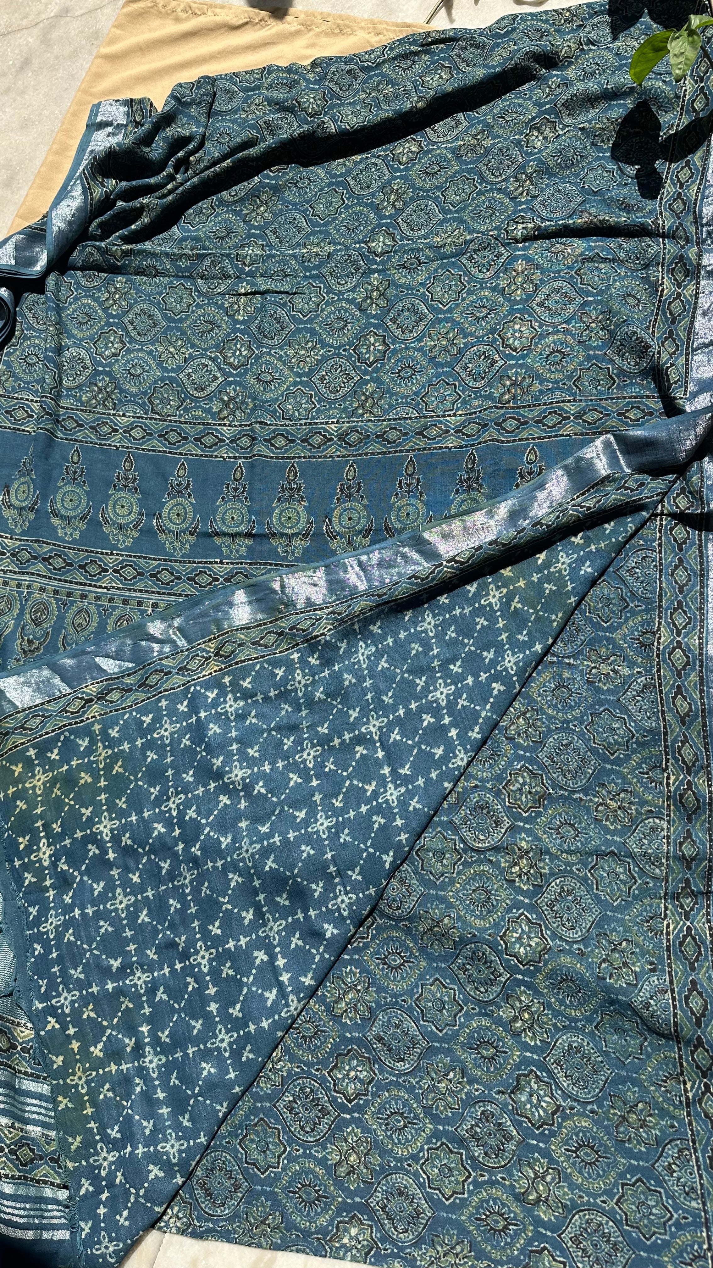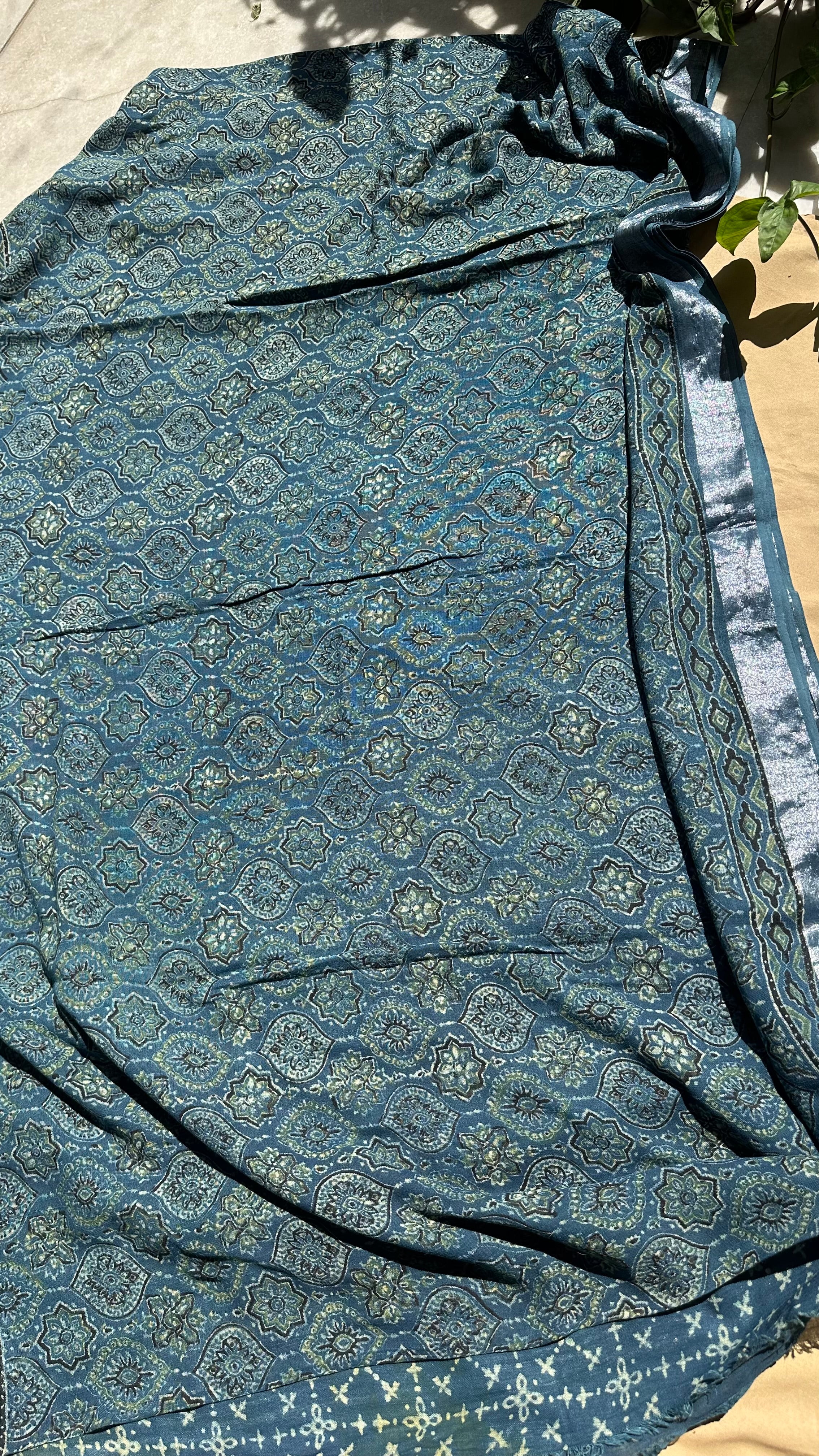 Indigo Ajrakh Handblock Linen Handloom Saree