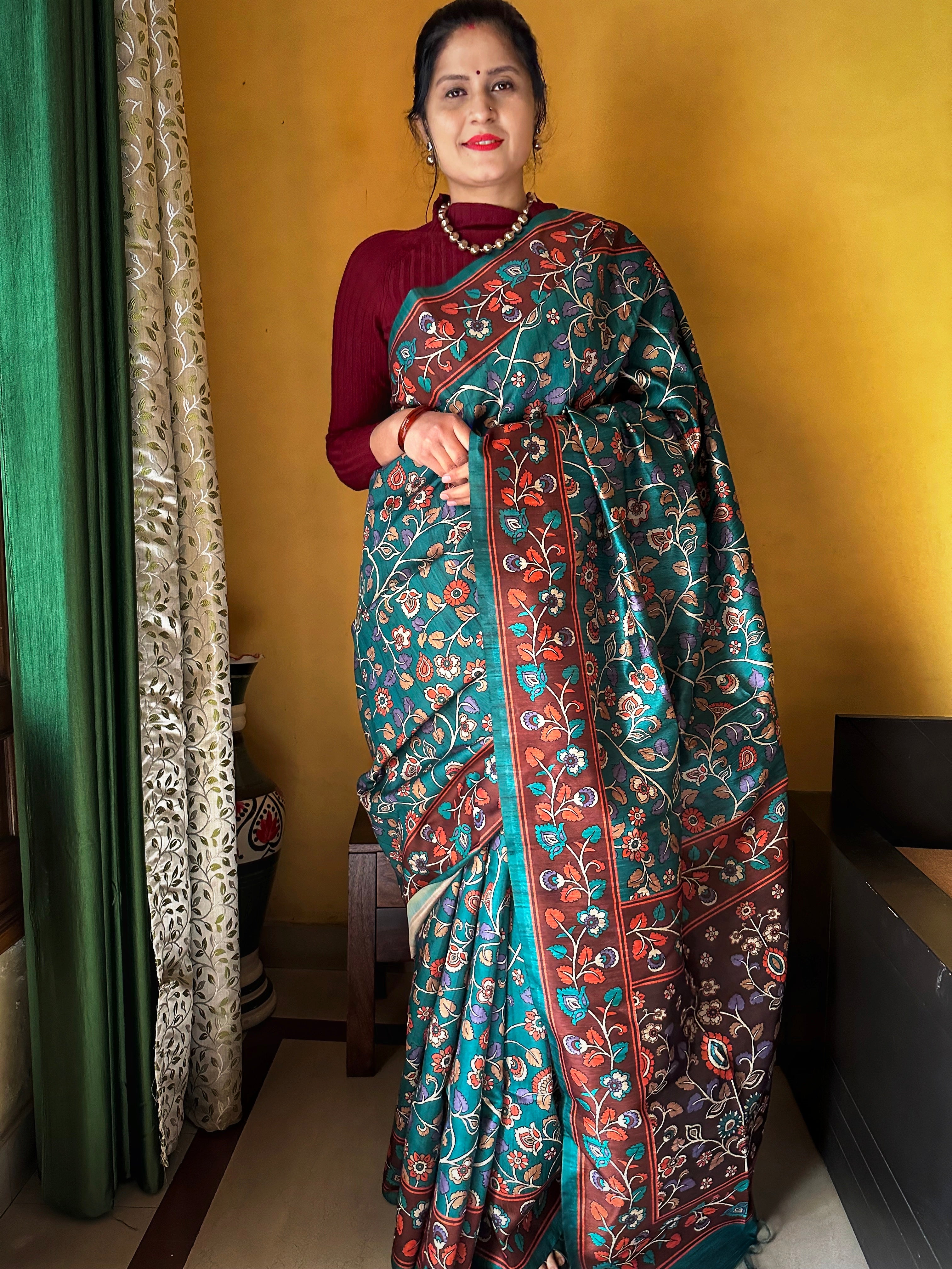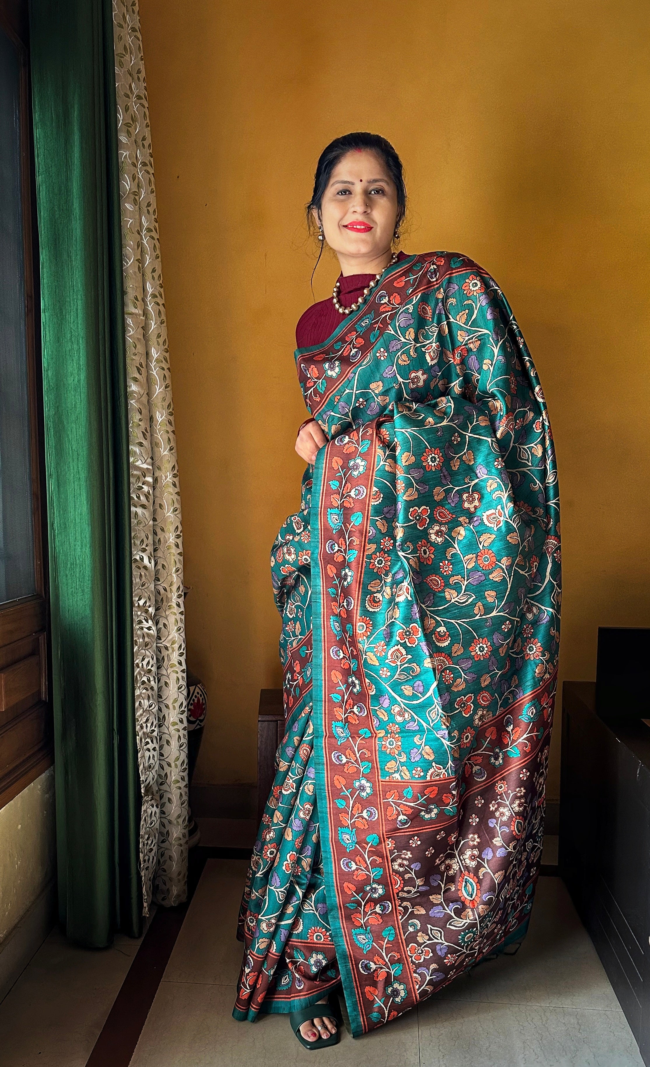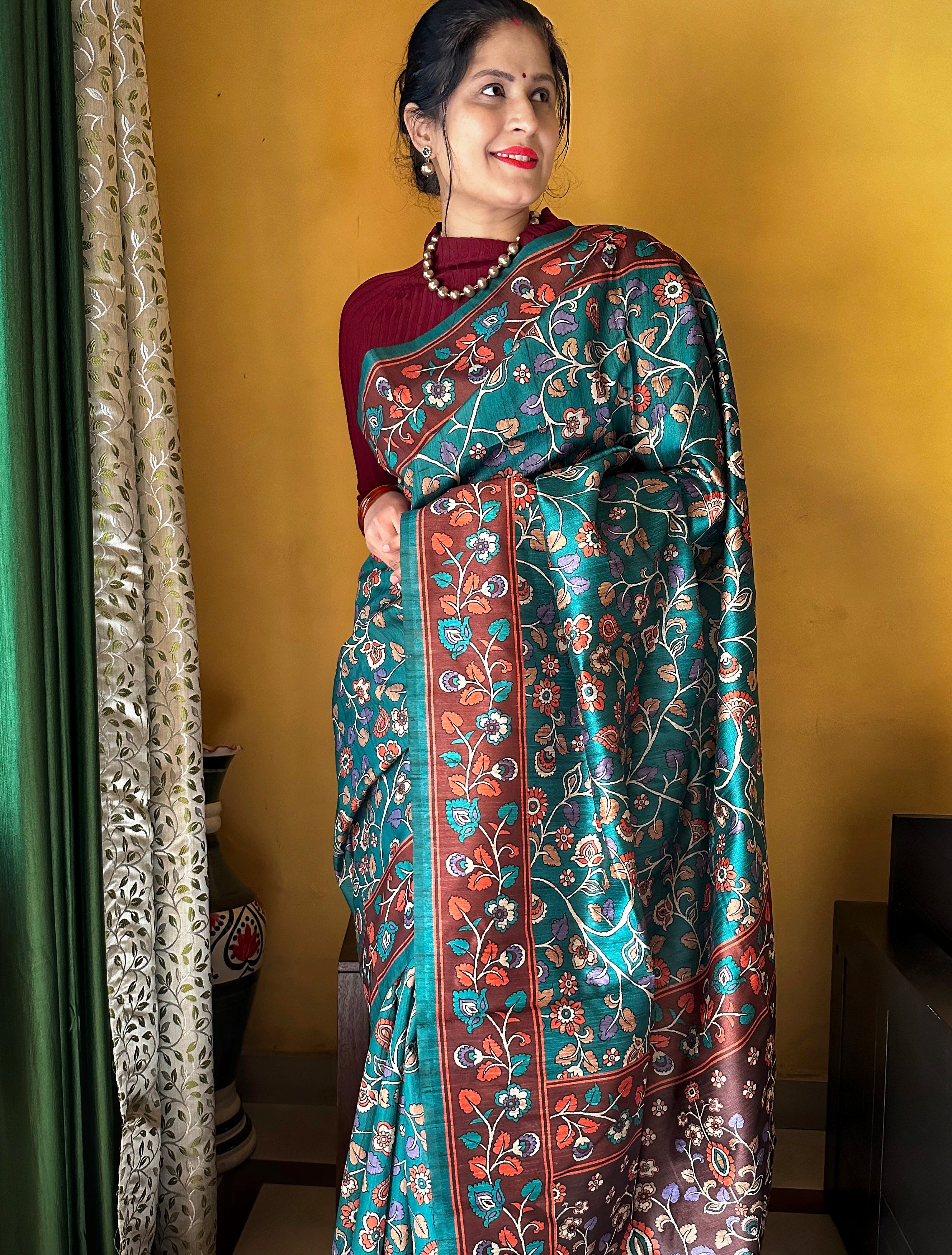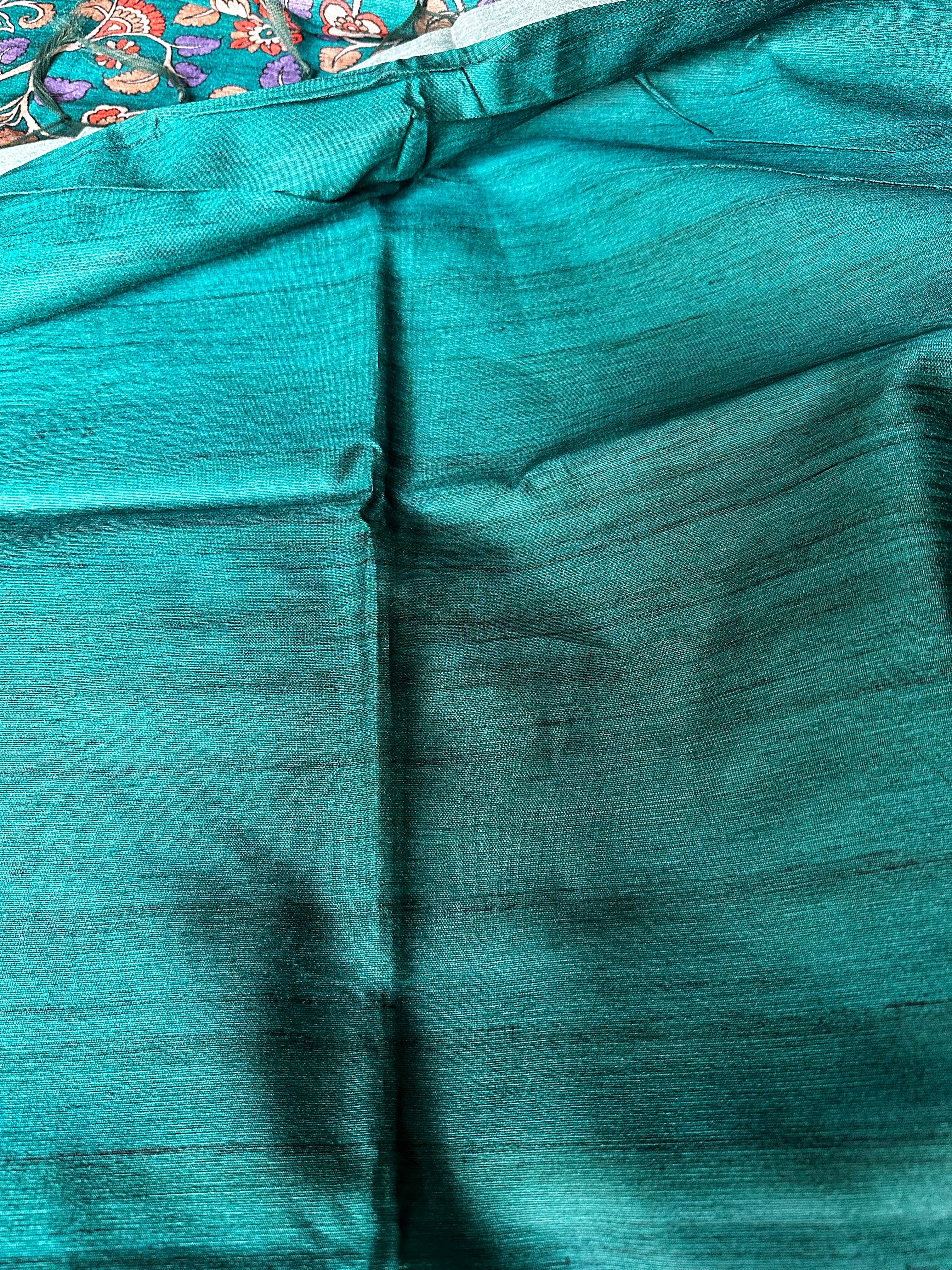 Material : Semi Tusser Saree with kalamkari printed pallu. Beautiful saree to style on any function as well as on workplace.