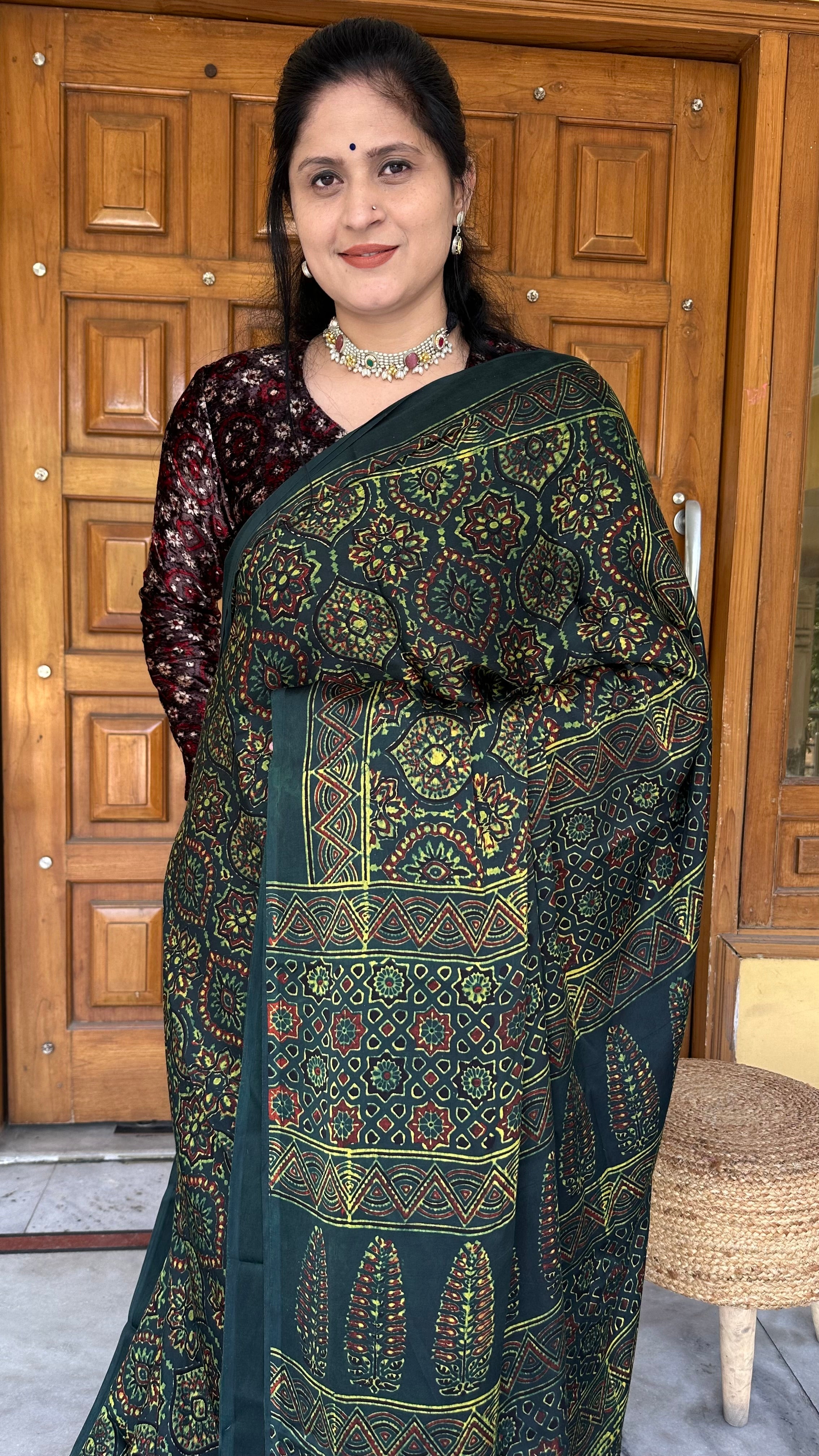 Ajrakh Modal silk saree (Dark Green)