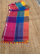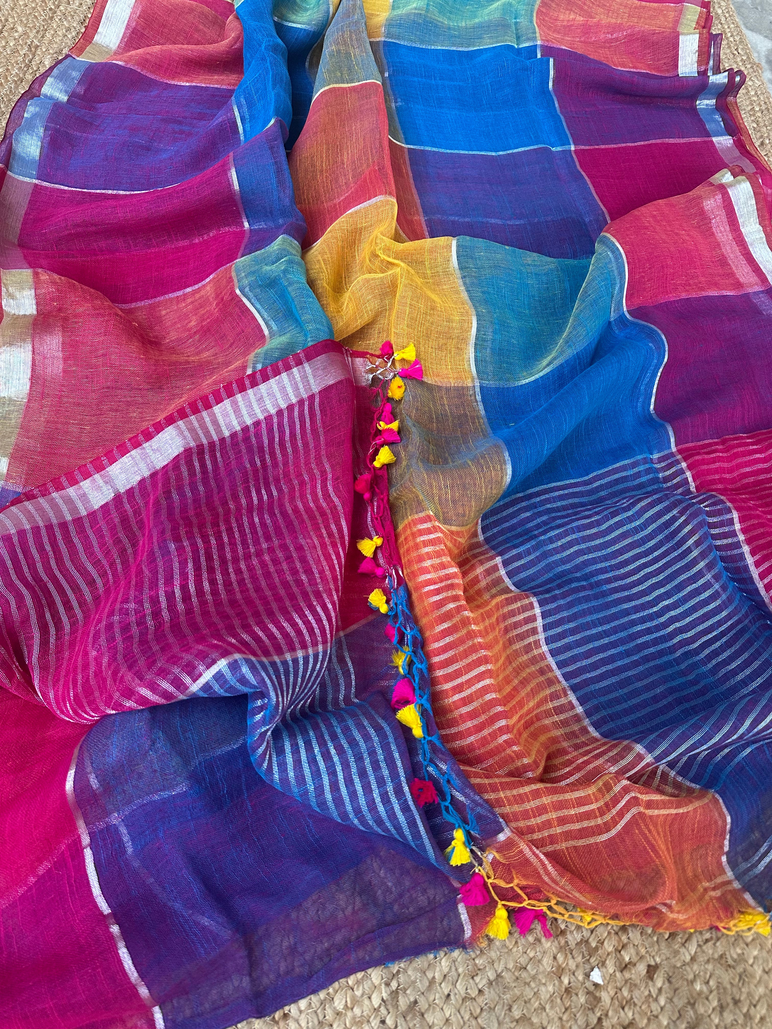 Material: 80 count pure Linen by Linen sarees with silver zari checks and multi colours.