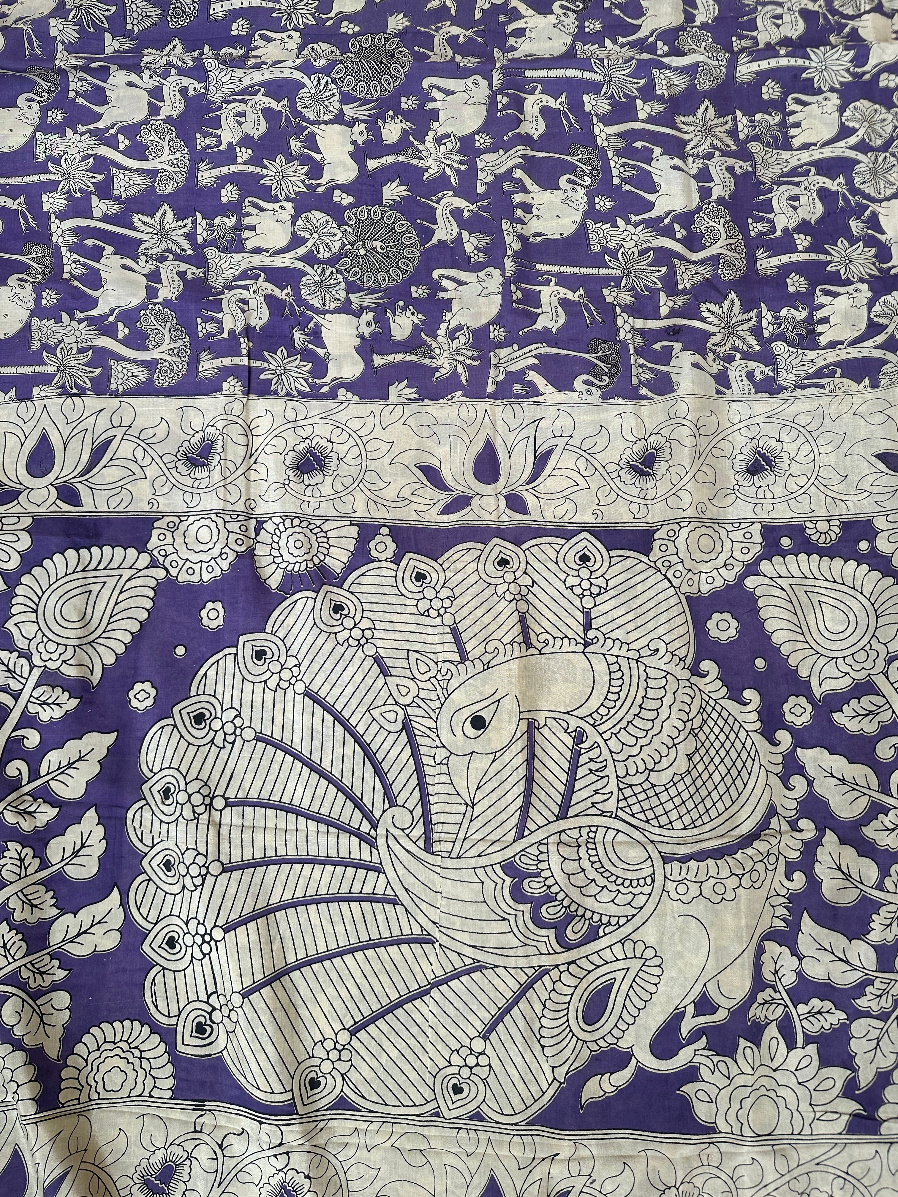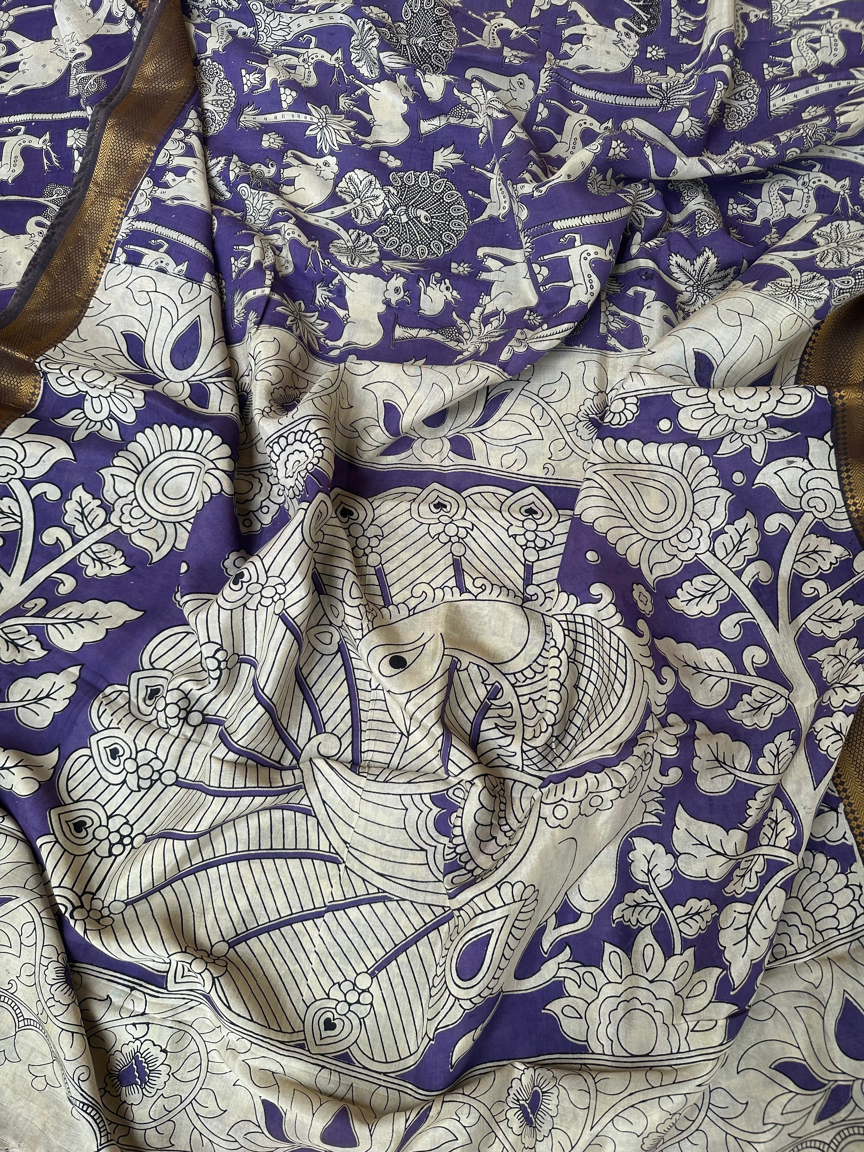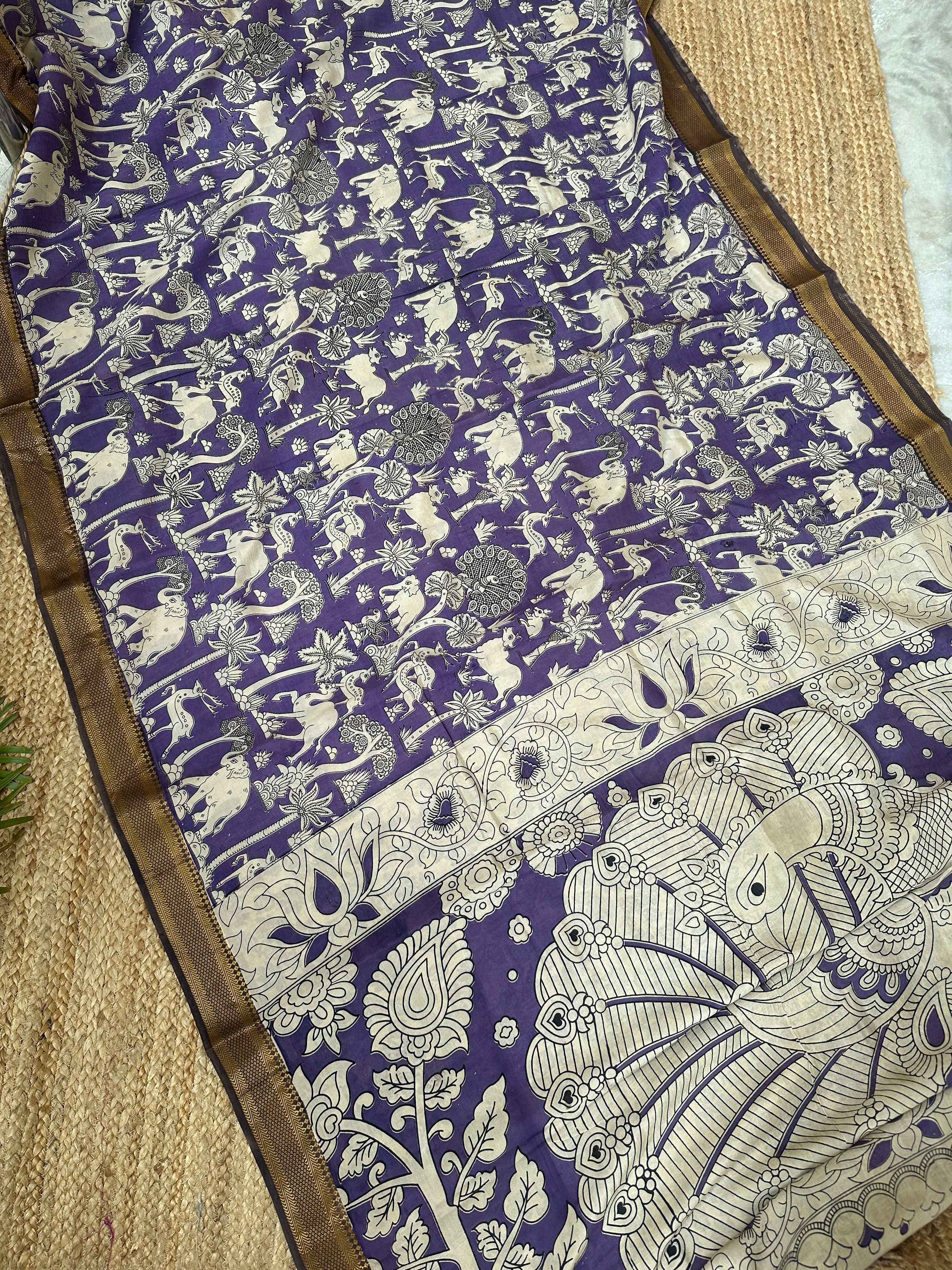 Bluish Purple Kalamkari Silk Handpainted Saree