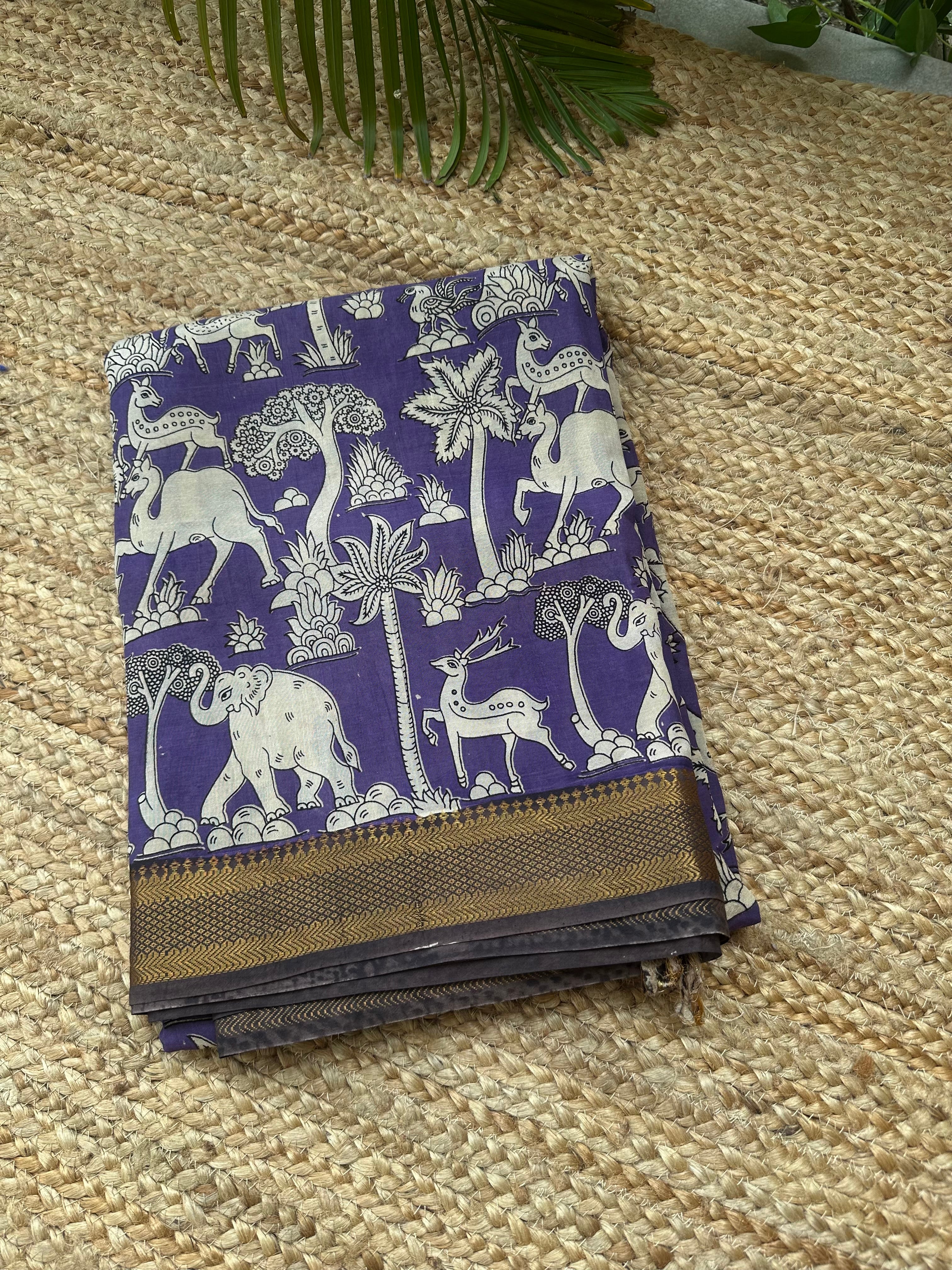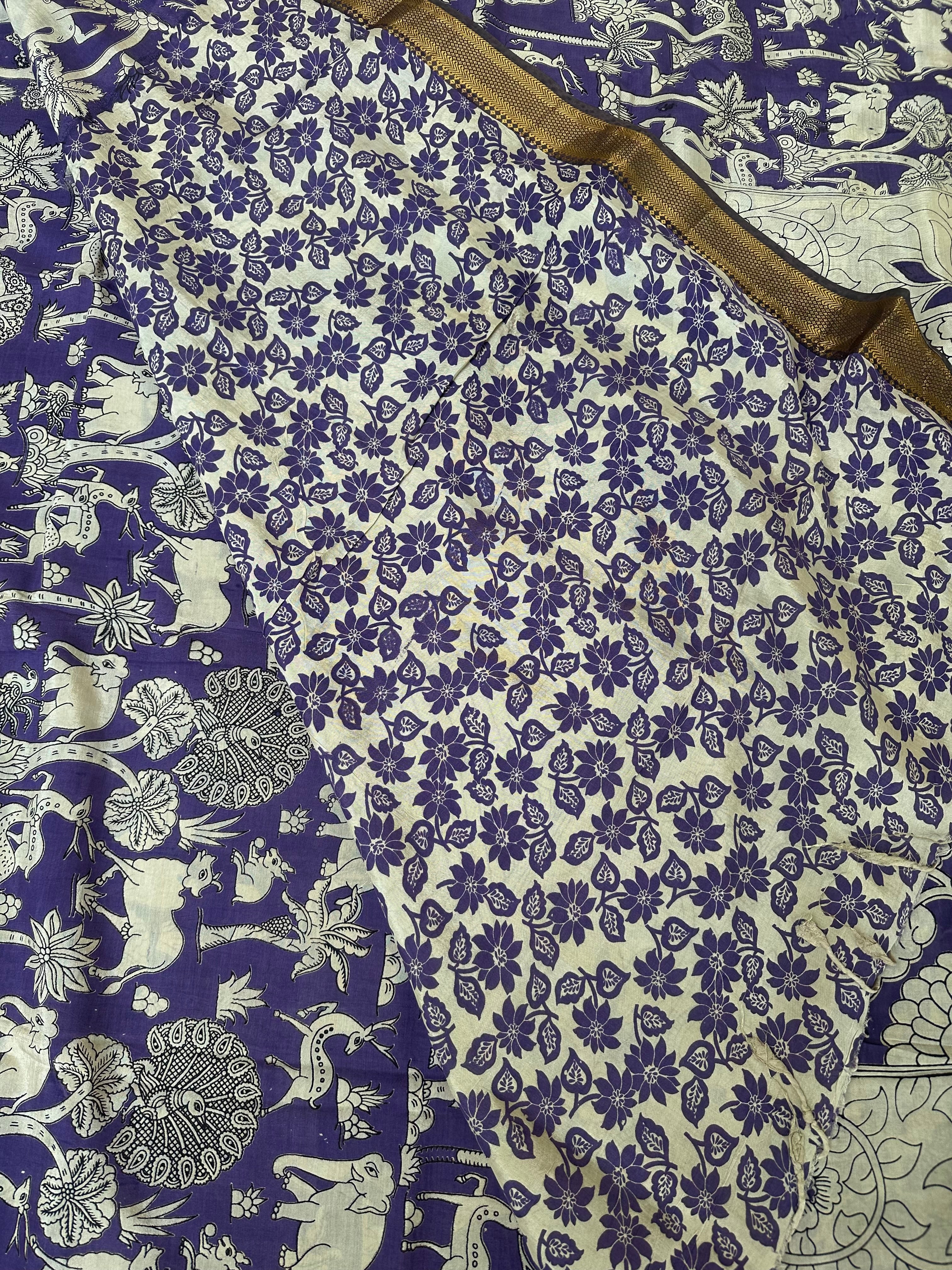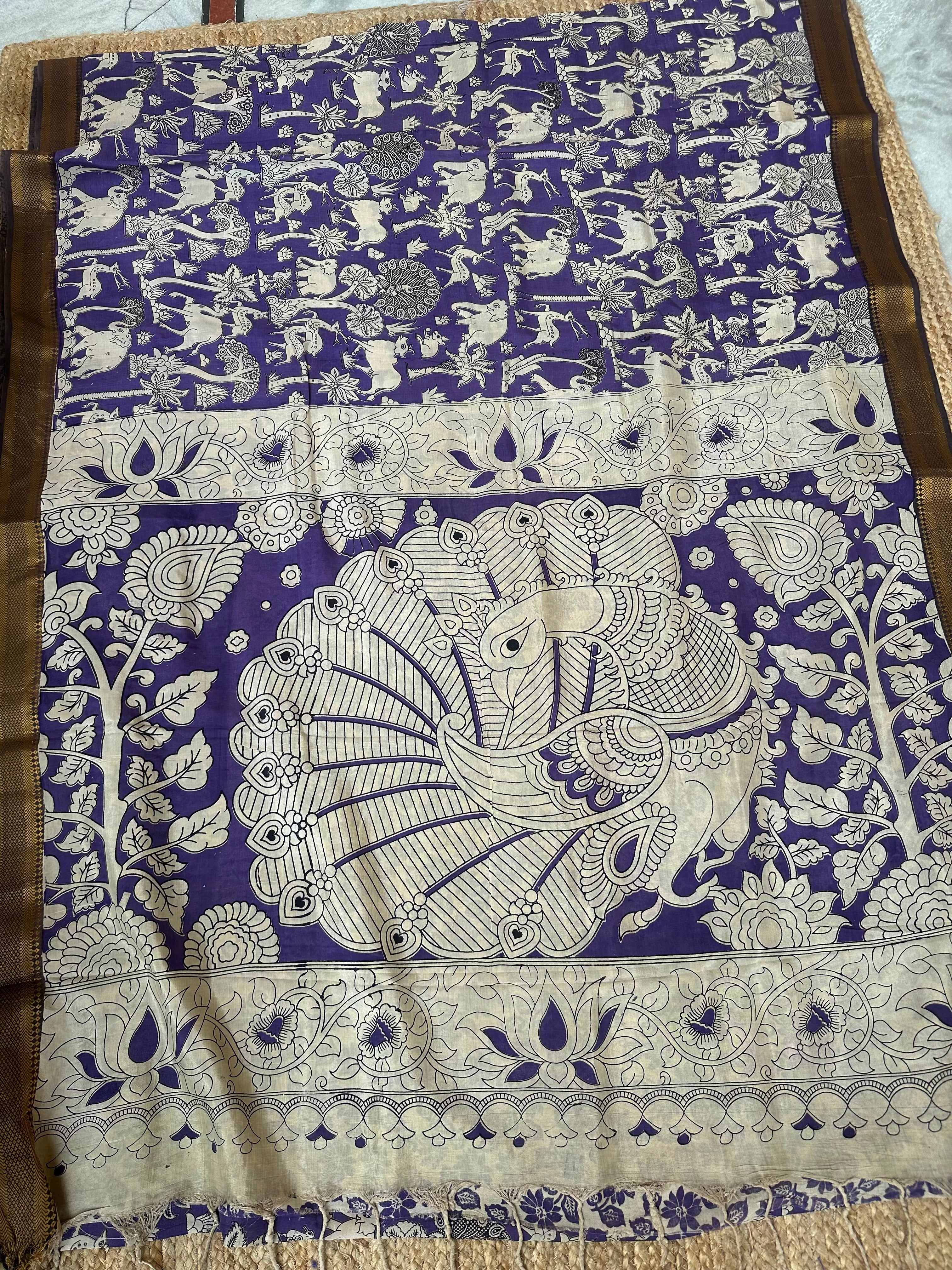 Bluish Purple Kalamkari Silk Handpainted Saree