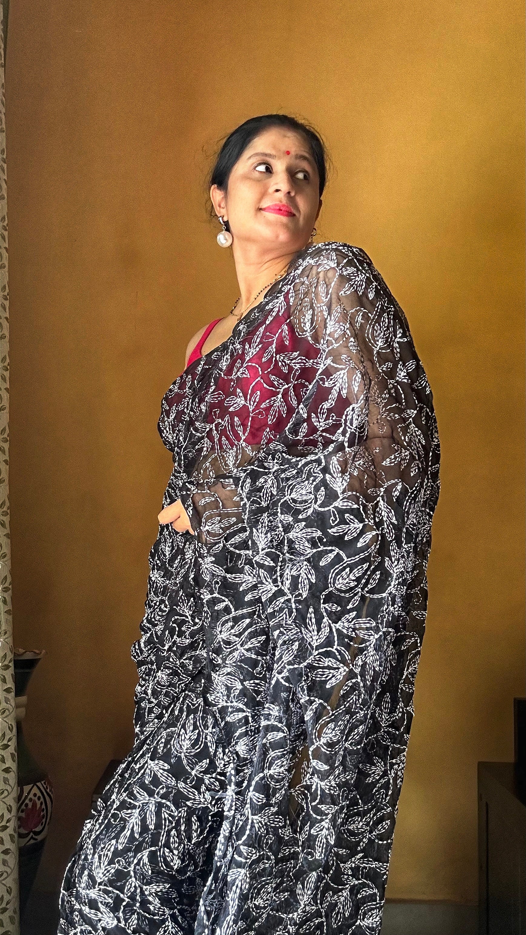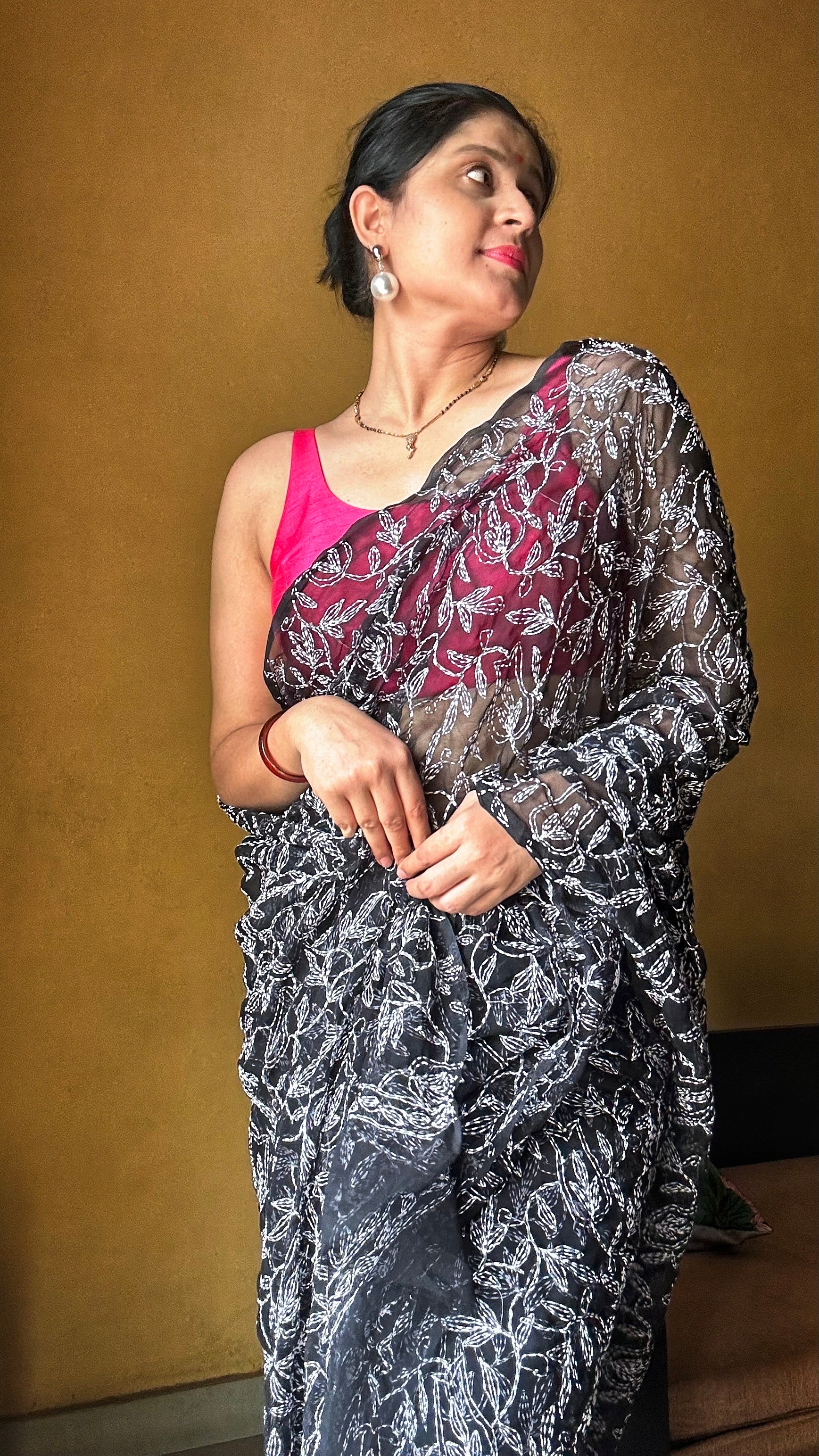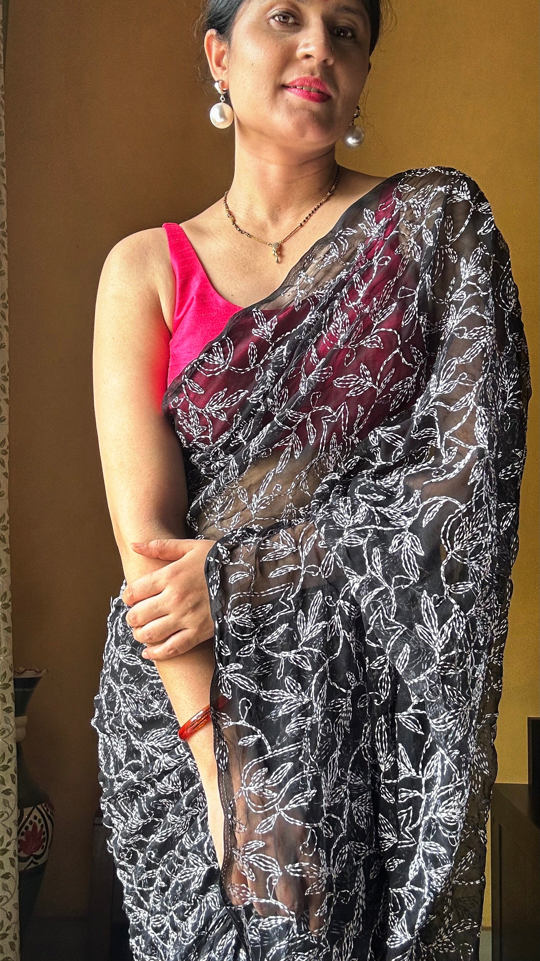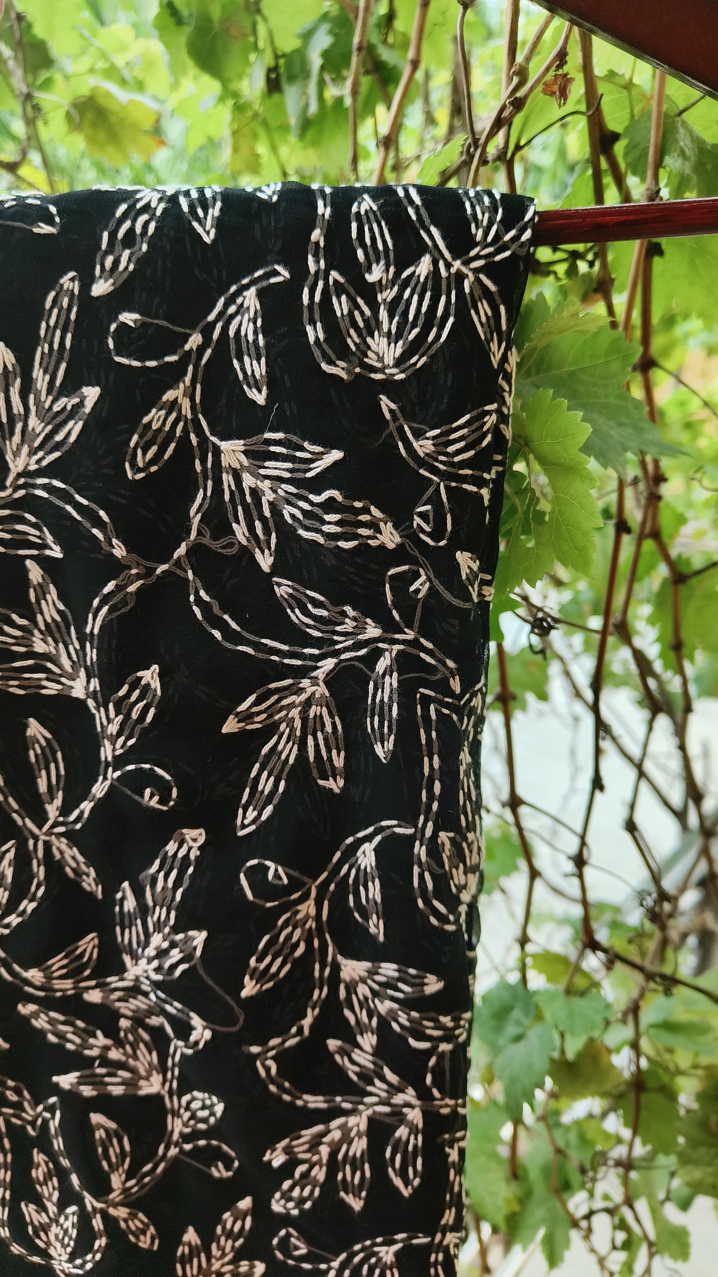 This Chikankari Saree features classic georgette fabric with intricate tepchi hand-embroidery. The delicate details make this saree a stunning addition to any wardrobe. Indulge in a timeless look with this classic design.