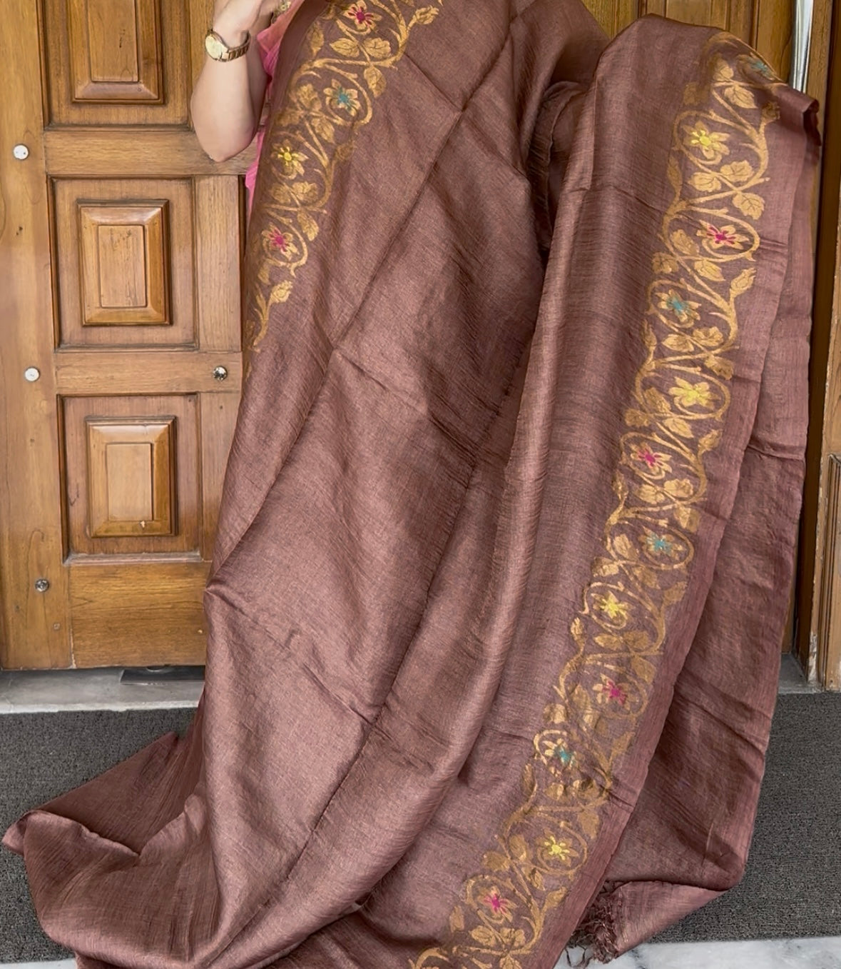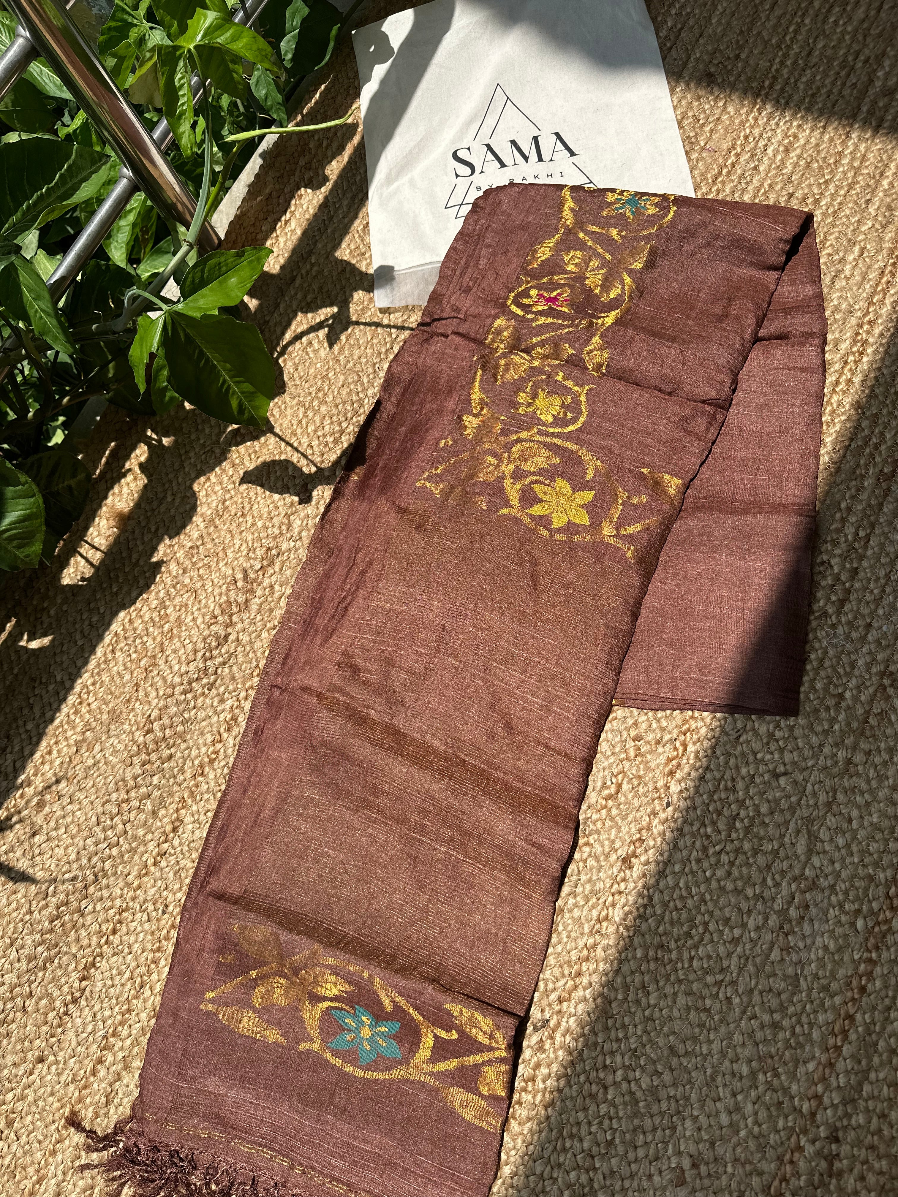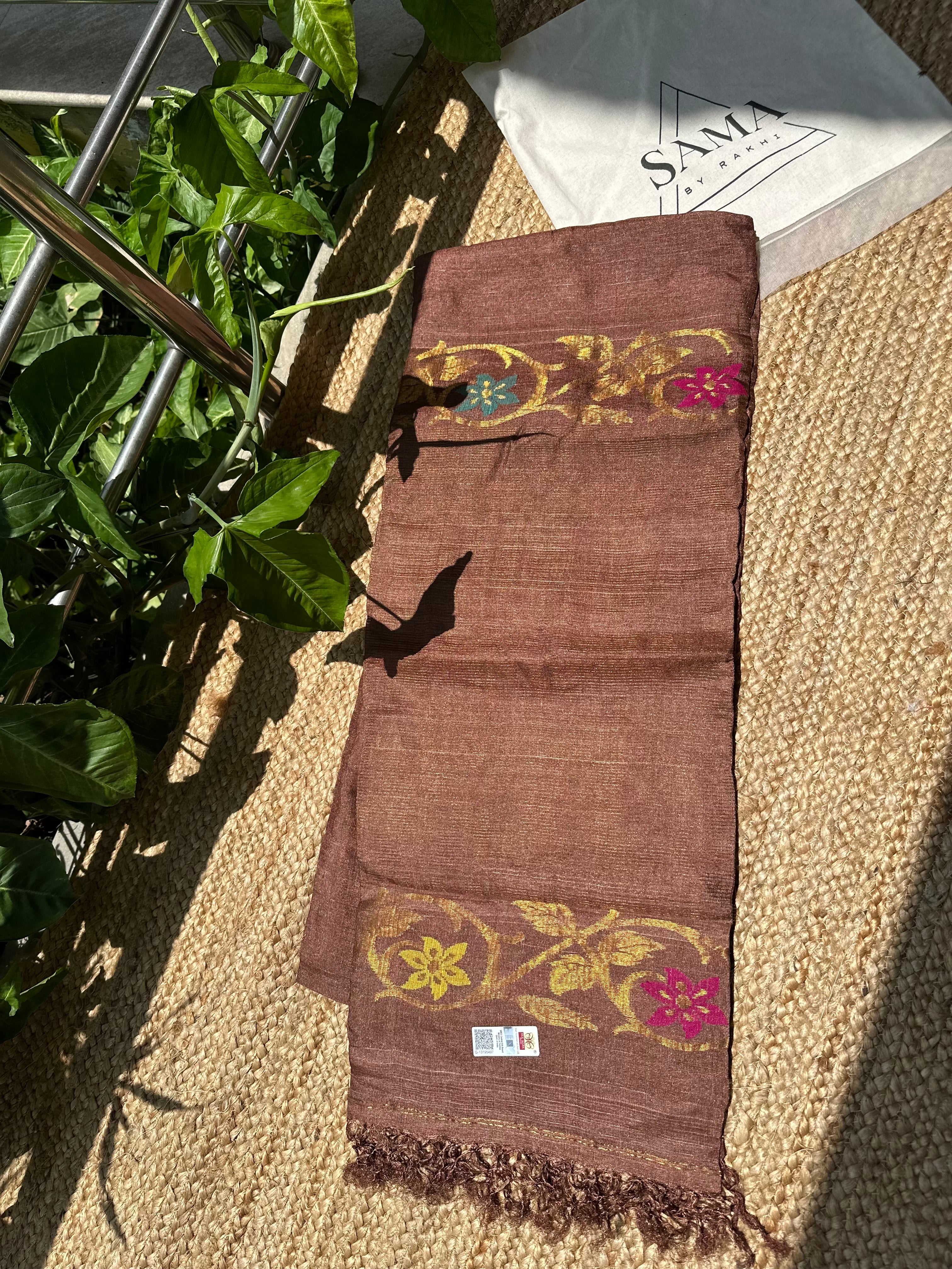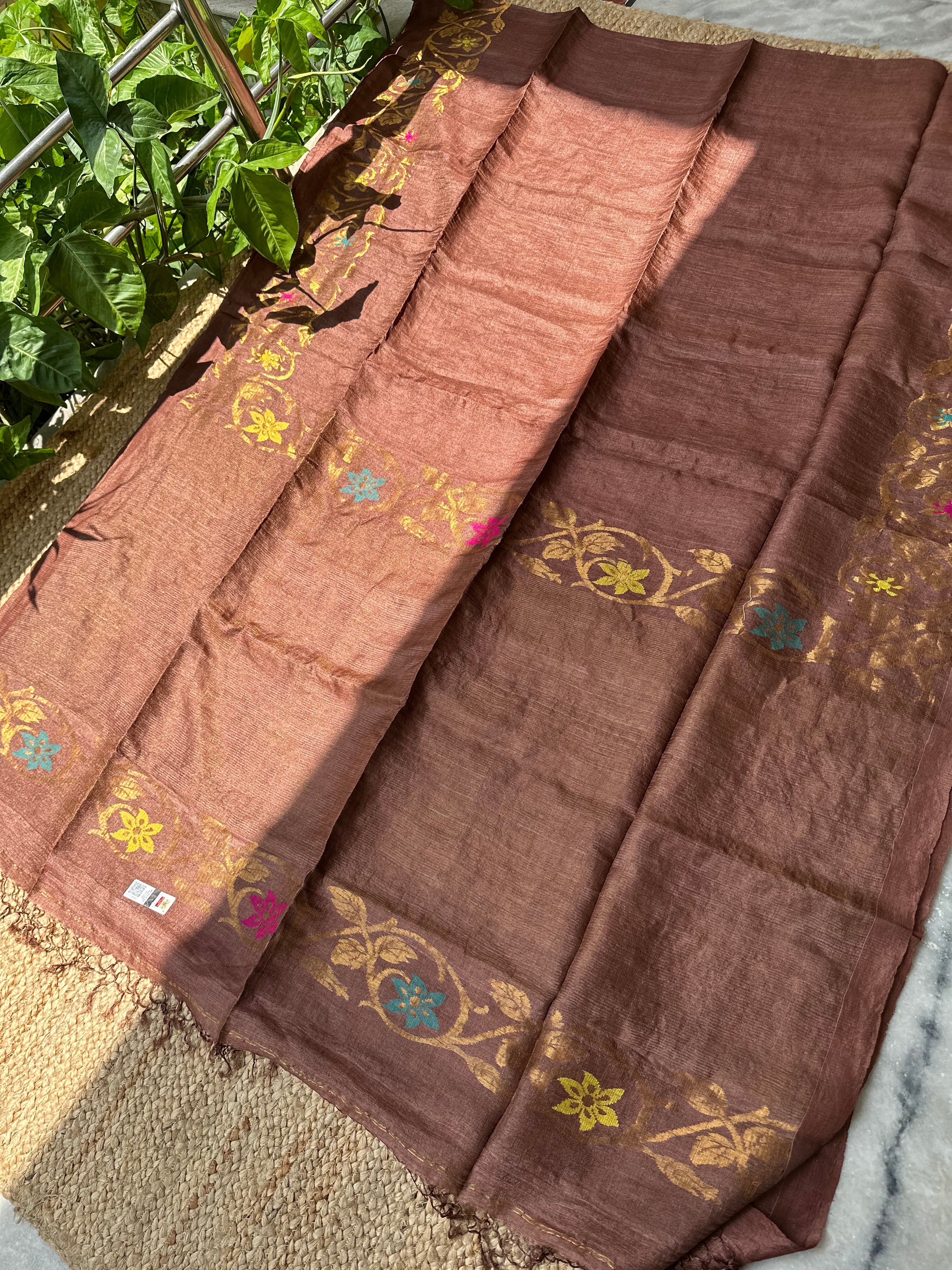 Chocolate Brown Tusser Tissue Fusion Jamdani Handloom Saree with Silk Mark