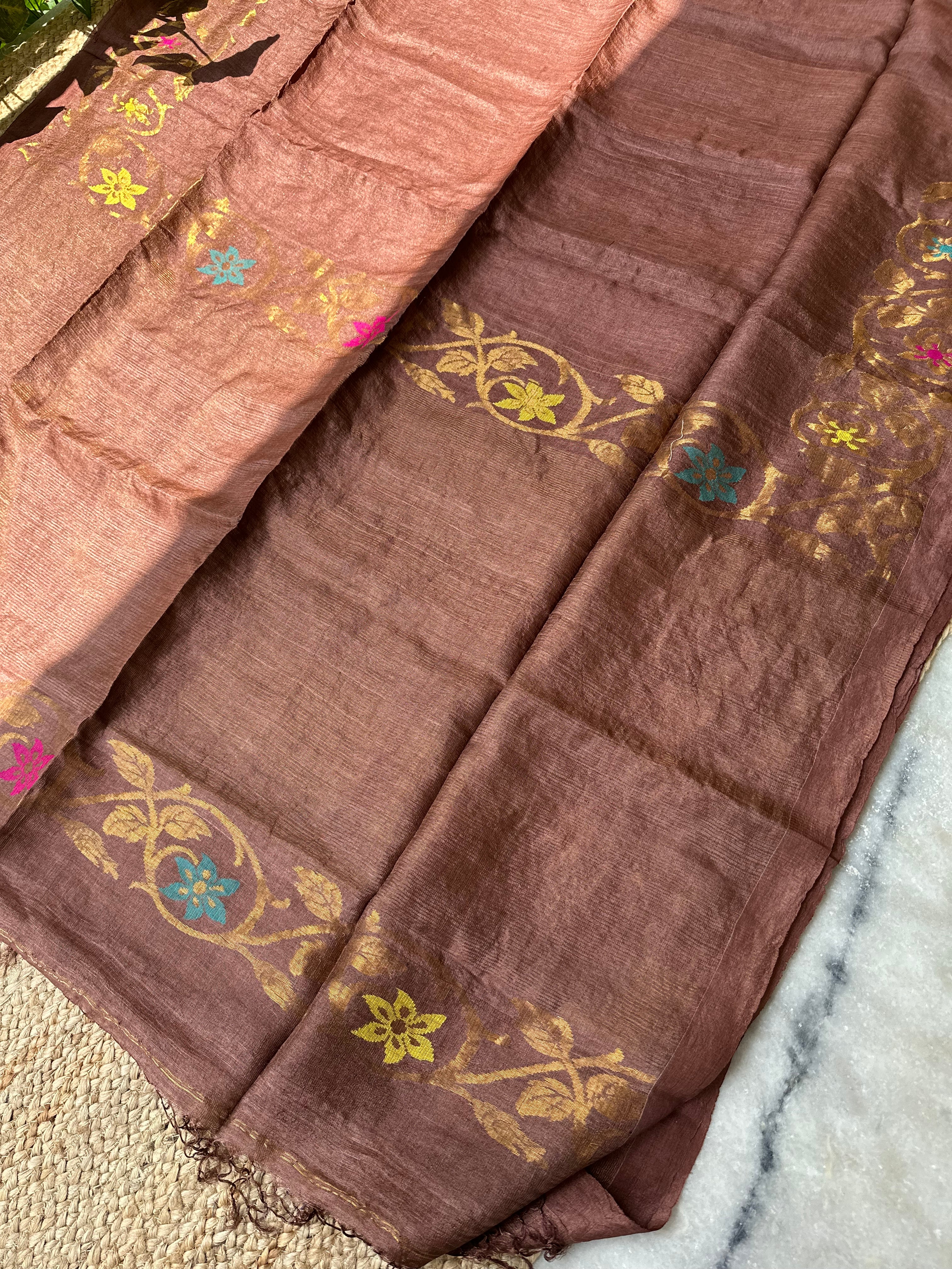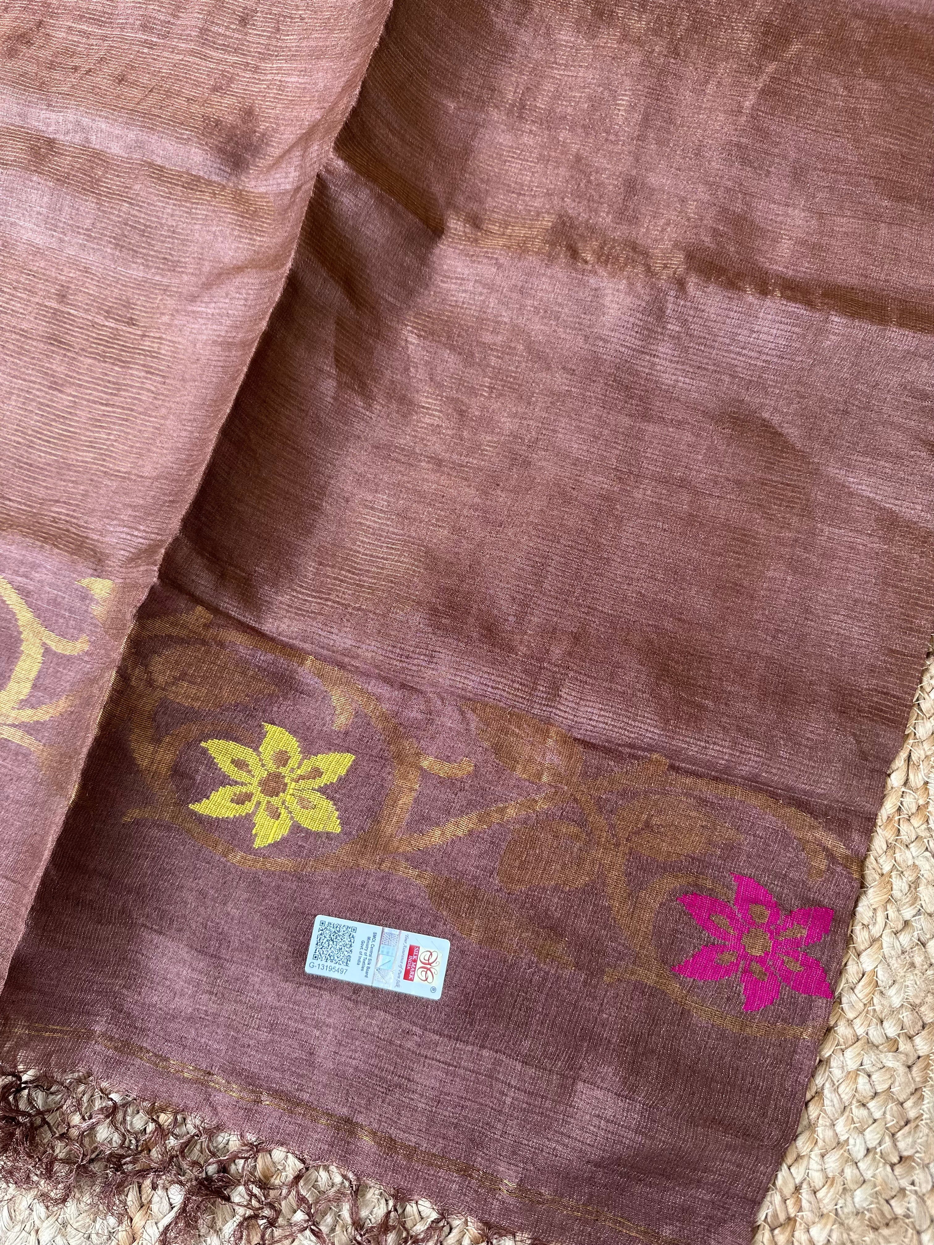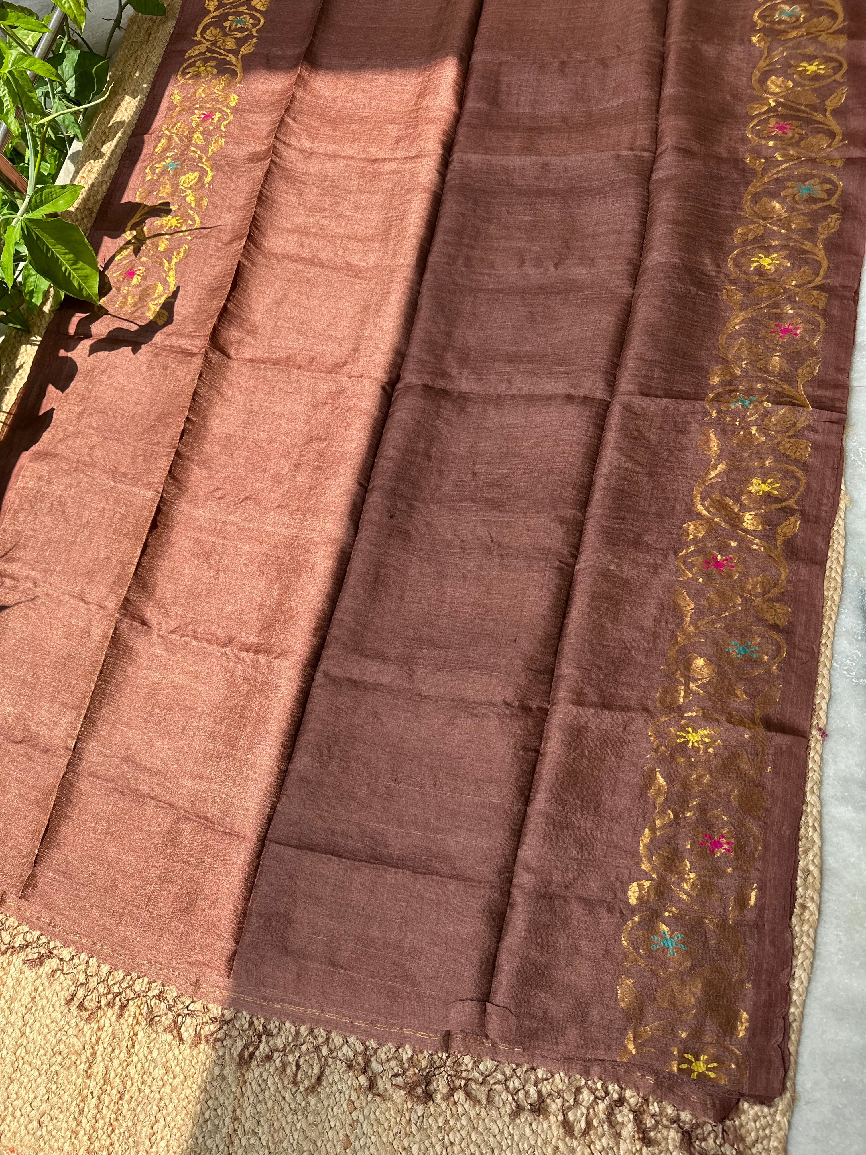 Chocolate Brown Tusser Tissue Fusion Jamdani Handloom Saree with Silk Mark