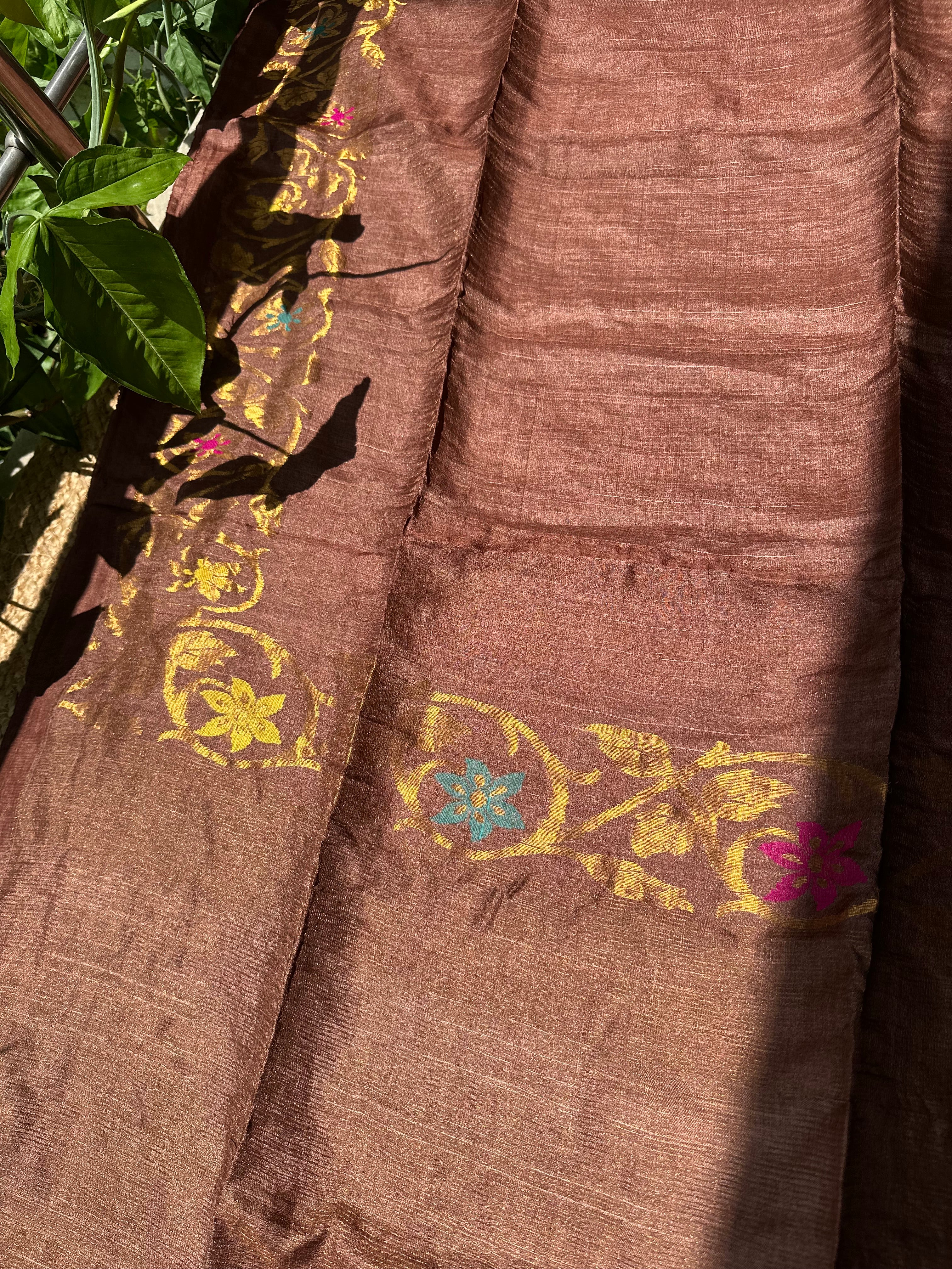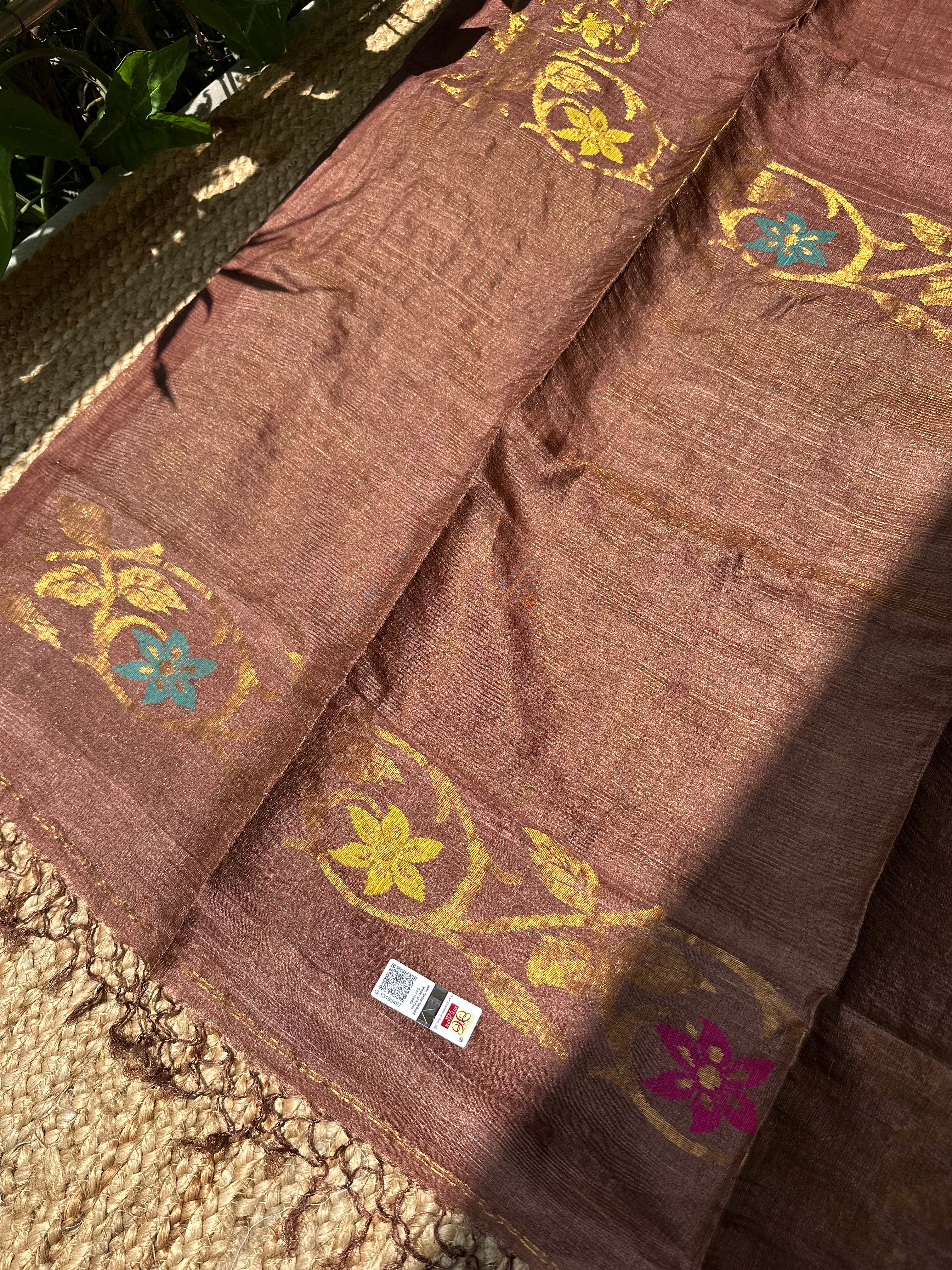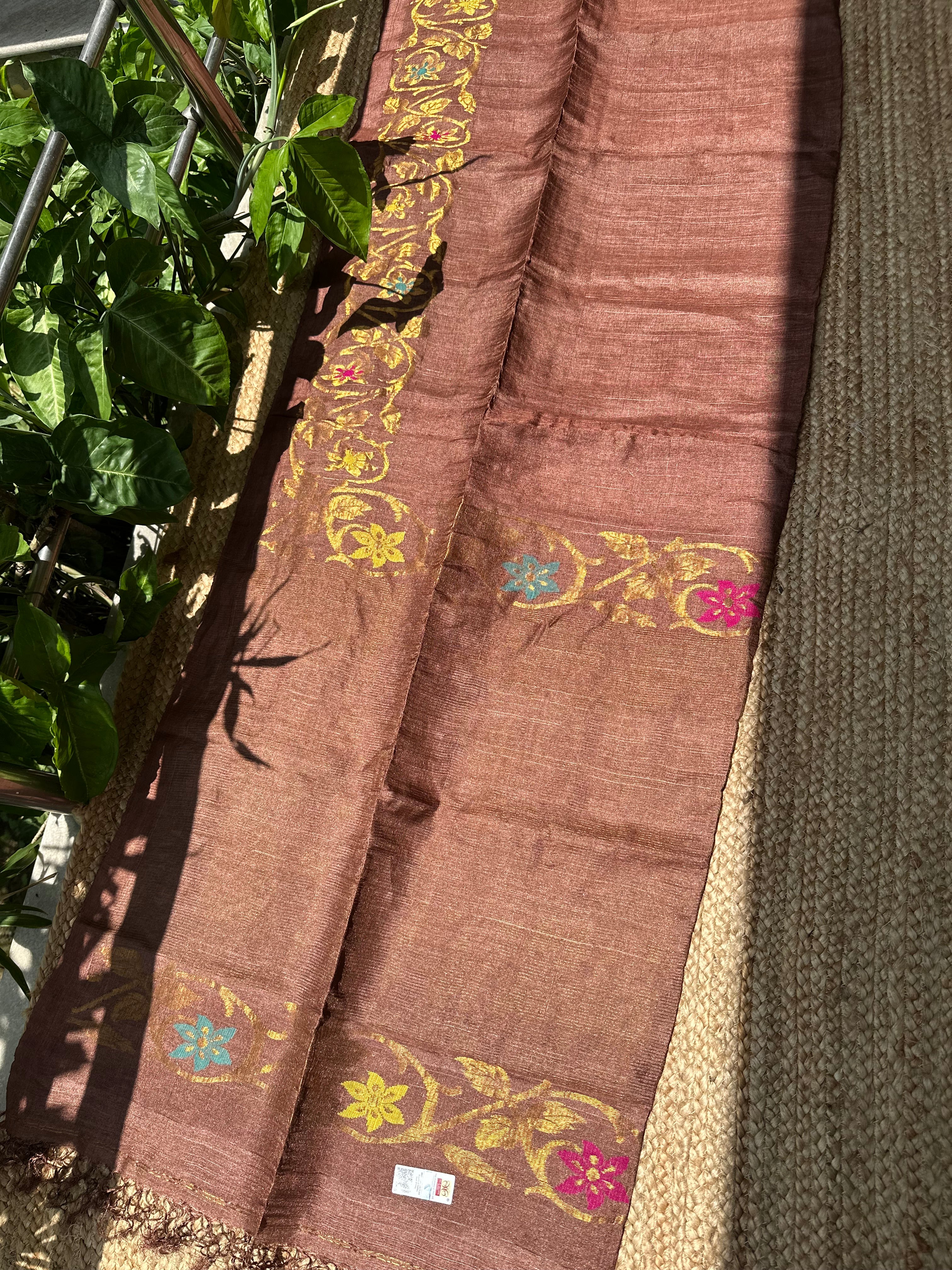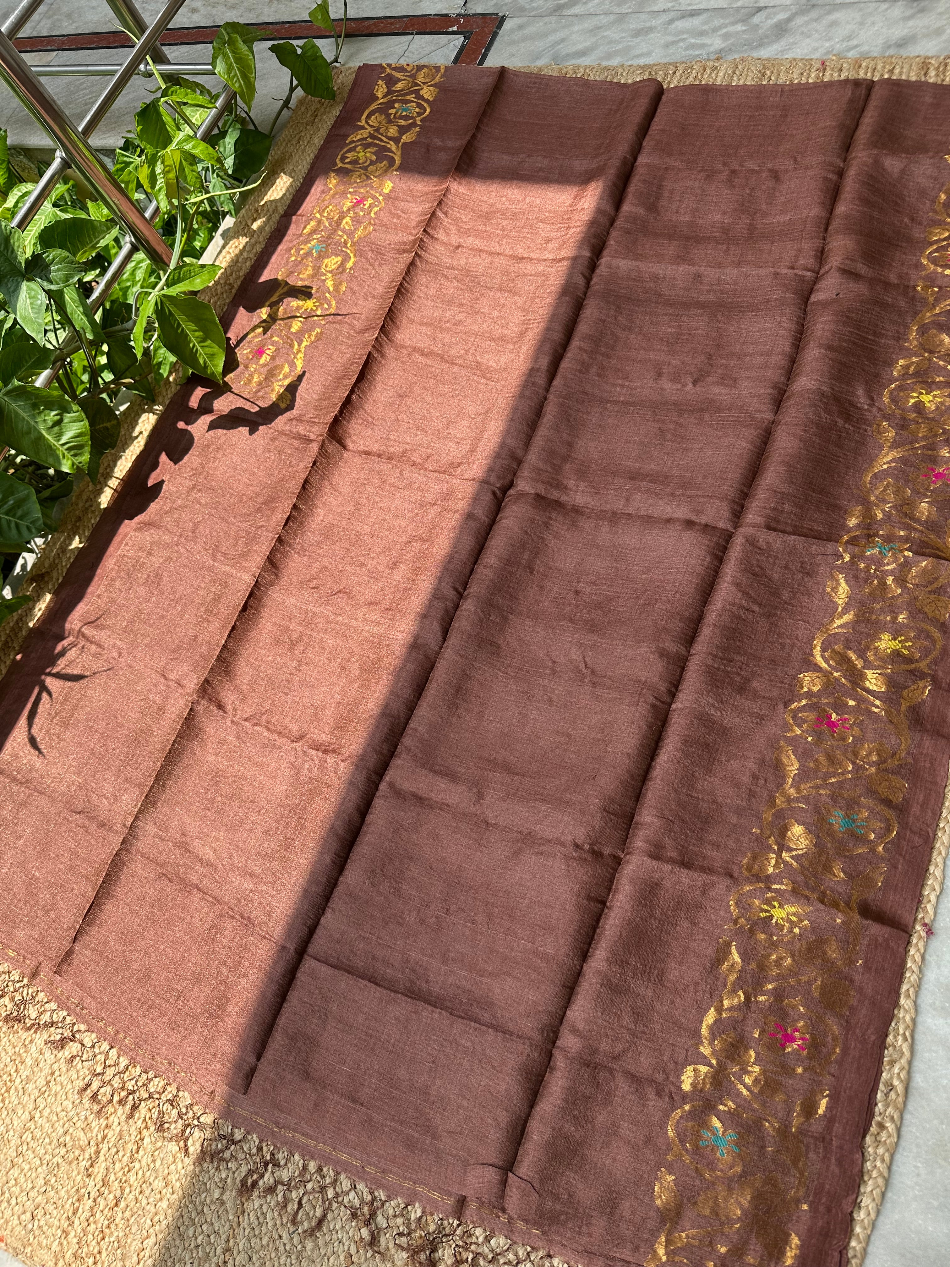 Chocolate Brown Tusser Tissue Fusion Jamdani Handloom Saree with Silk Mark
