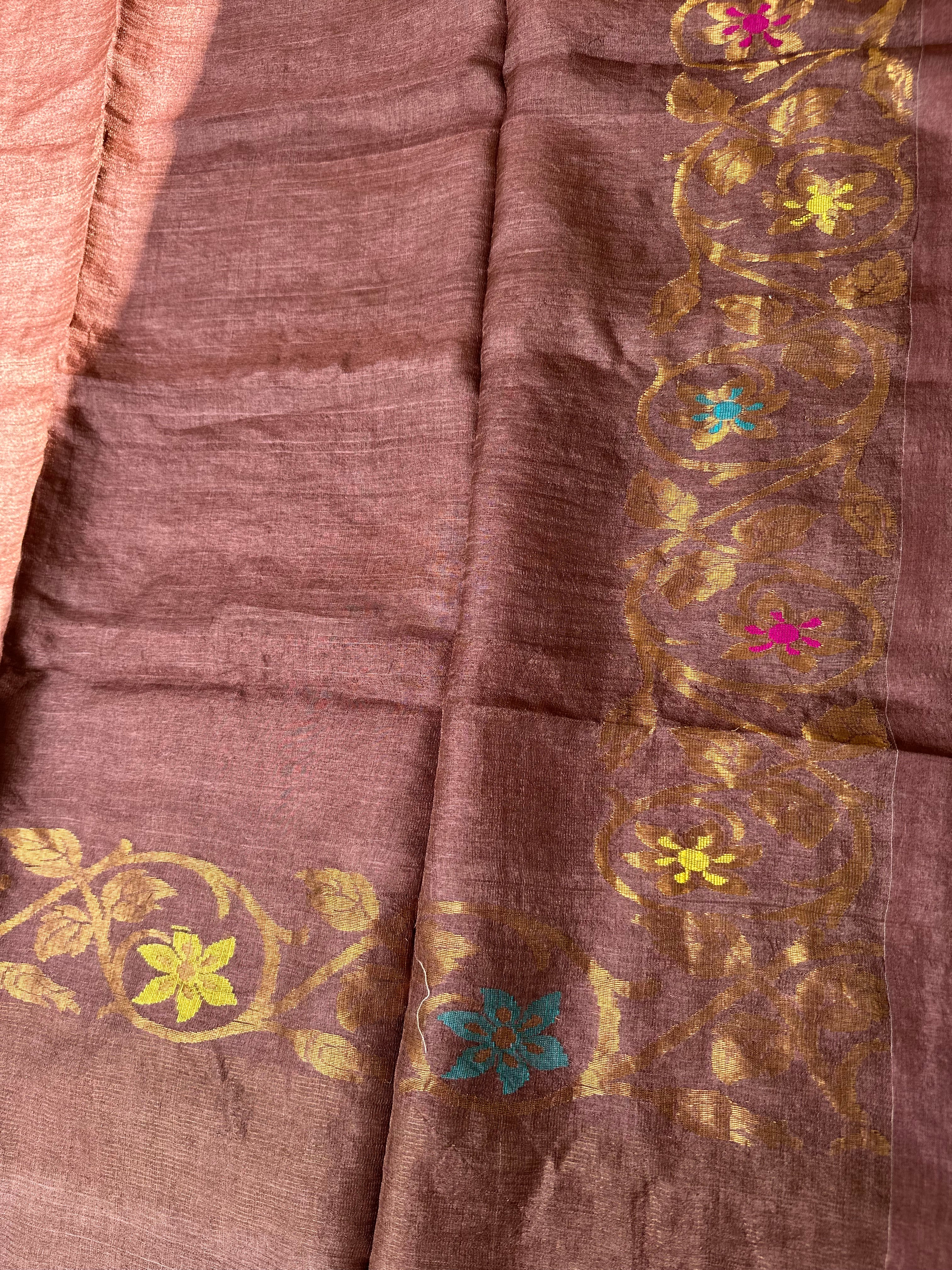 Material: Premium quality Pure Tusser saree. Comes with Govt approved Silk Mark. Jamdani work on pallu and borders using copper,silver, golden zari.