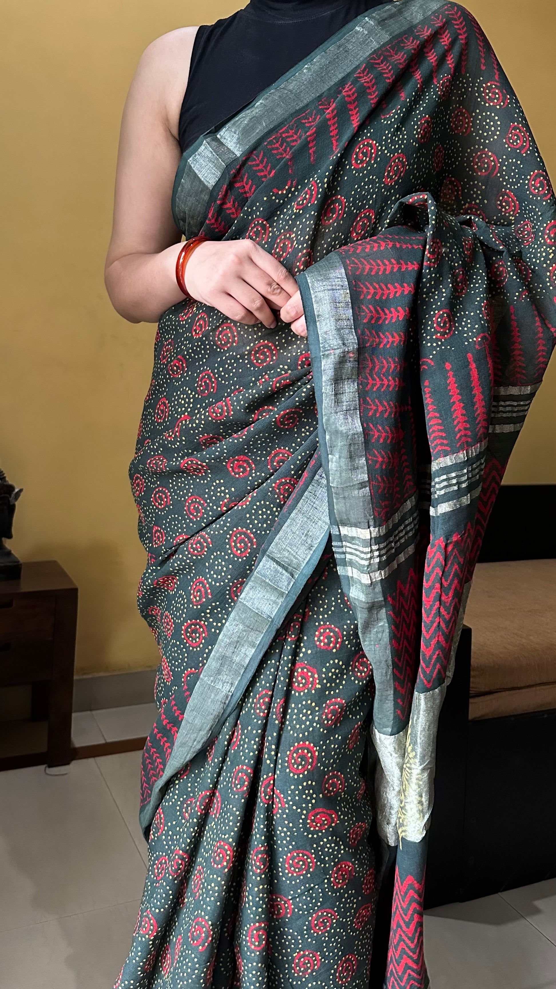 Material: Cotton Linen saree with authentic handblock print.L- 5.5 mtrs, W- 42 inches