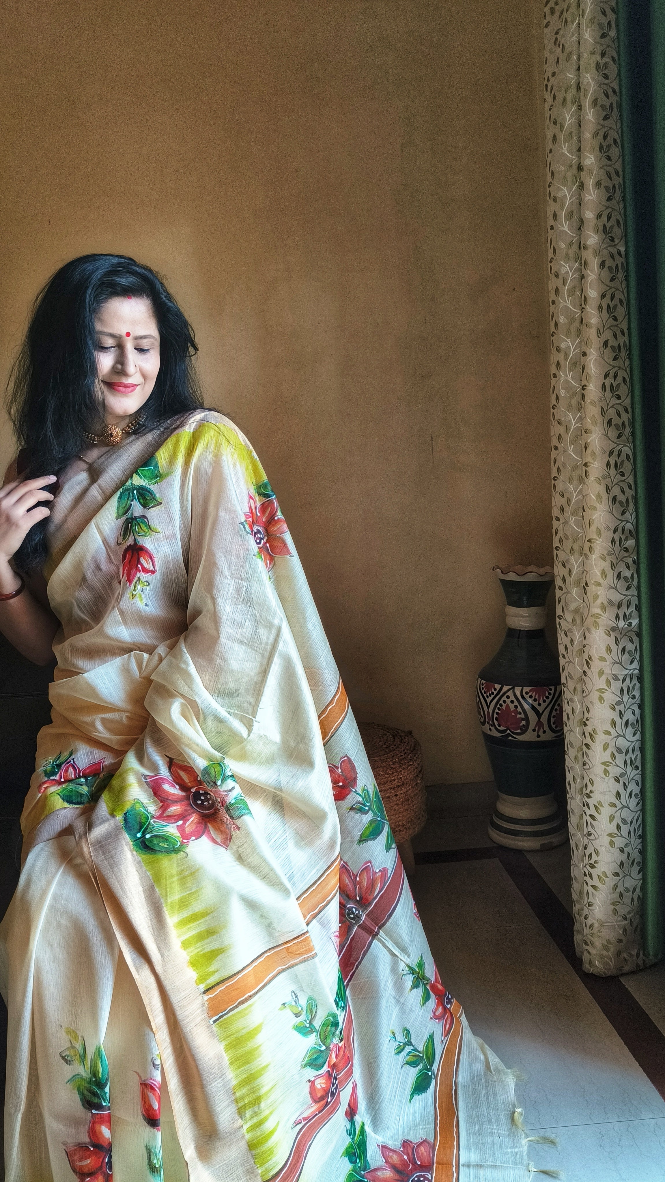 Material : Semi Bapta silk Saree with flowers and leaves handpainted on it. It has zari borders. Very beautiful saree to adorn.