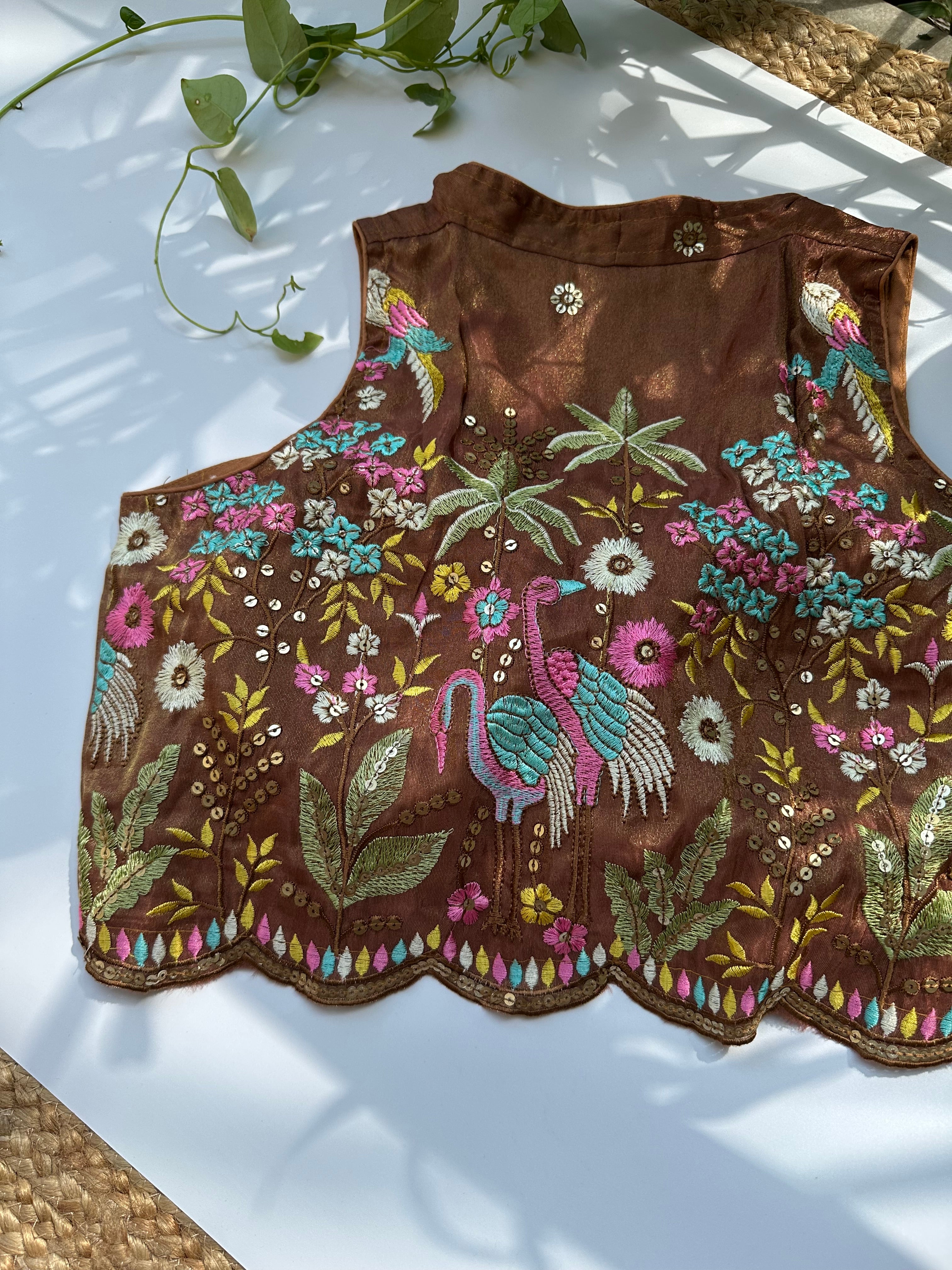 Crush Tissue Embroidered Sleeveless Blouse (Brown)