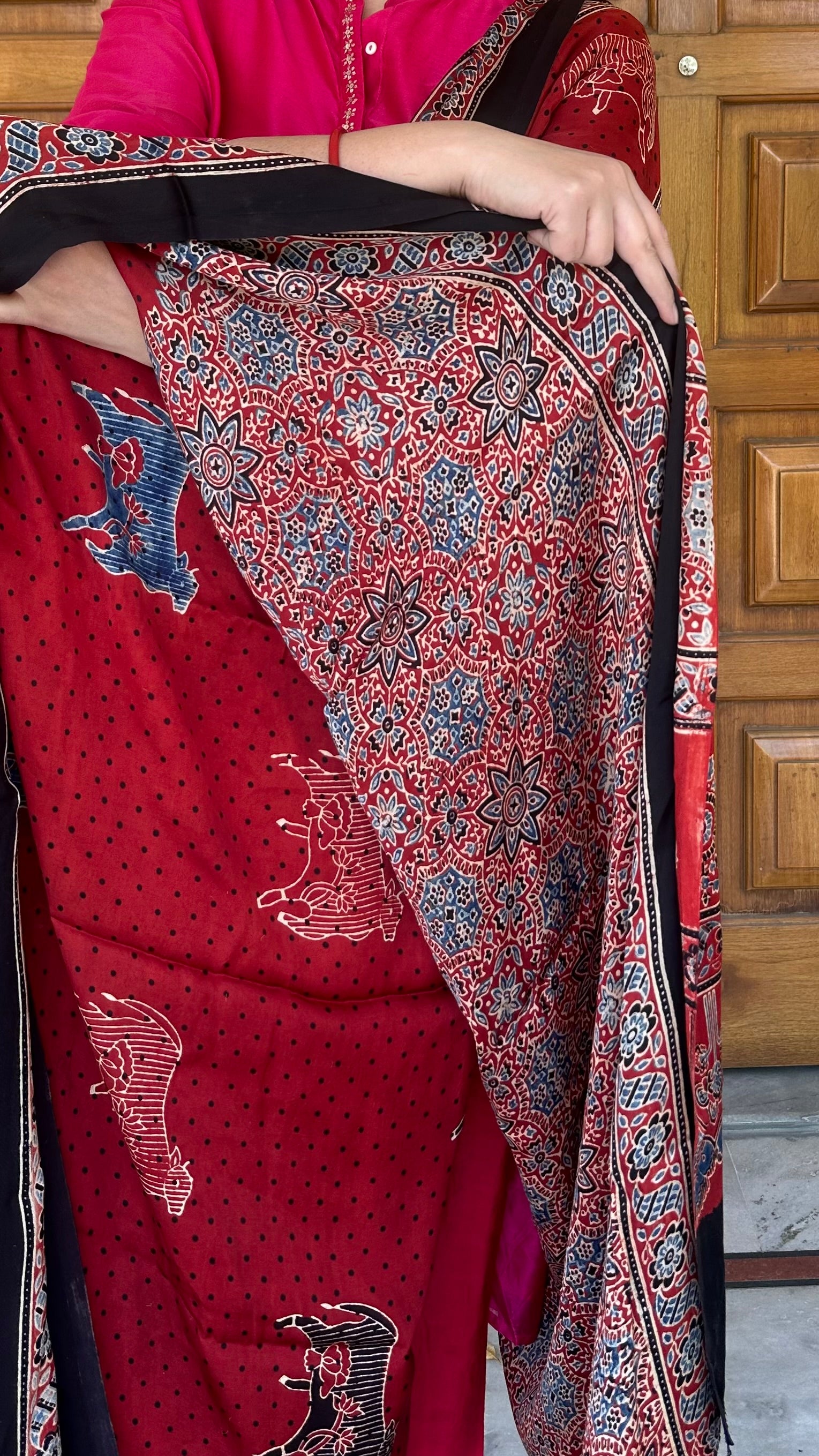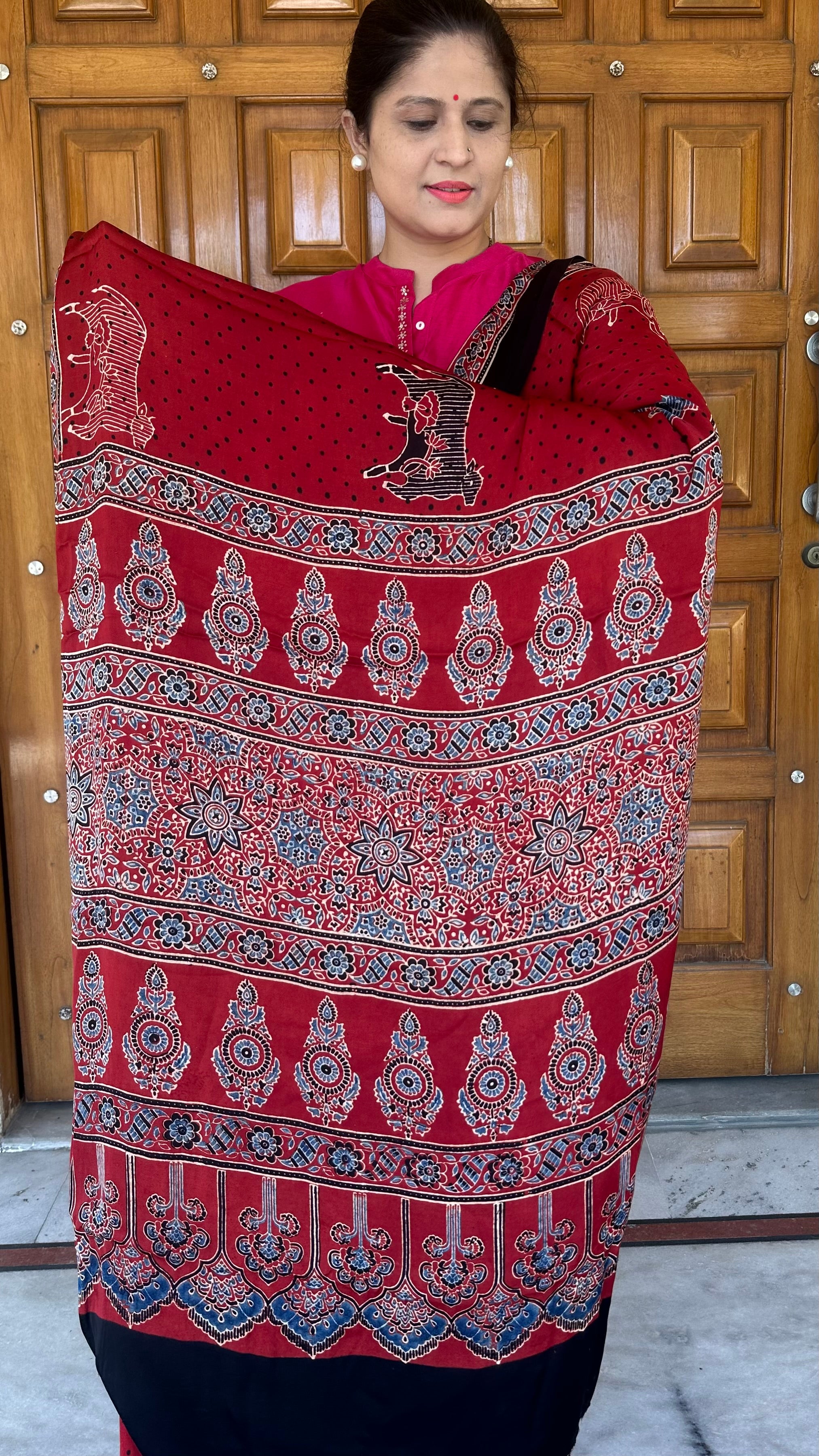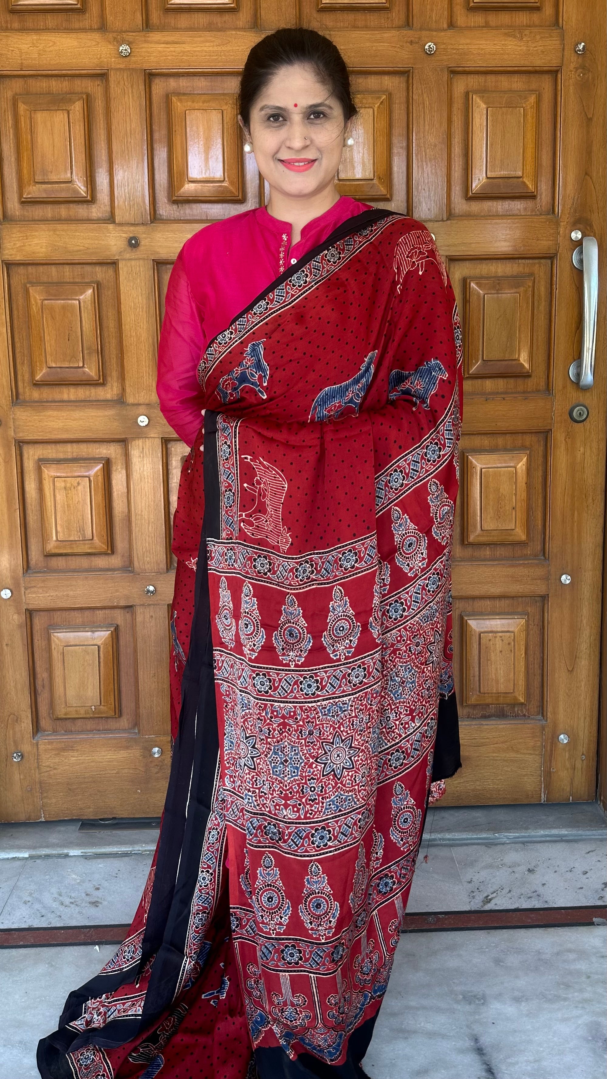 This Ajrakh Saree is a stunning piece of traditional attire from the artisanal town of Bhuj in Gujrat. Skillfully handcrafted from red ajrakh modal silk, this saree exudes timeless elegance and sophistication. An ideal pick to look your best for festive occasions!