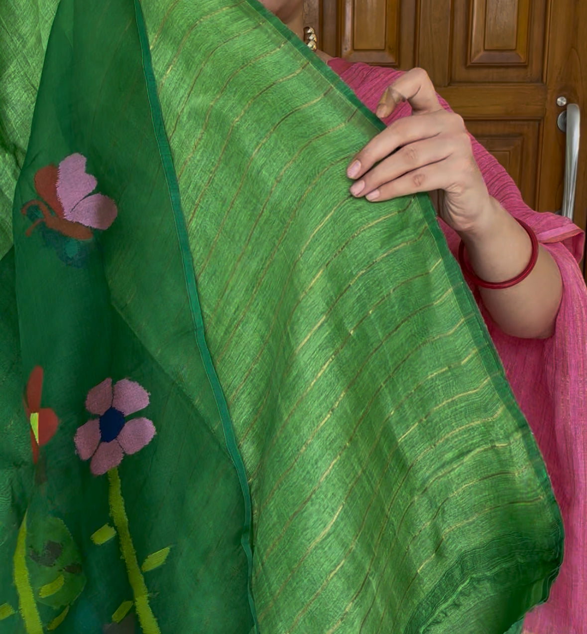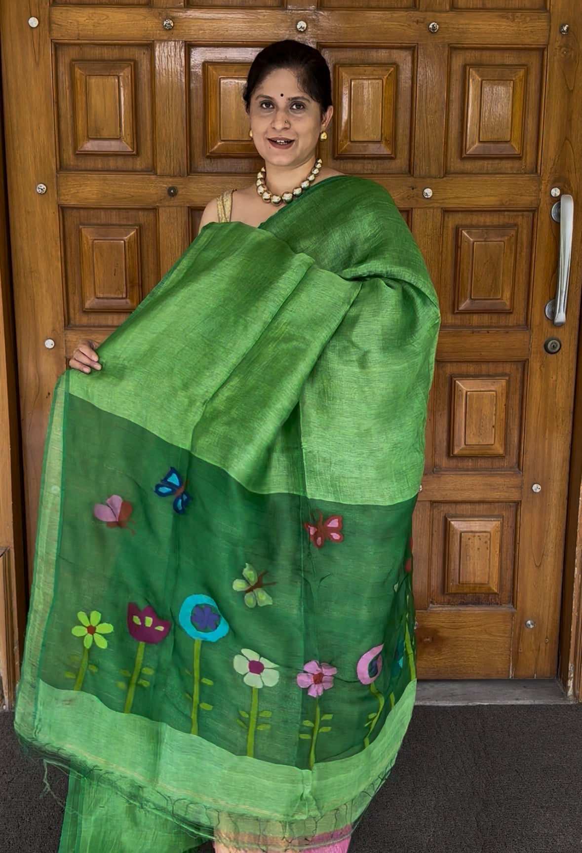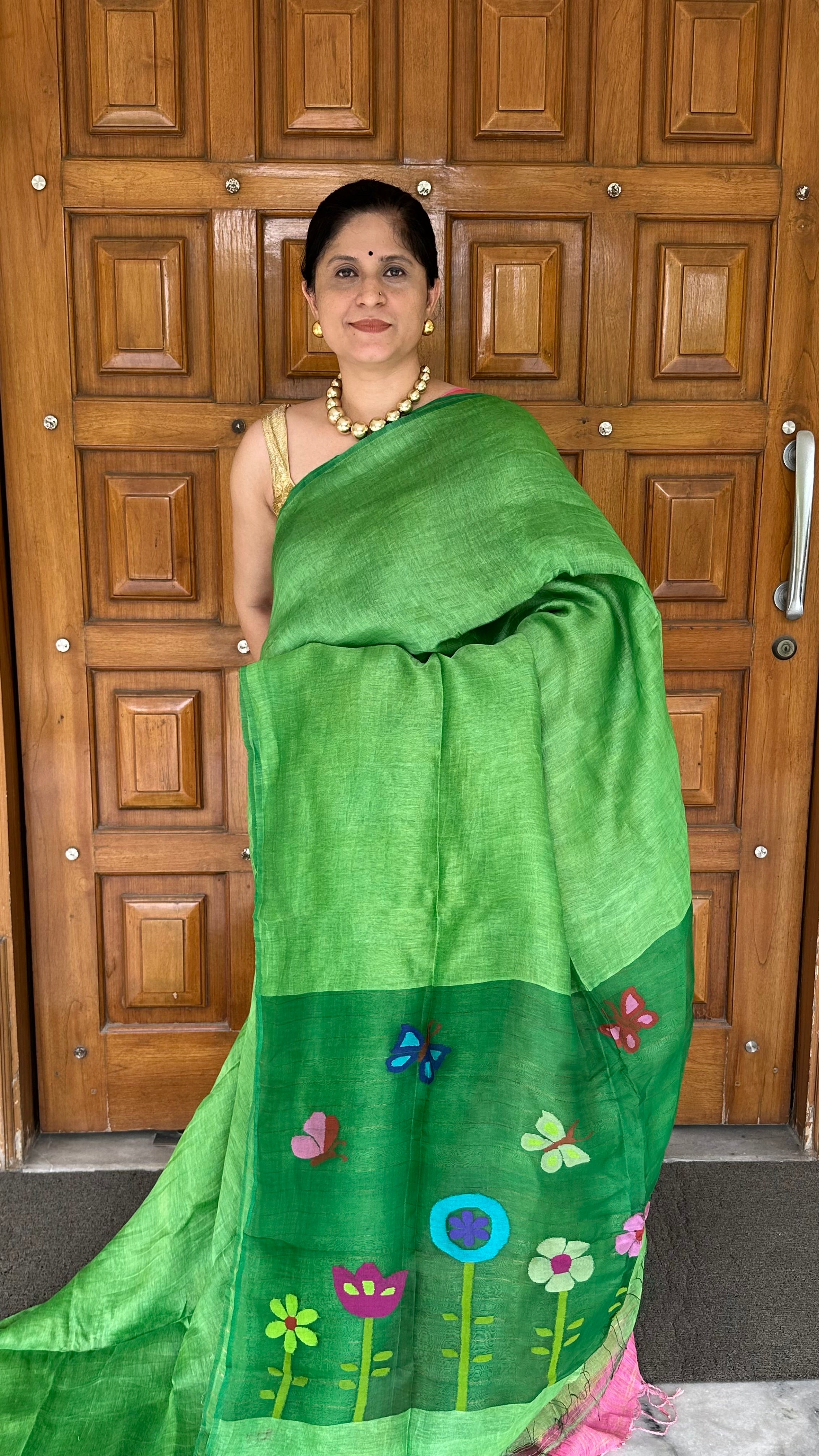 Material: Pure handloom Linen silk. Pallu is handloom muslin. Very soft and flowy. The Butterfly and flowers are handwoven. The linen used is of premium quality jayshree linen.