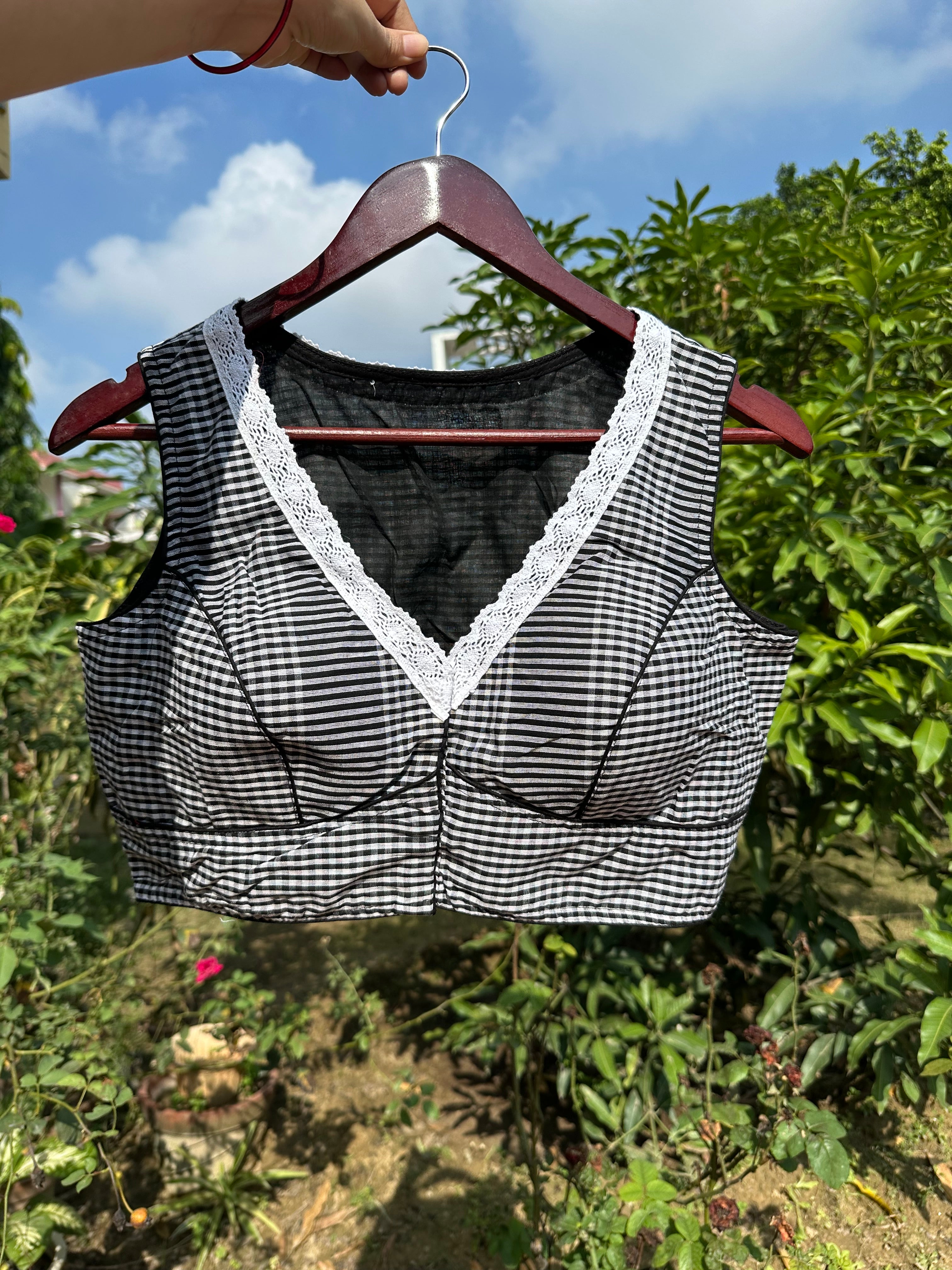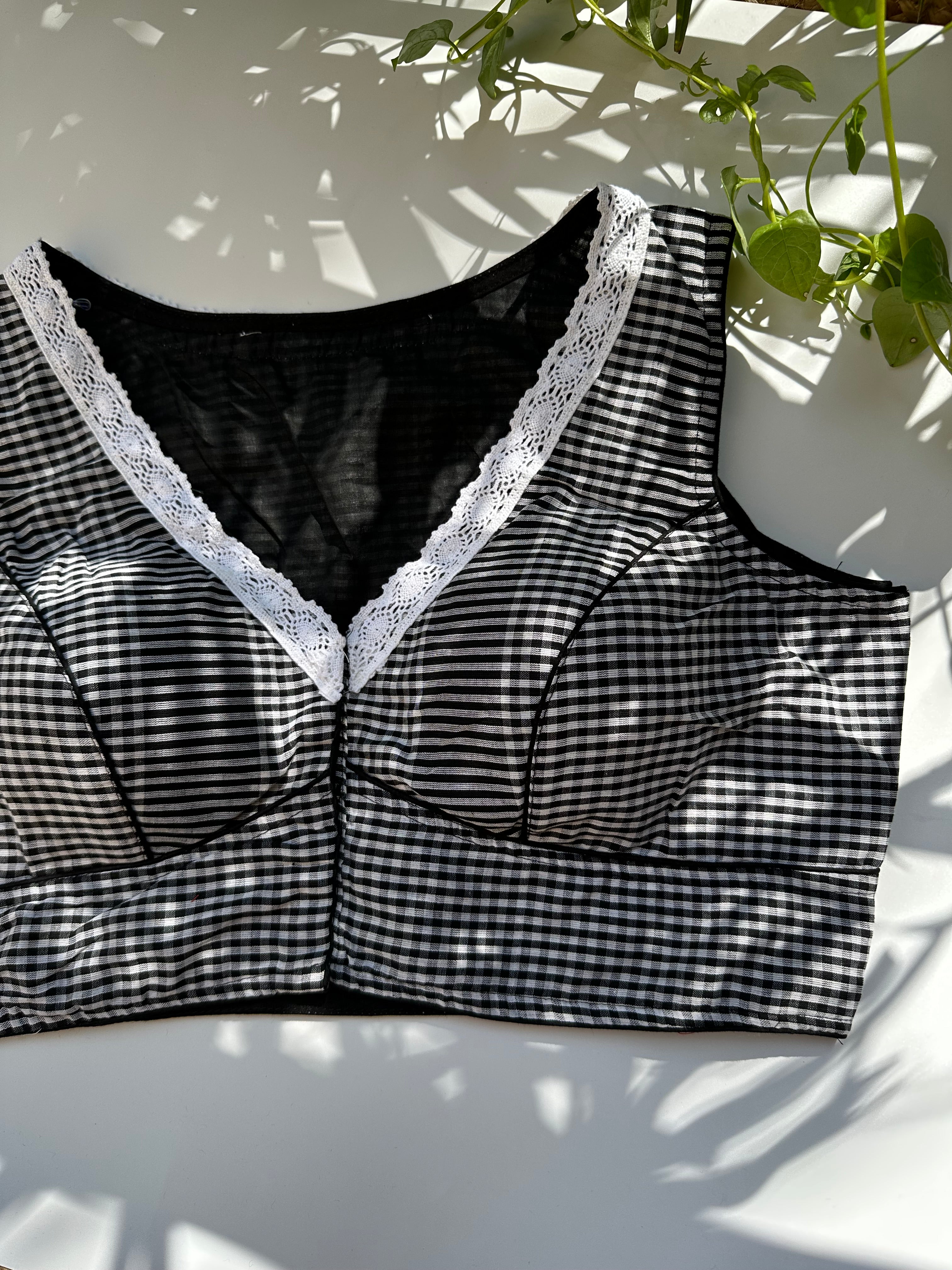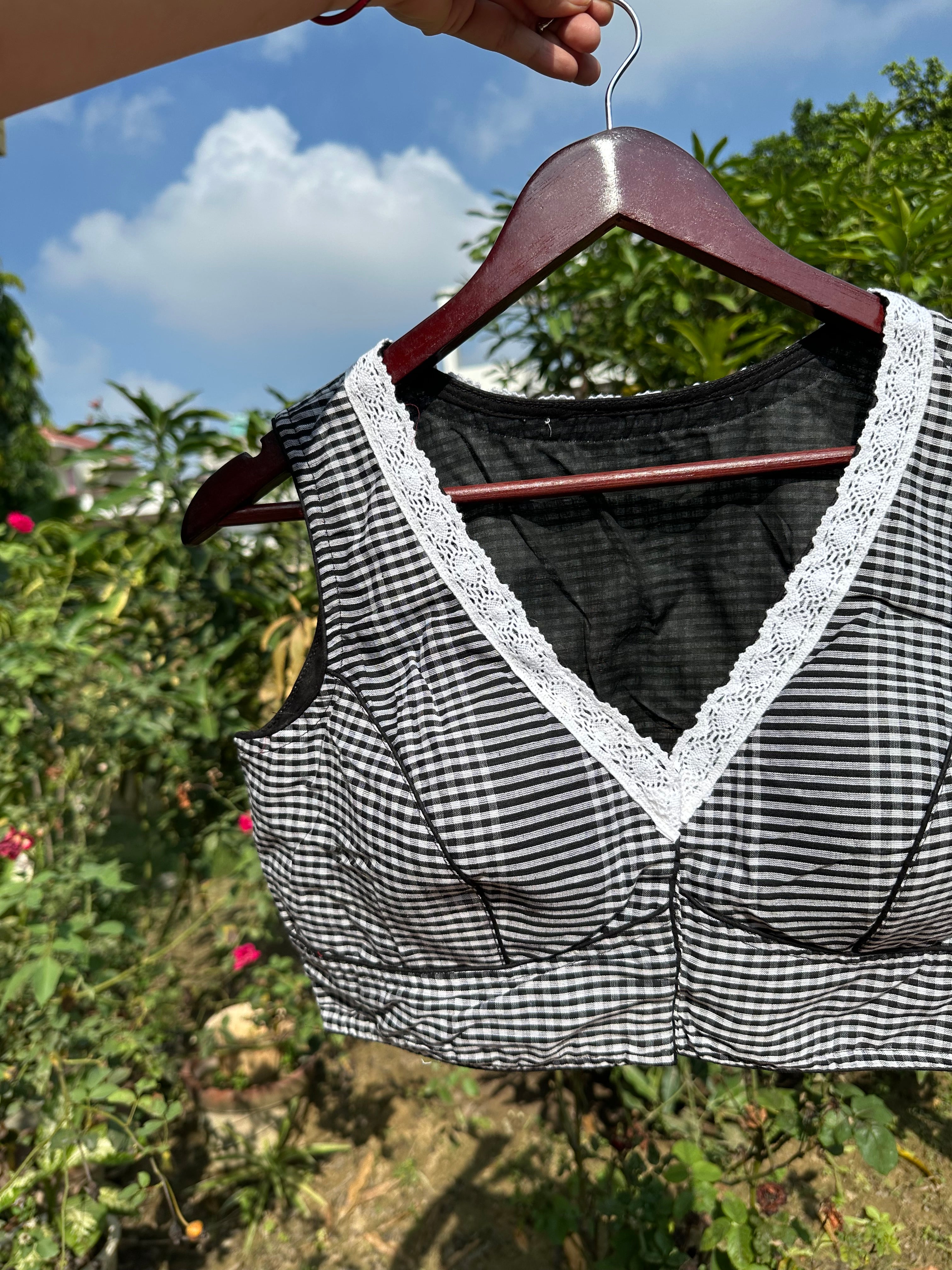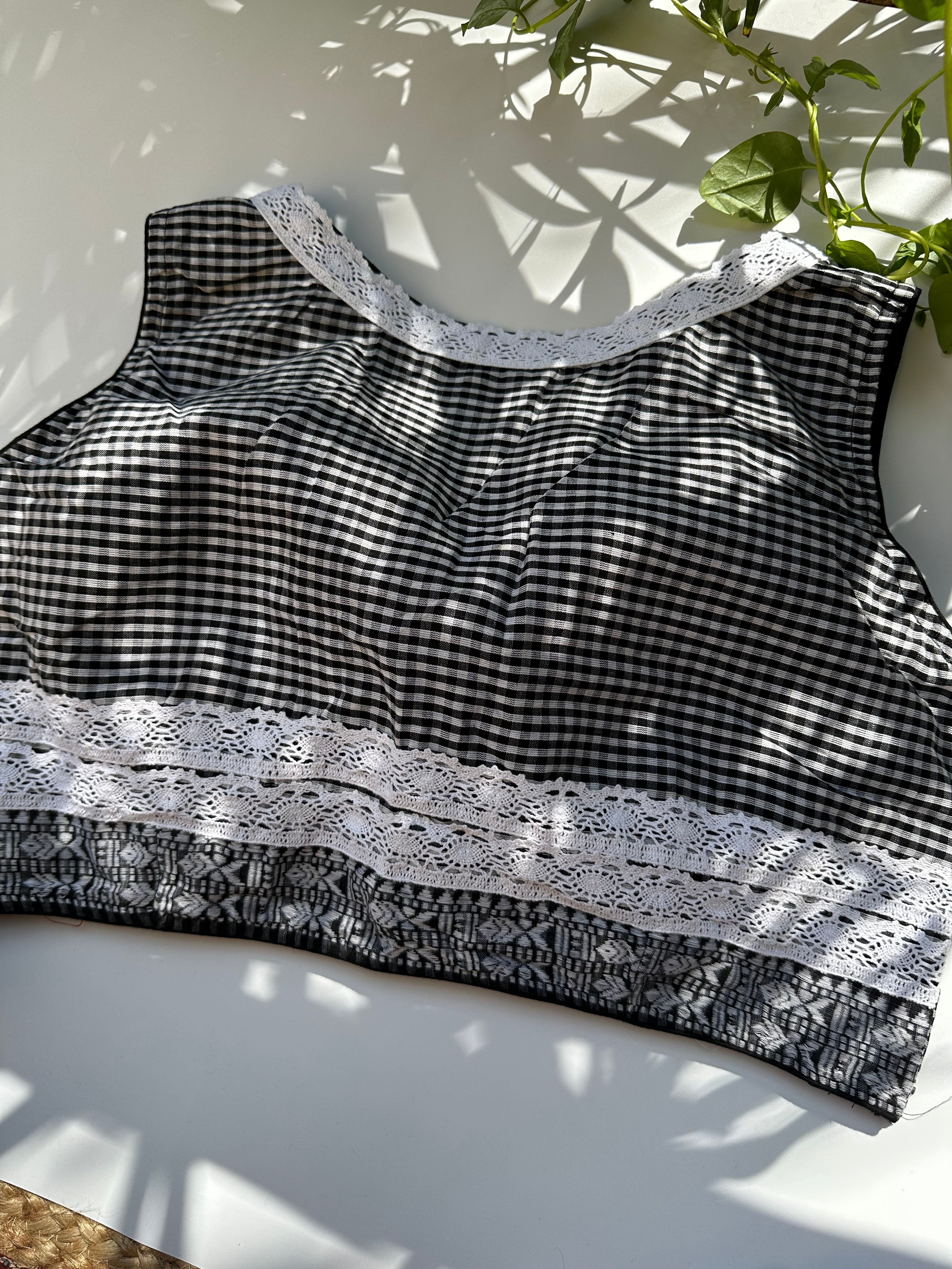 Handloom Gamcha Cotton Sleeveless Lace Work checks Blouse (Black)