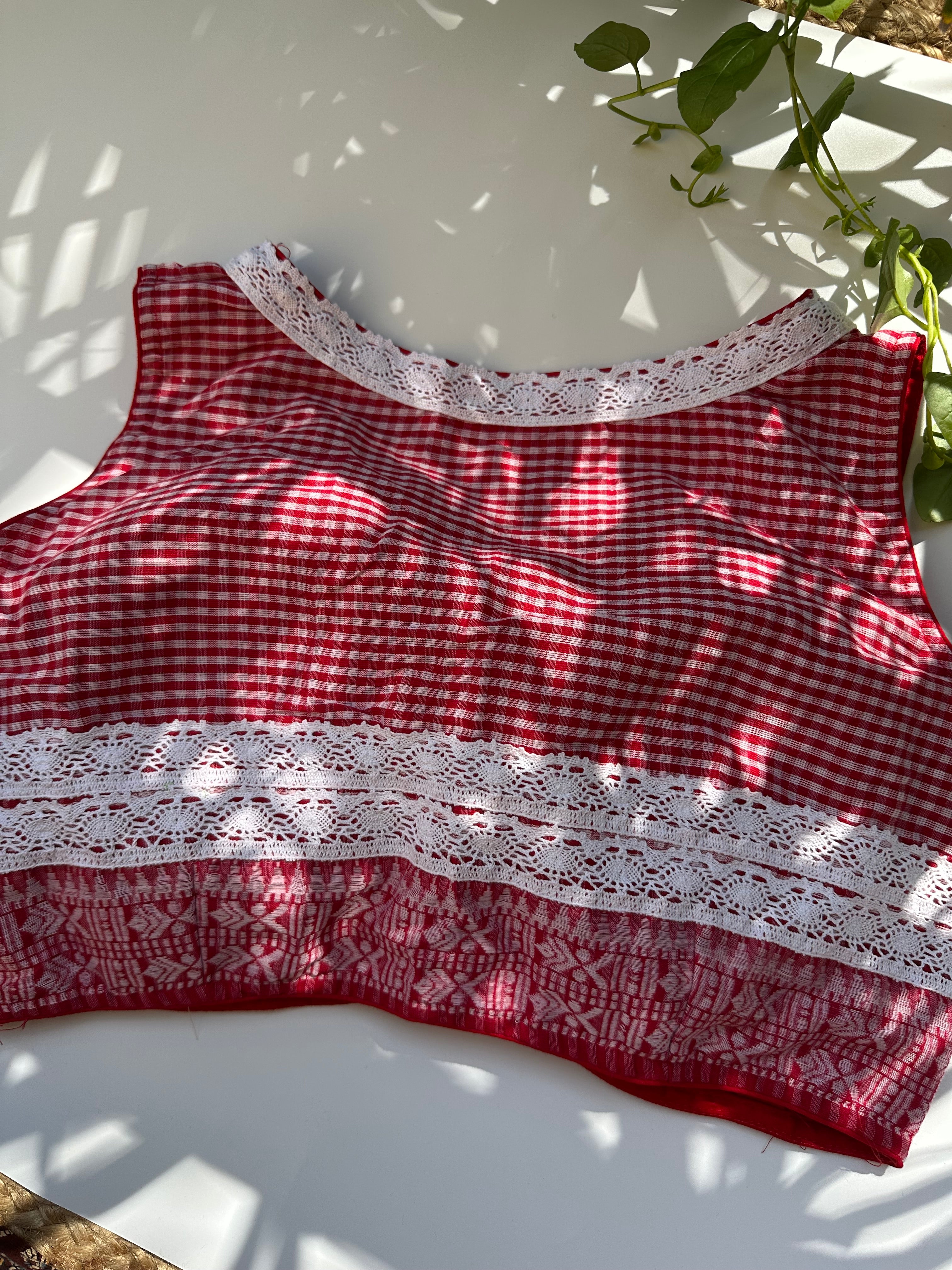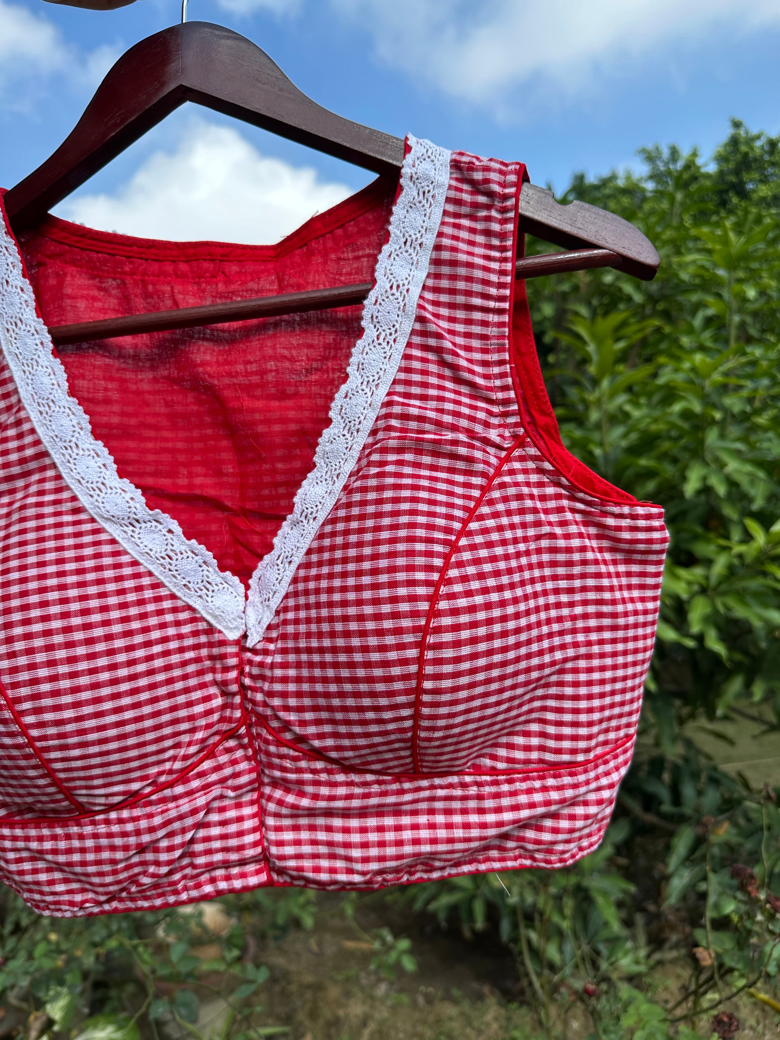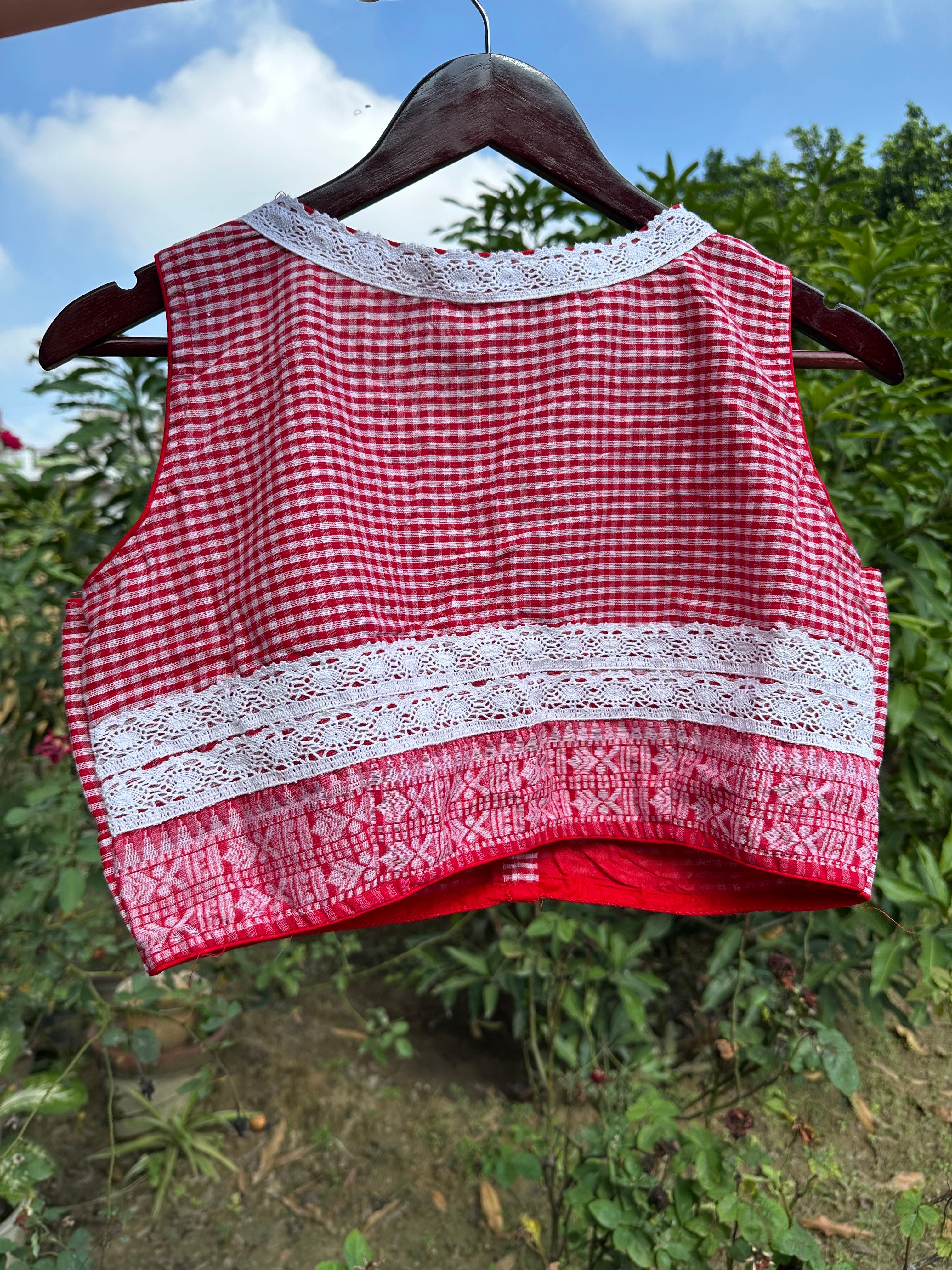 Handloom Gamcha Cotton Sleeveless Lace Work checks Blouse (Red)
