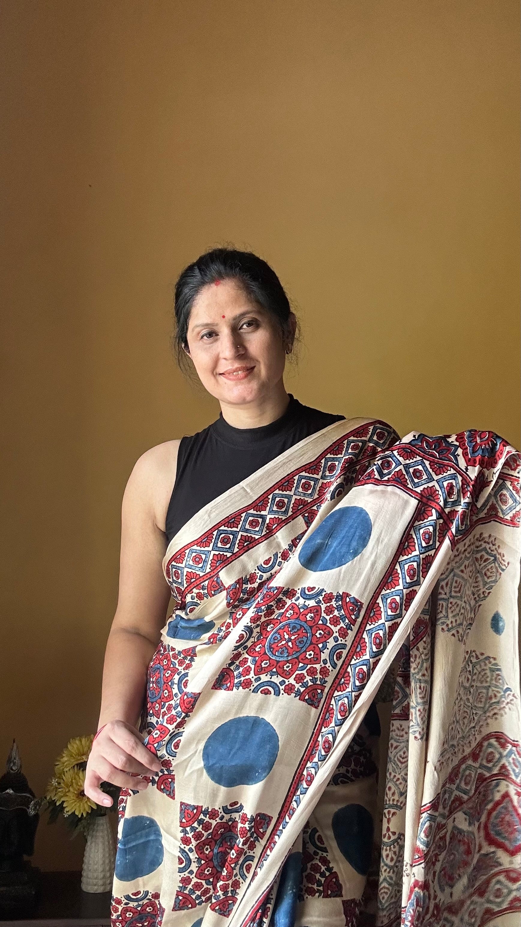 This Ajrakh Saree is a stunning piece of traditional attire from the artisanal town of Kutch in Gujrat. Skillfully handcrafted from red ajrakh modal silk, this saree exudes timeless elegance and sophistication. An ideal pick to look your best for festive occasions!