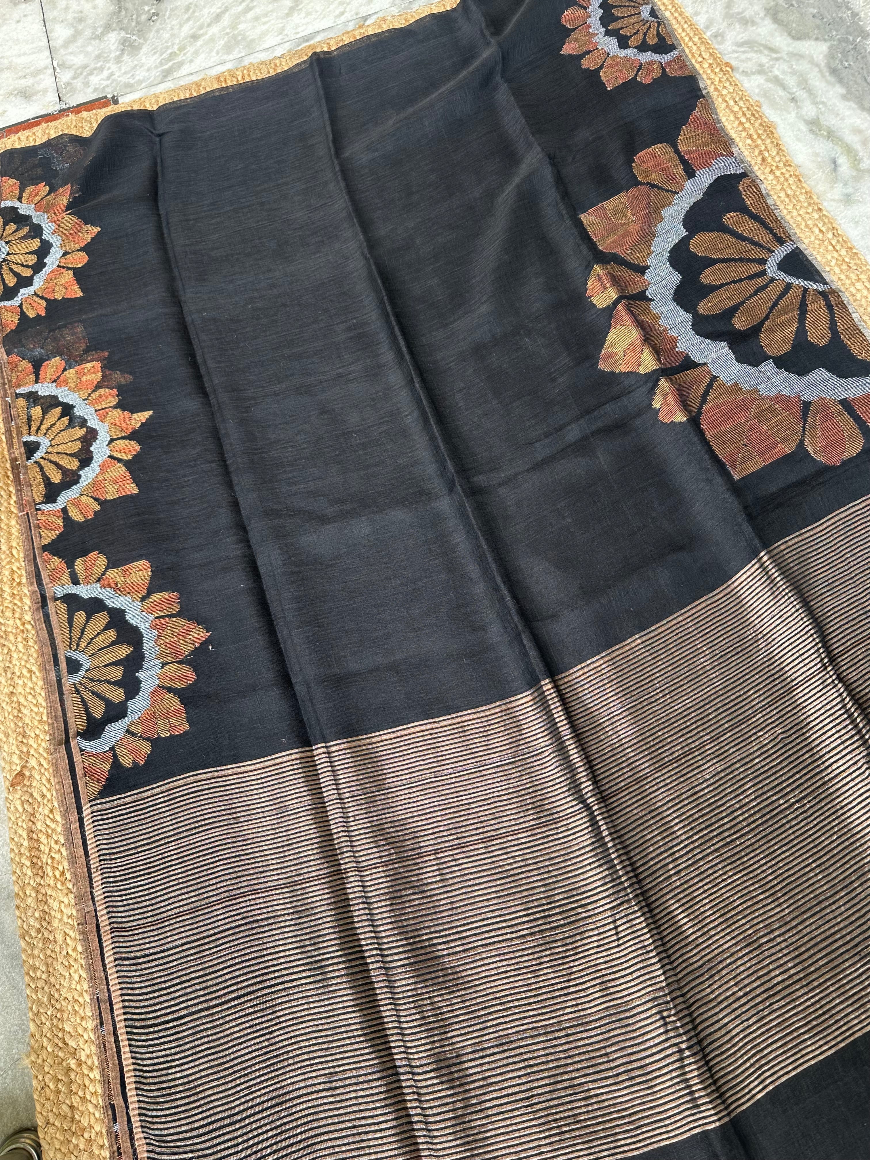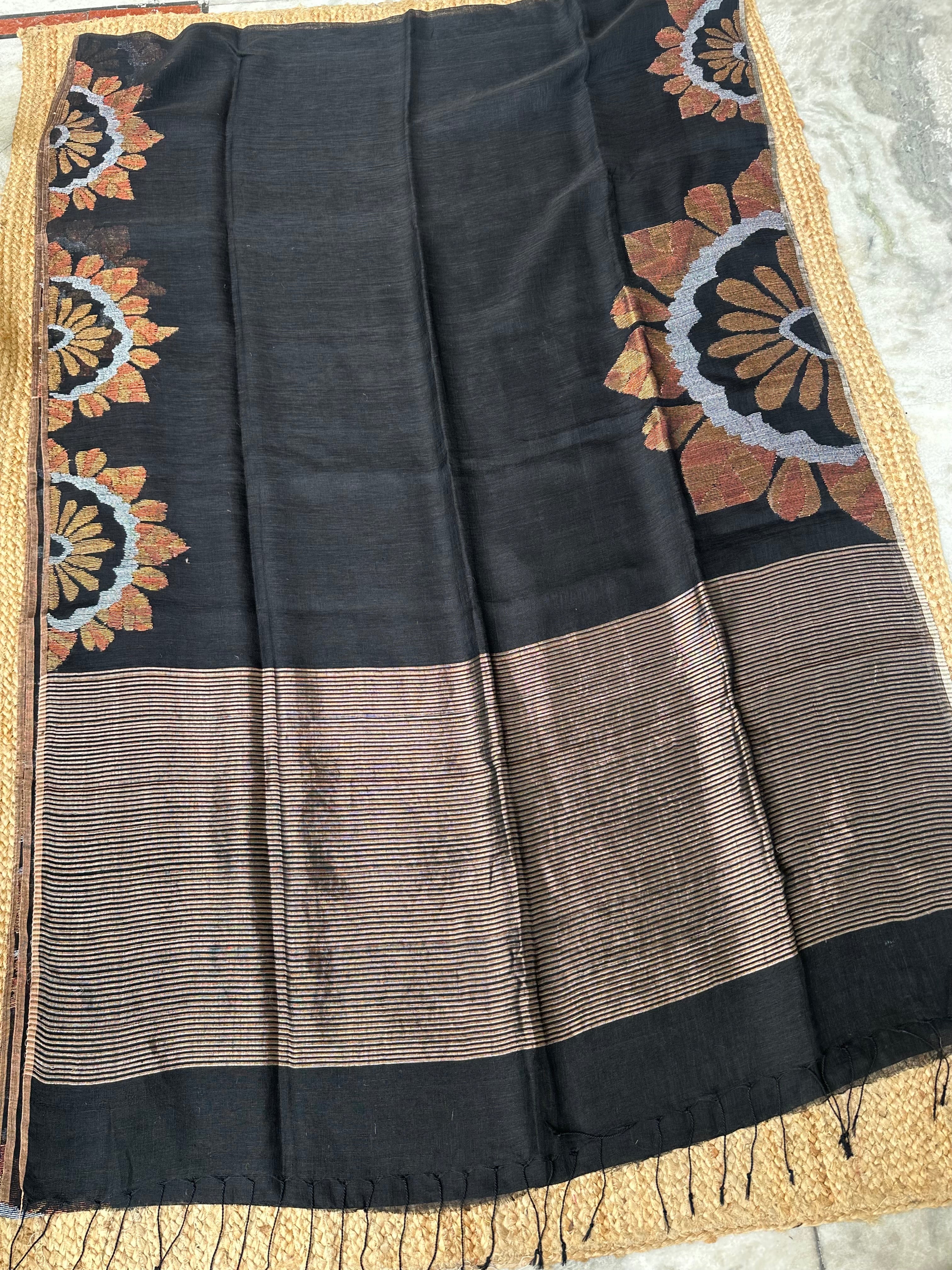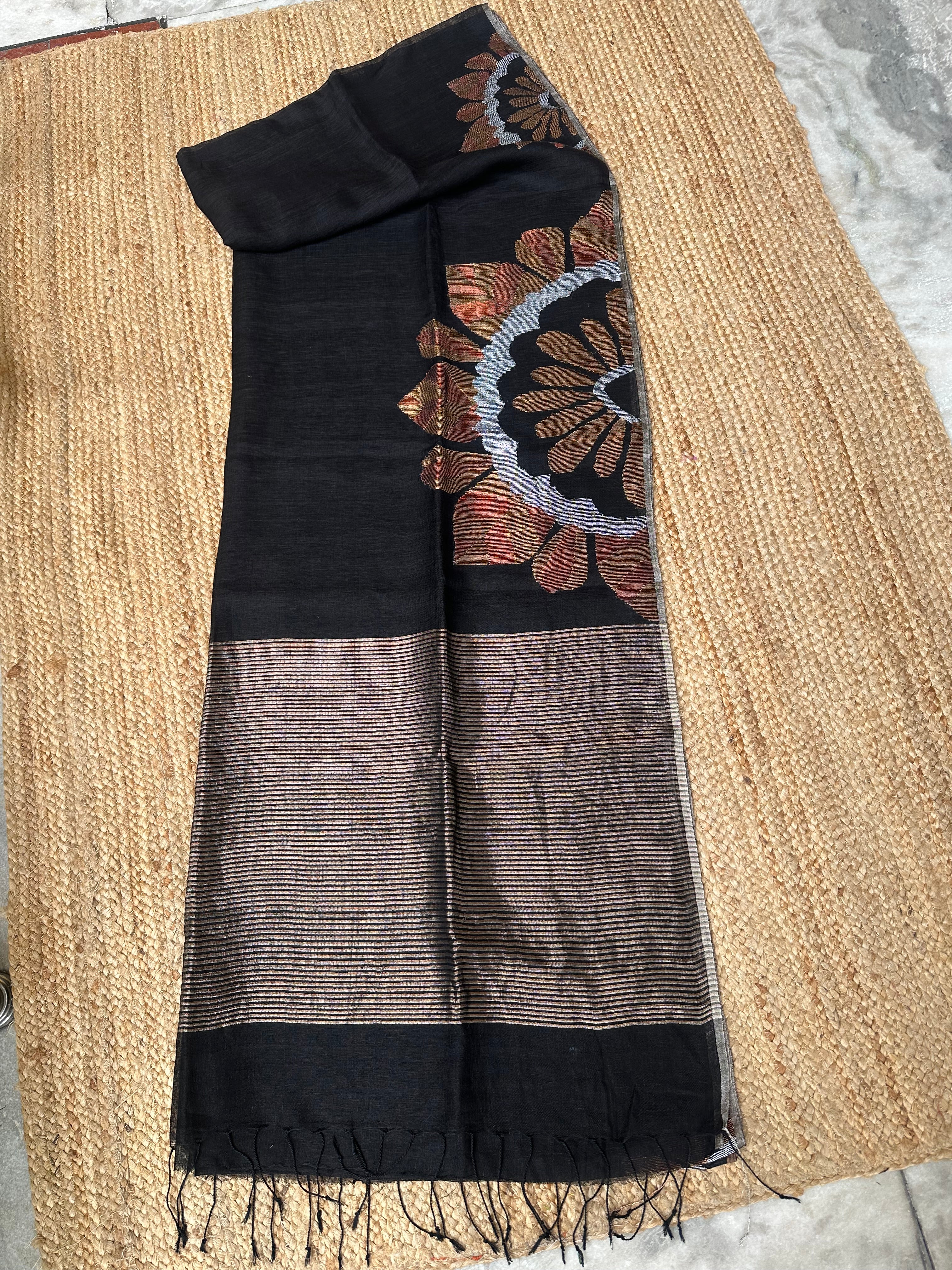 Material: Pure Jayshree 100 count linen with three colour zari woven work in semi circle motifs on borders. There is one big design on fron part and other are small.