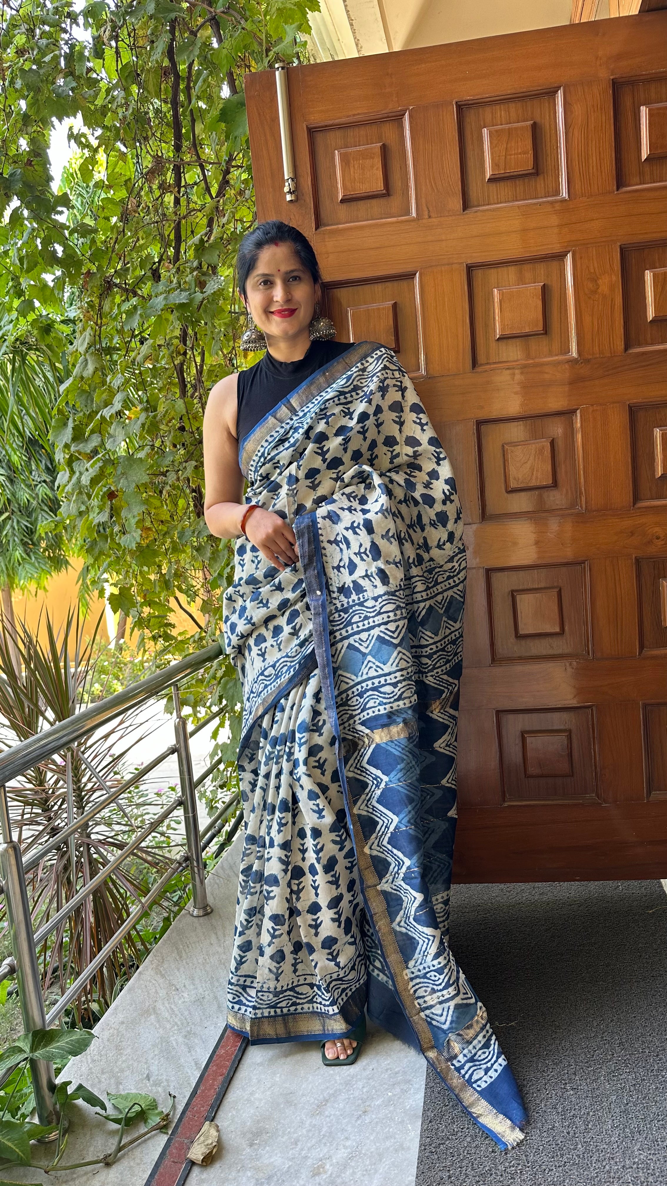 This Maheshwari Handblock saree is crafted by hand with an authentic indigo Handblock print and zari border. Enjoy stylish comfort and unique craftsmanship with this luxurious saree.