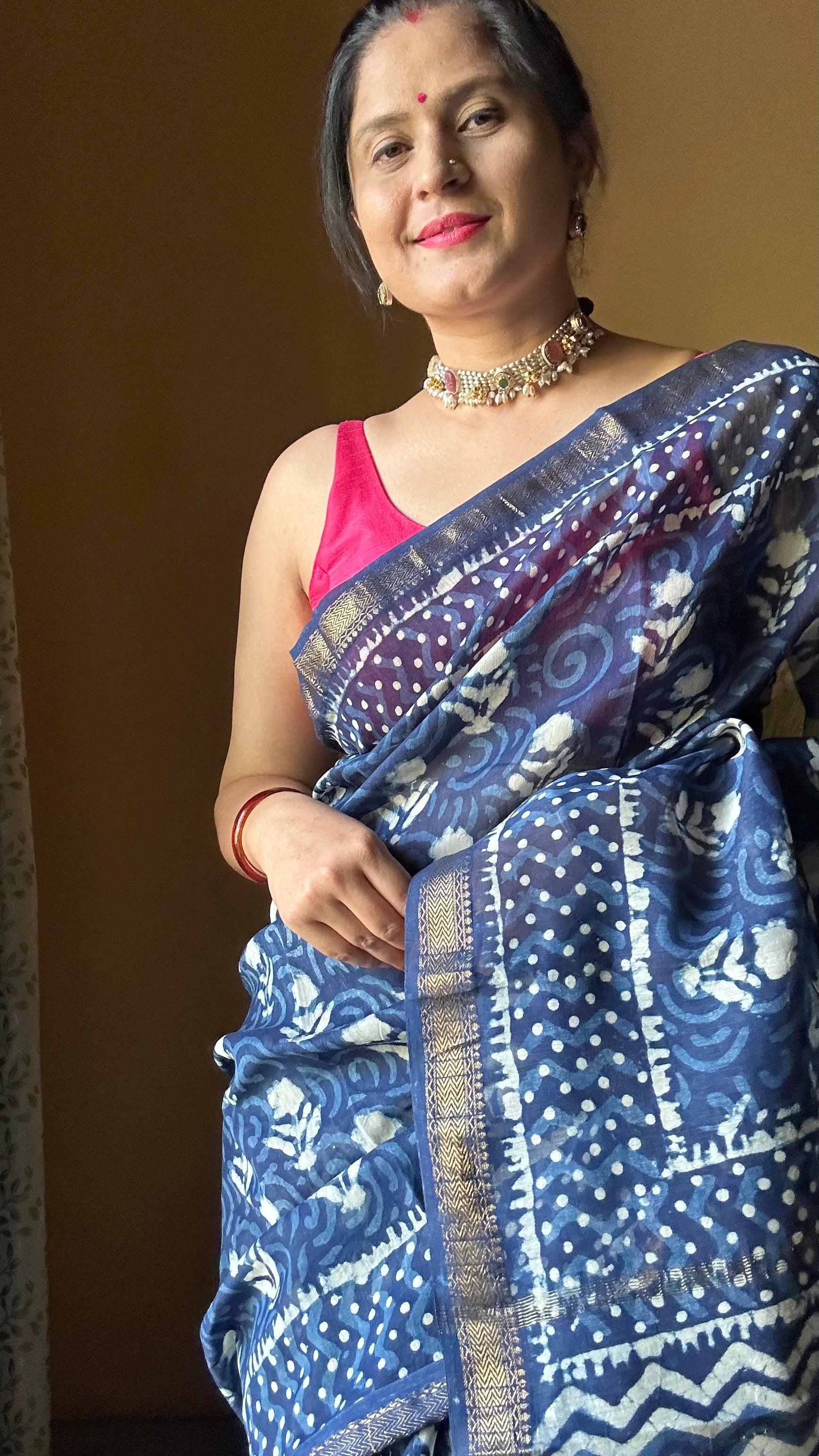 This Maheshwari Handblock saree is crafted by hand with an authentic indigo Handblock print and zari border. Enjoy stylish comfort and unique craftsmanship with this luxurious saree.