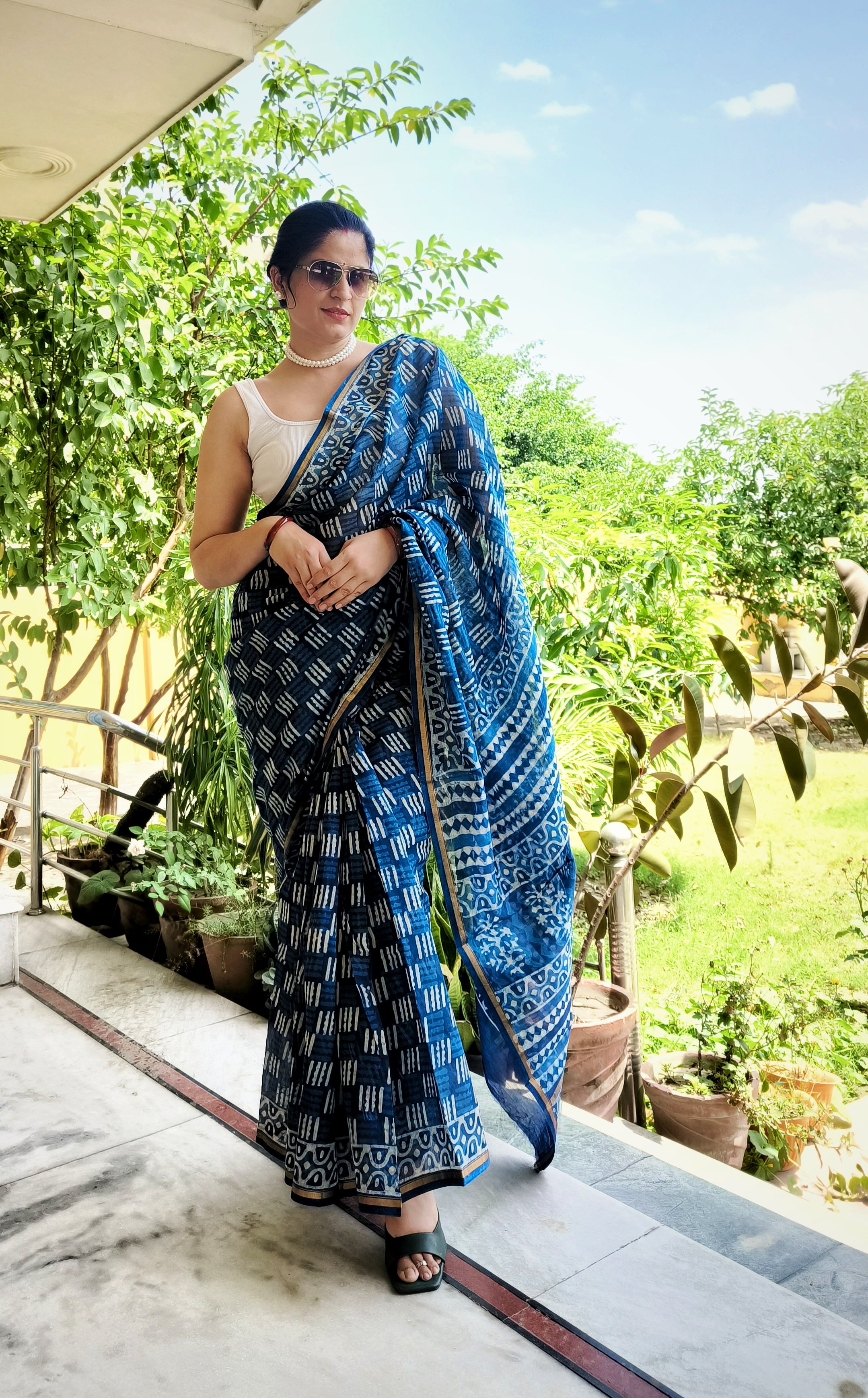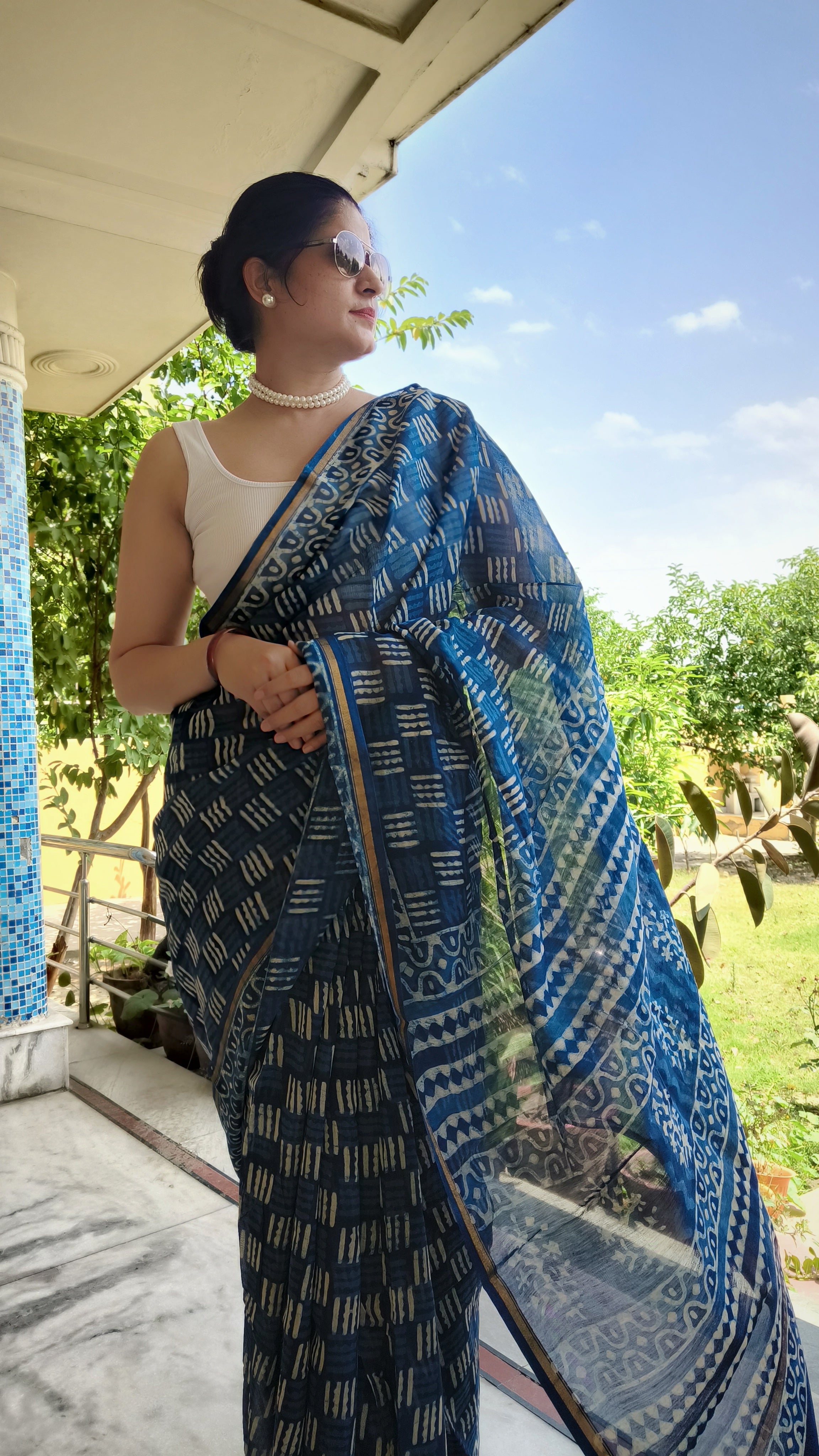 Experience the beauty of Maheshwari Handblock Saree , featuring a stunning indigo pattern. This unique, handcrafted saree is perfect for any occasion, offering an elegance that is truly special. Enjoy the tradition and quality of a truly unique piece.