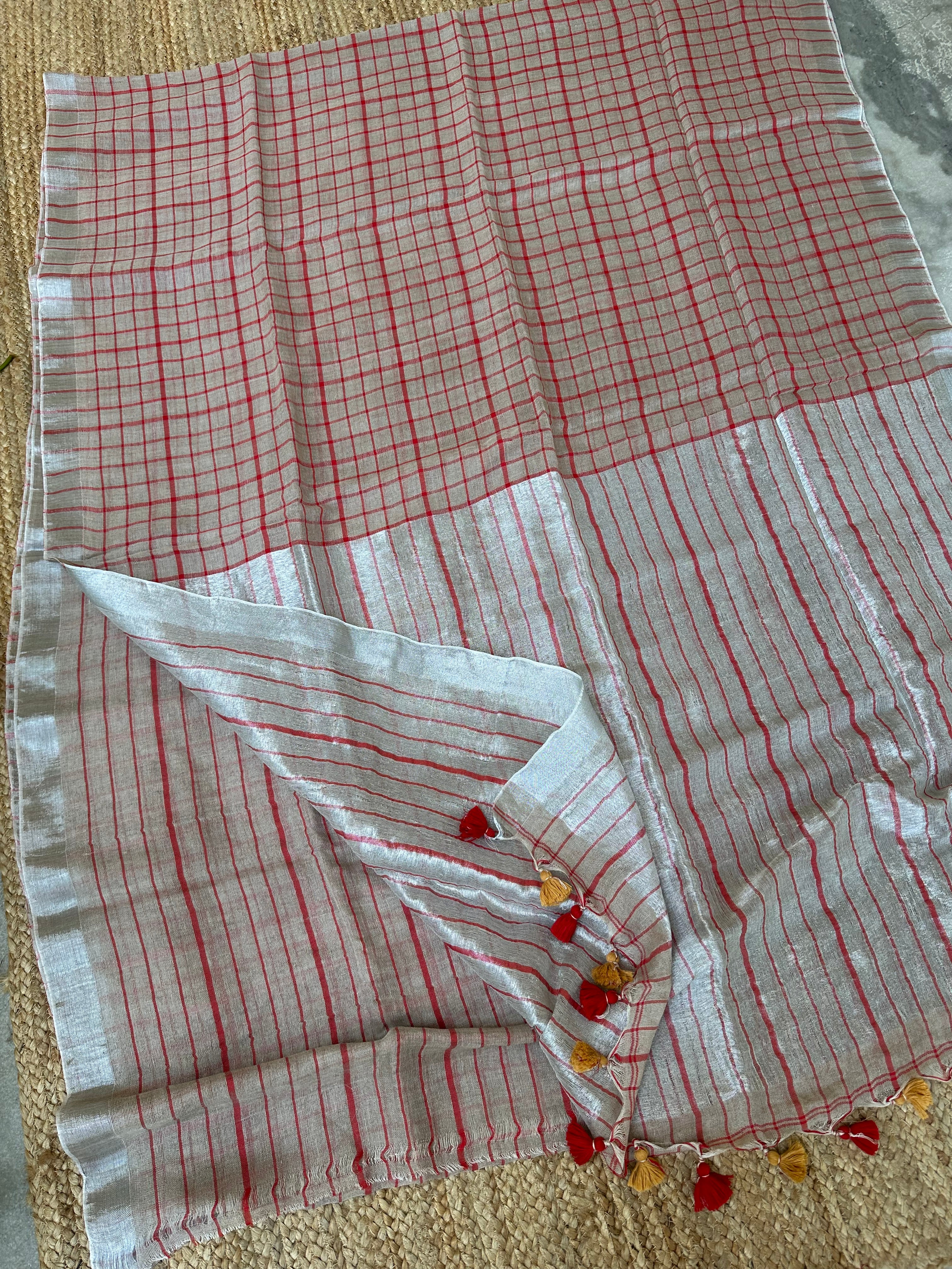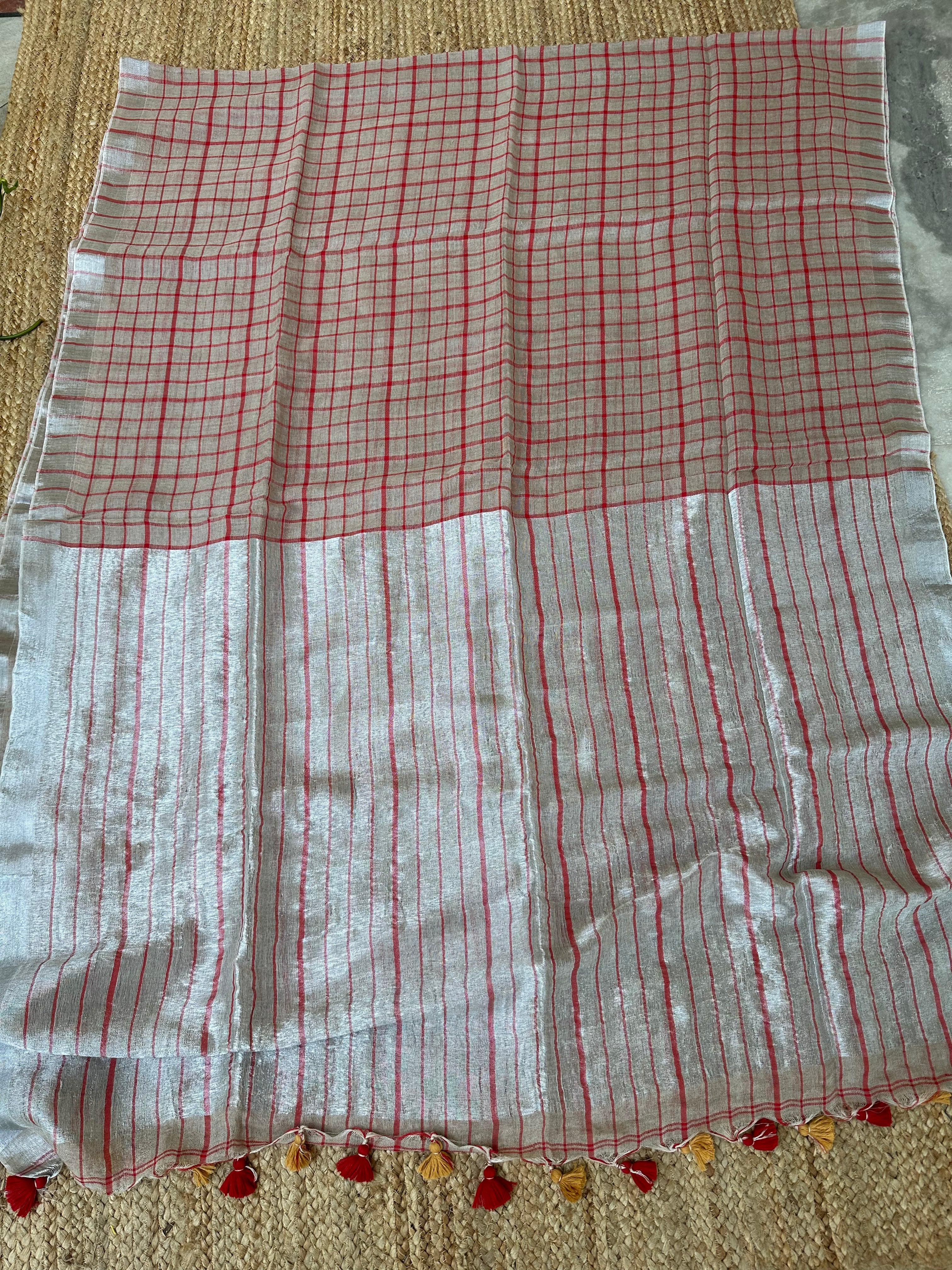 Base is muddy cream and checks are of red colour. Pallu is Silver zari woven. Has tassels.
