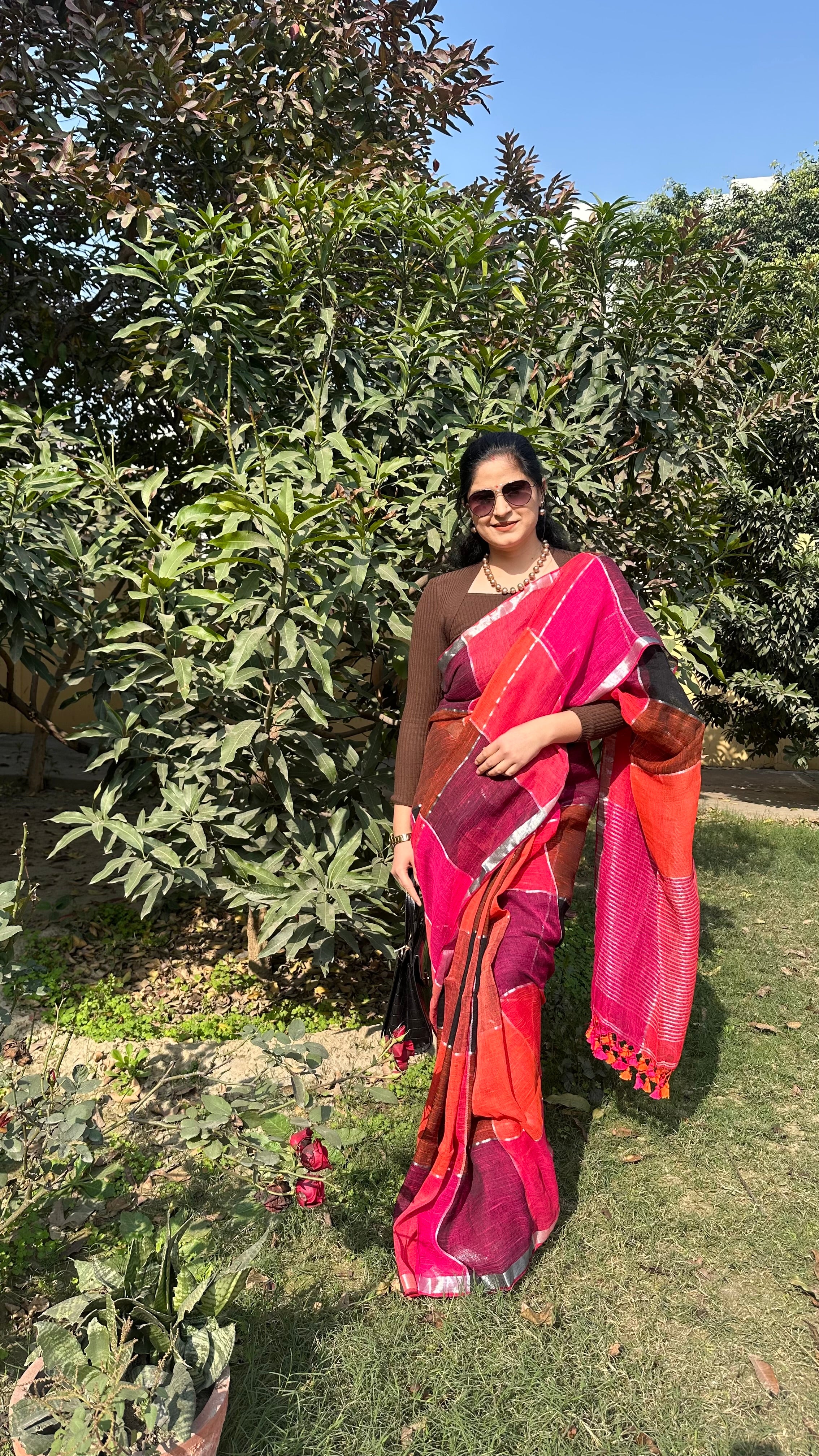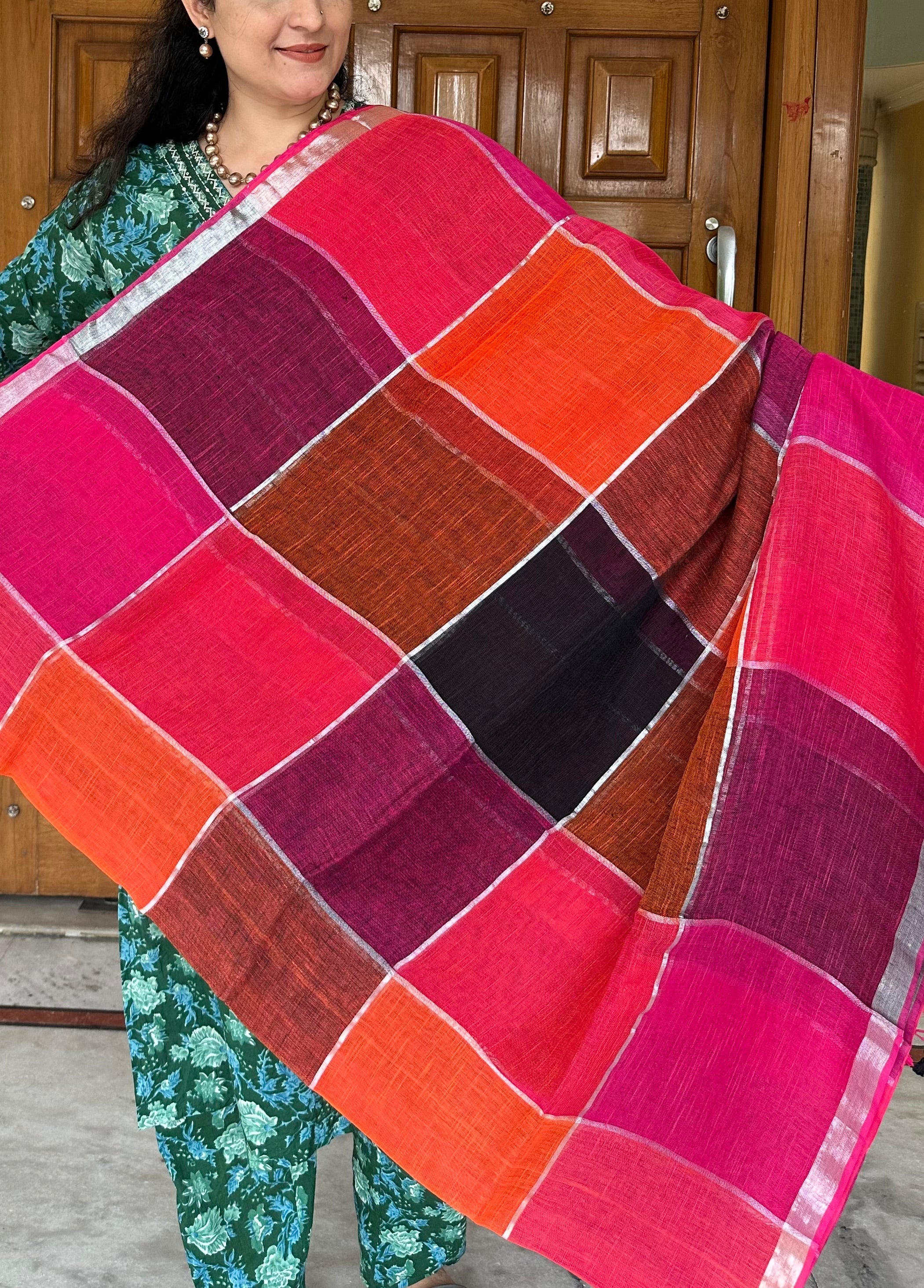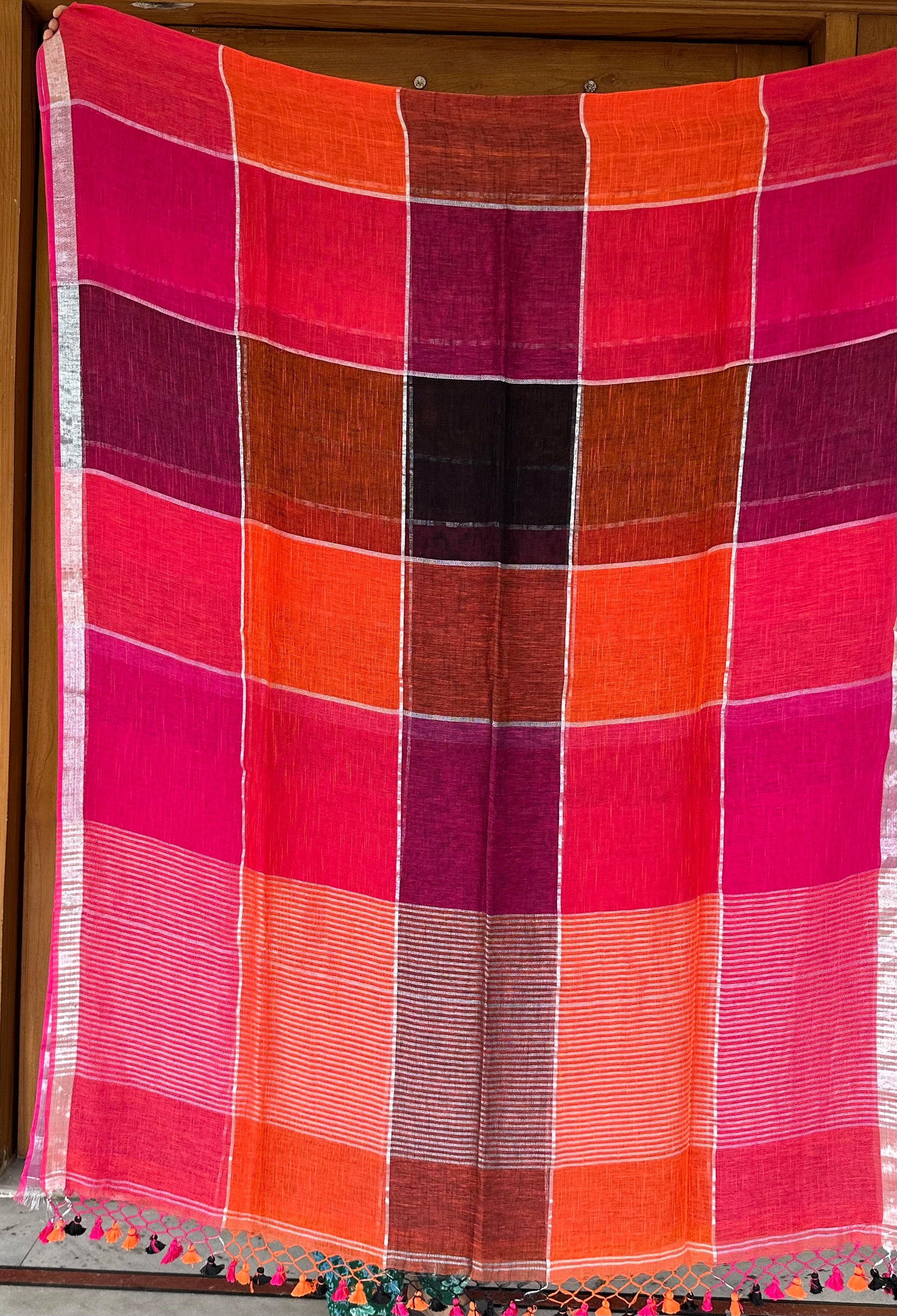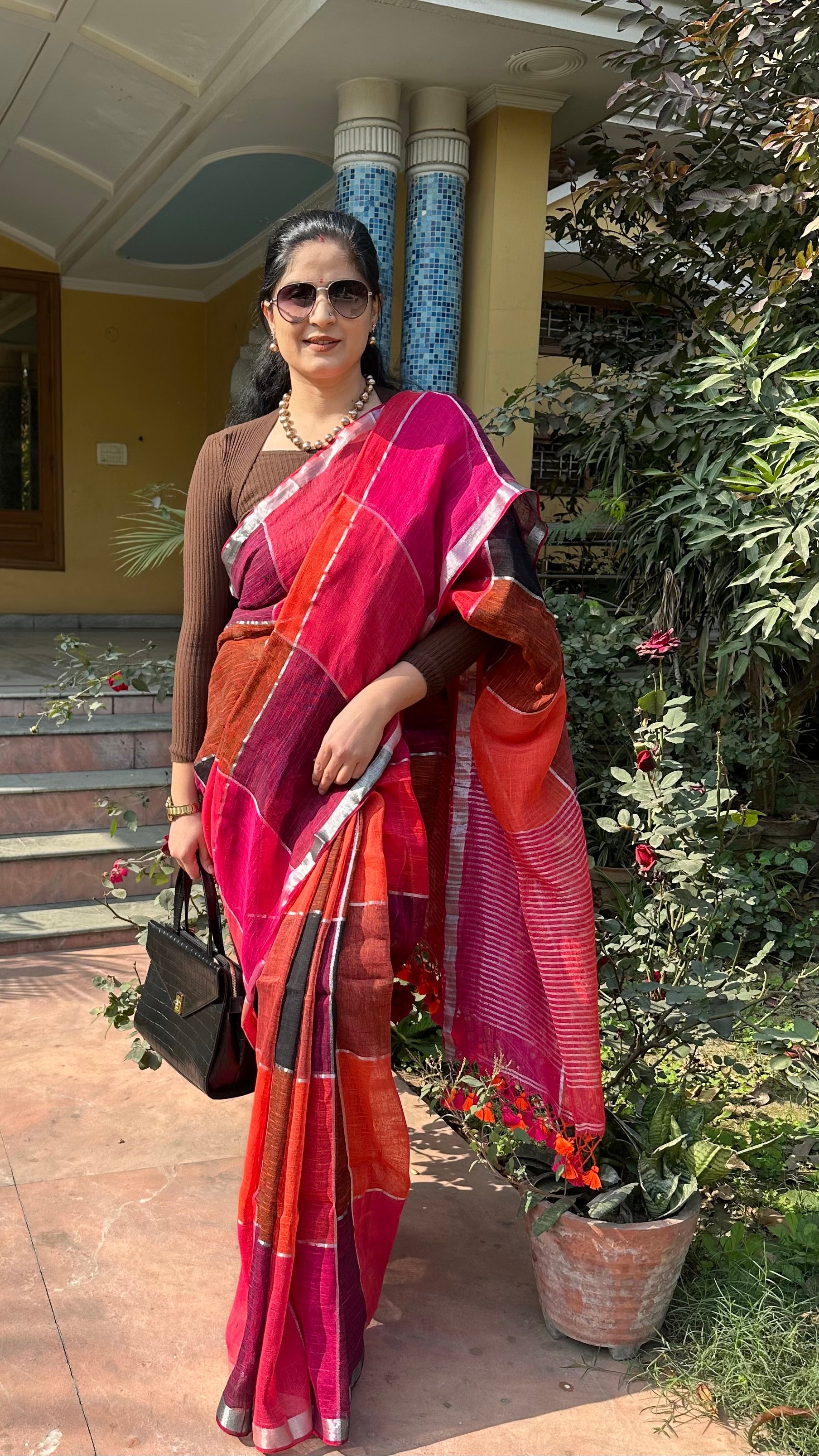 Material: 80 count pure Linen by Linen sarees with silver zari checks and multi colours.