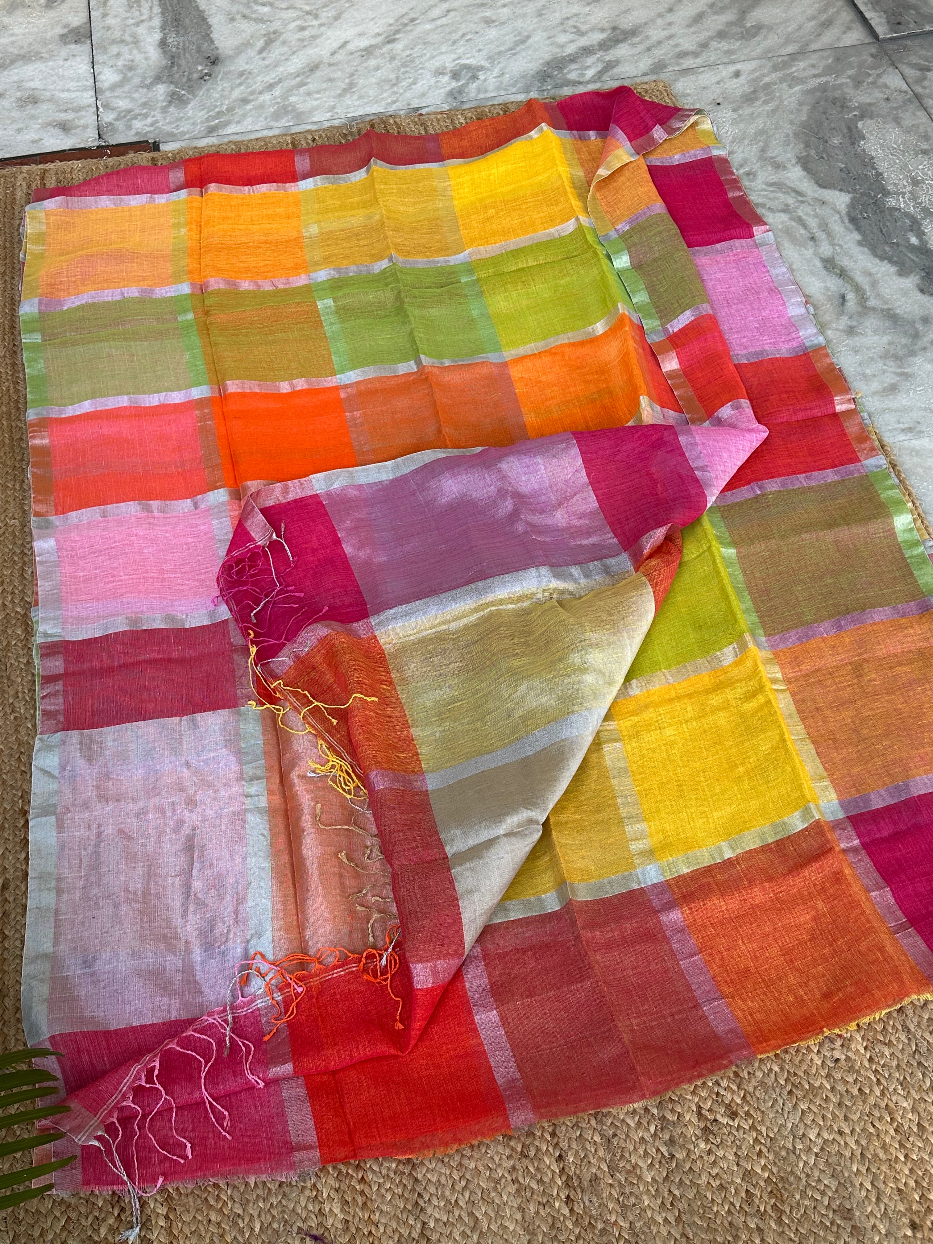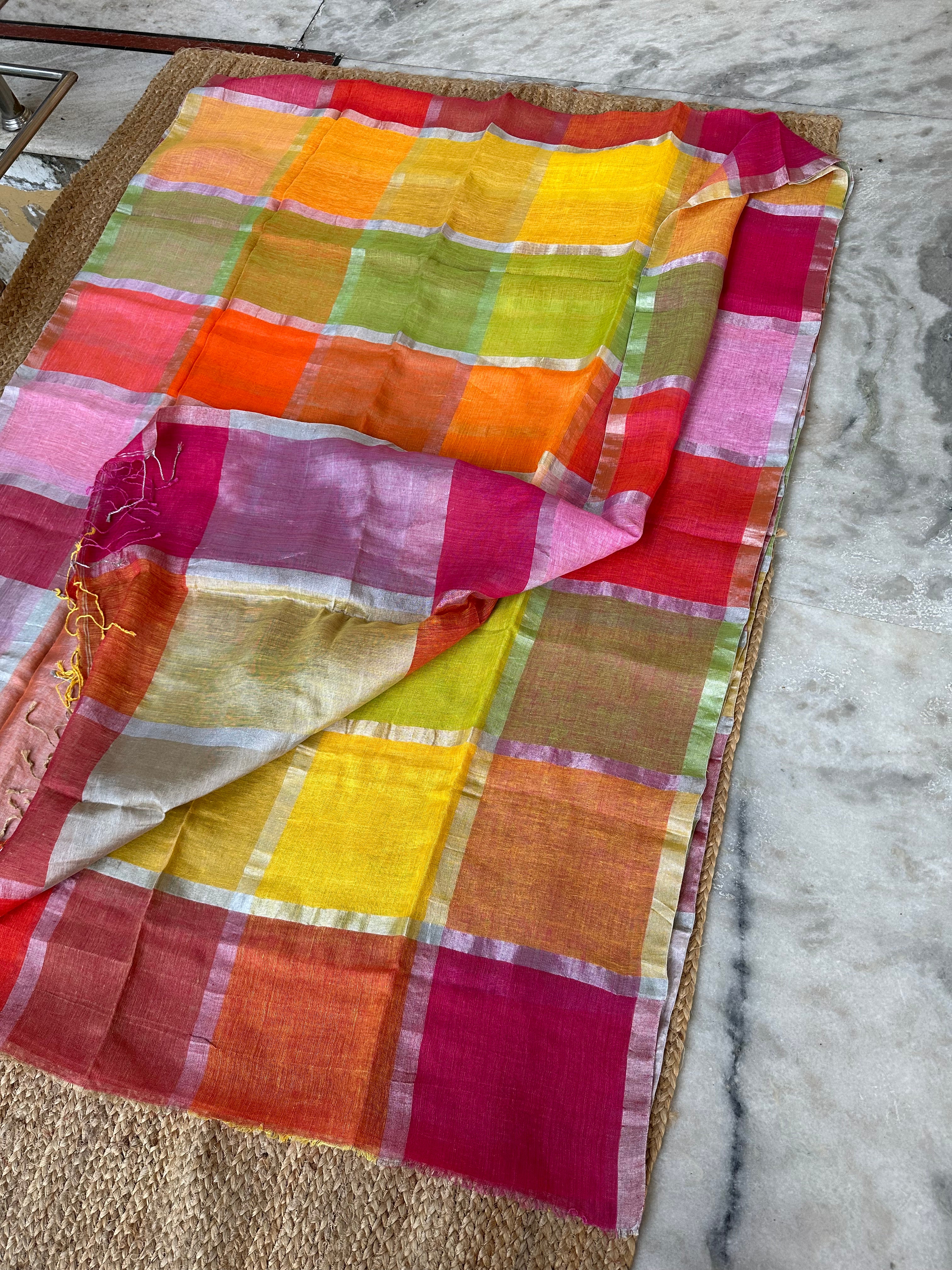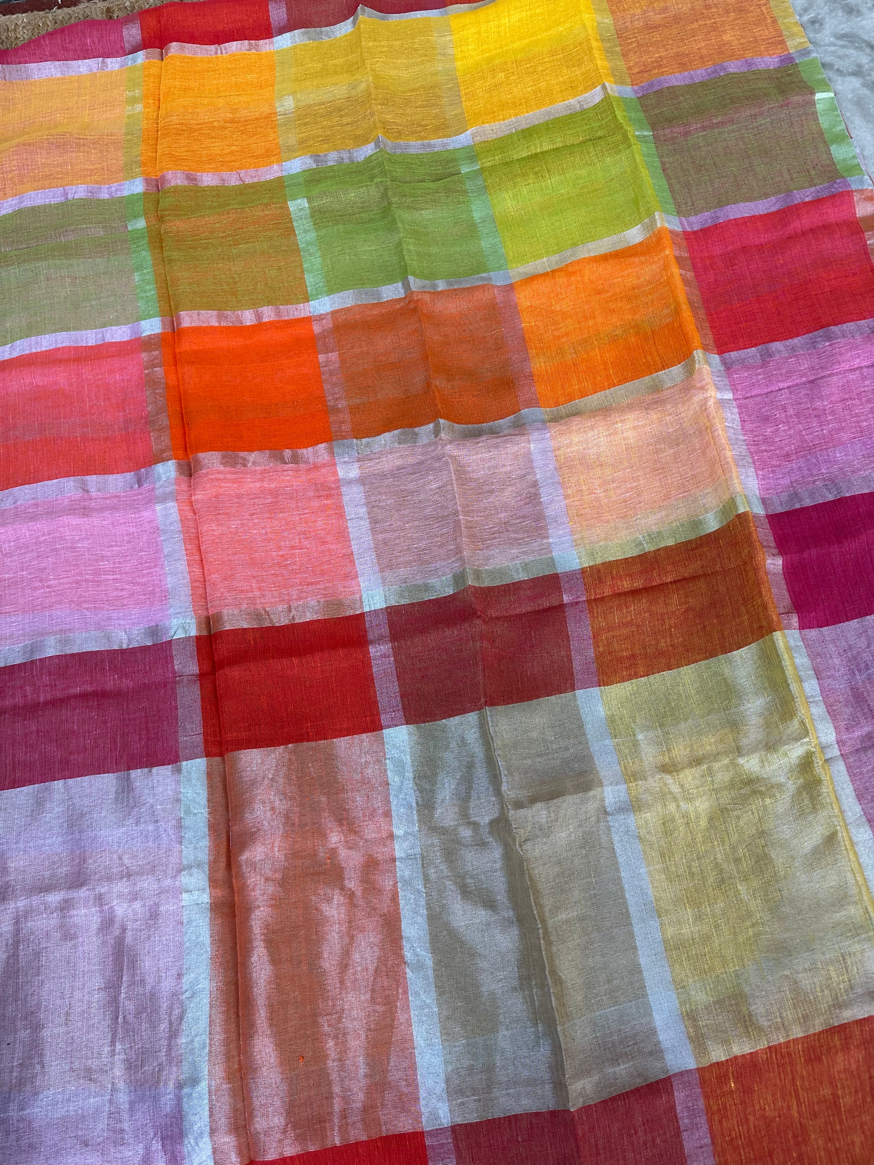 Multicoloured Pure Linen Handloom Silver Checks Saree