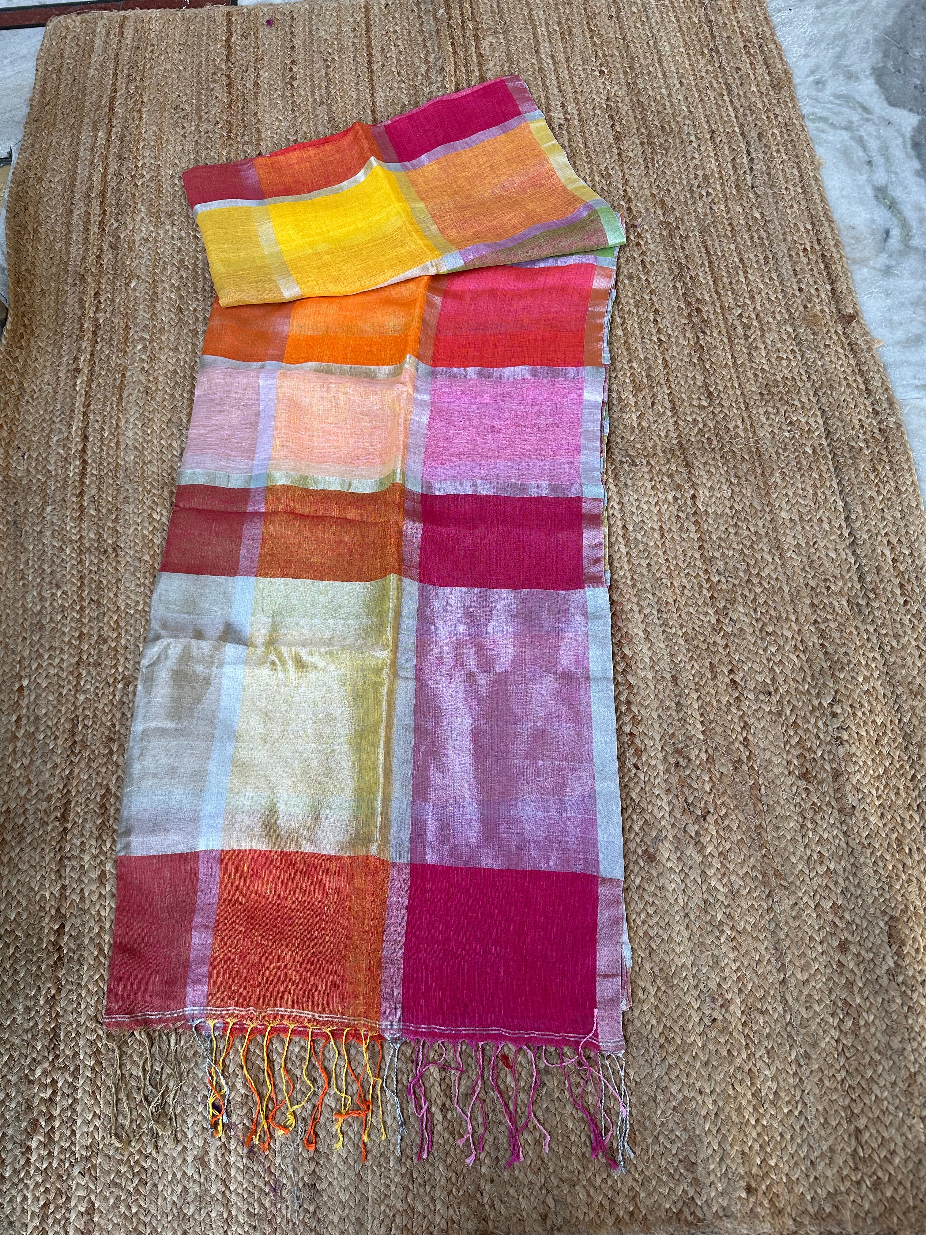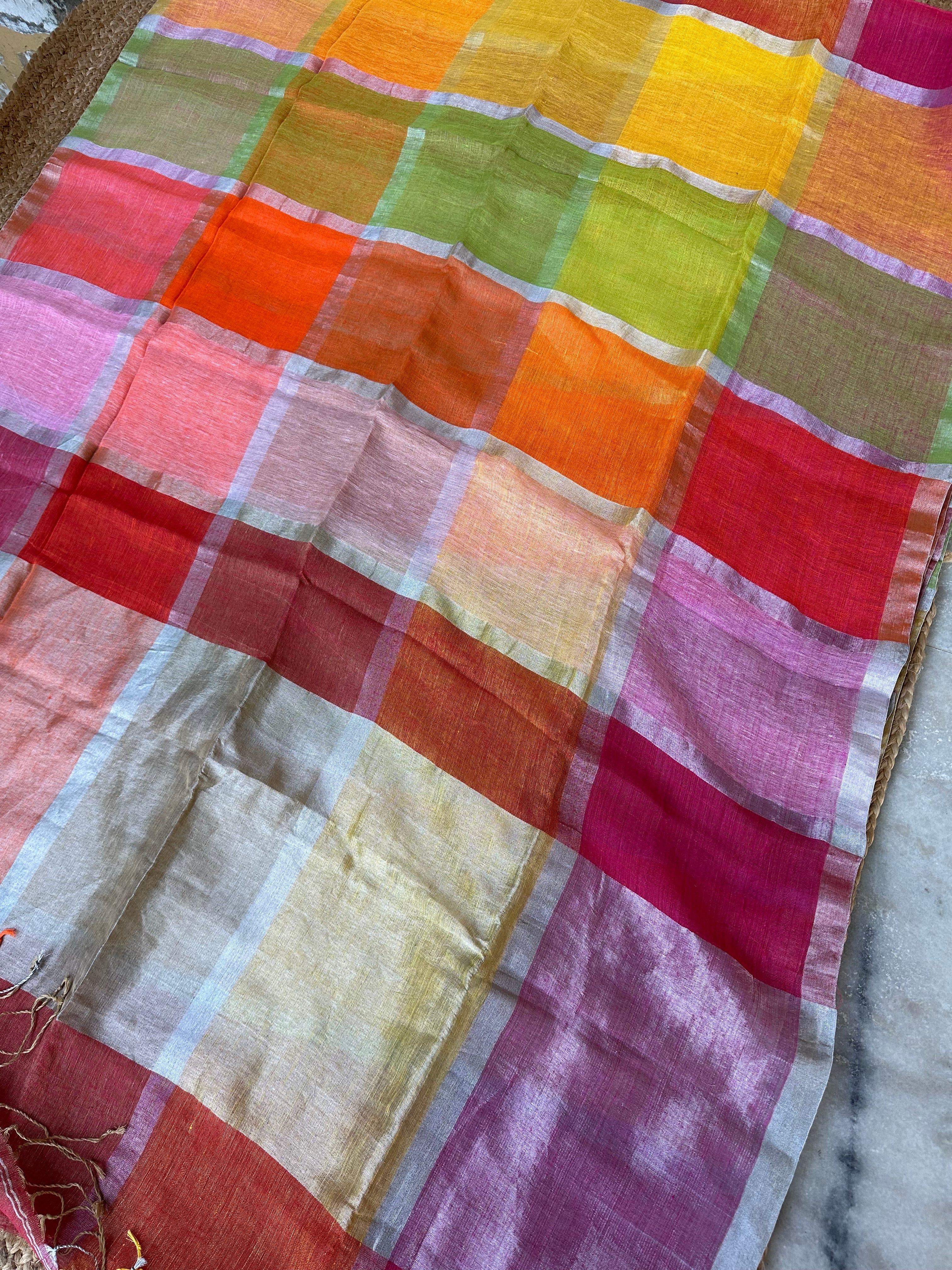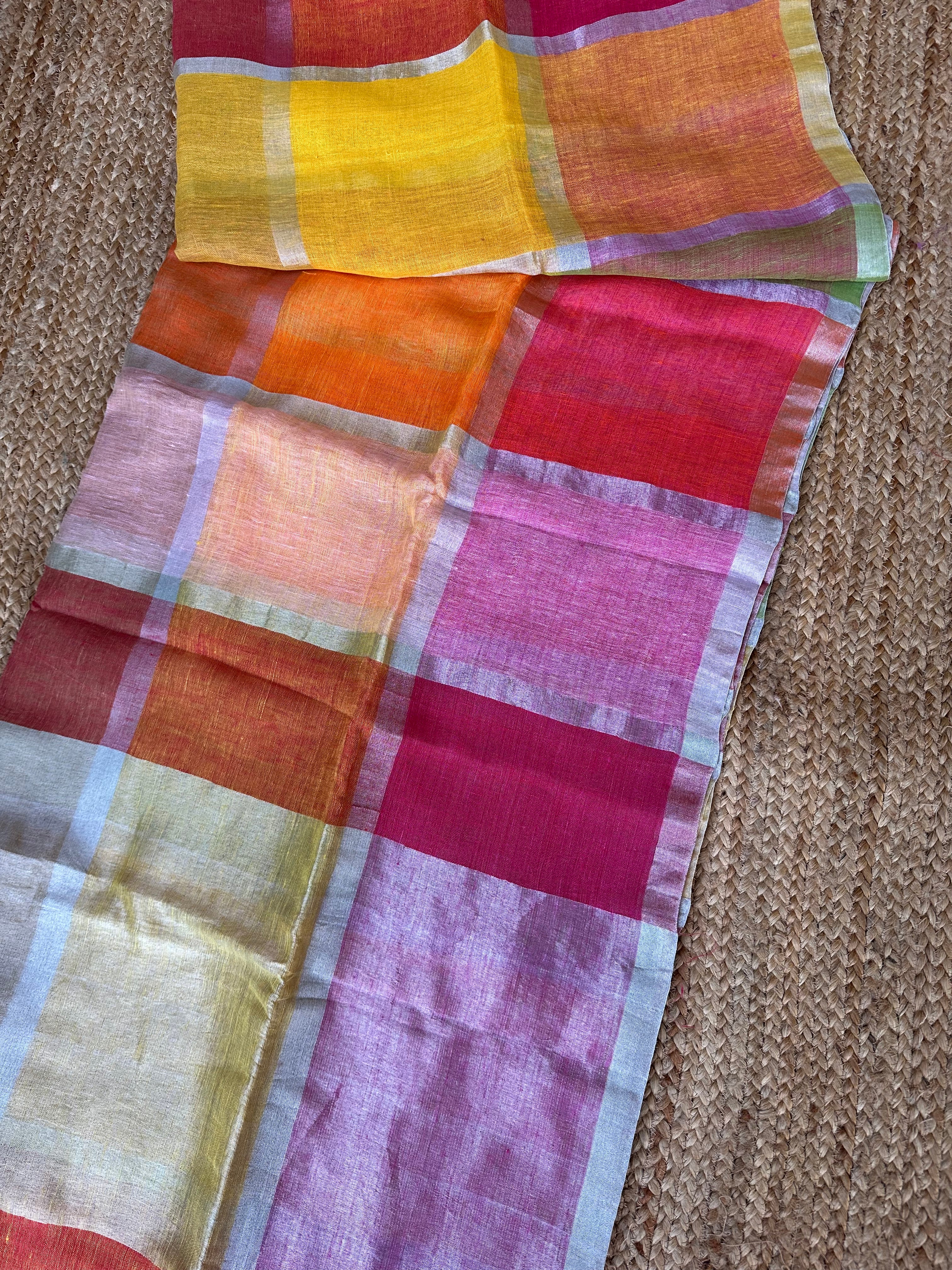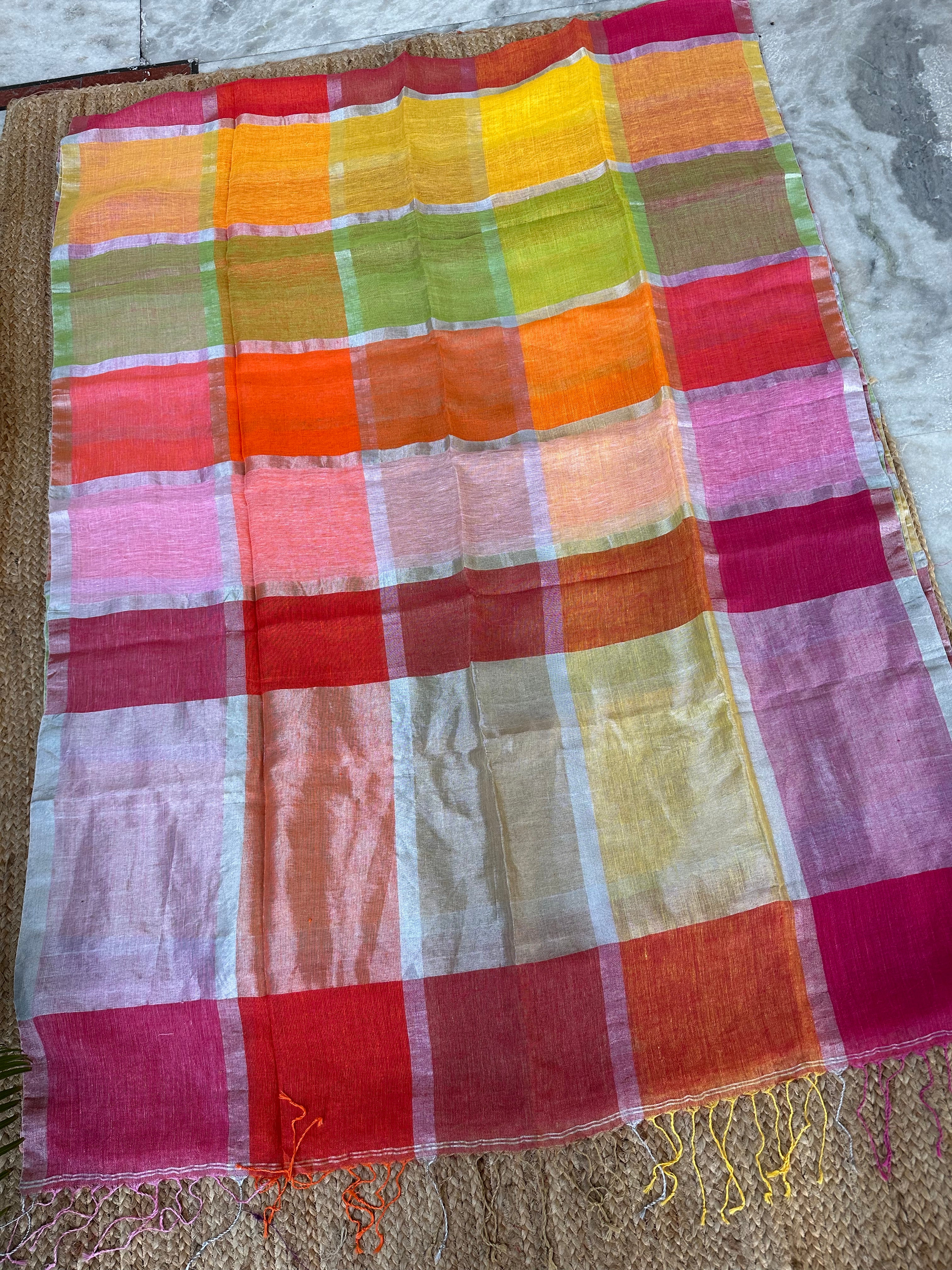 Multicoloured Pure Linen Handloom Silver Checks Saree