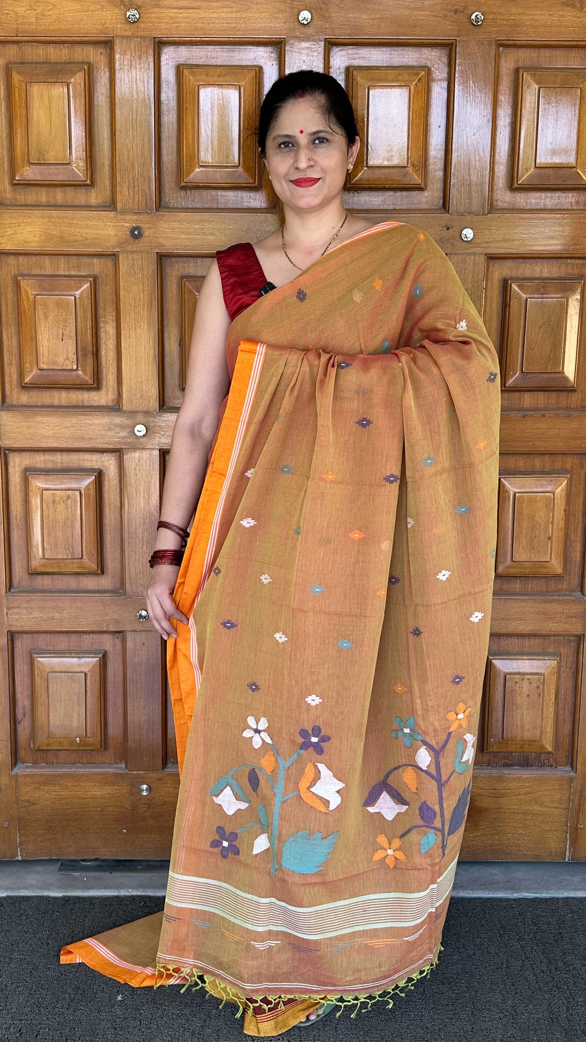 Mustard Maroon dual tone Cotton Handloom Jamdani Saree