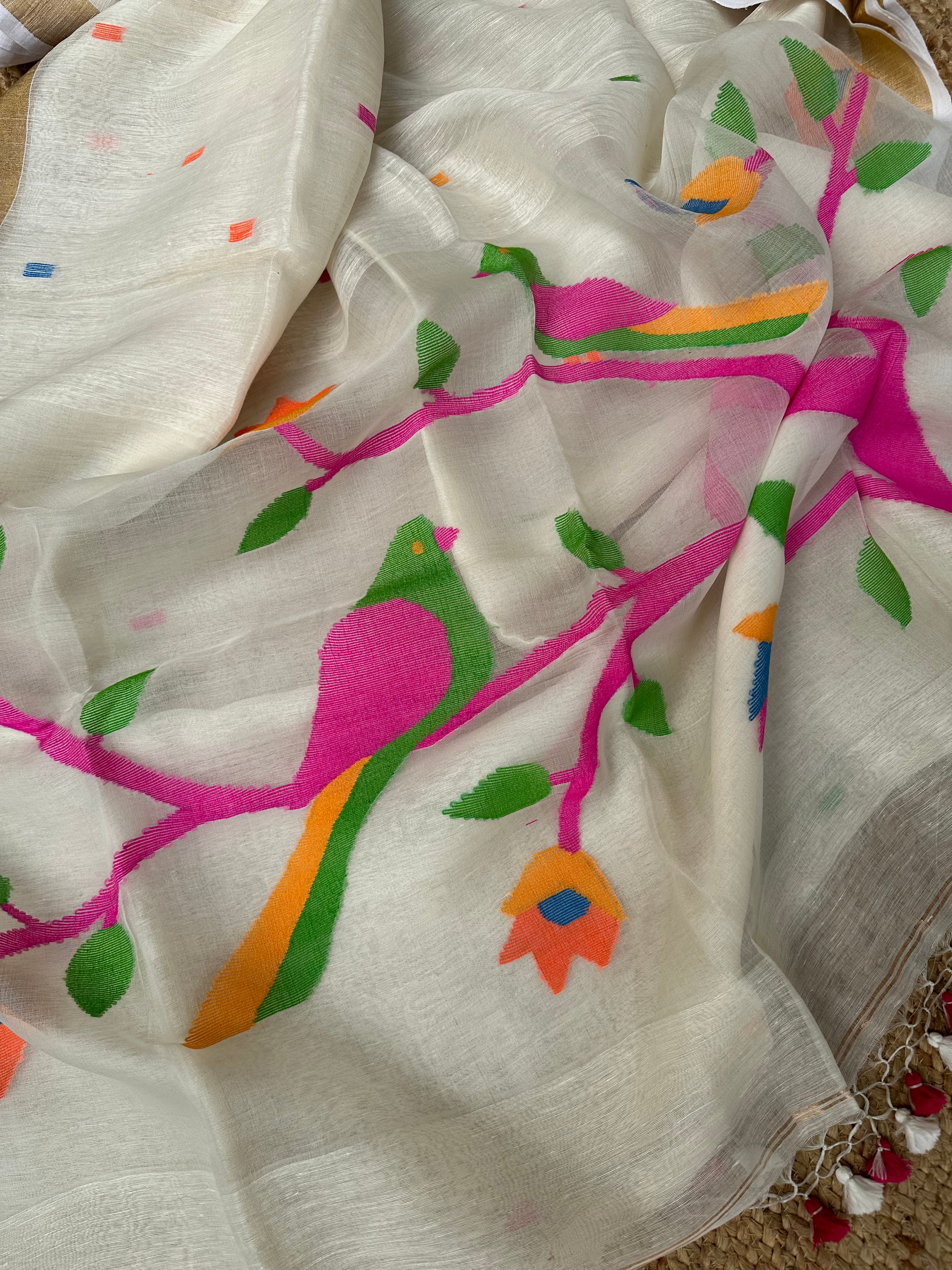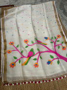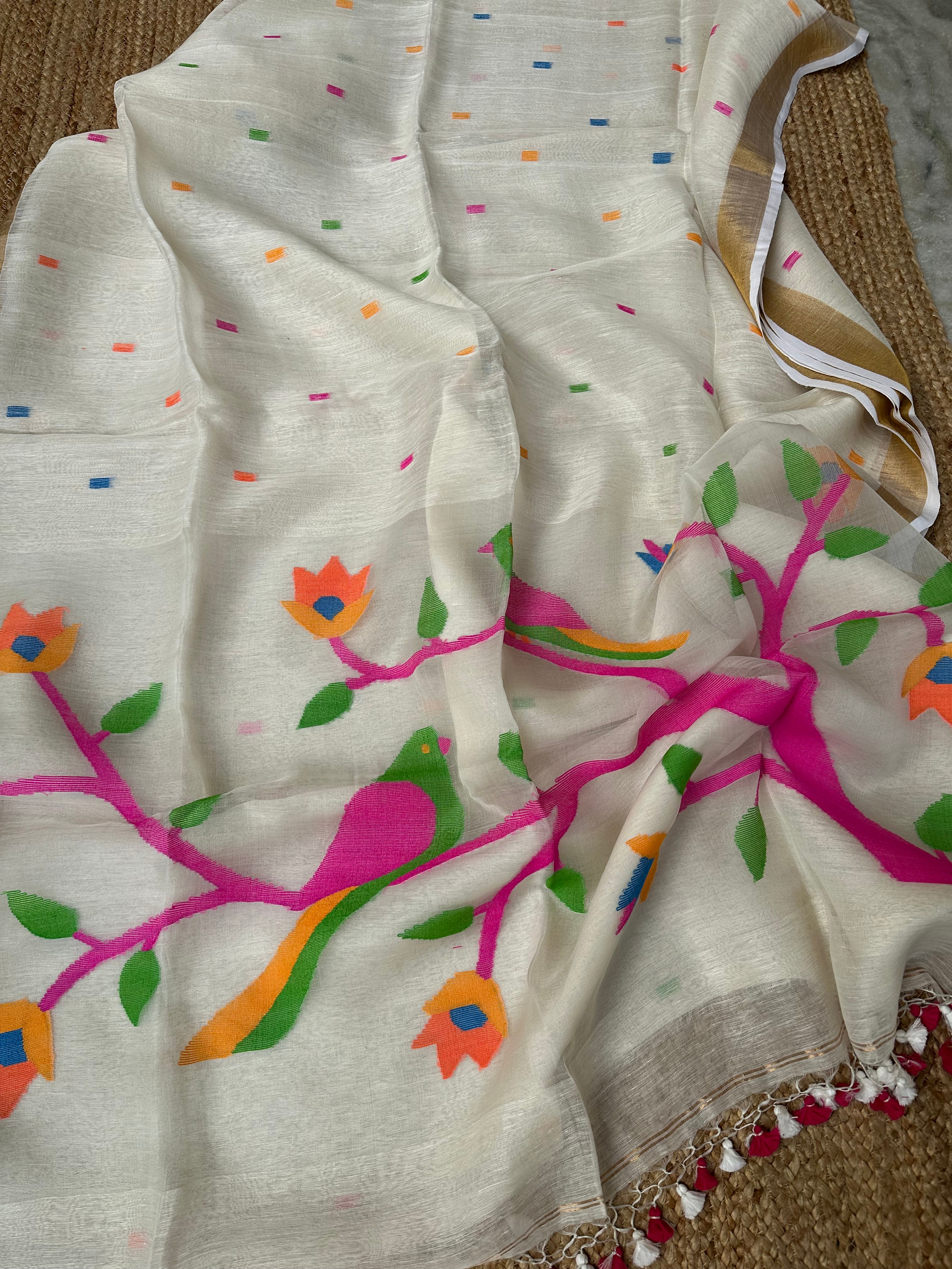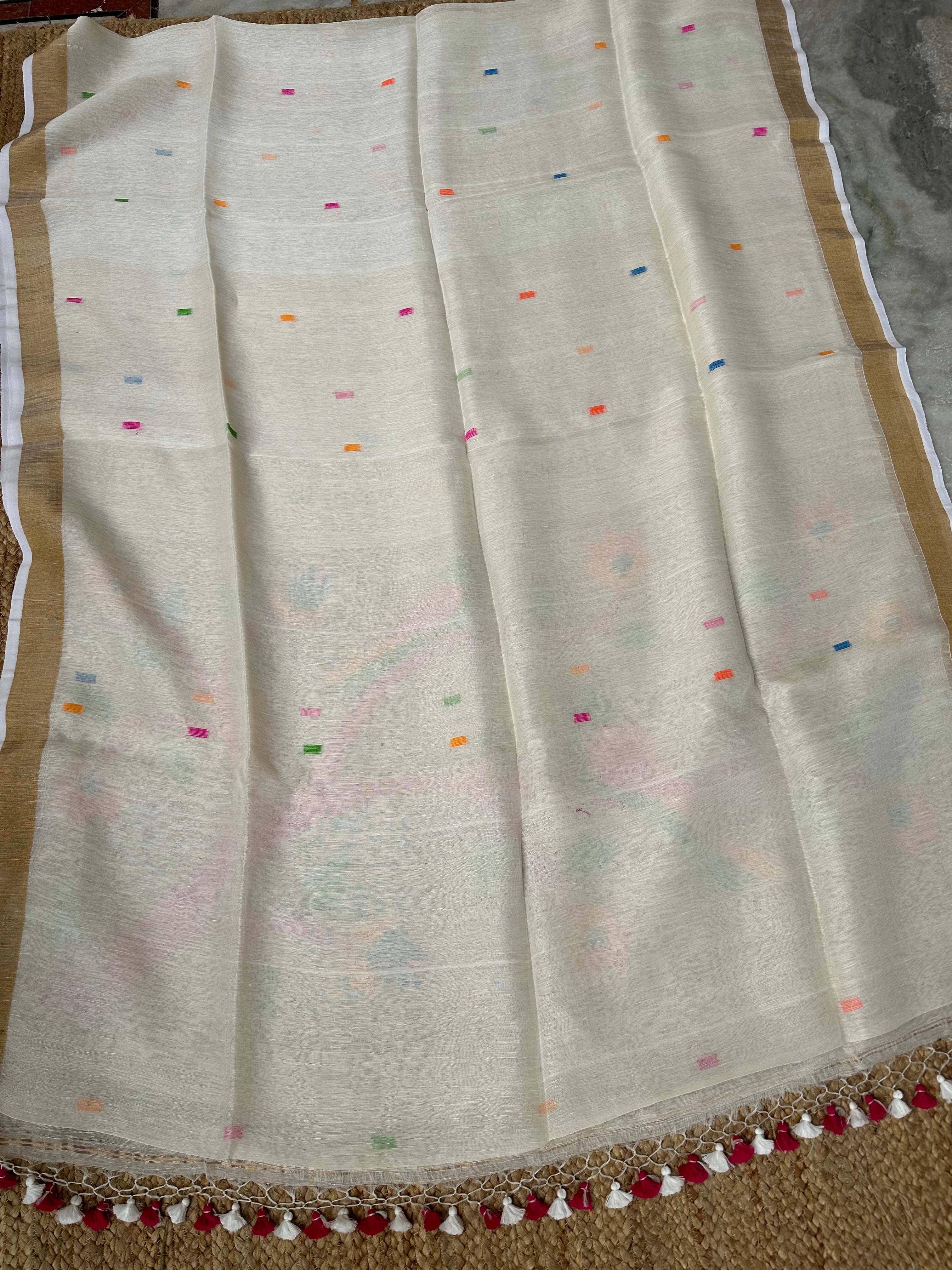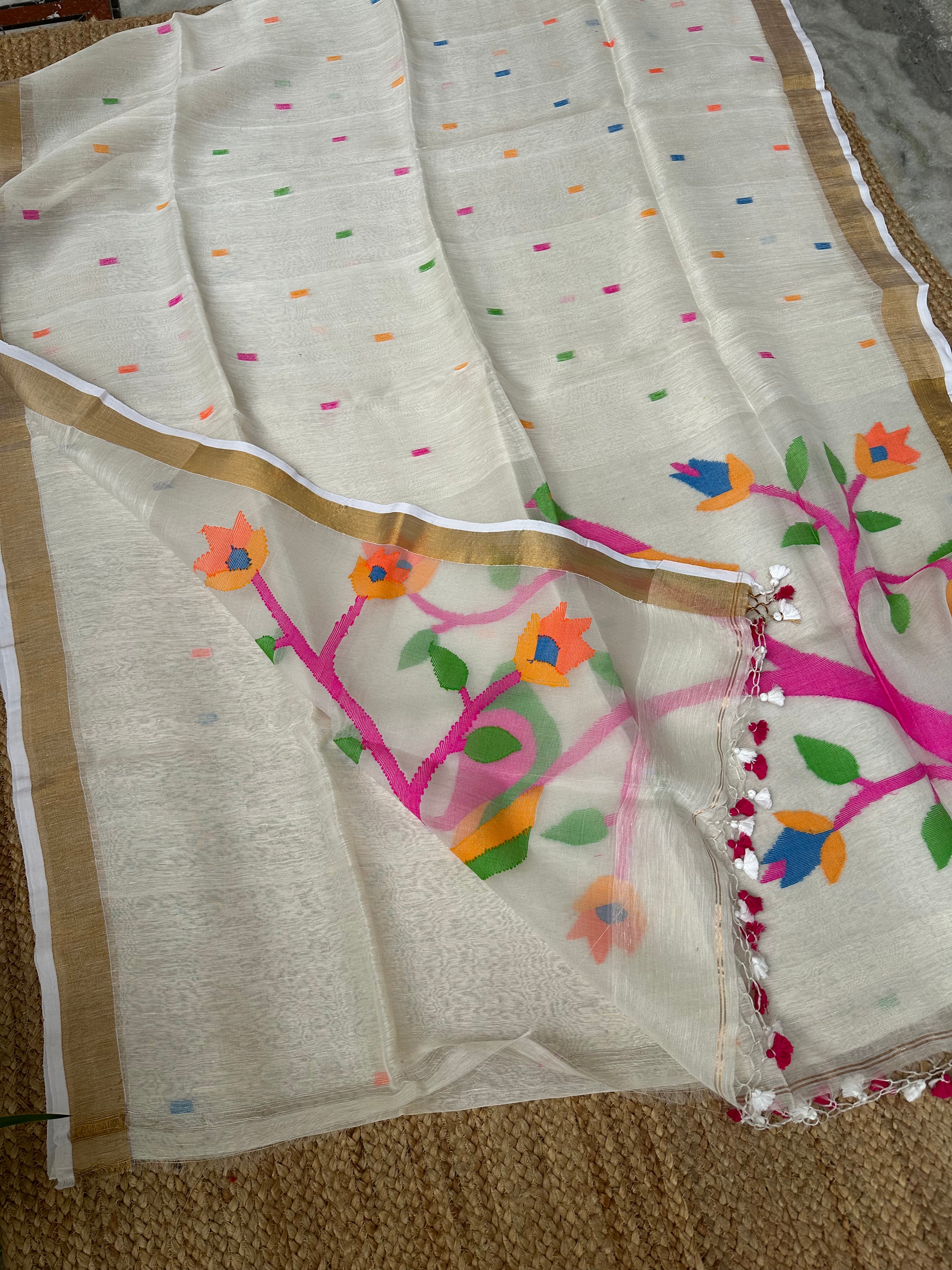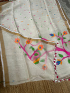 Off White Linen Muslin Silk Handloom Paithani Jamdani Saree