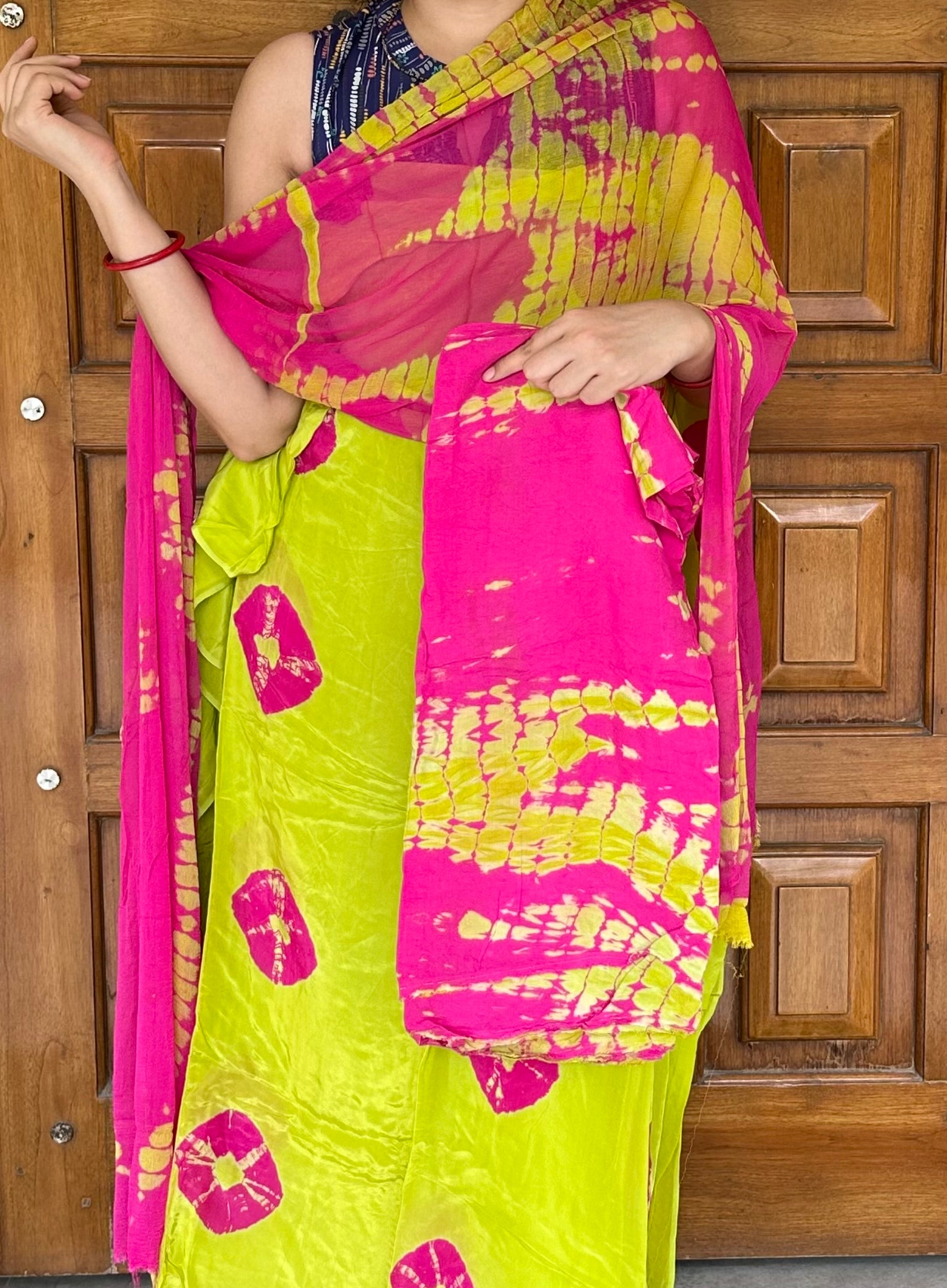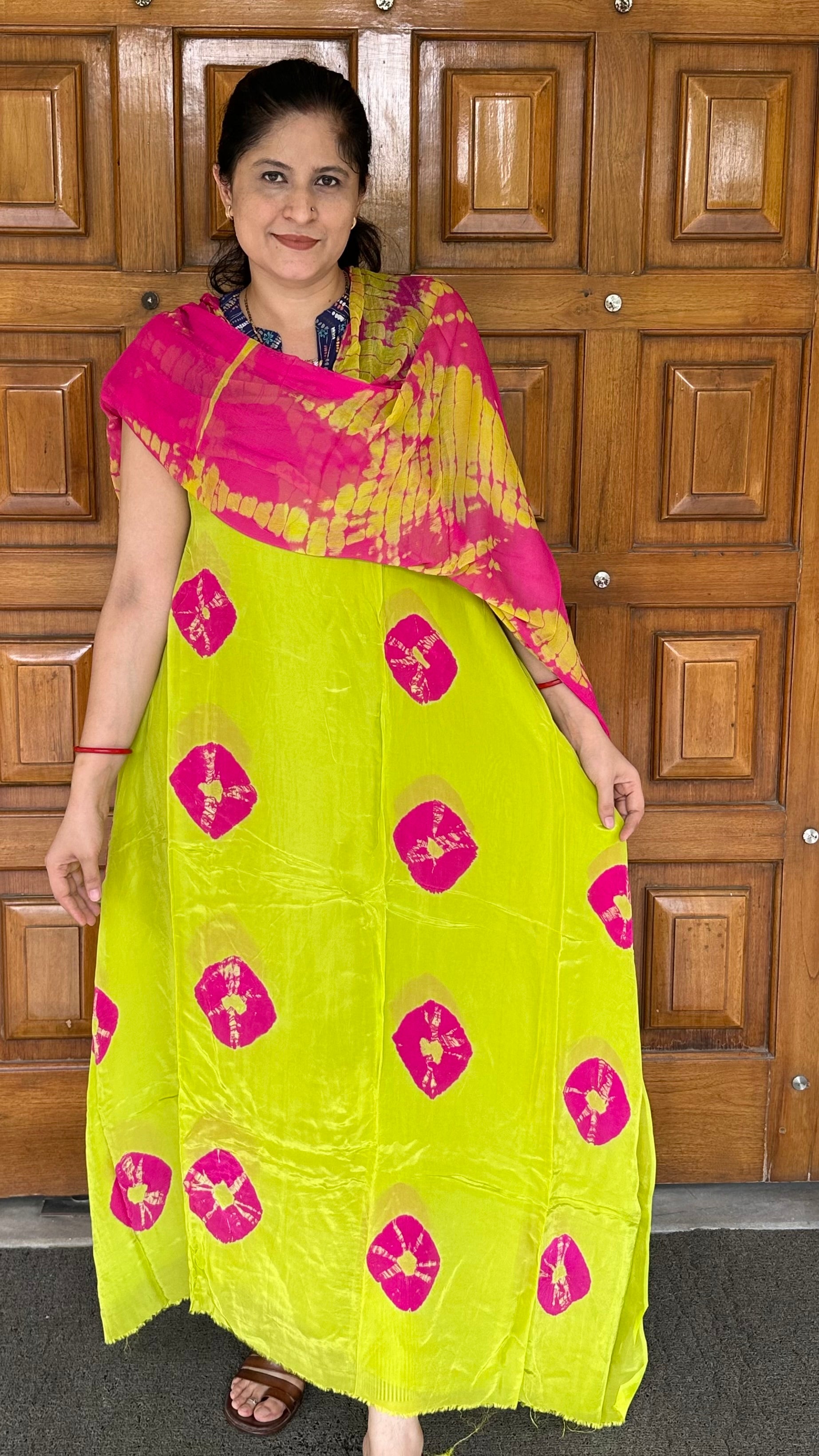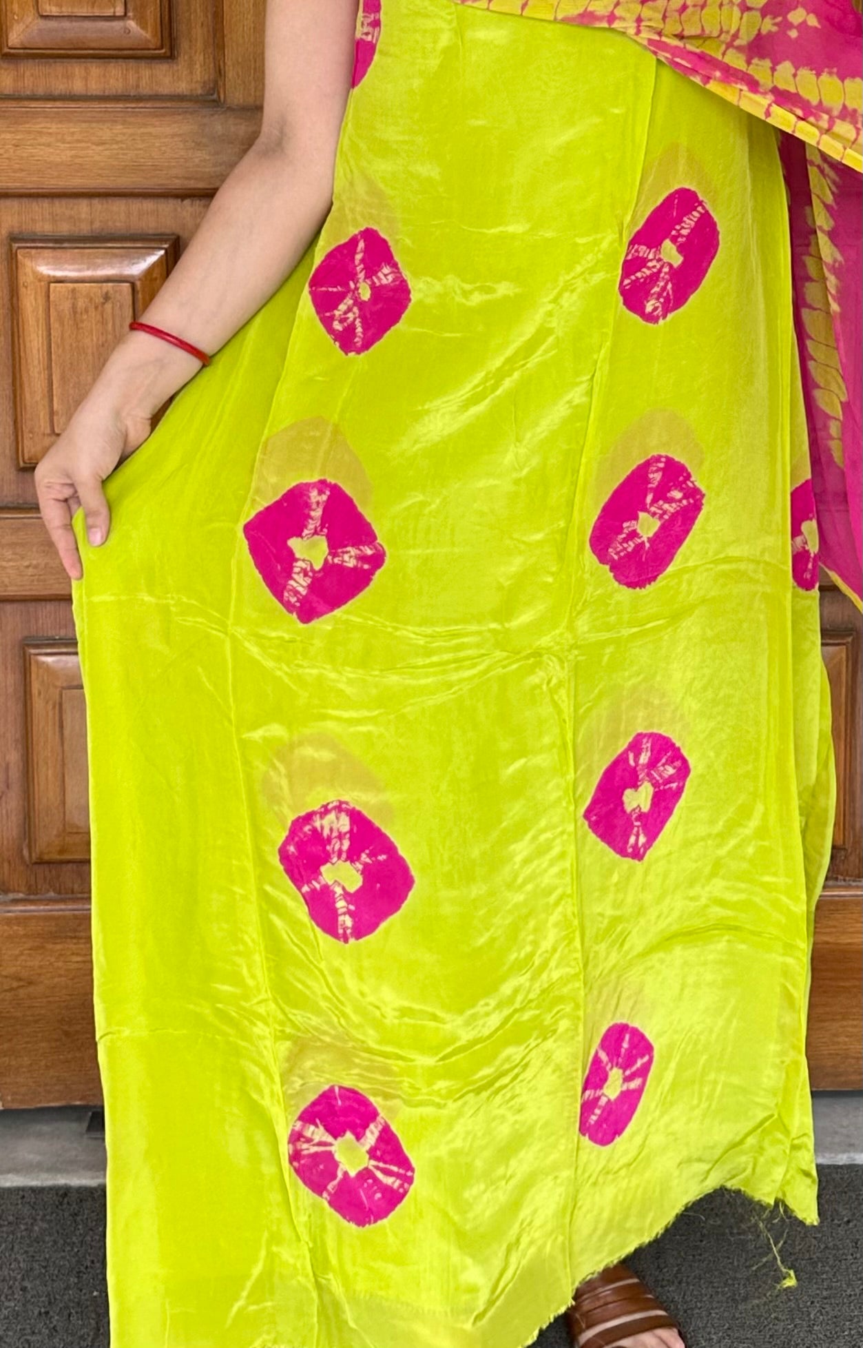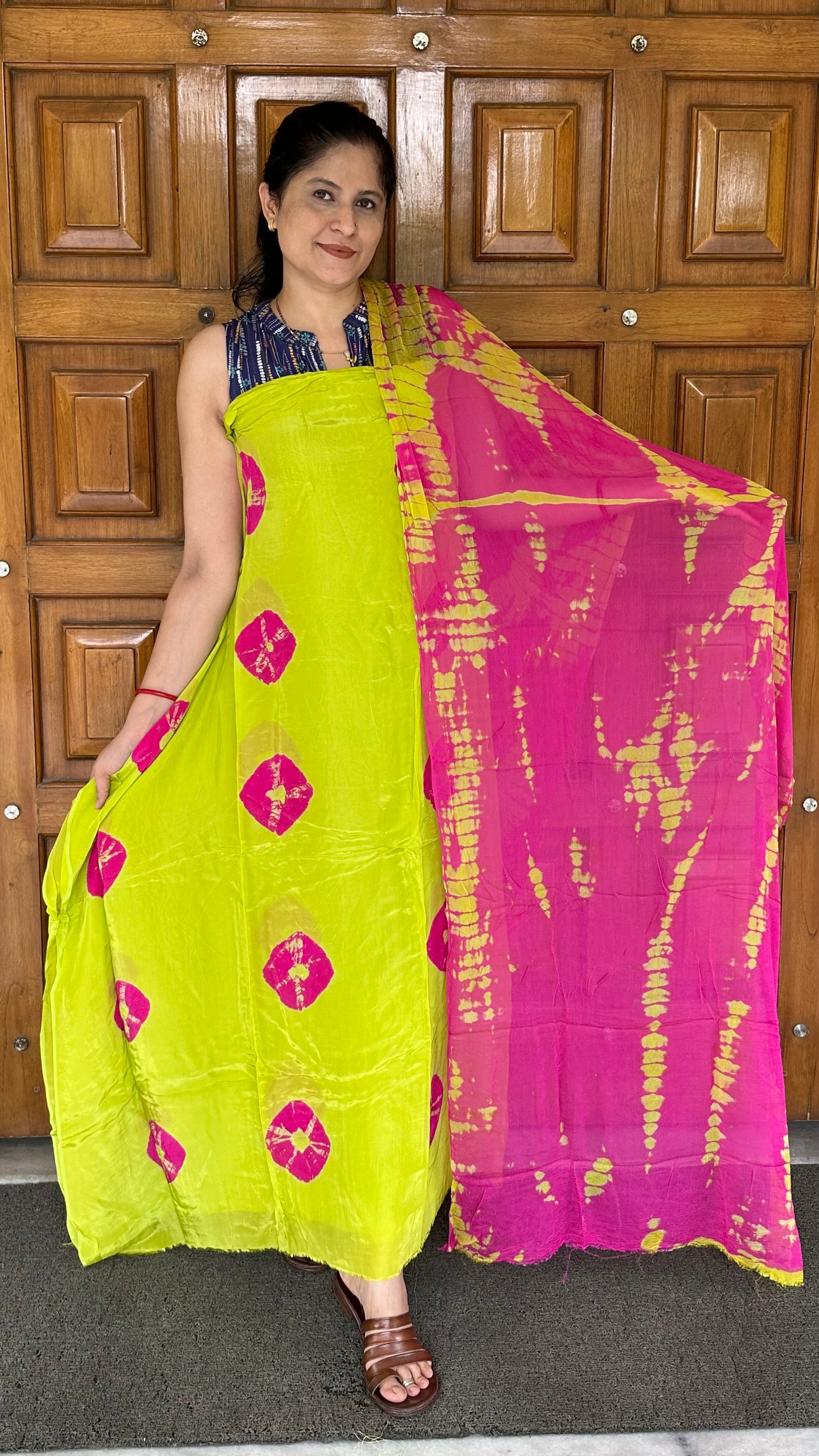Parrot Green with Pink Shibori Organza Crepe Suit set
