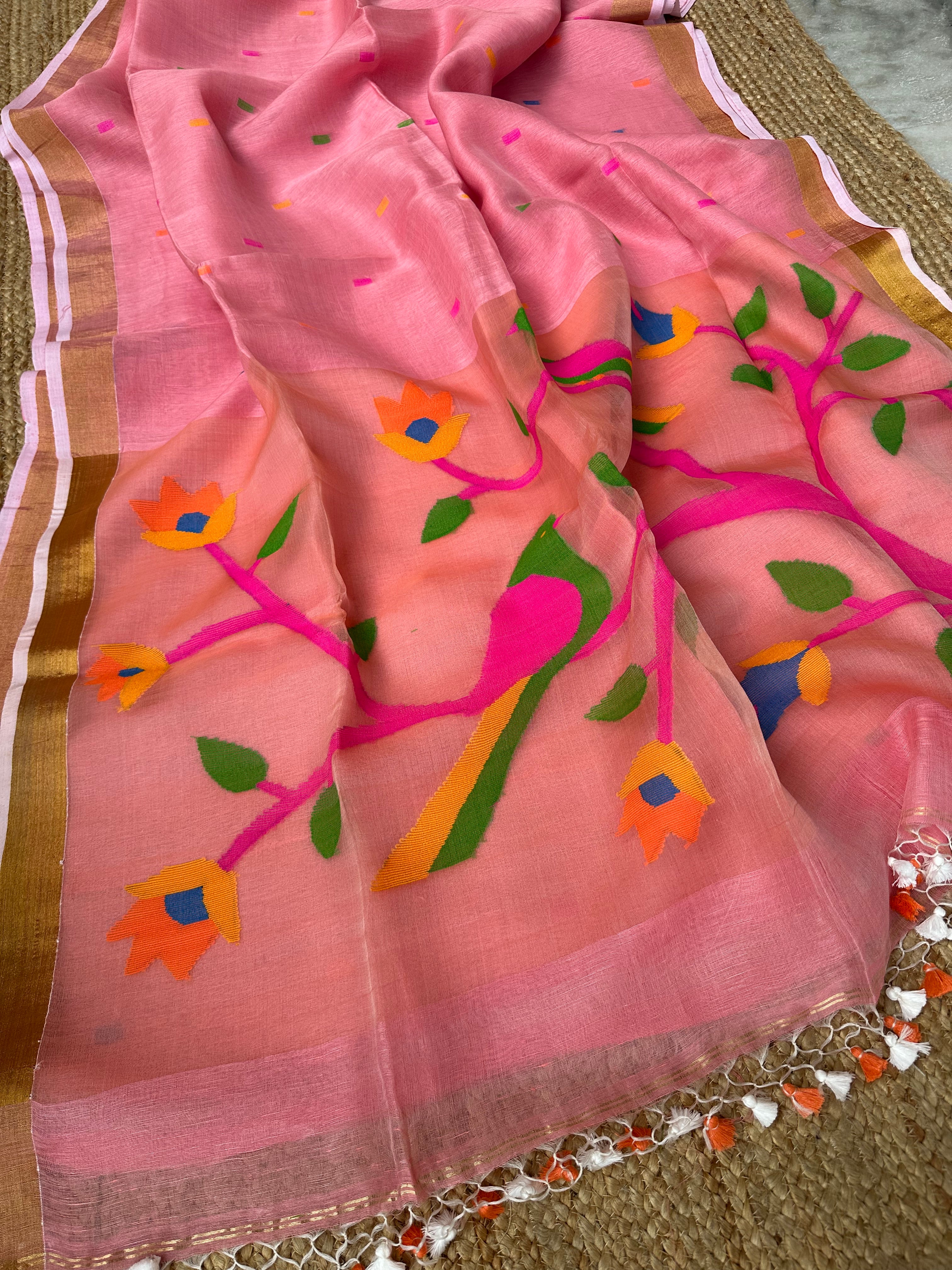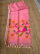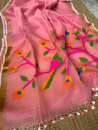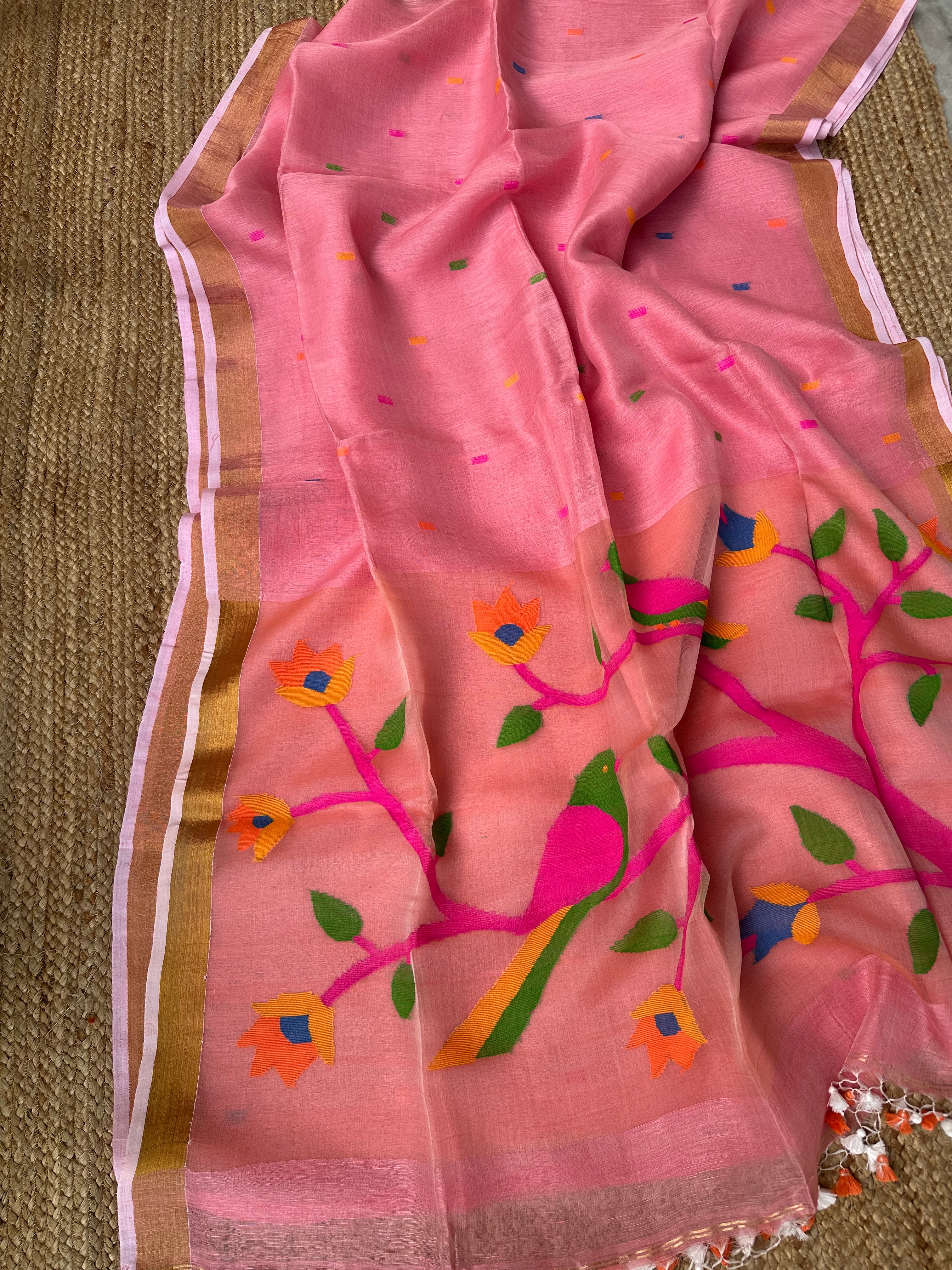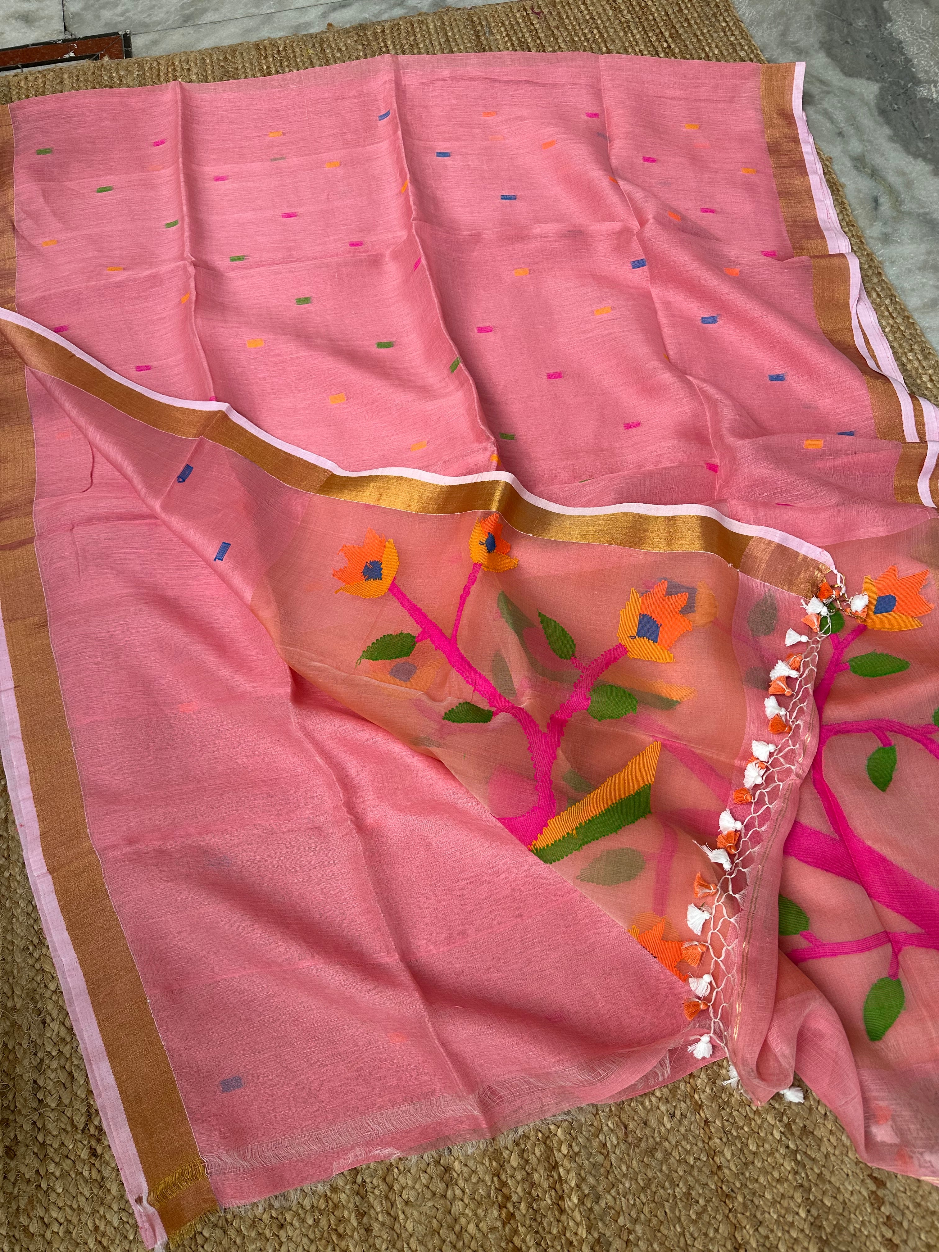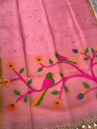Pinkish Peach Linen Muslin Silk Handloom Paithani Jamdani Saree
