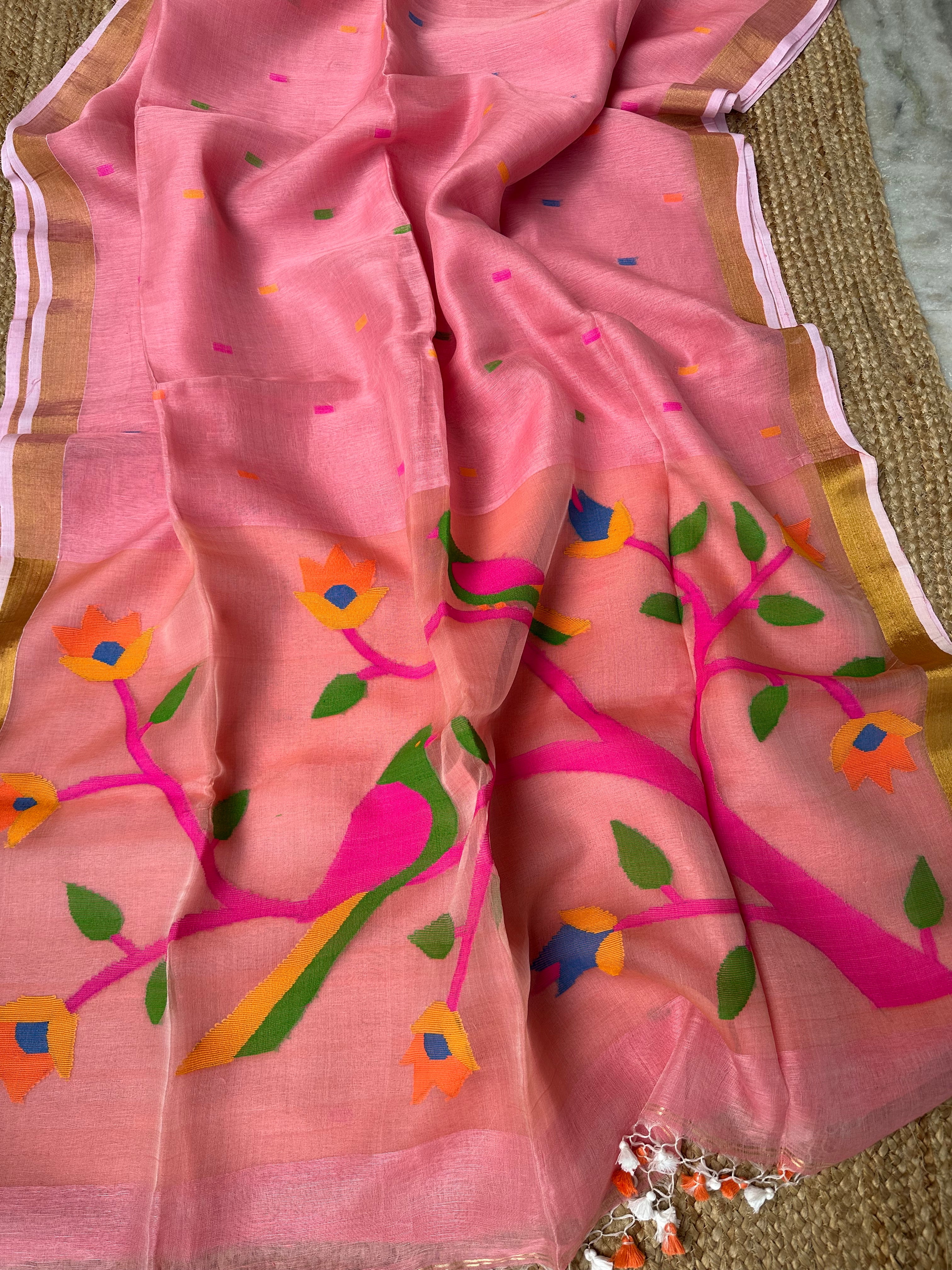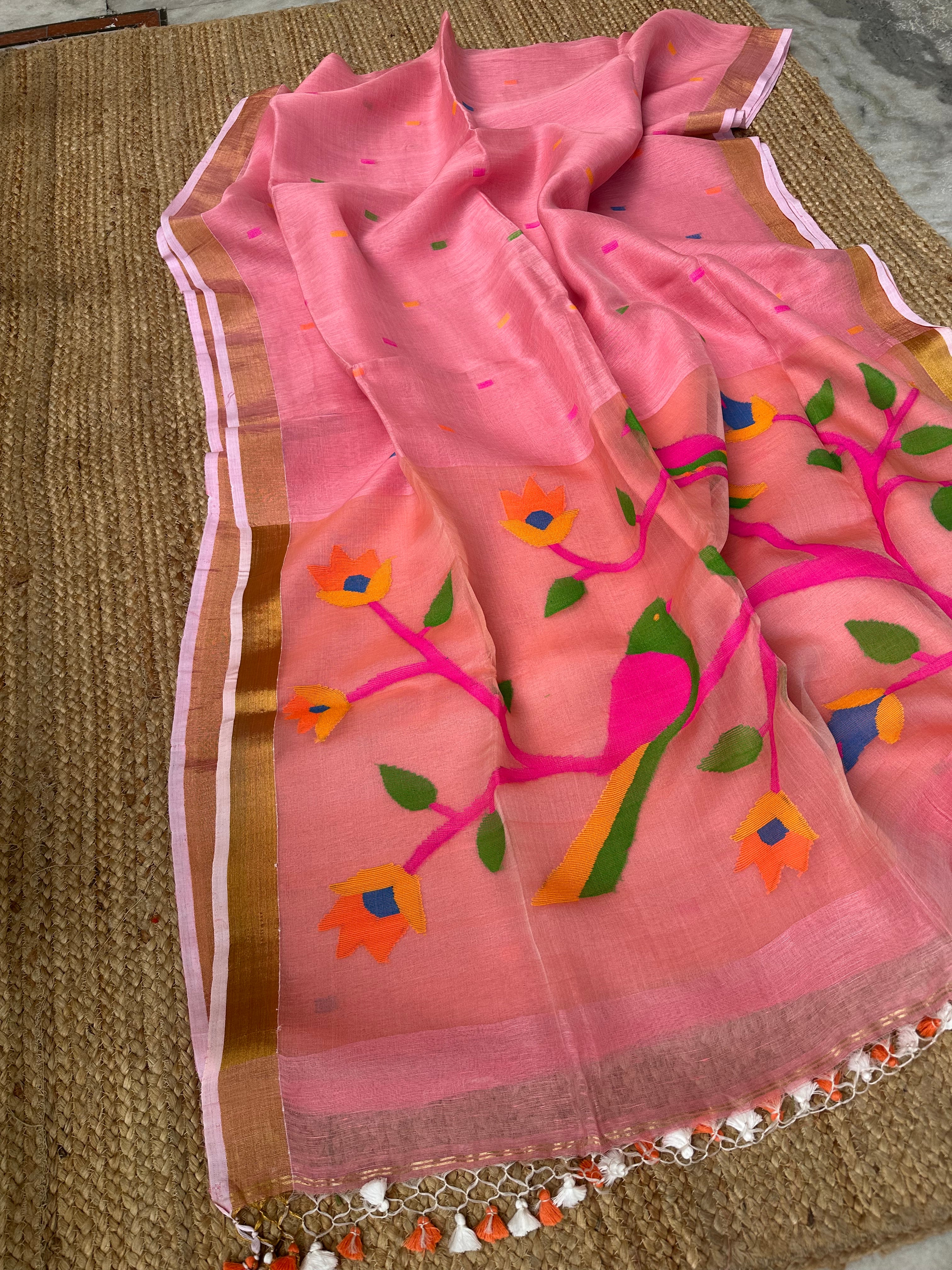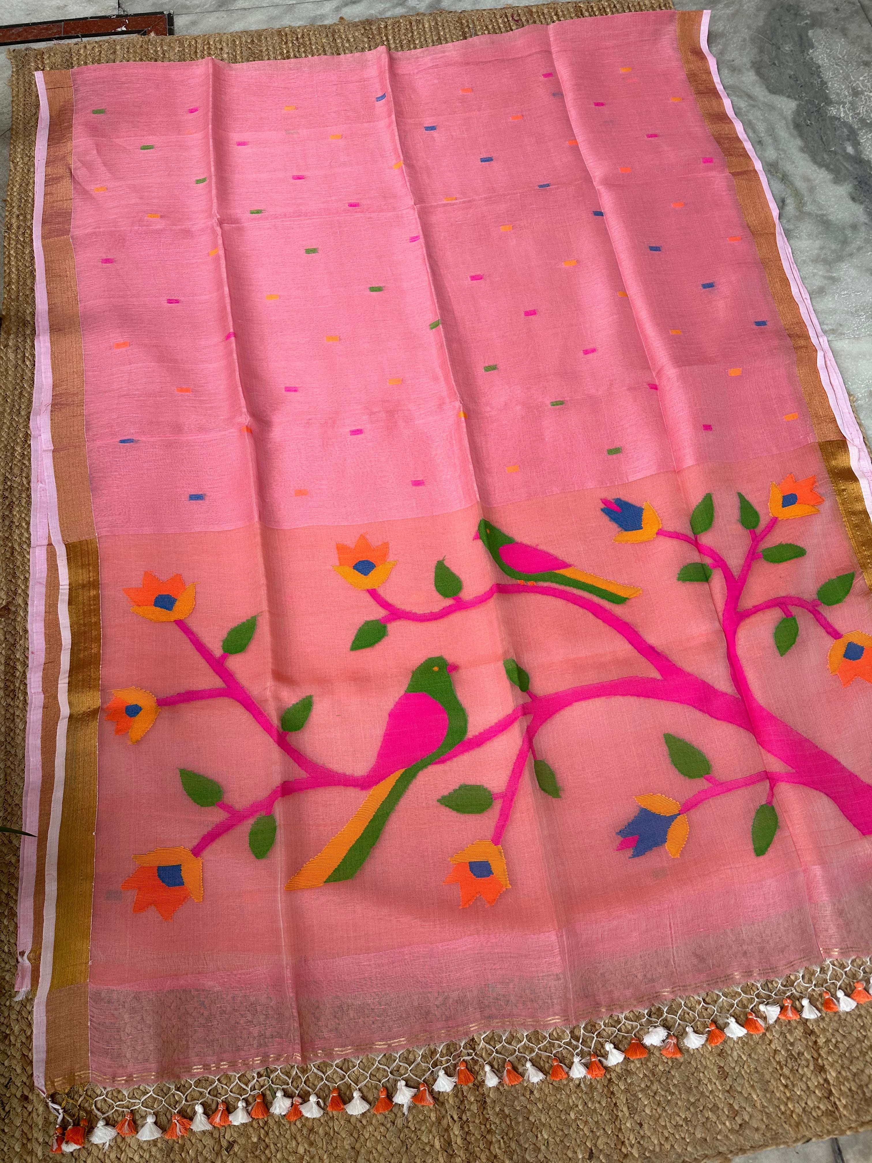 Pinkish Peach Linen Muslin Silk Handloom Paithani Jamdani Saree