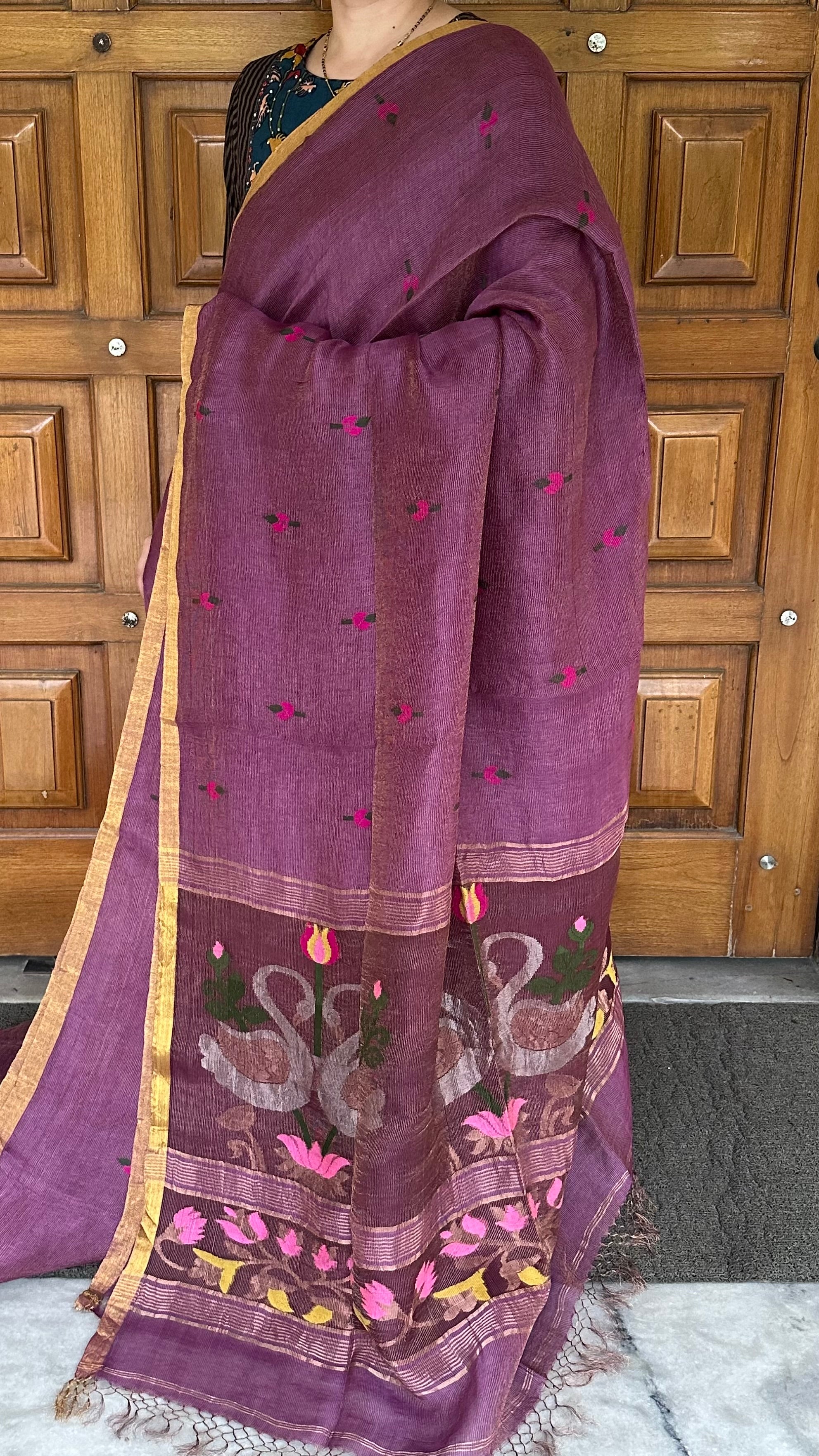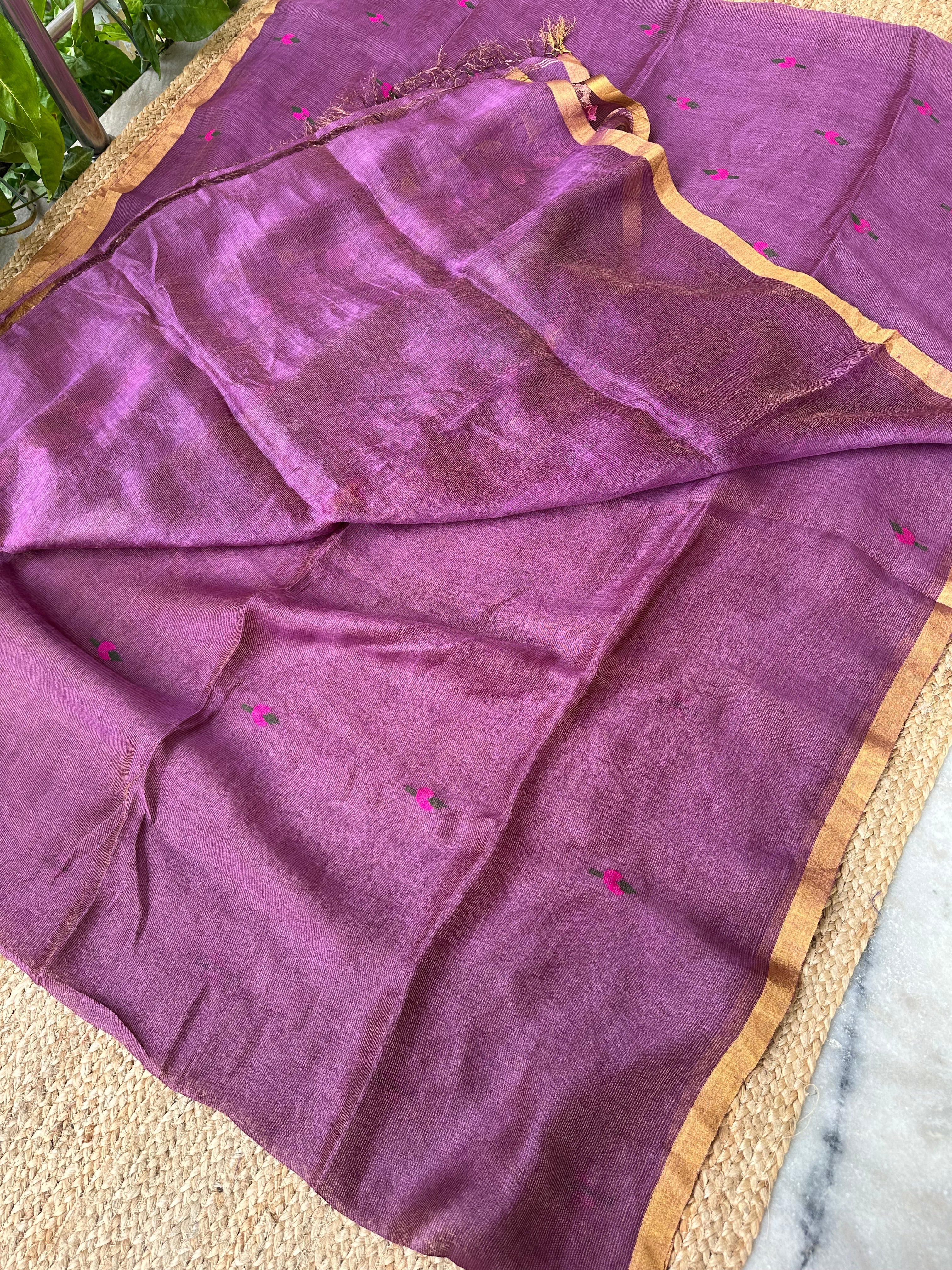 Material: Pure Jayshree Linen handweaved with zari and silk. Premium Handloom Linen silk tissue fabric with handwoven Jamdani work all over.
