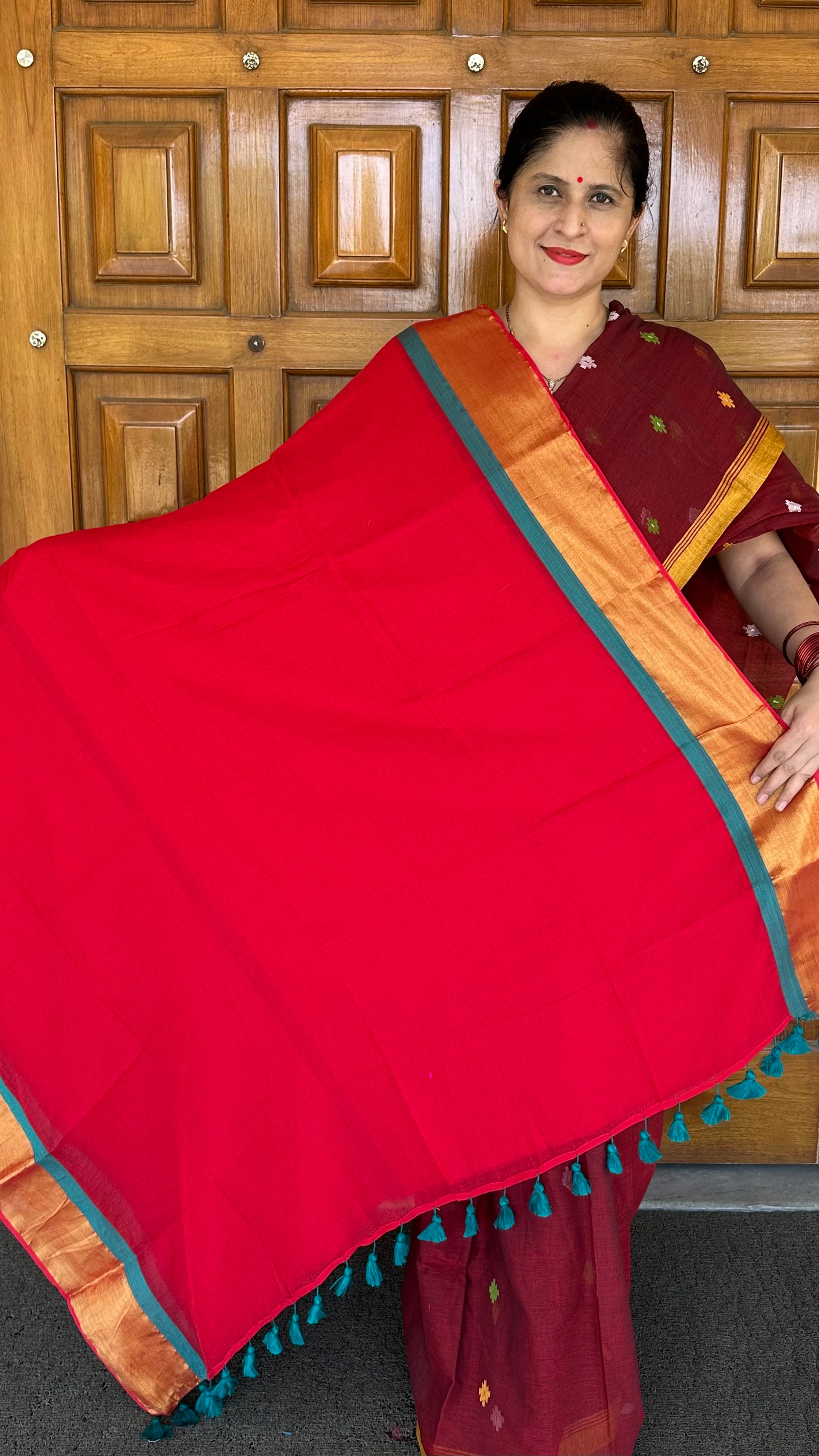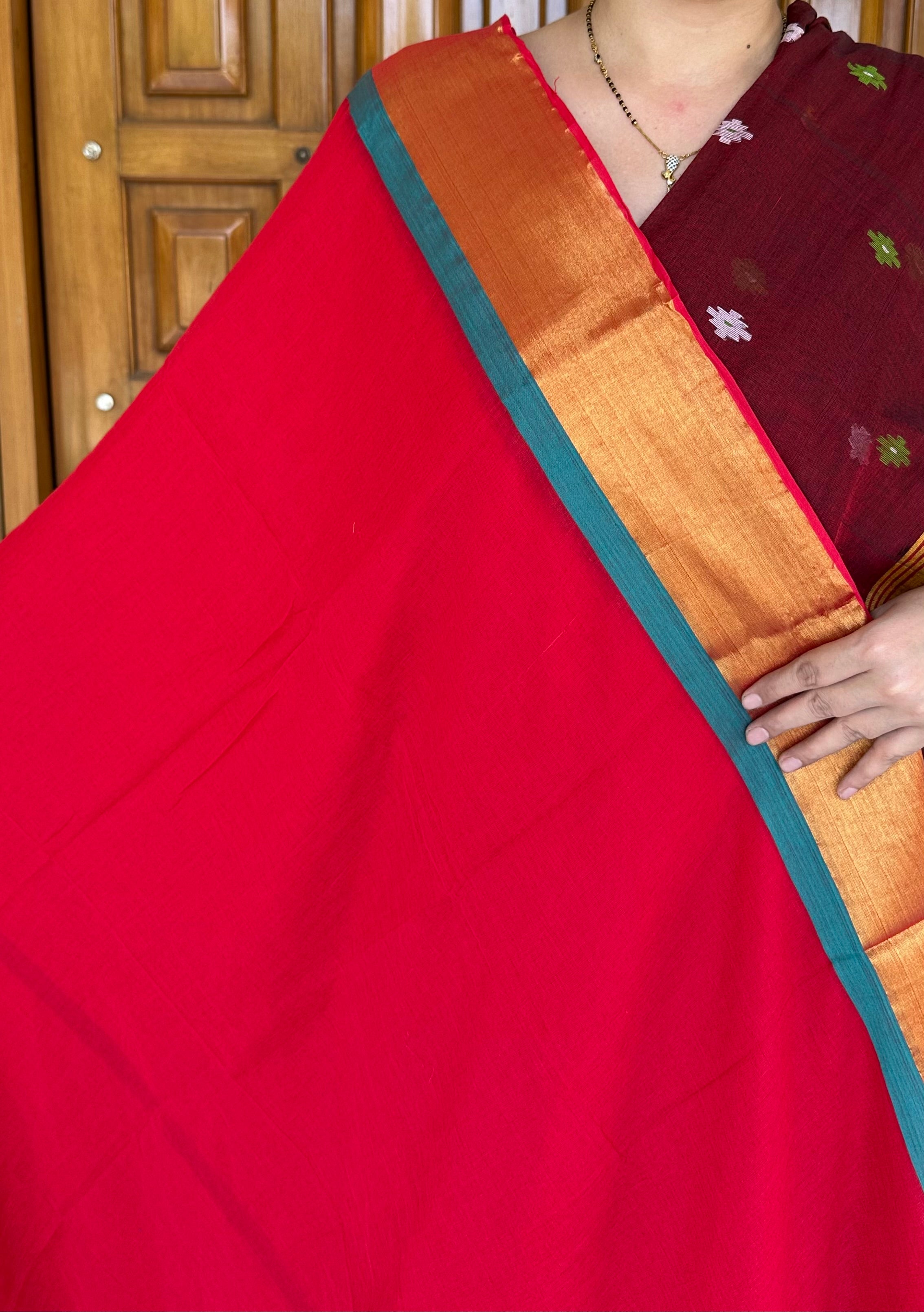 Plain Cotton Handloom Saree-Red Green
