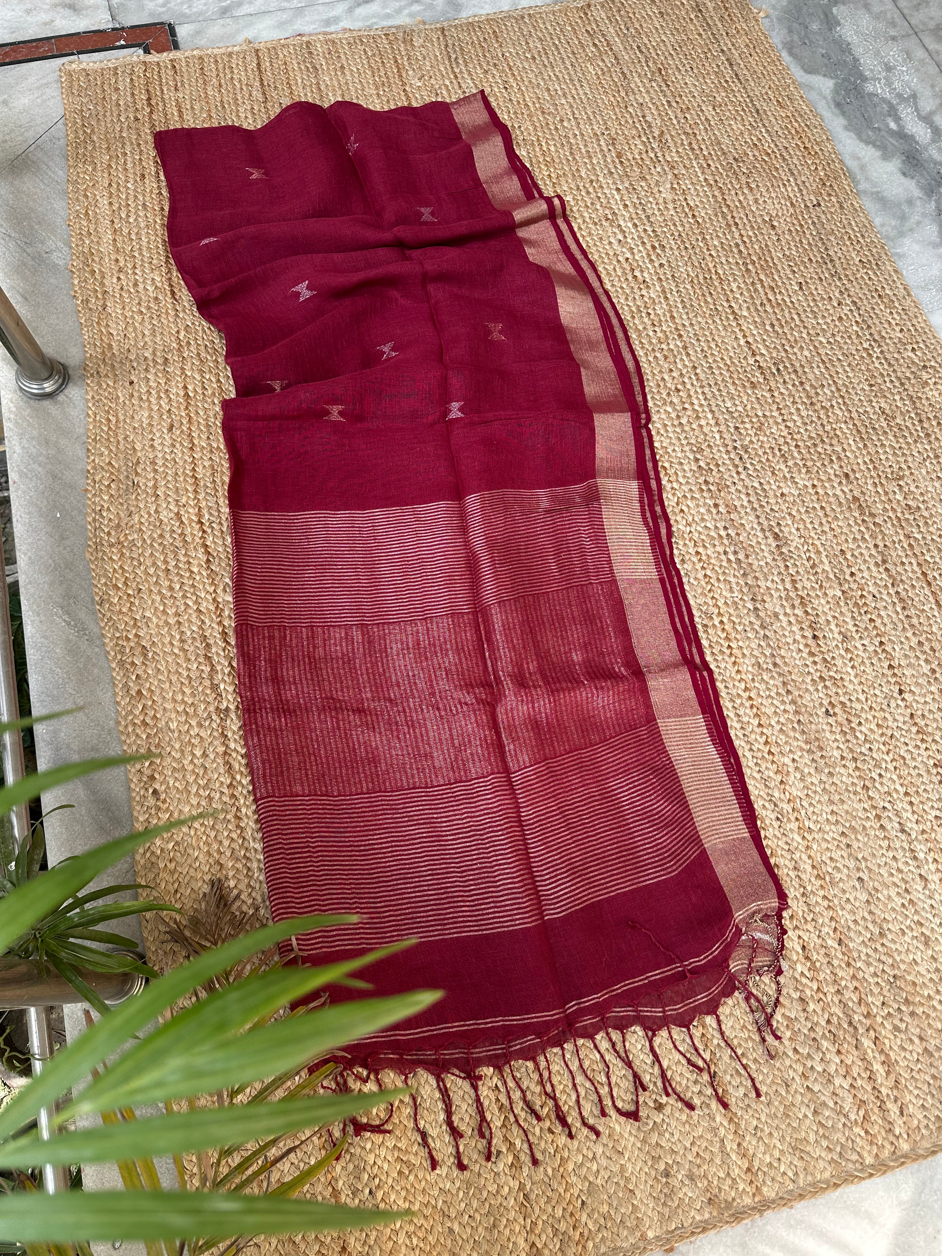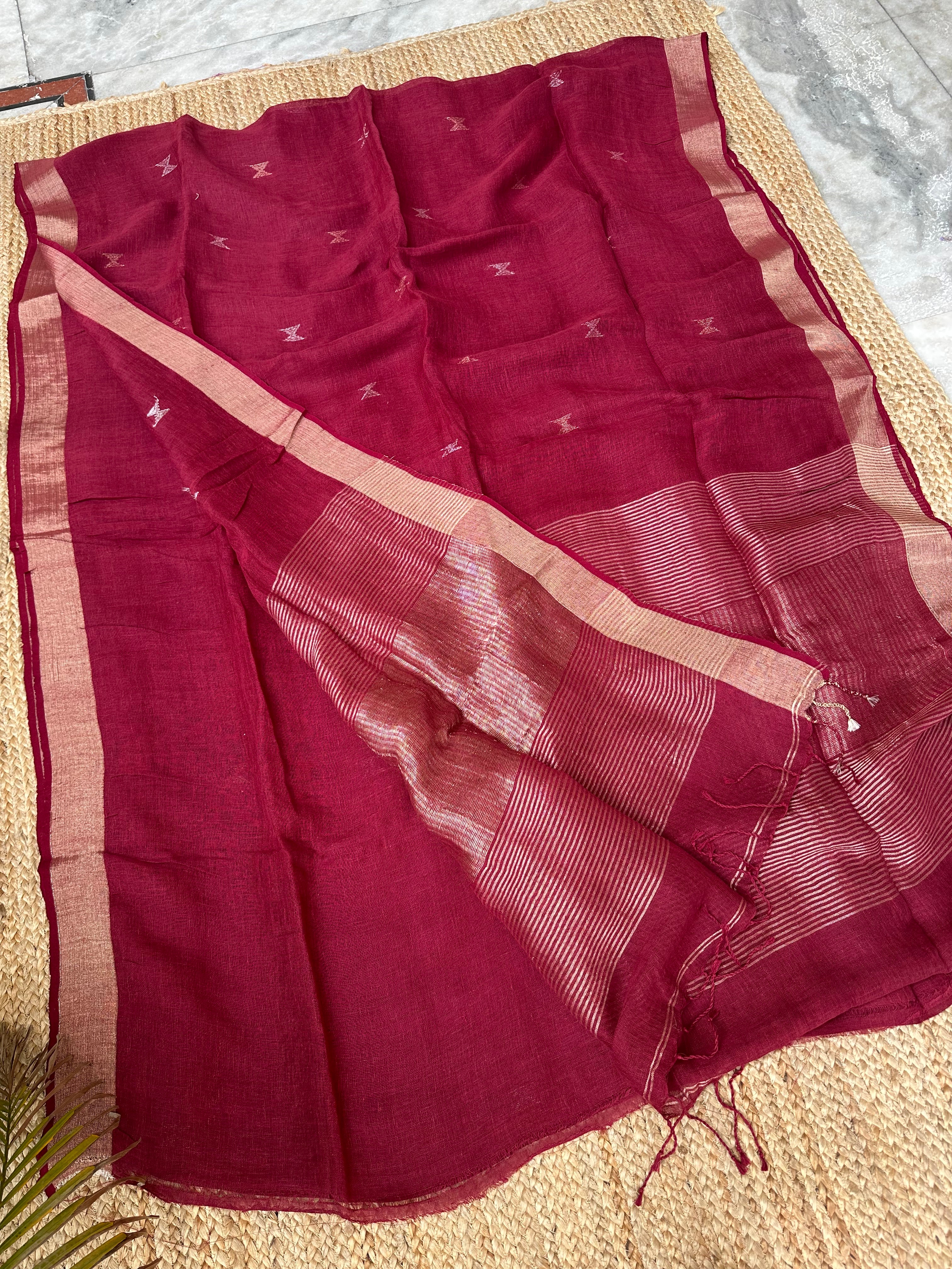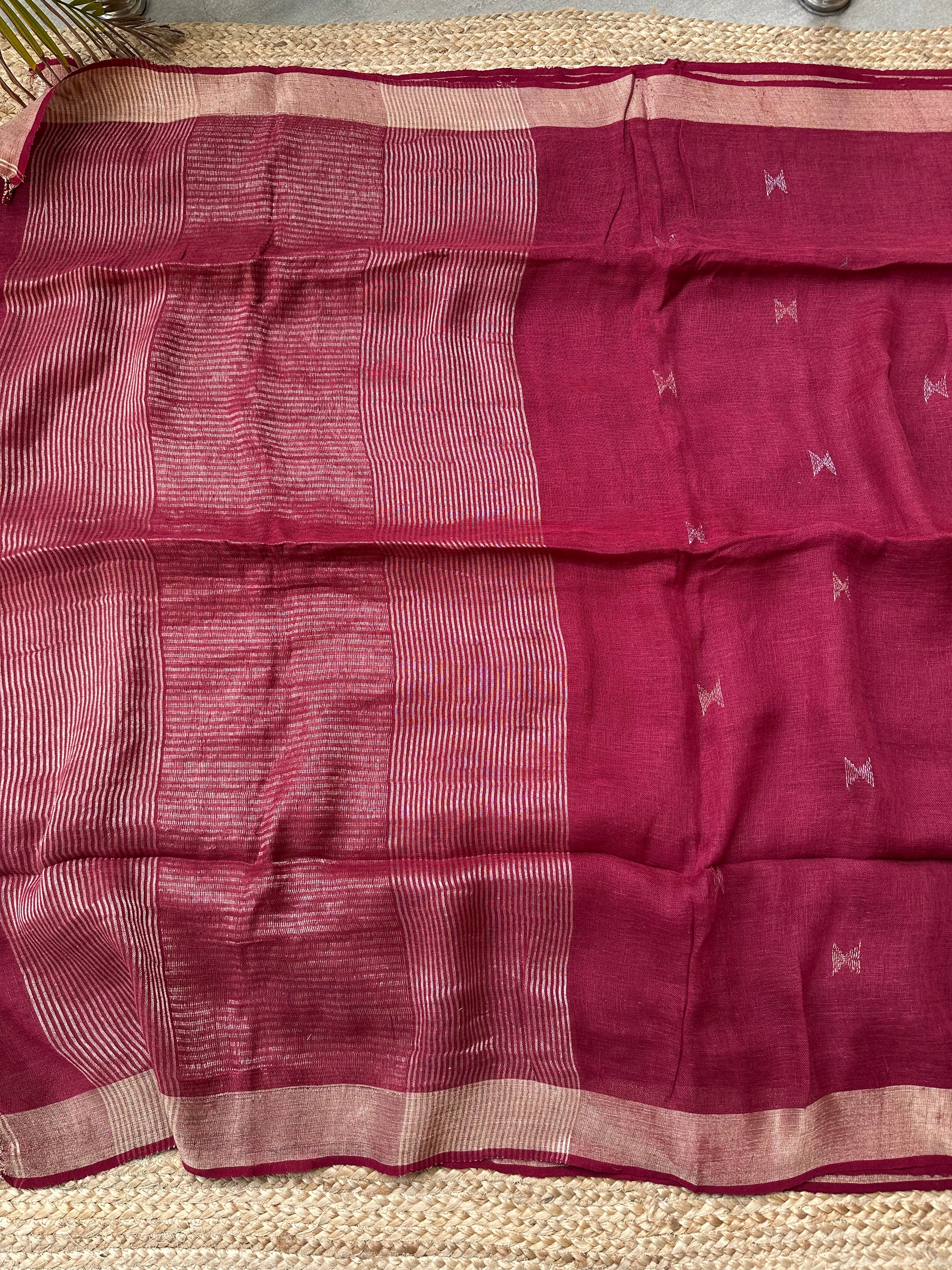 Material: Pure linen by linen handloom sarees with golden zari pallu and small silver golden bootas.