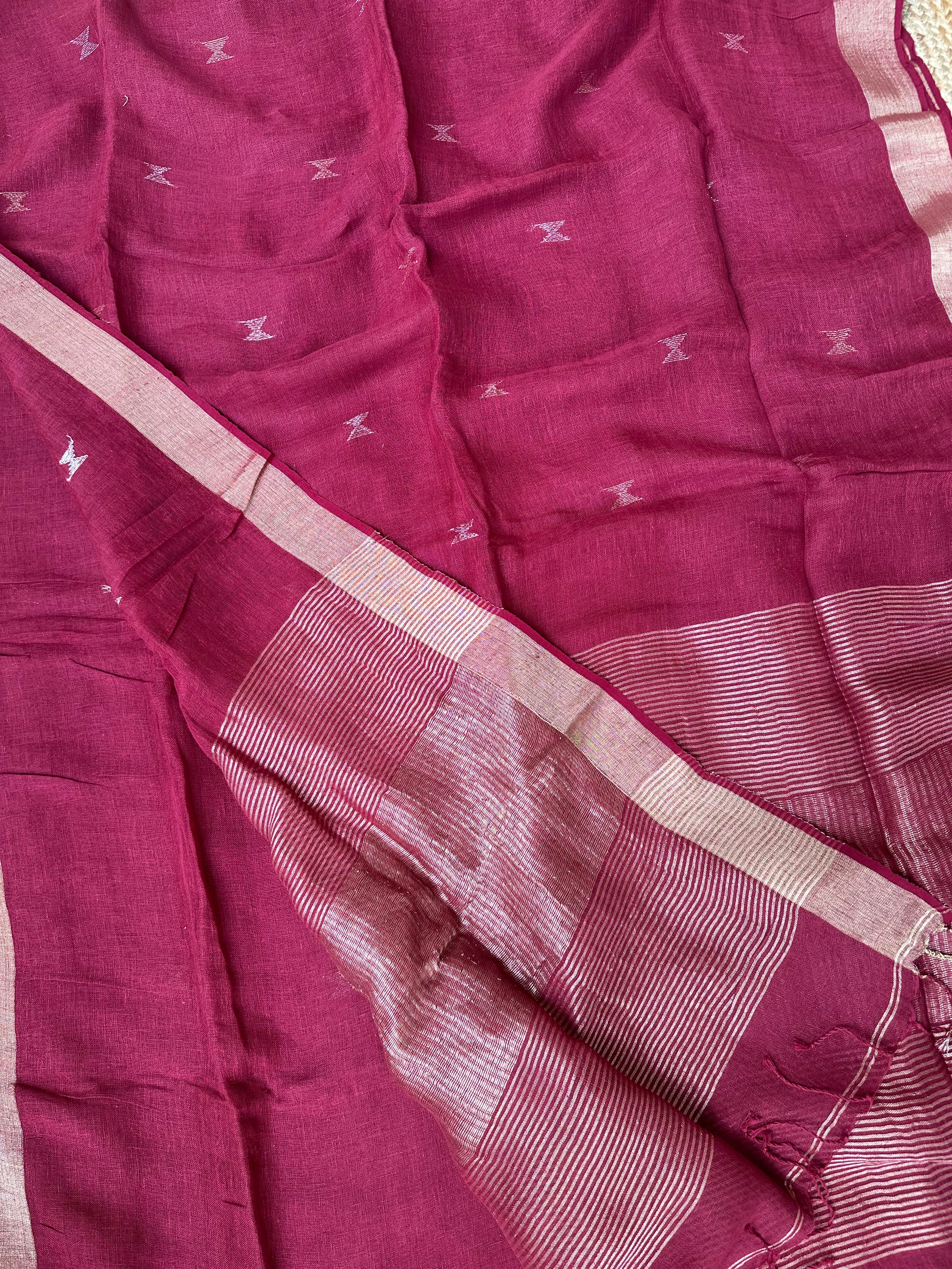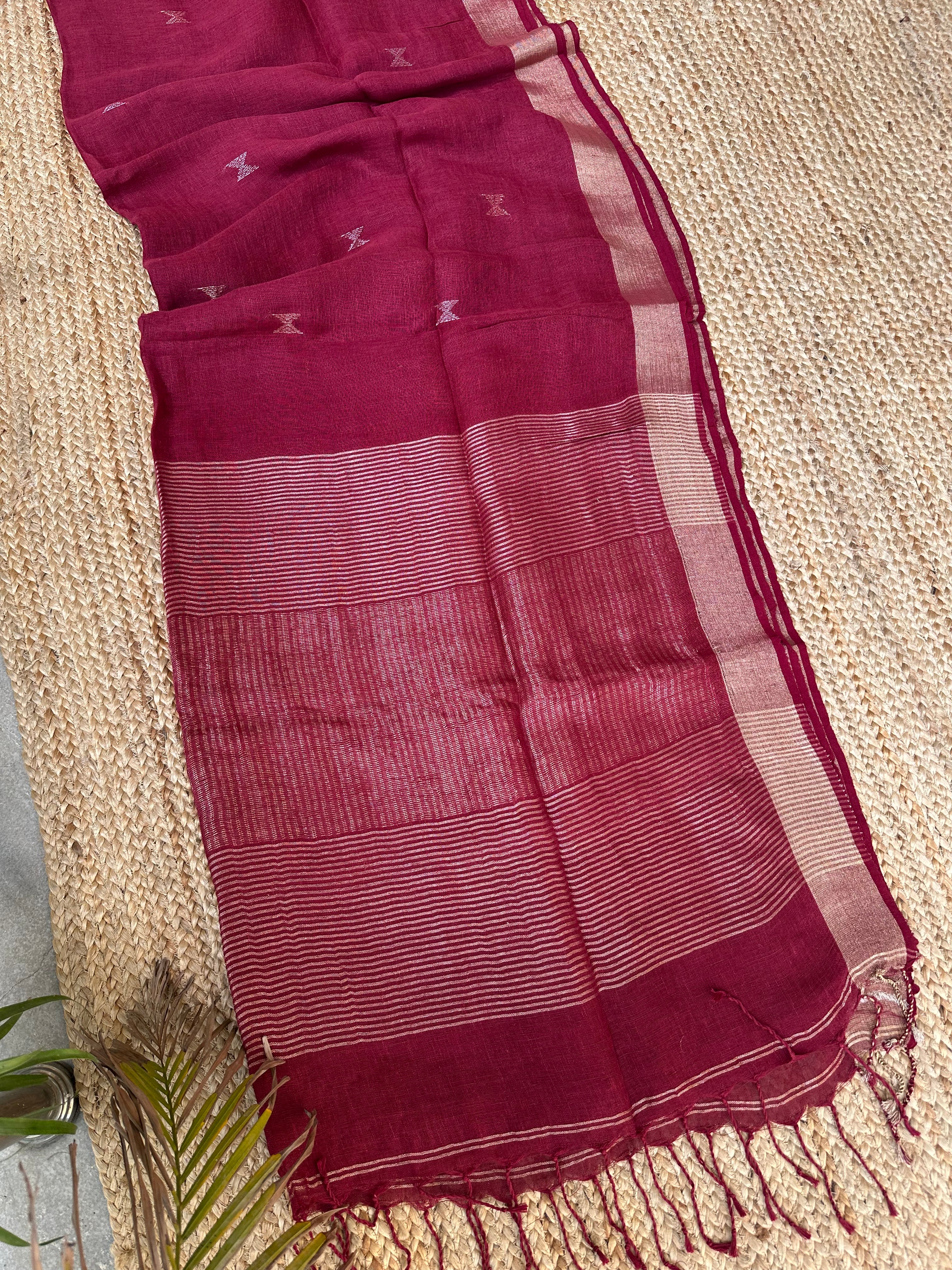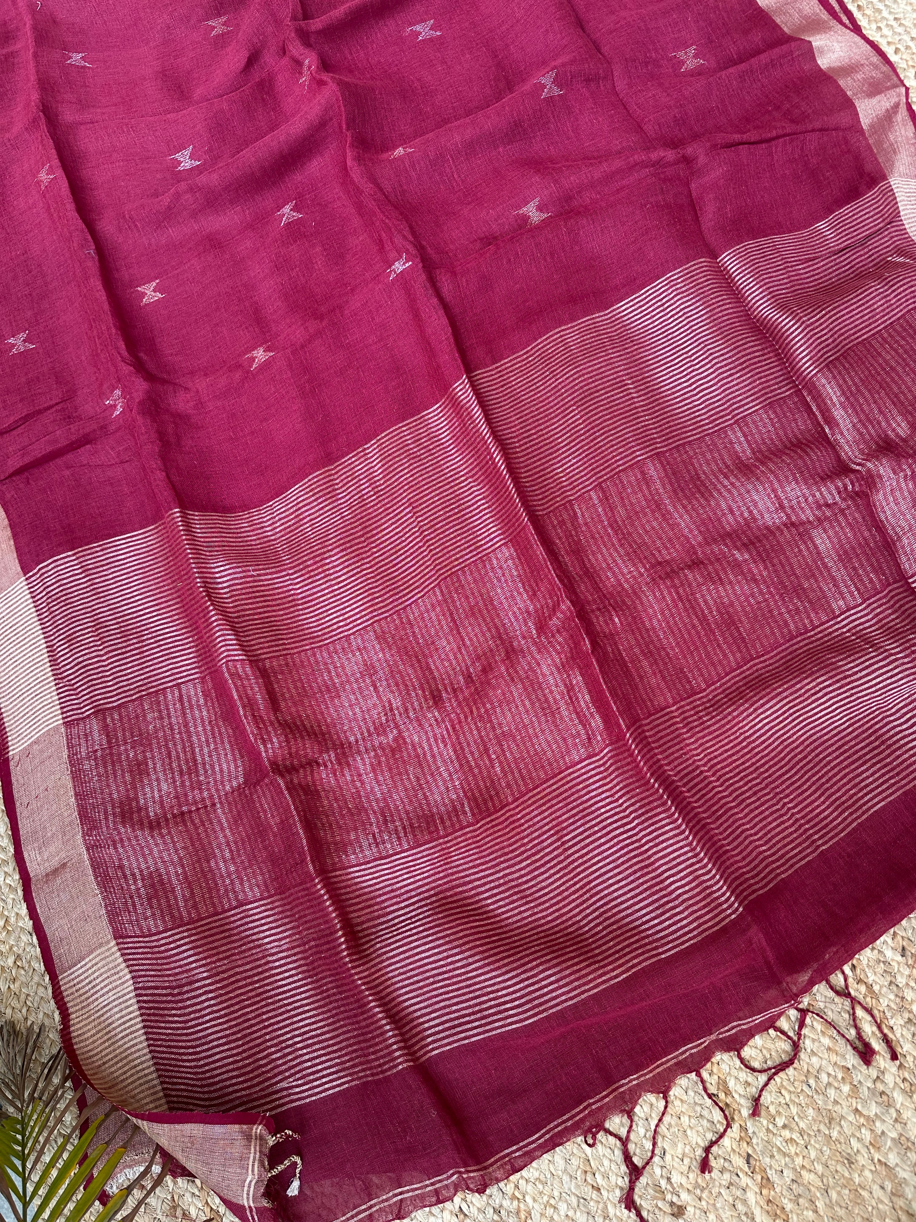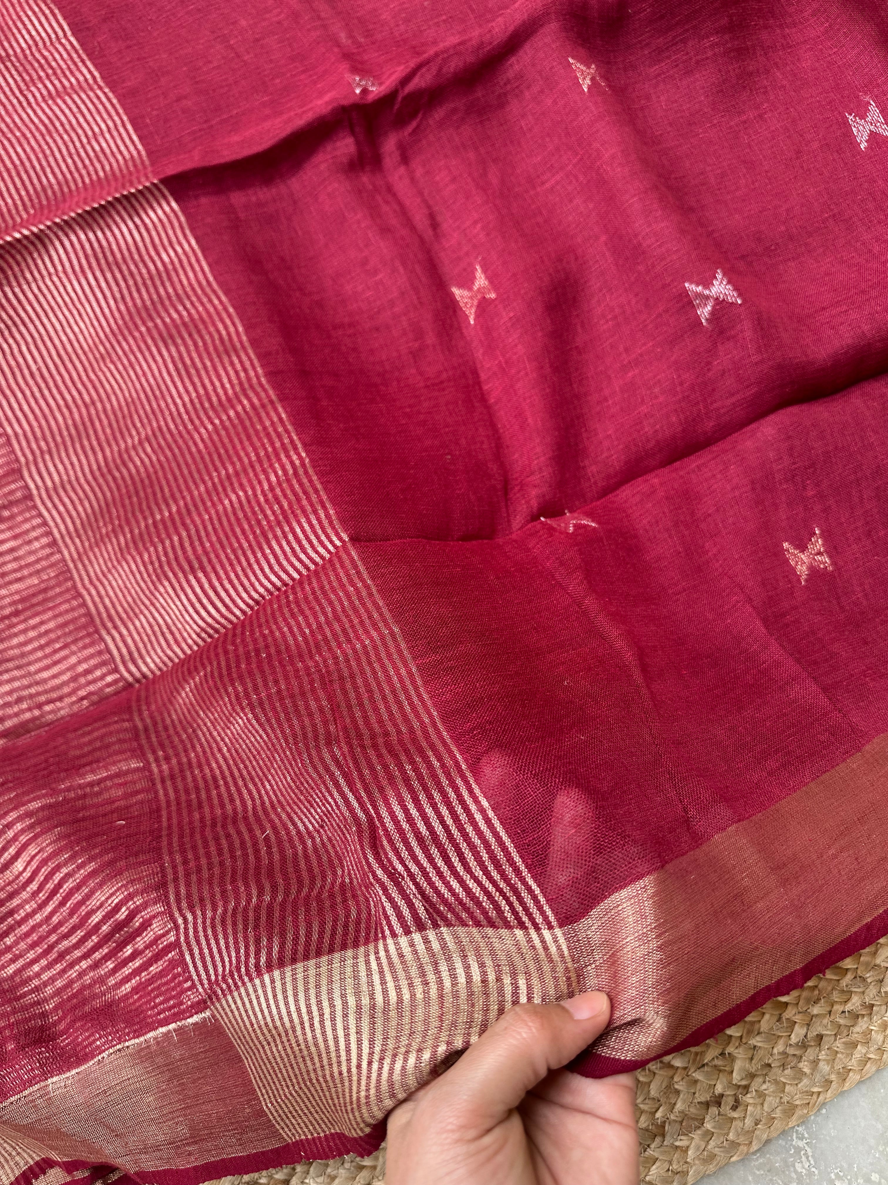 Material: Pure linen by linen handloom sarees with golden zari pallu and small silver golden bootas.