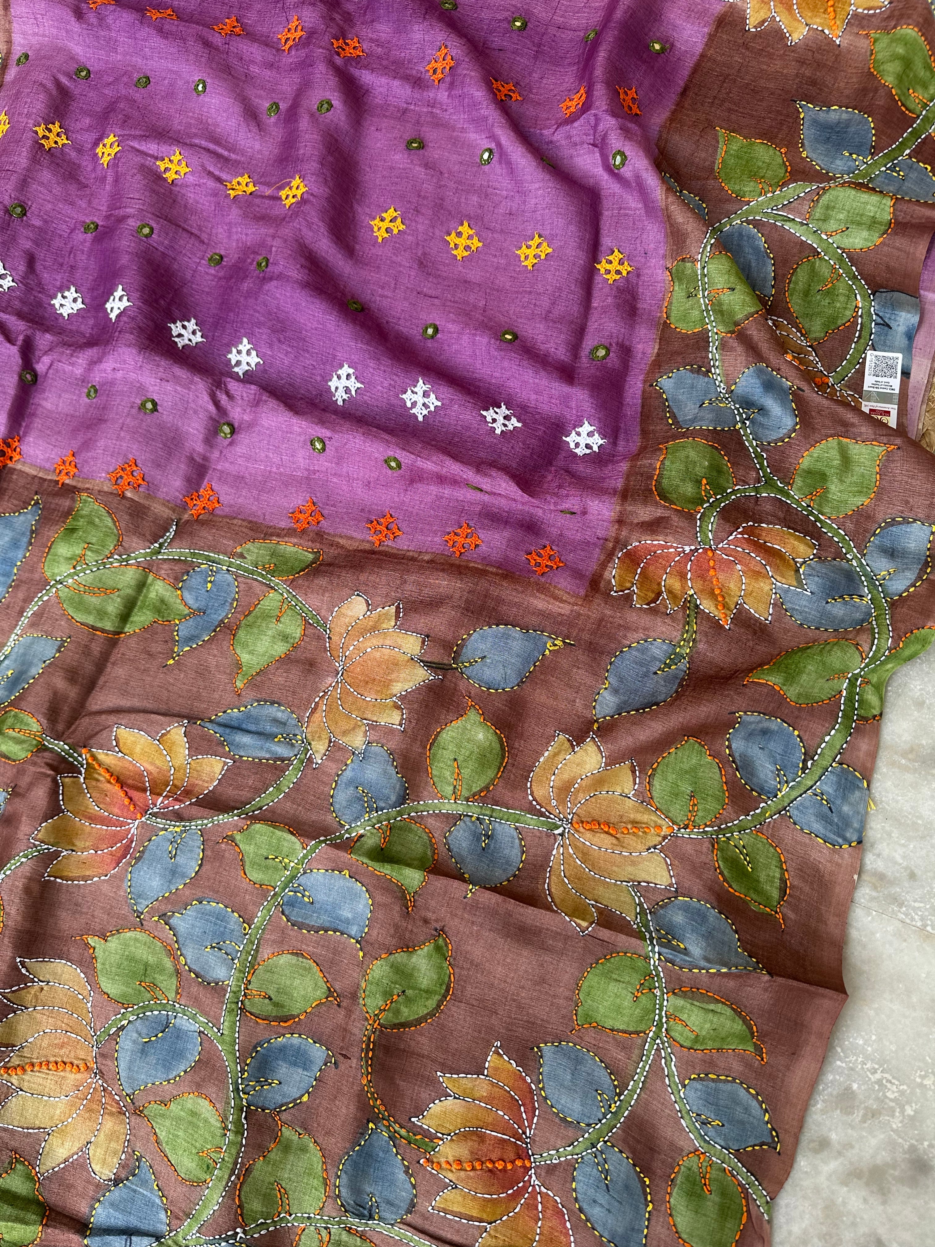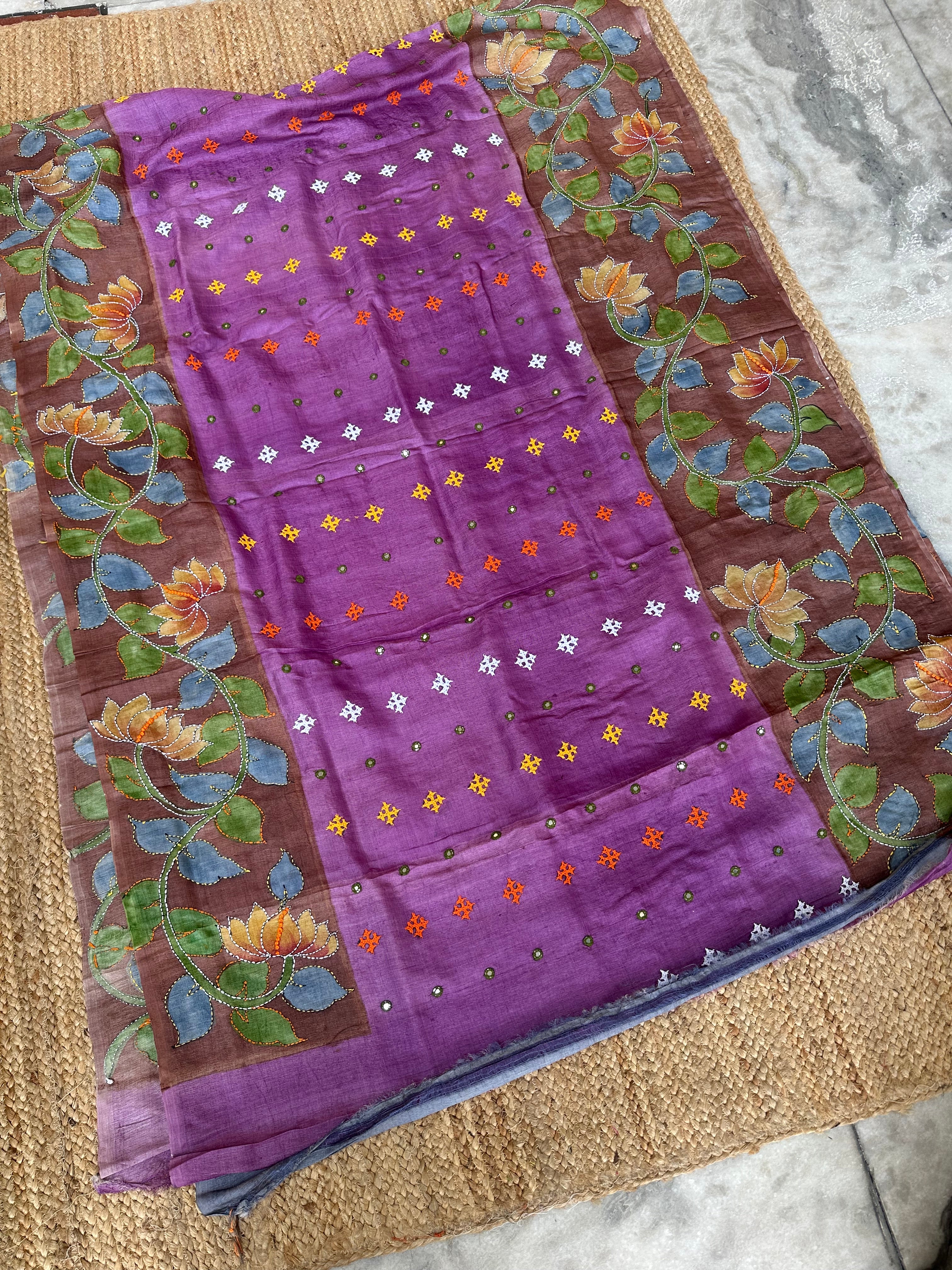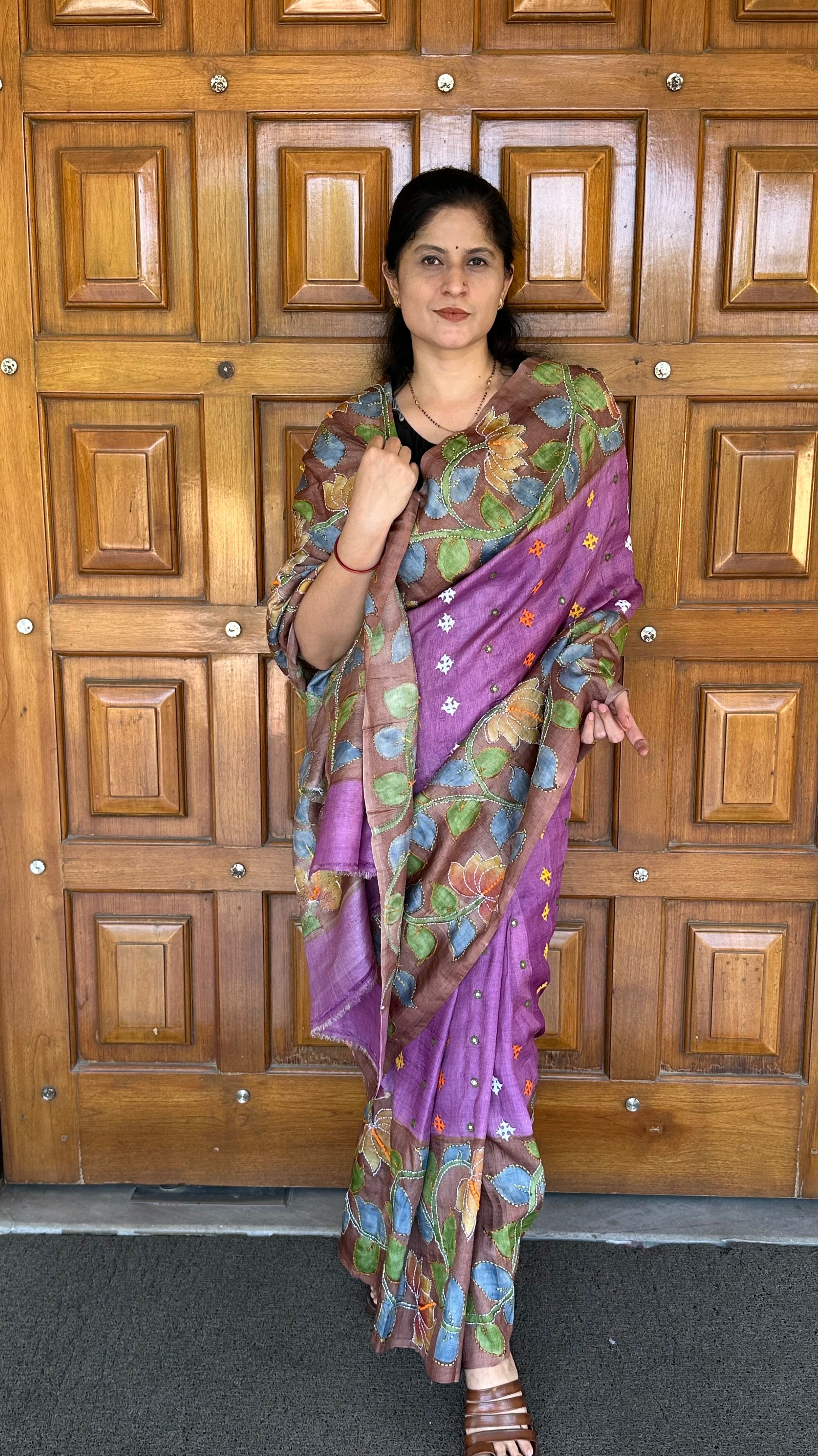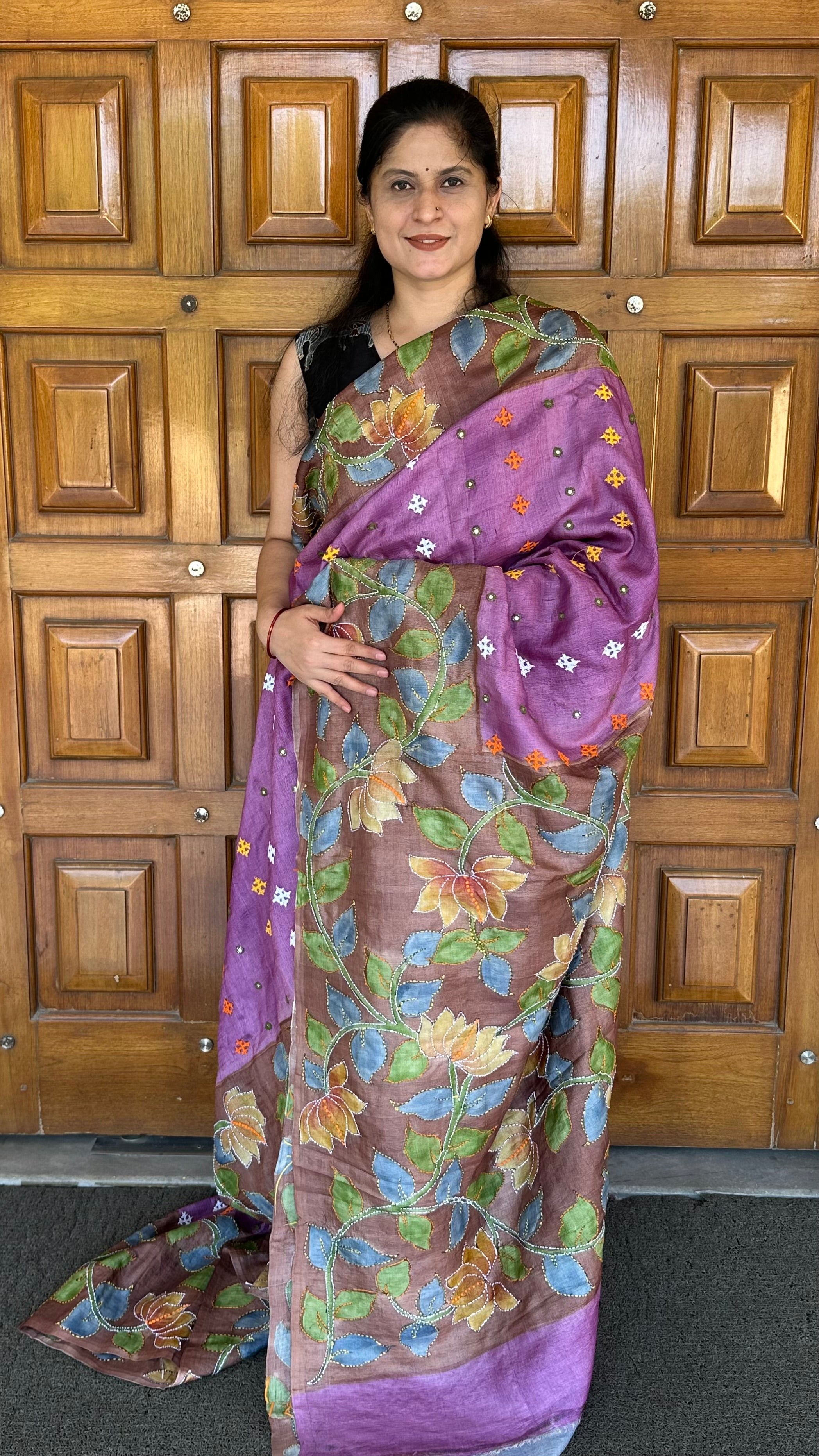Pure Tusser Handloom Pen Kalamkari Gujarati Hand Embroidered Saree