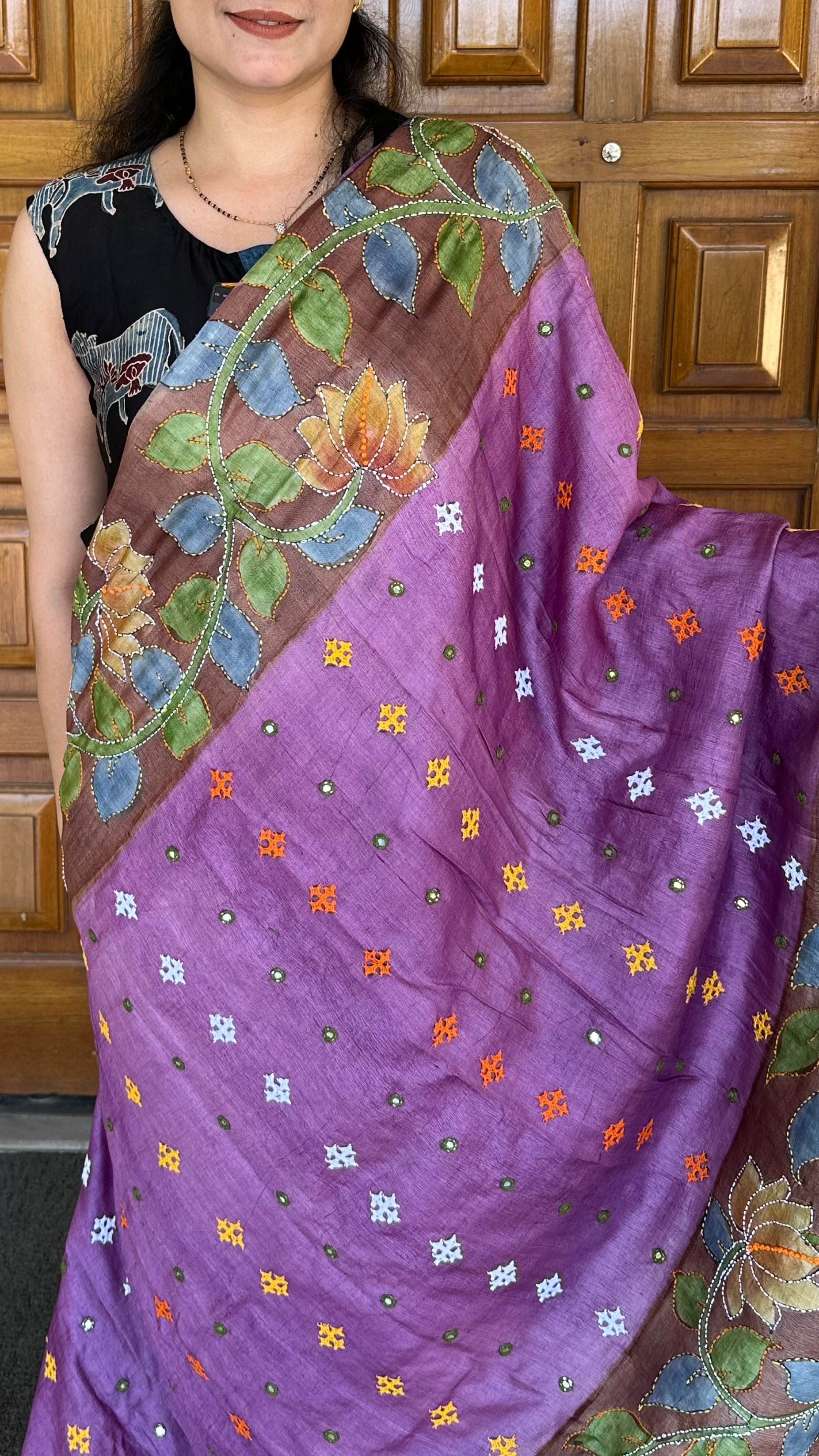 Material: Pure Tusser Handloom comes with Govt approved Silk mark as a proof of pure silk authentication. It has pen Kalamkari done by hands and Gujarati embroidery in multi coloured threads and real mirror work. Saree takes many days in making and can't be made exact same again.