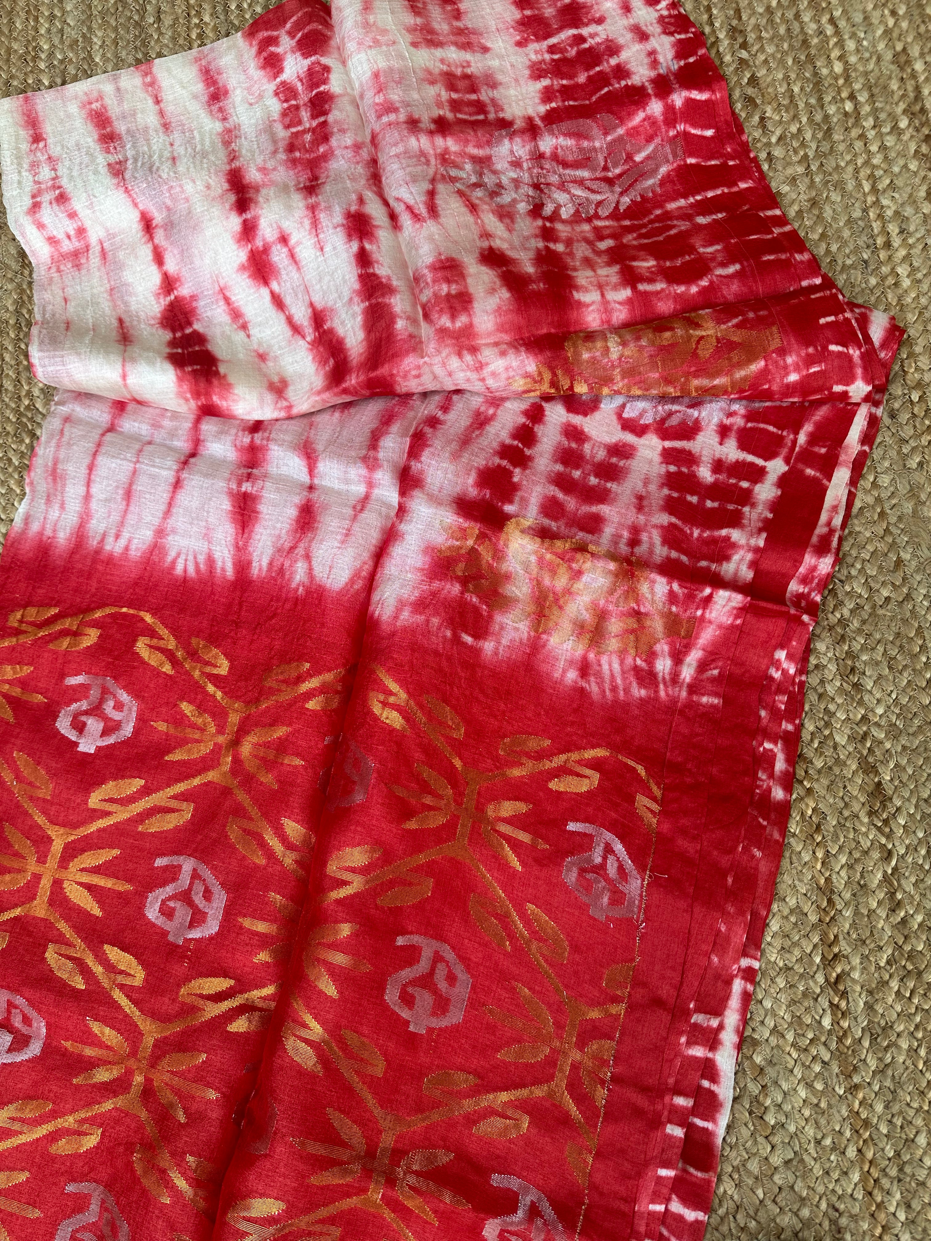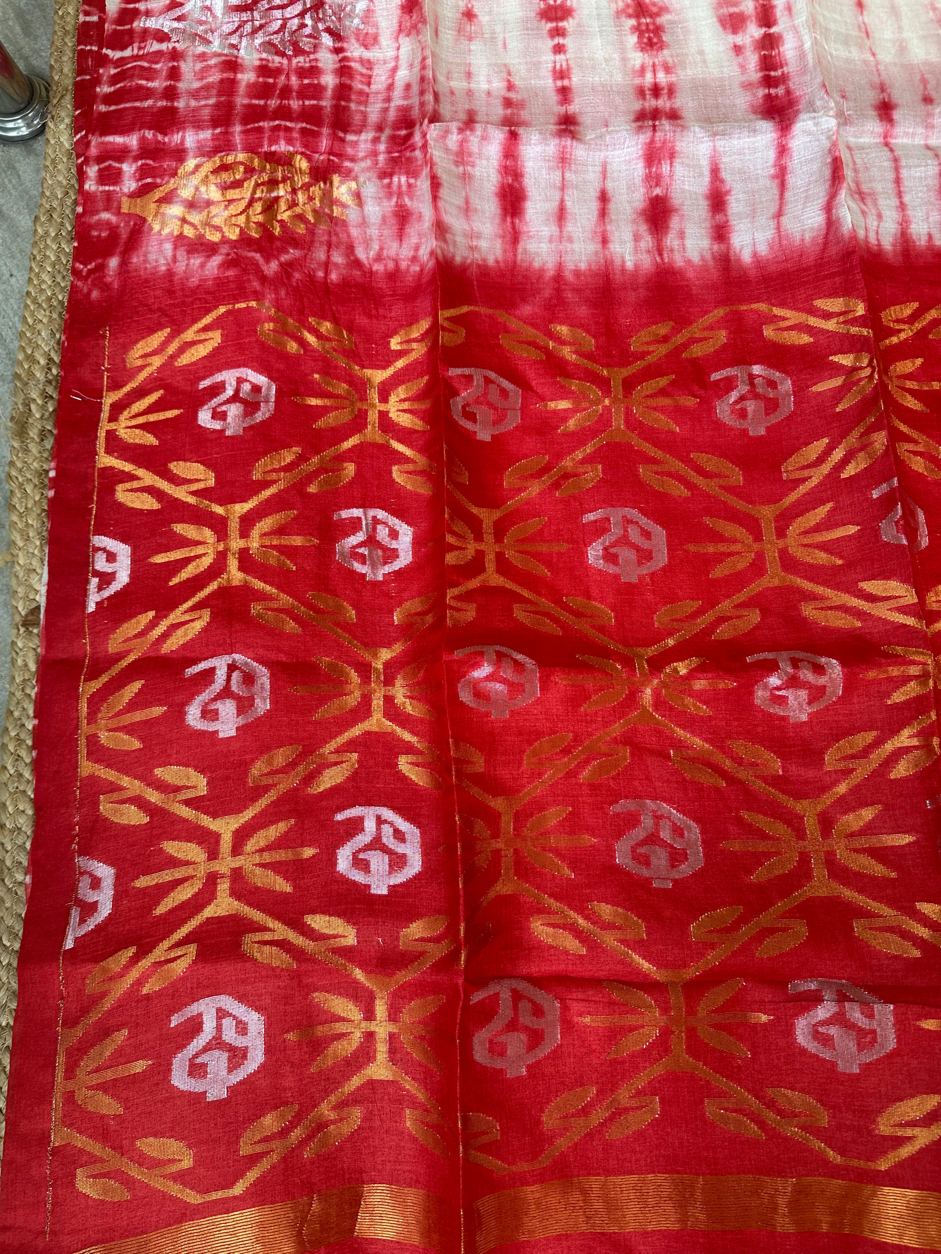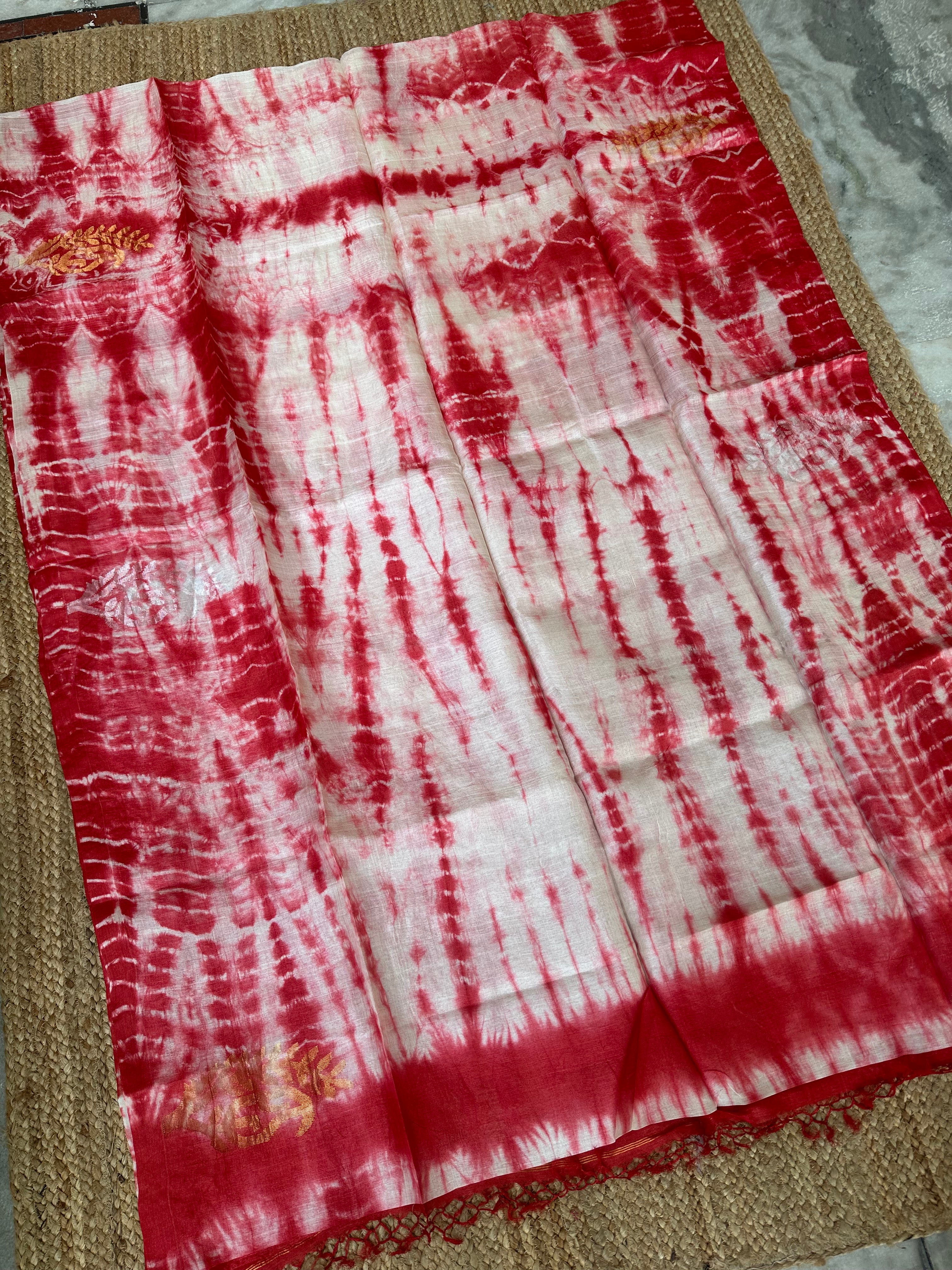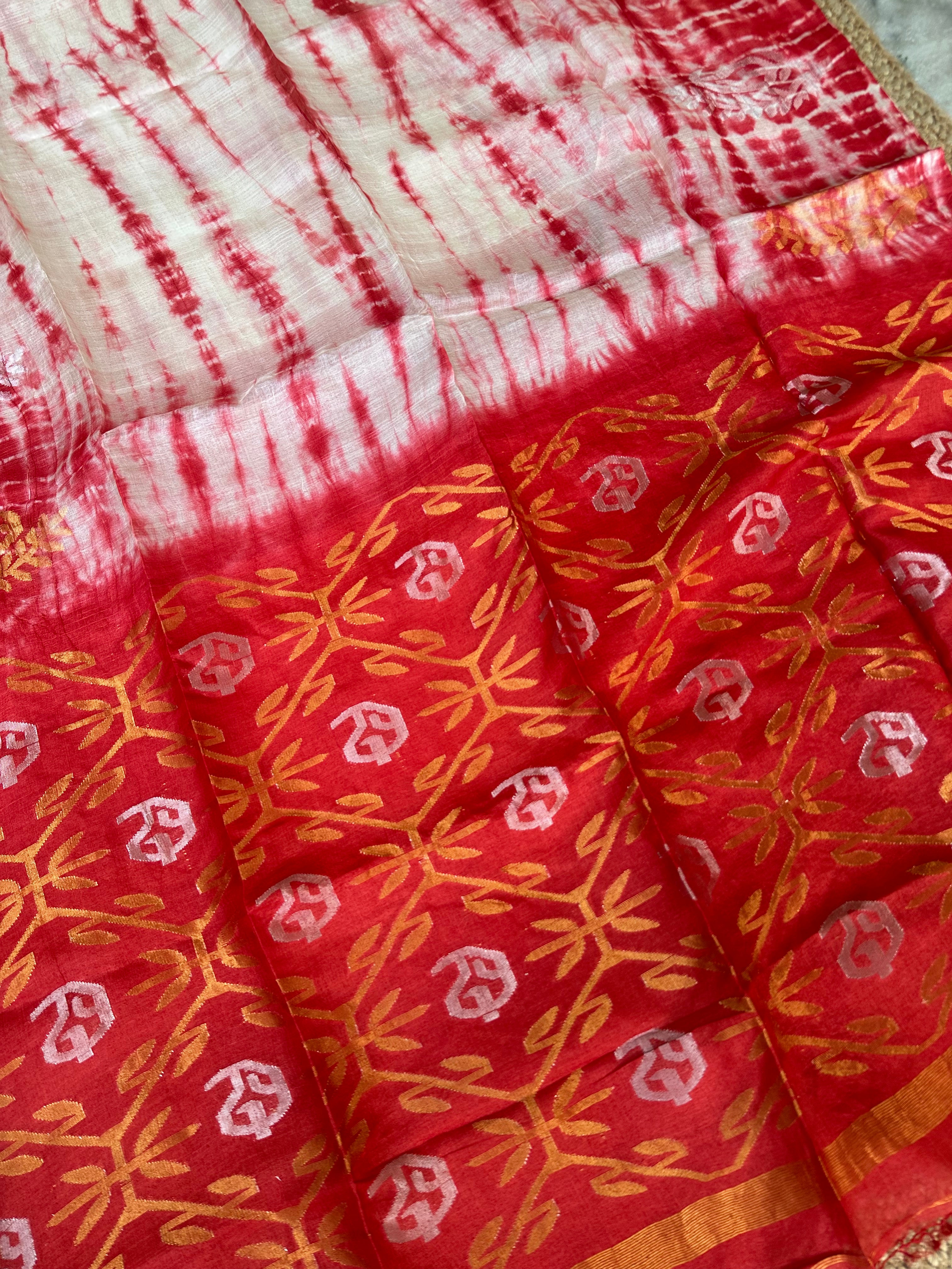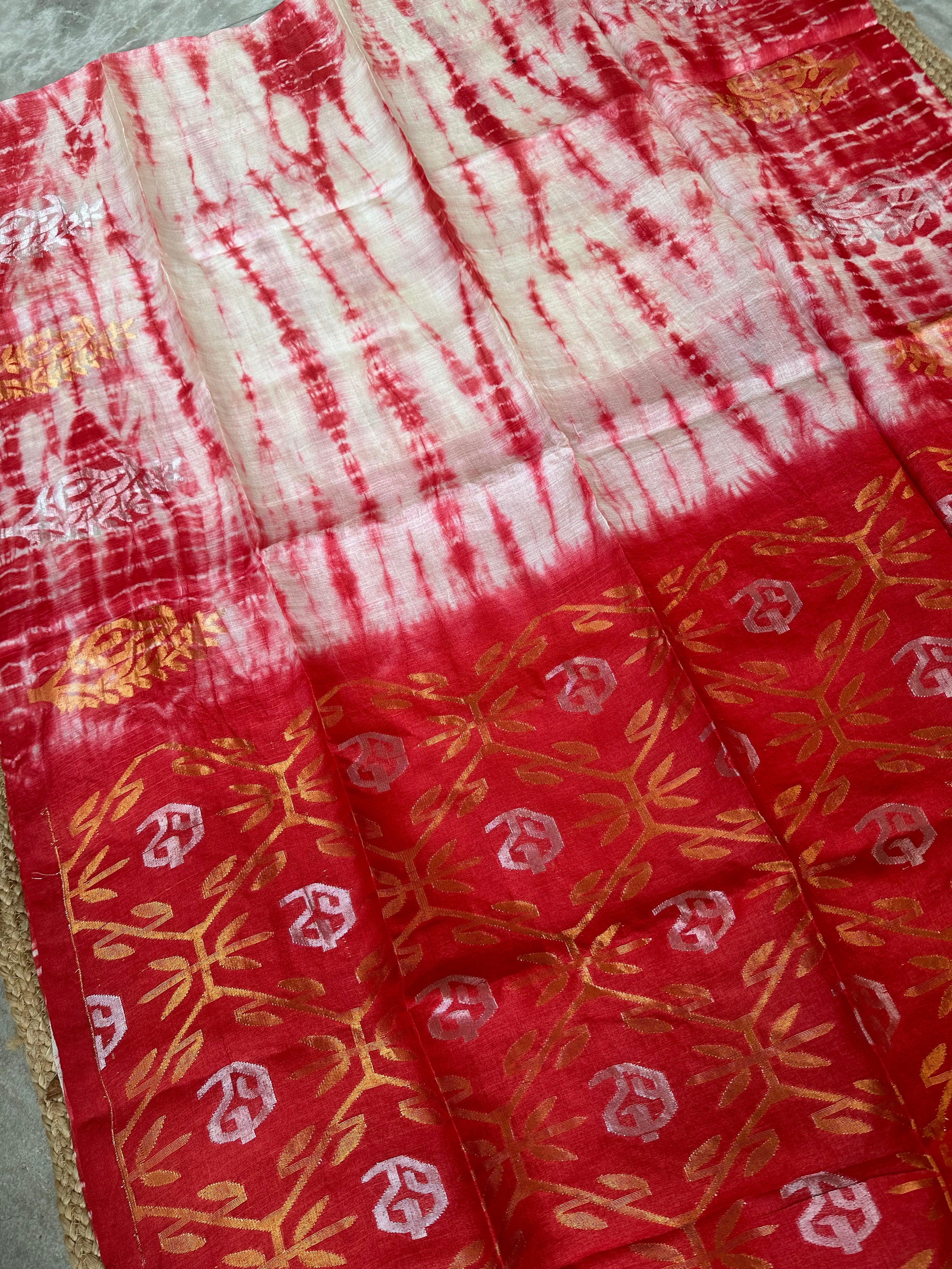 Pure Tusser Handloom Red White Shibori Saree with Zari Work