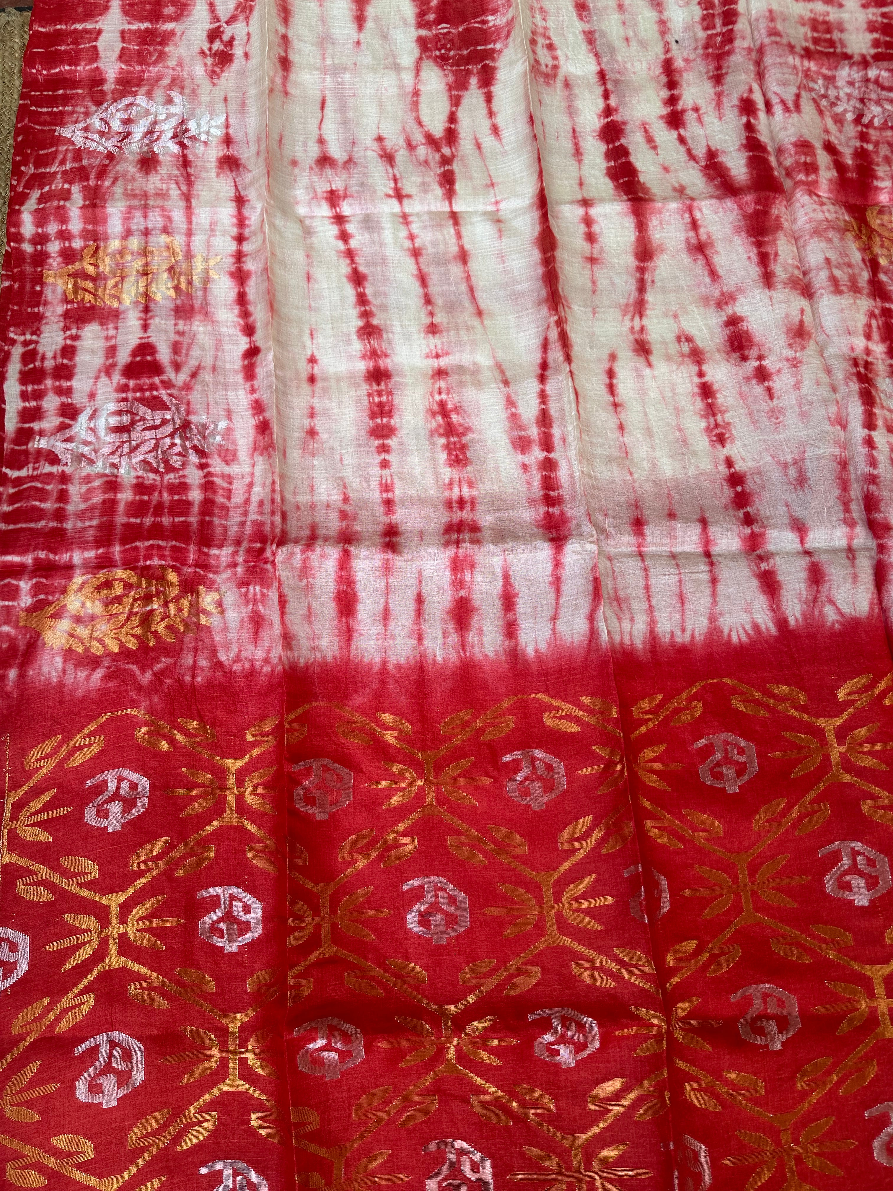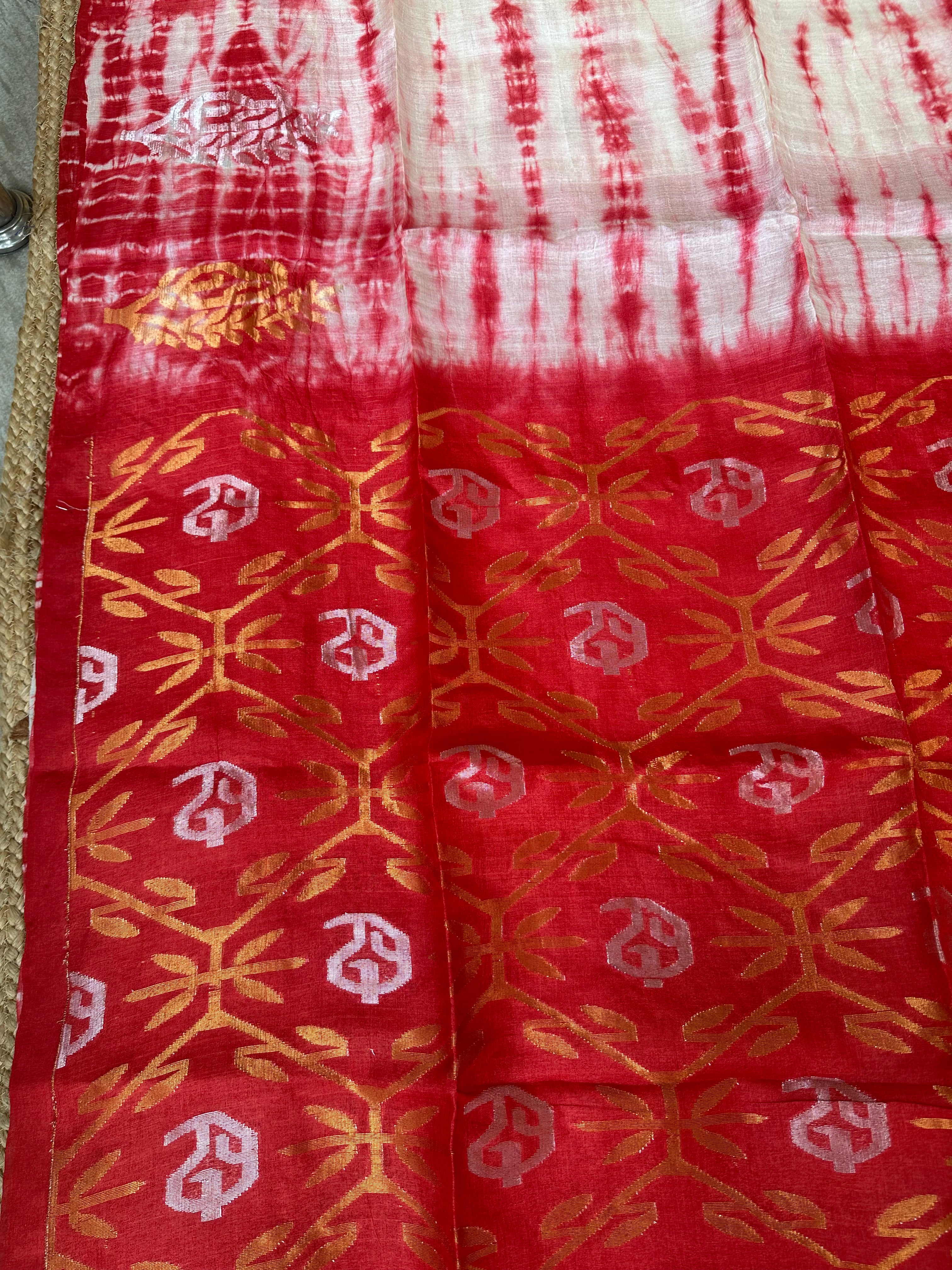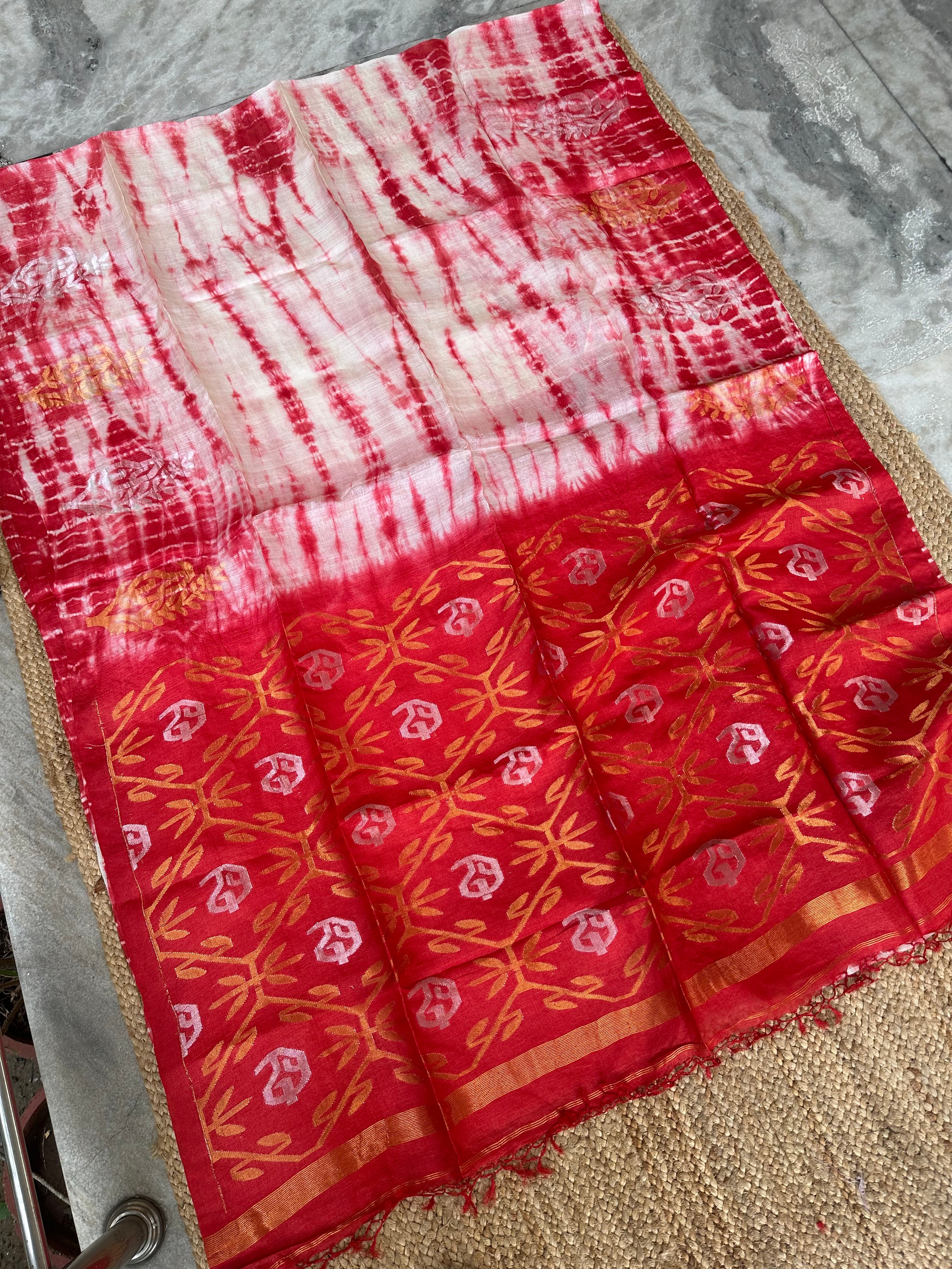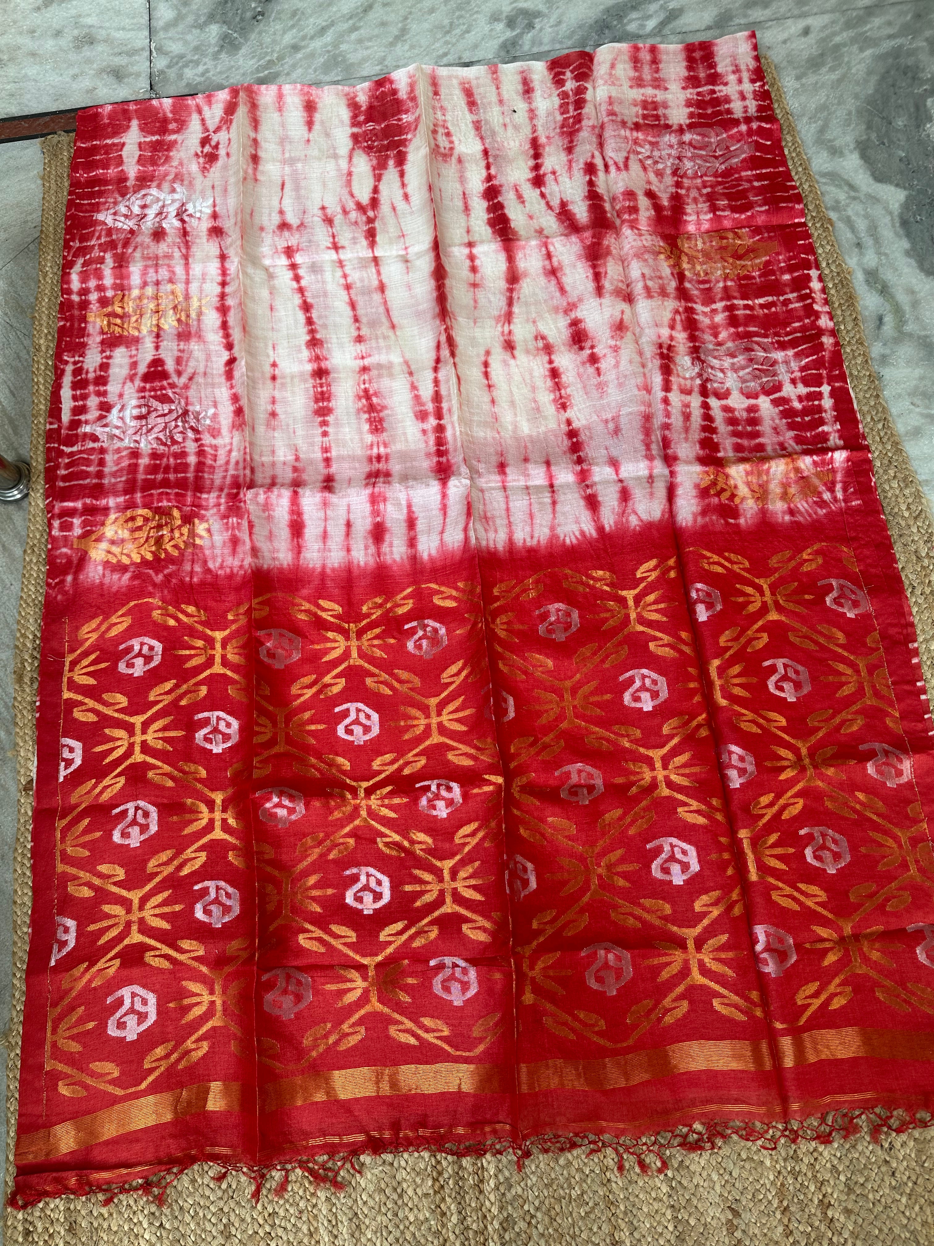 Pure Tusser Handloom Red White Shibori Saree with Zari Work