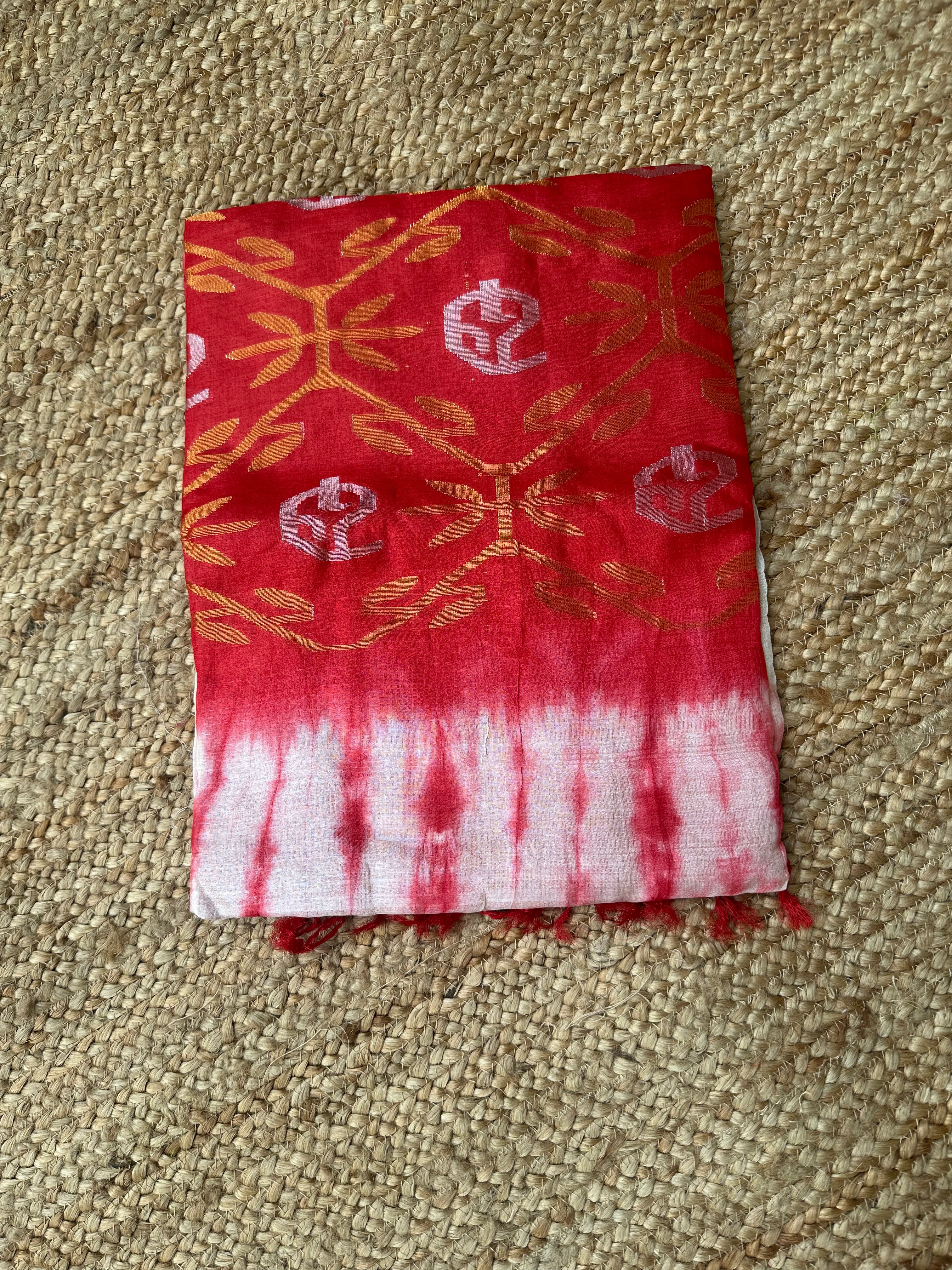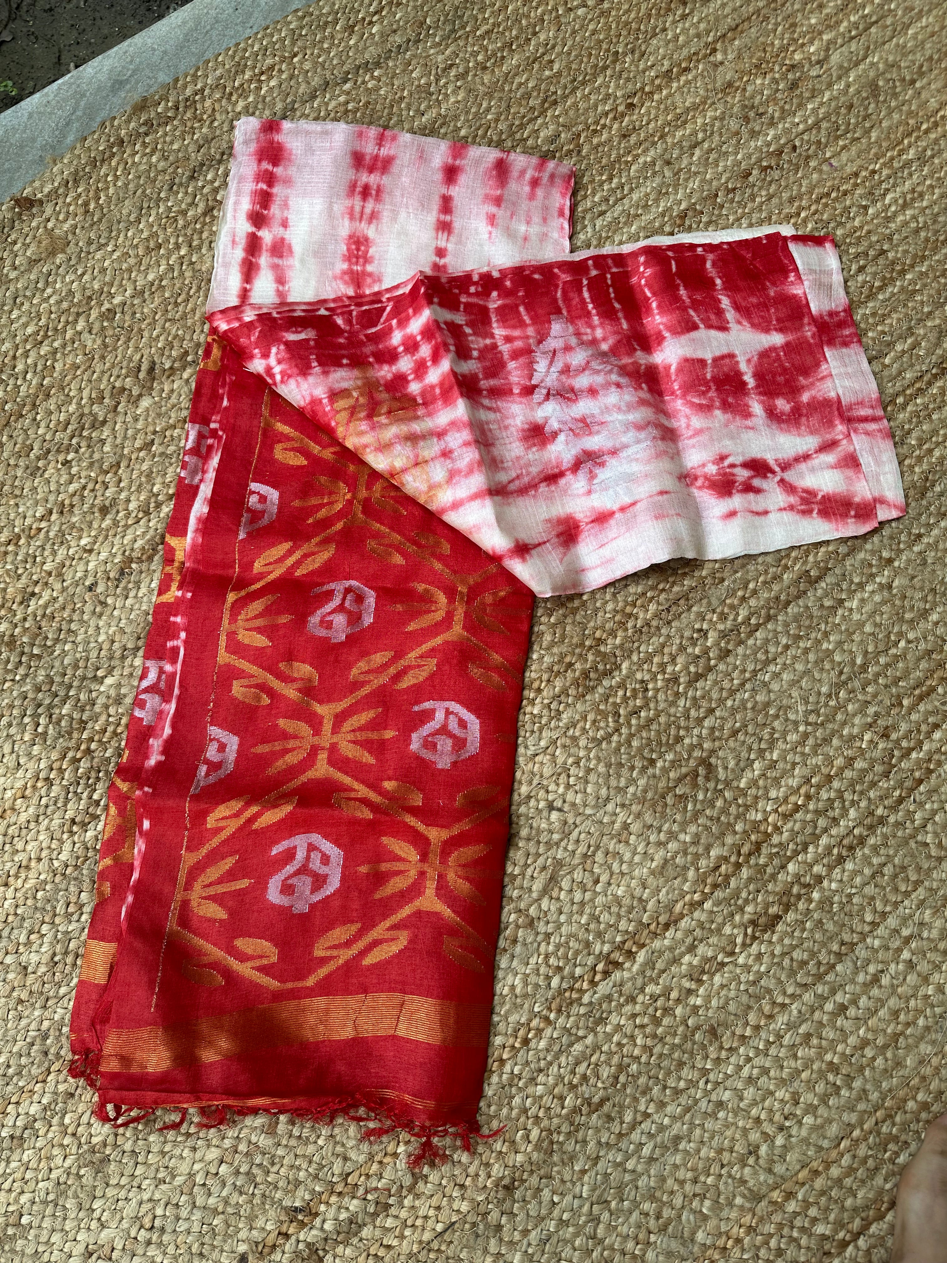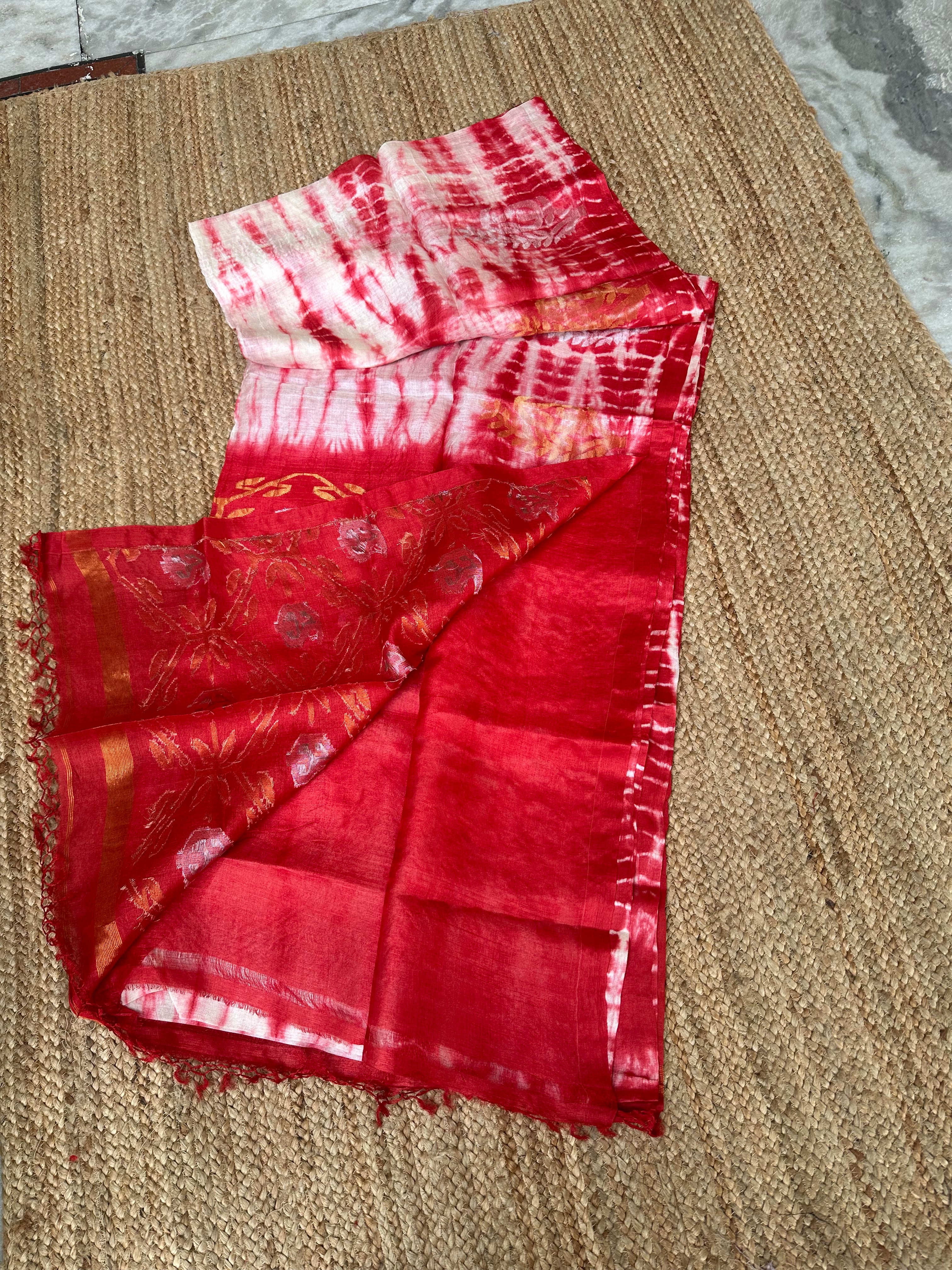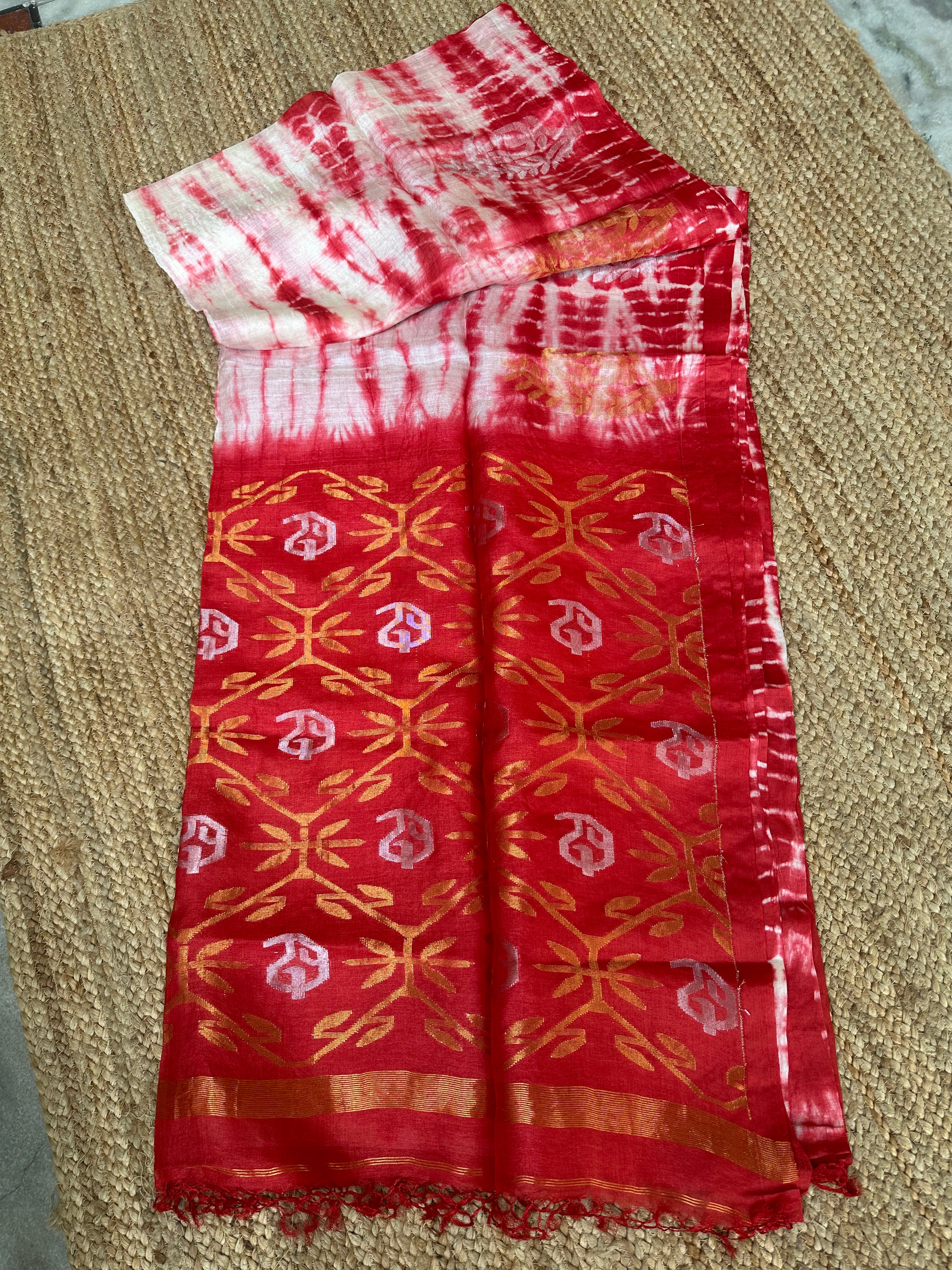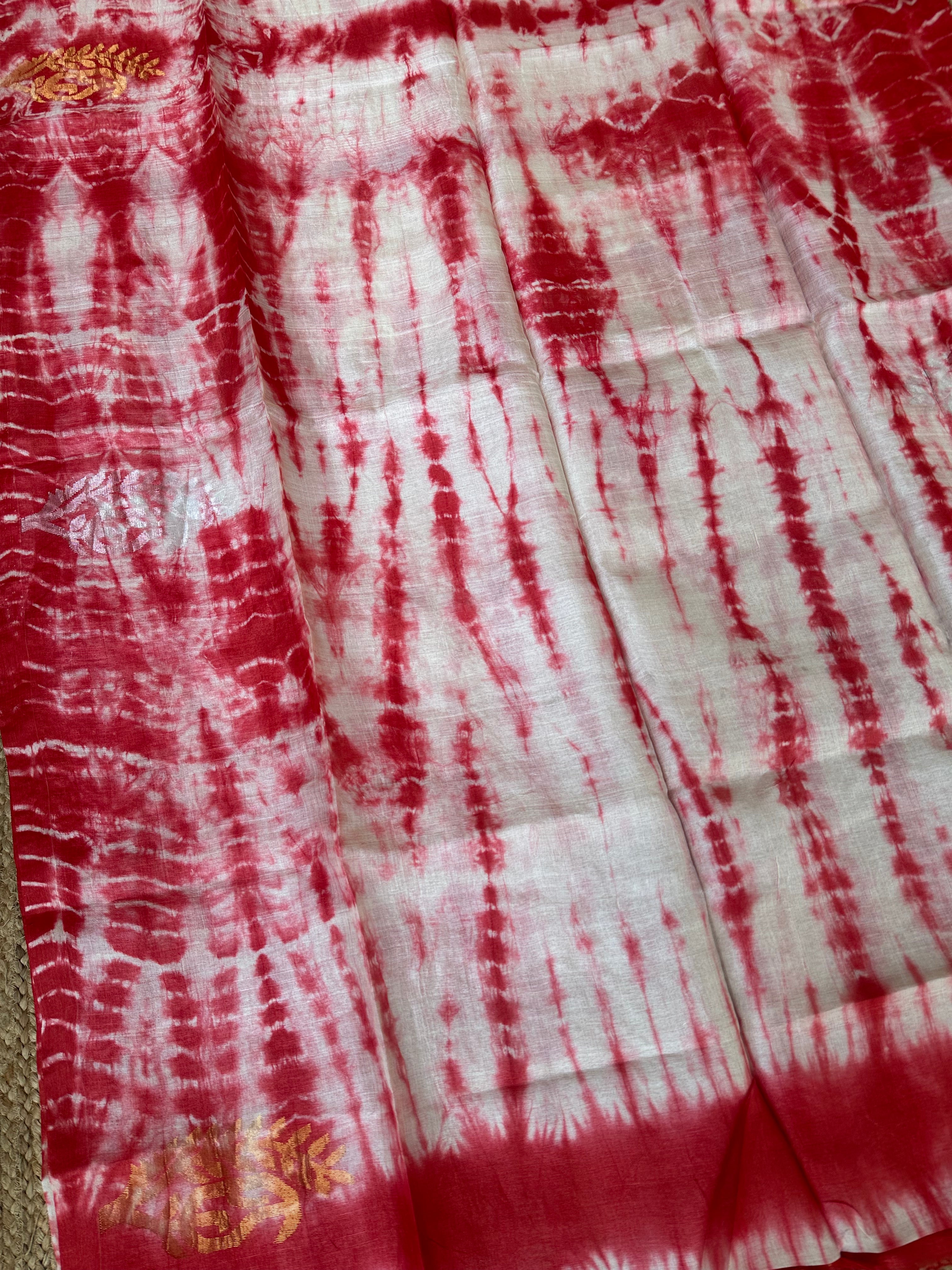 Pure Tusser Handloom Red White Shibori Saree with Zari Work