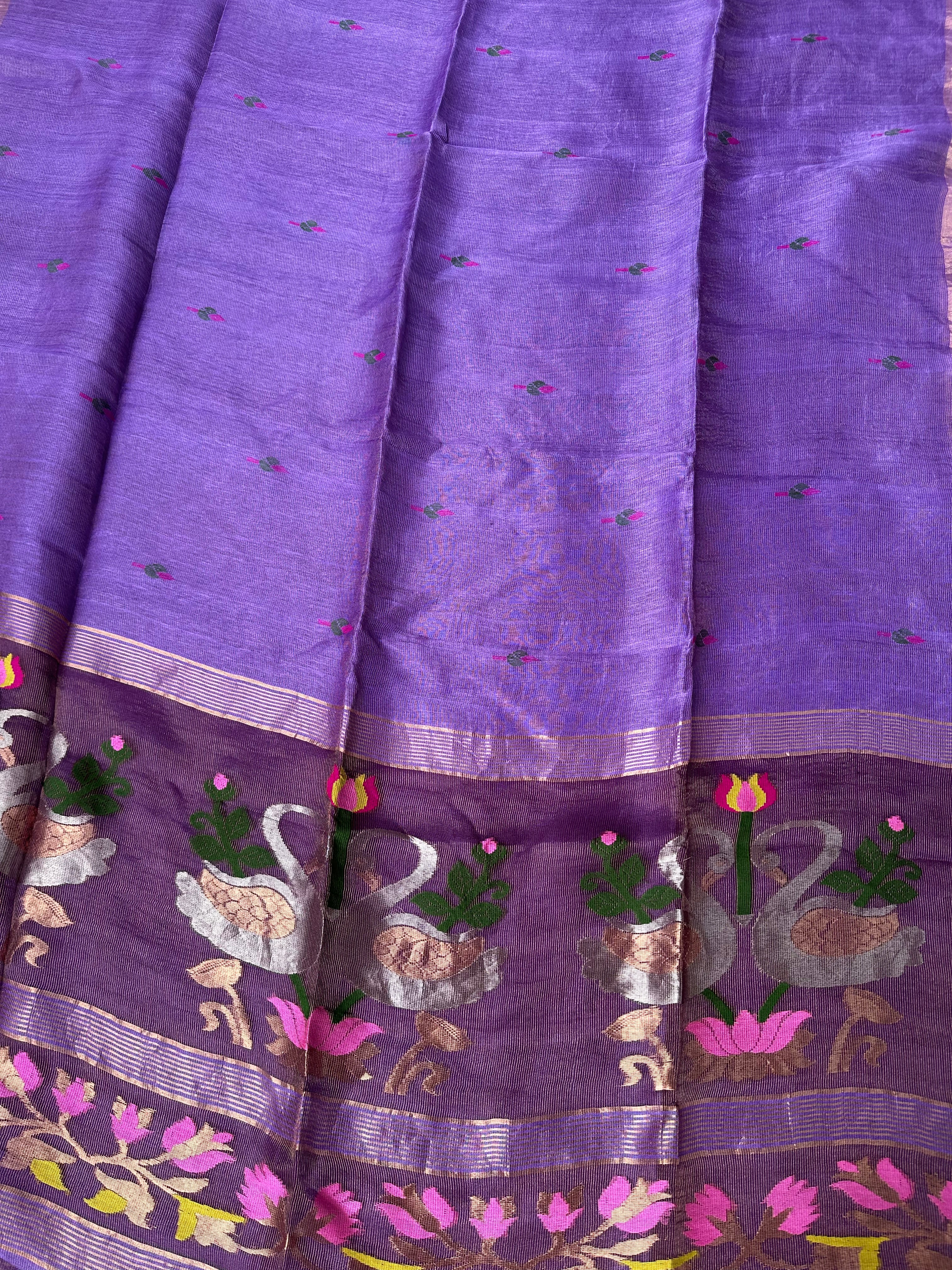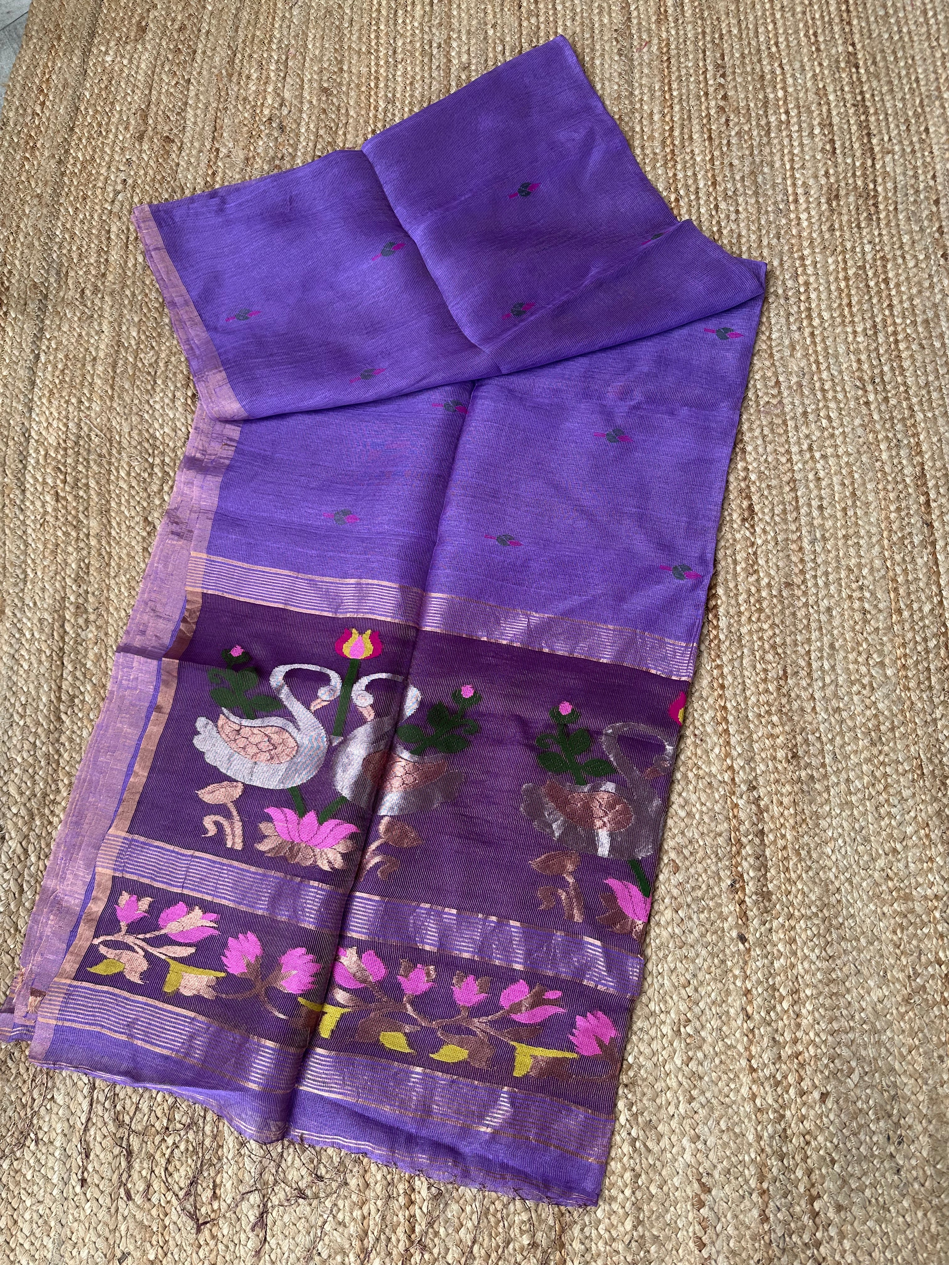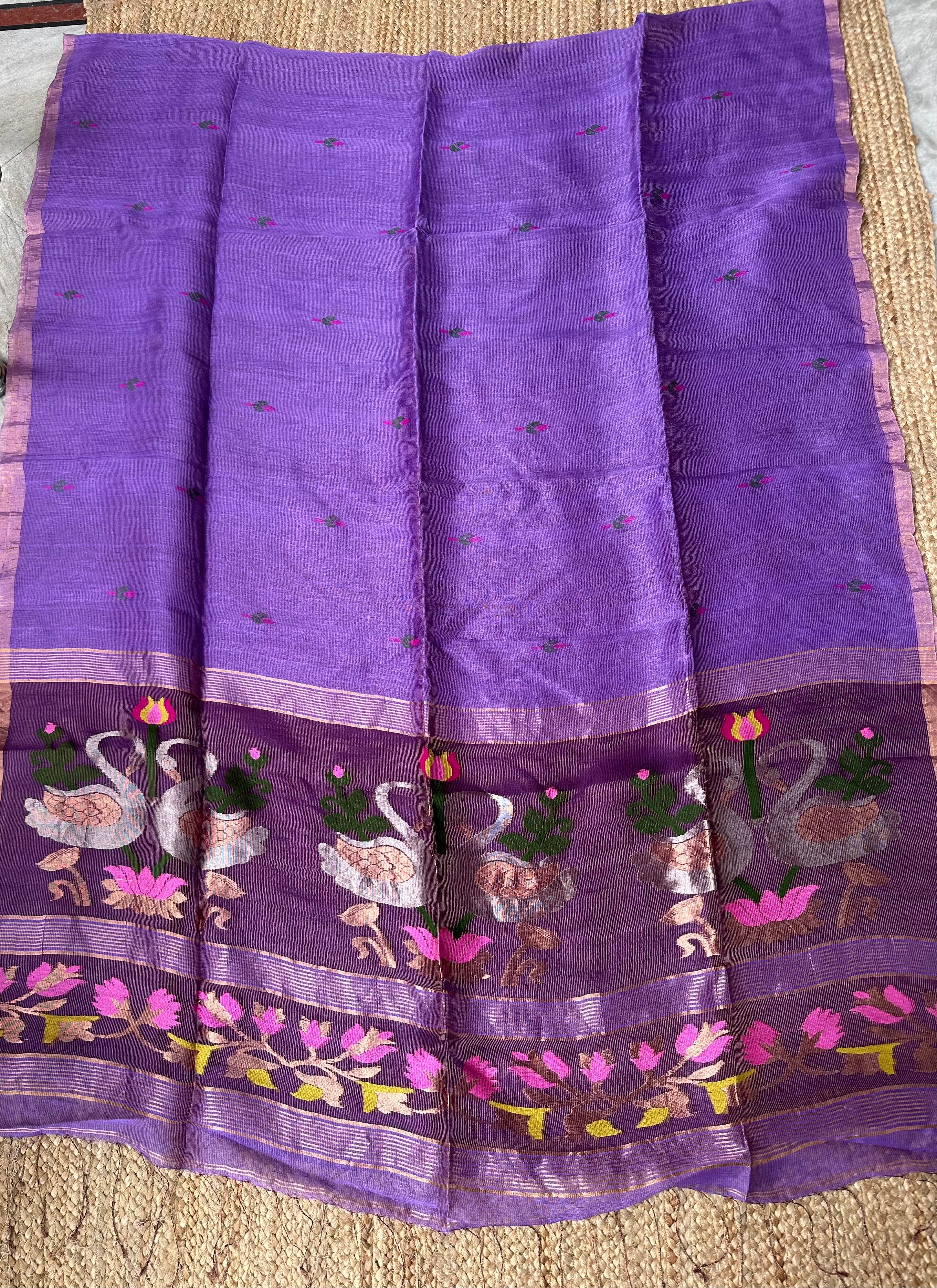 Purple Linen Tissue Twin Birds Jamdani Handloom Saree