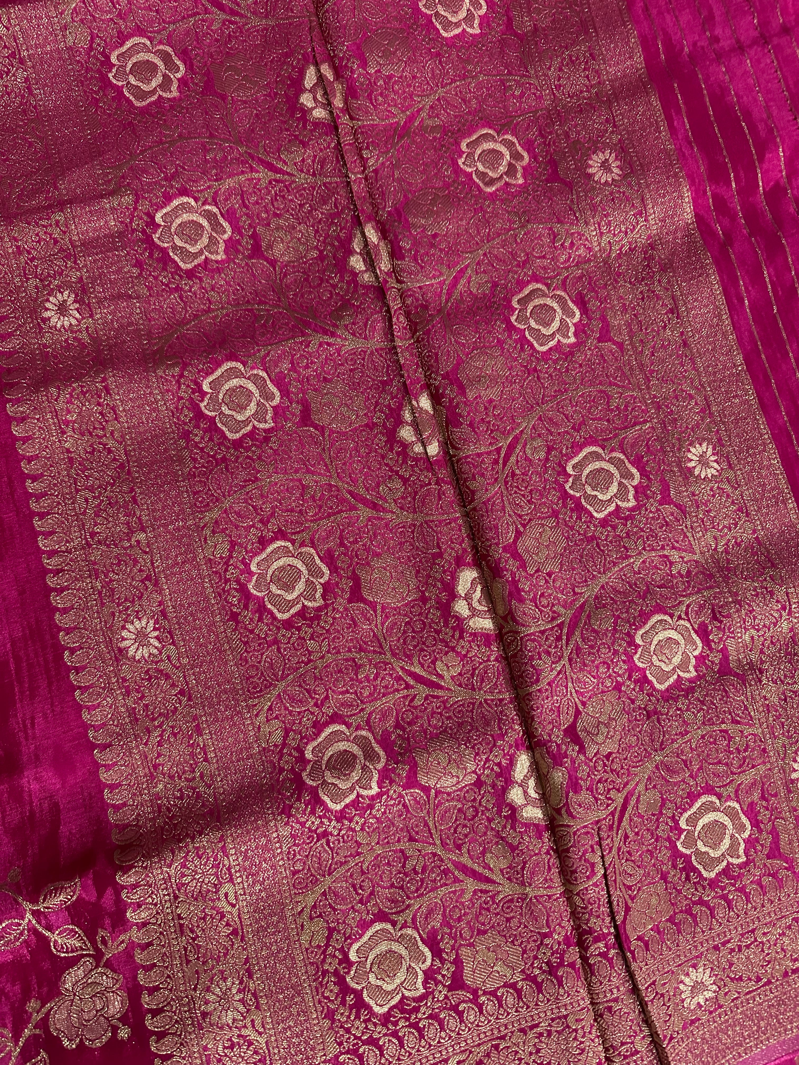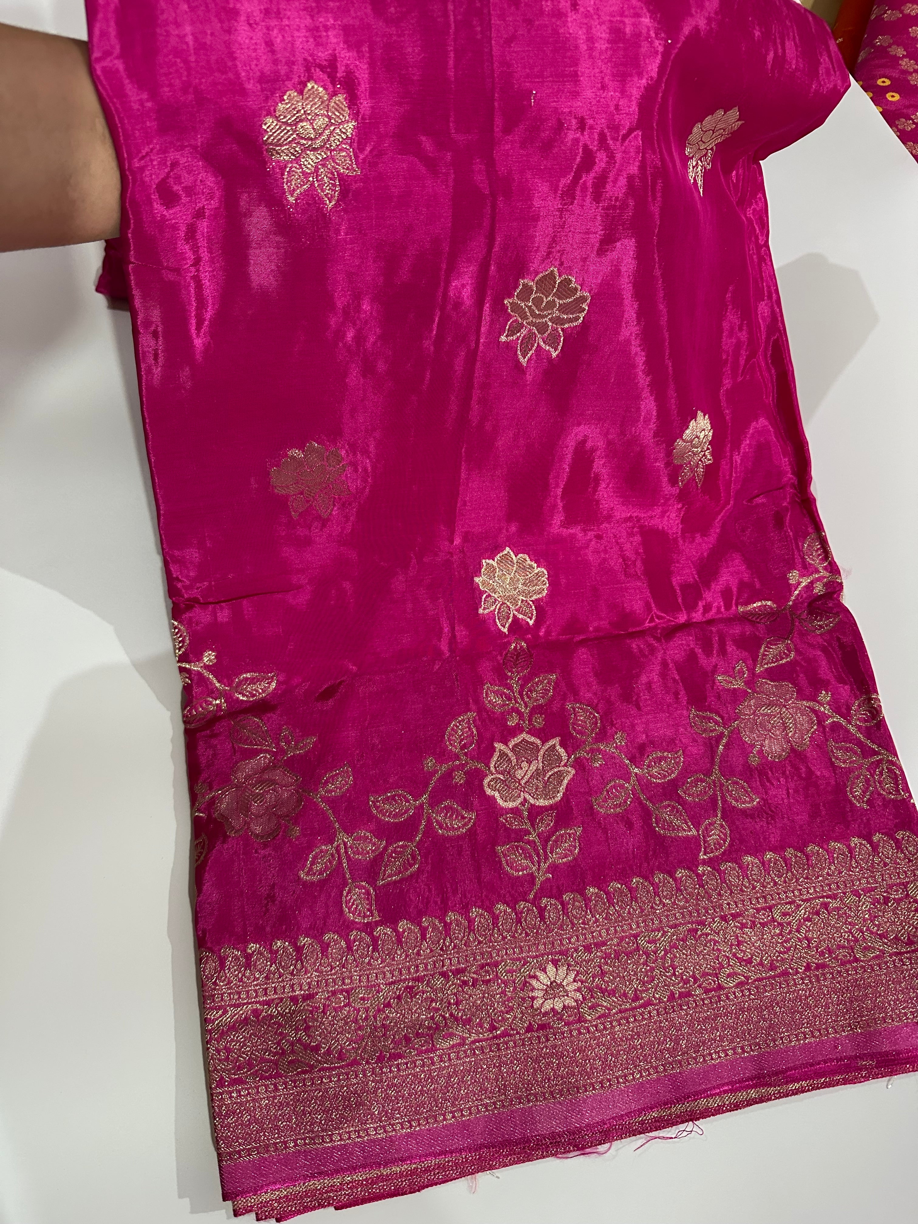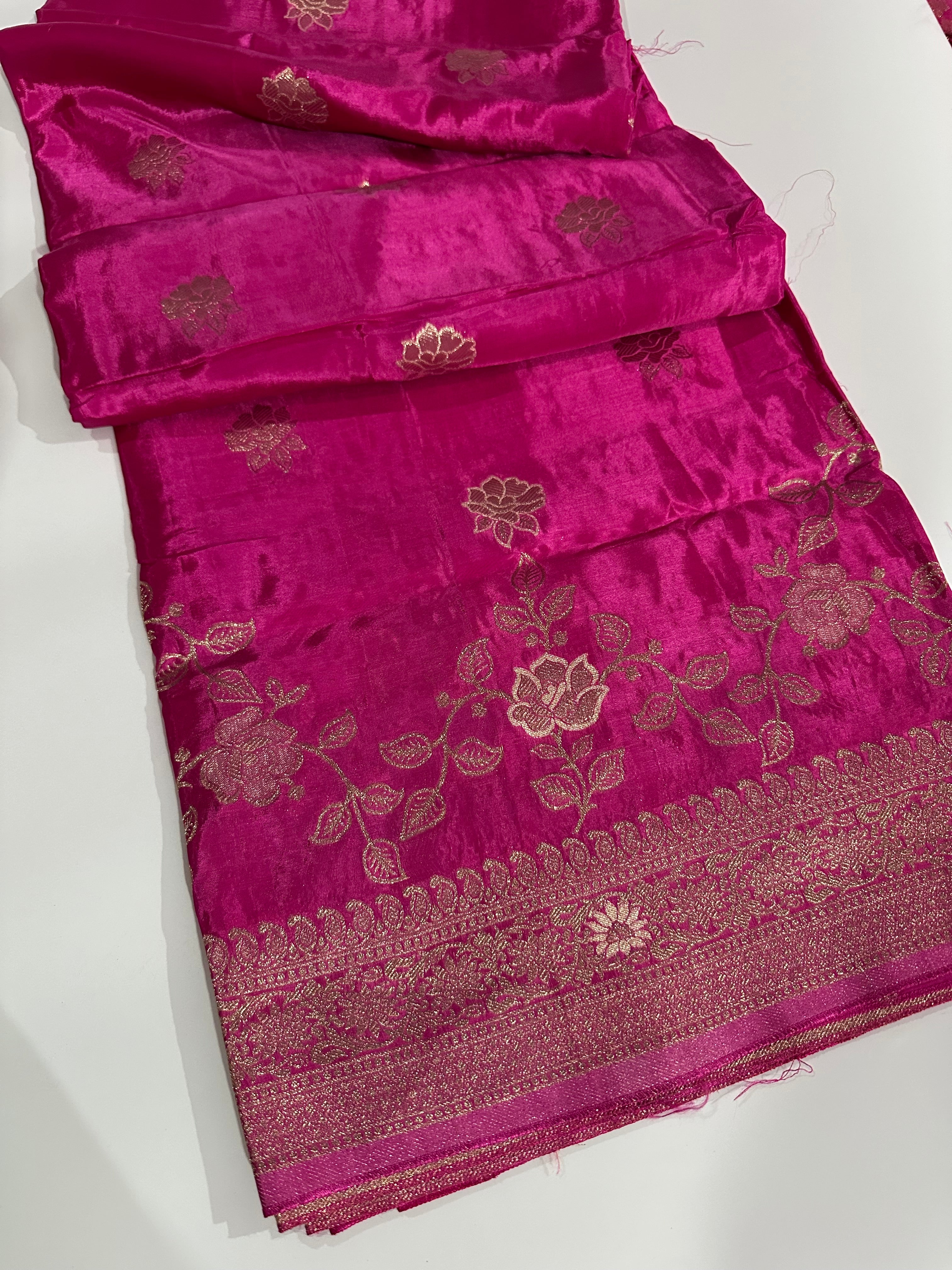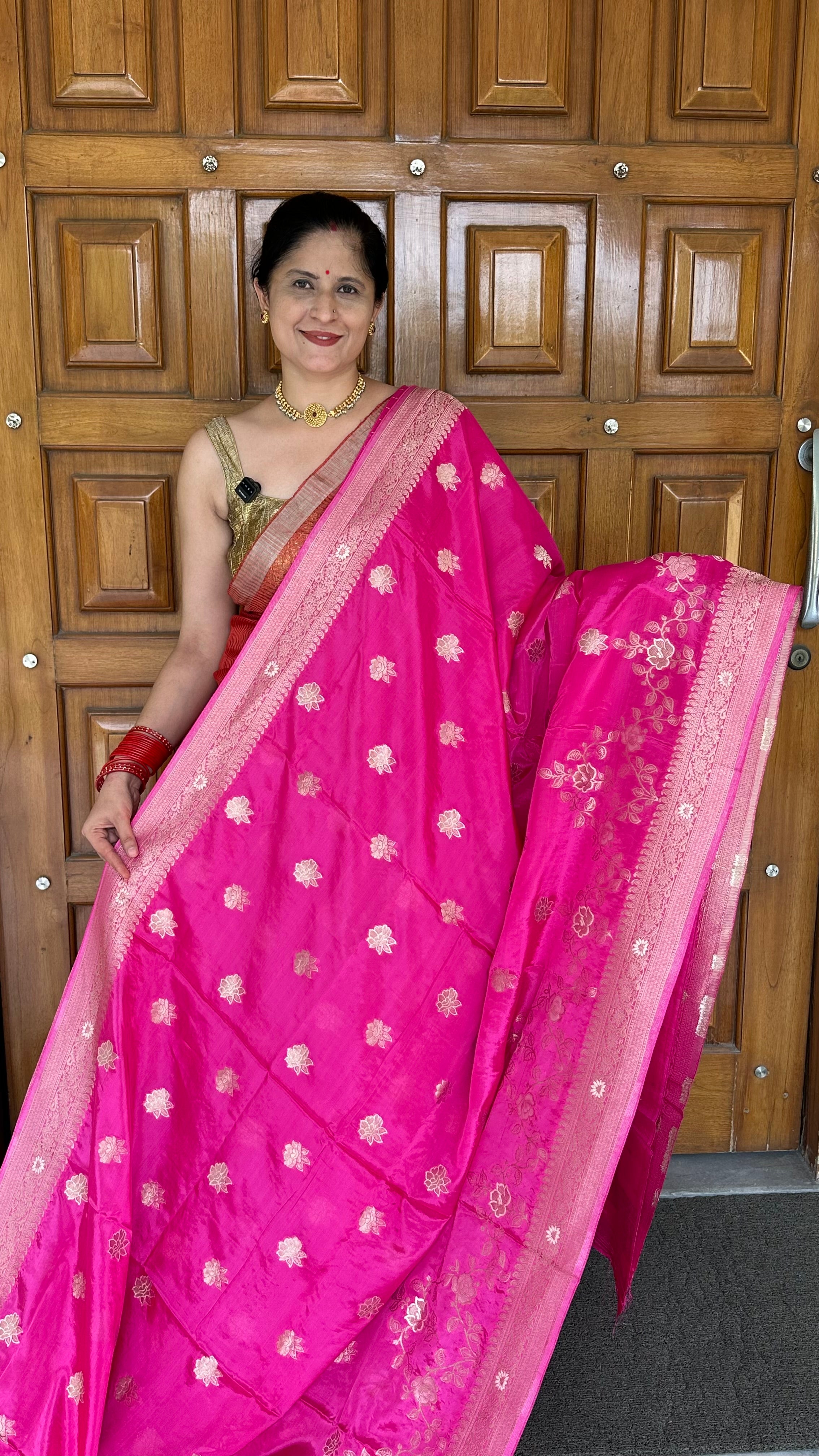 Rani Pink Pure Mashru Silk Saree with woven Zari flowers