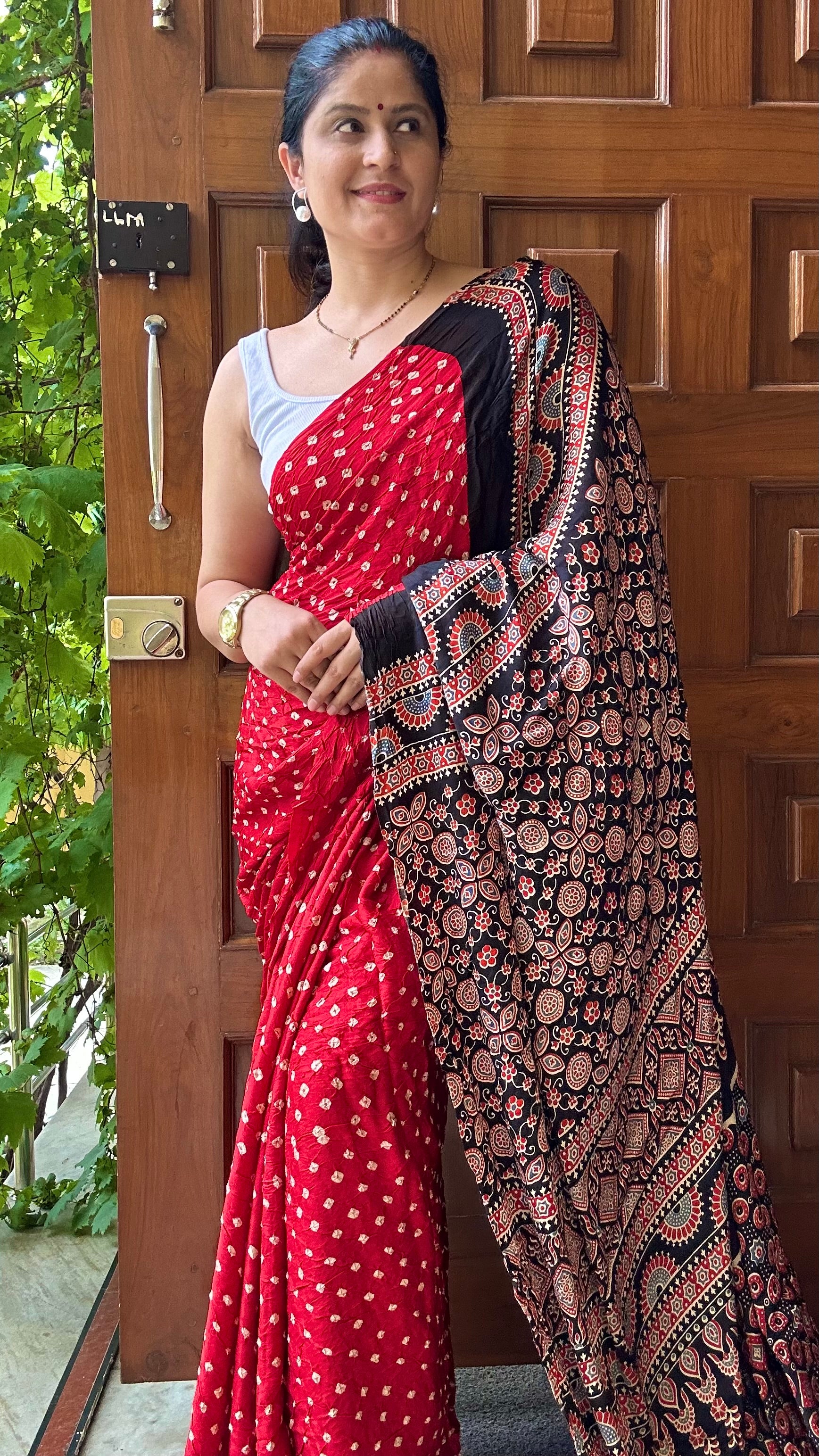 Material : Beautiful Rai bandhej saree with ajrakh handblock print pallu to style in daily wear as well as on workplace.