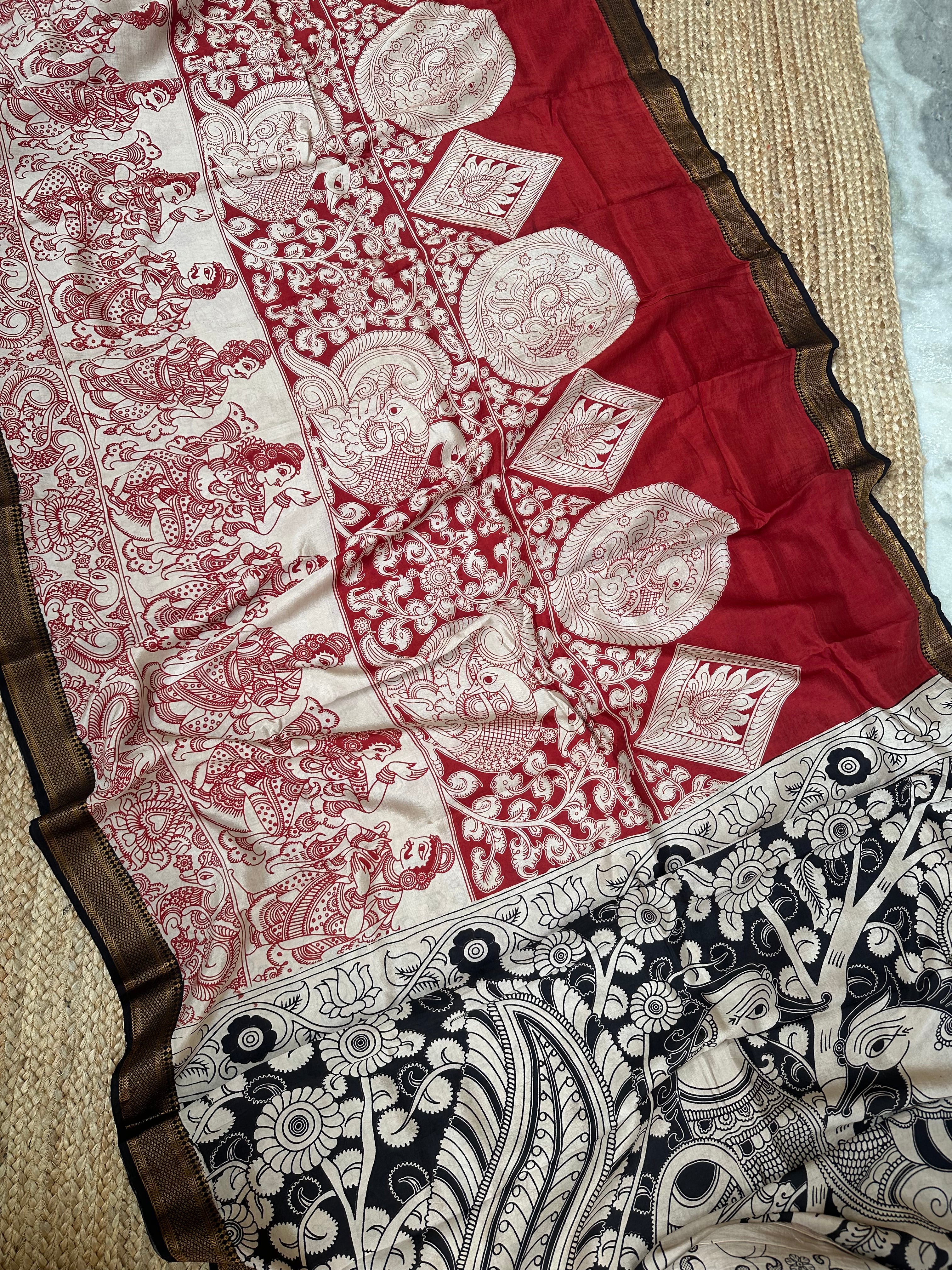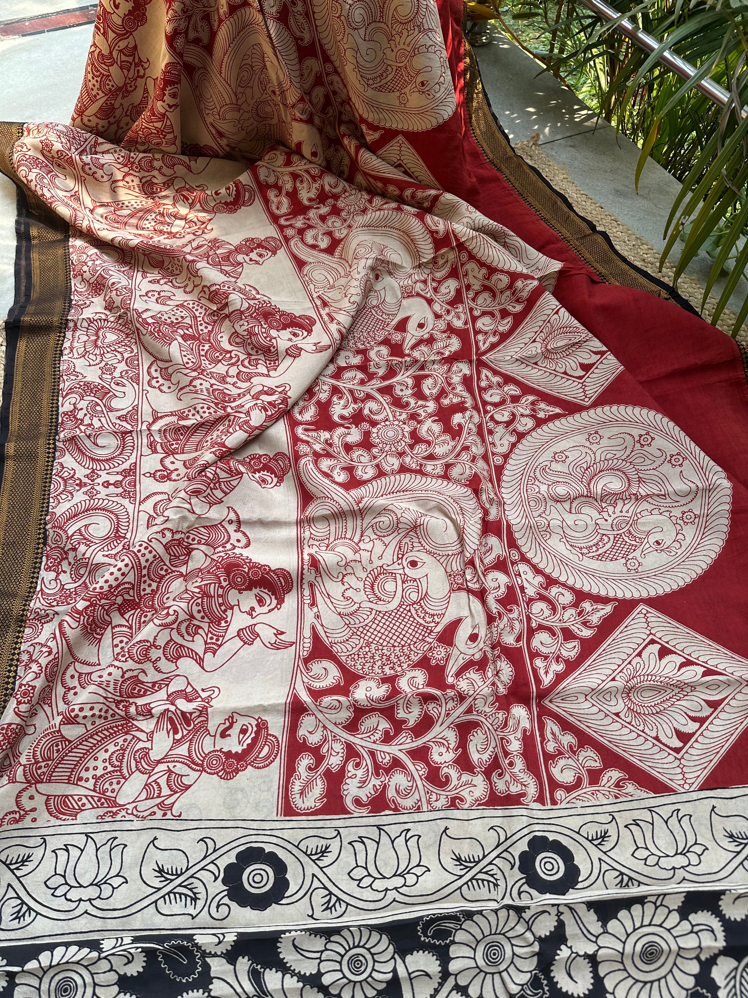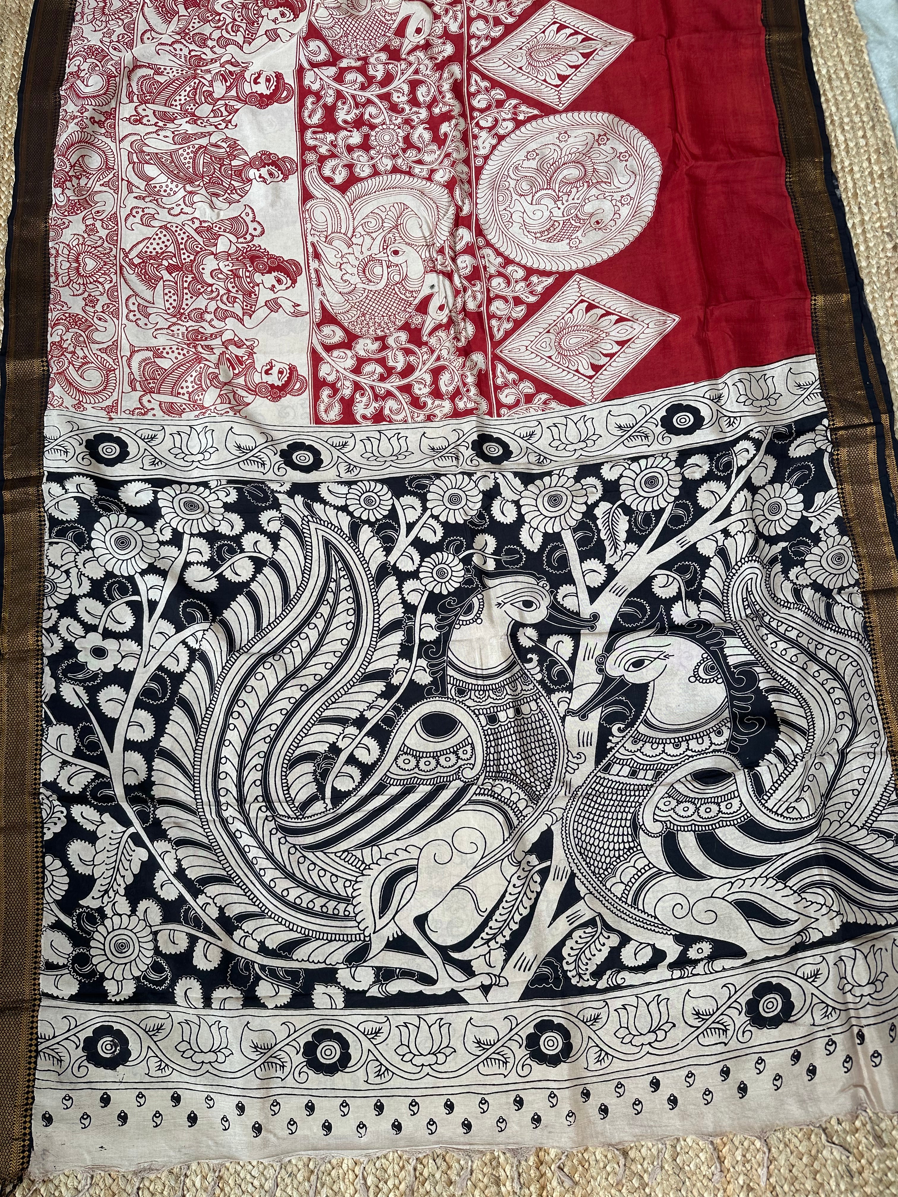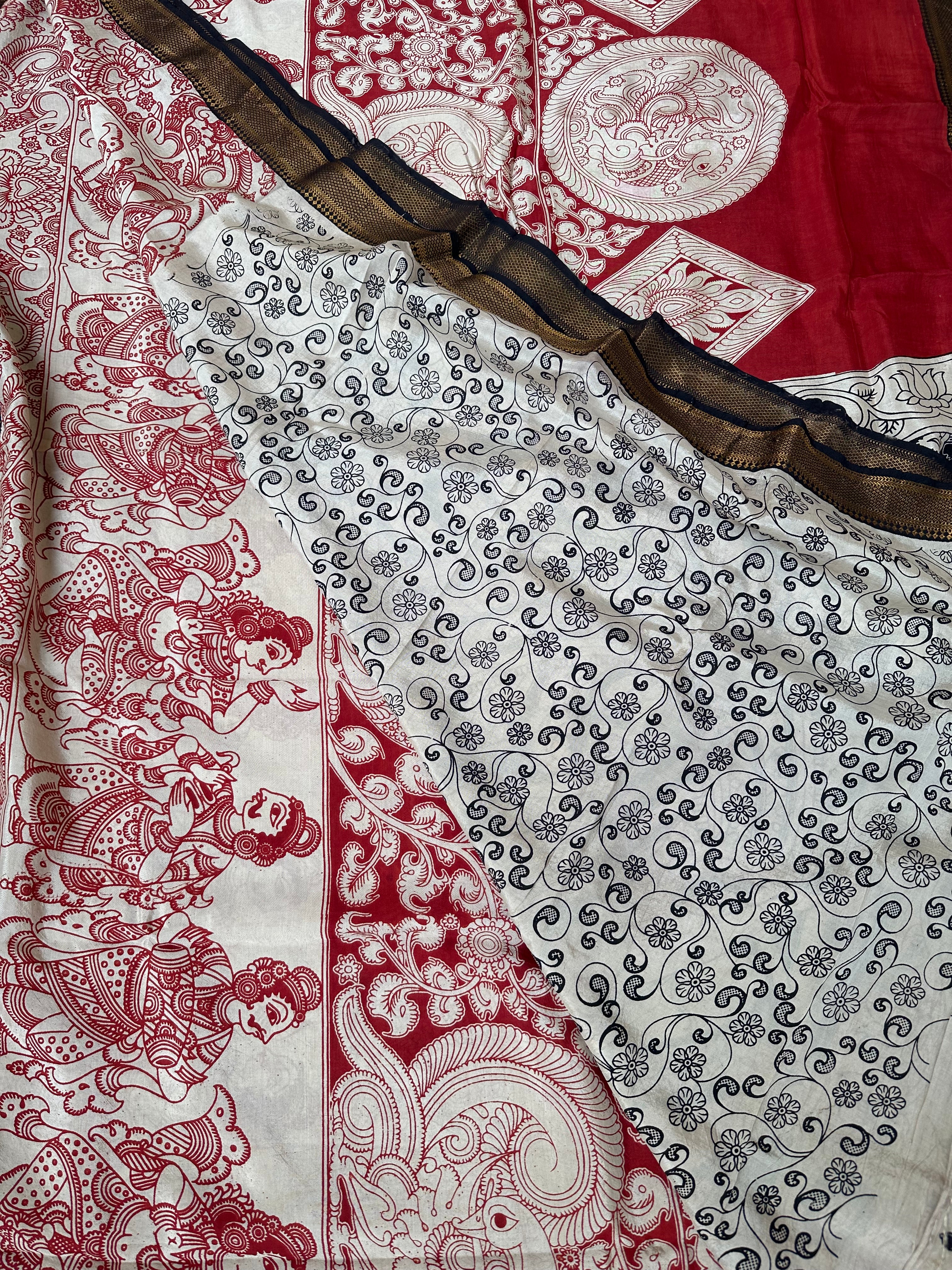 Material: Pure Chennur silk Kalamkari work saree. Very flowy fabric that you can wear in any weather.