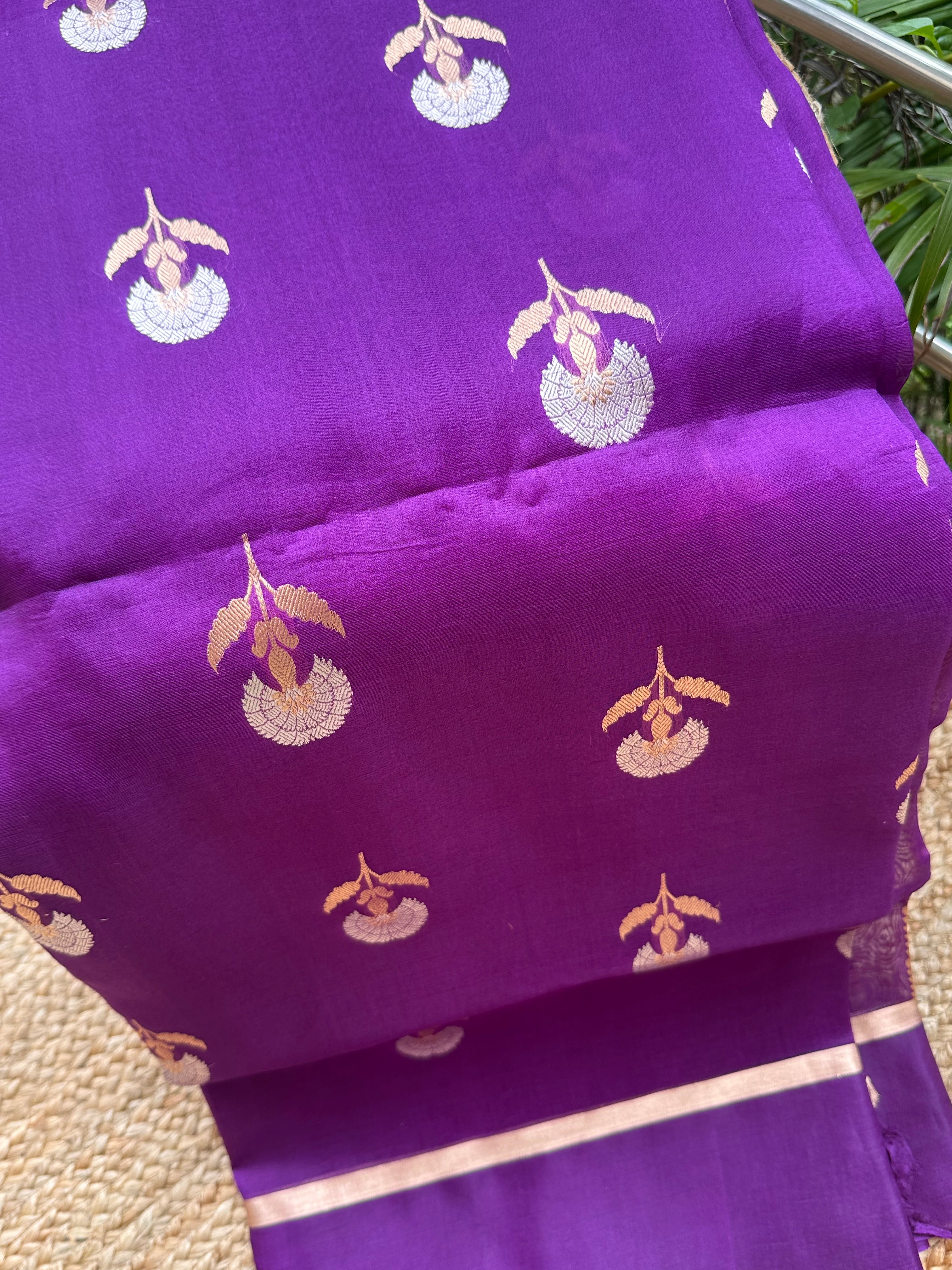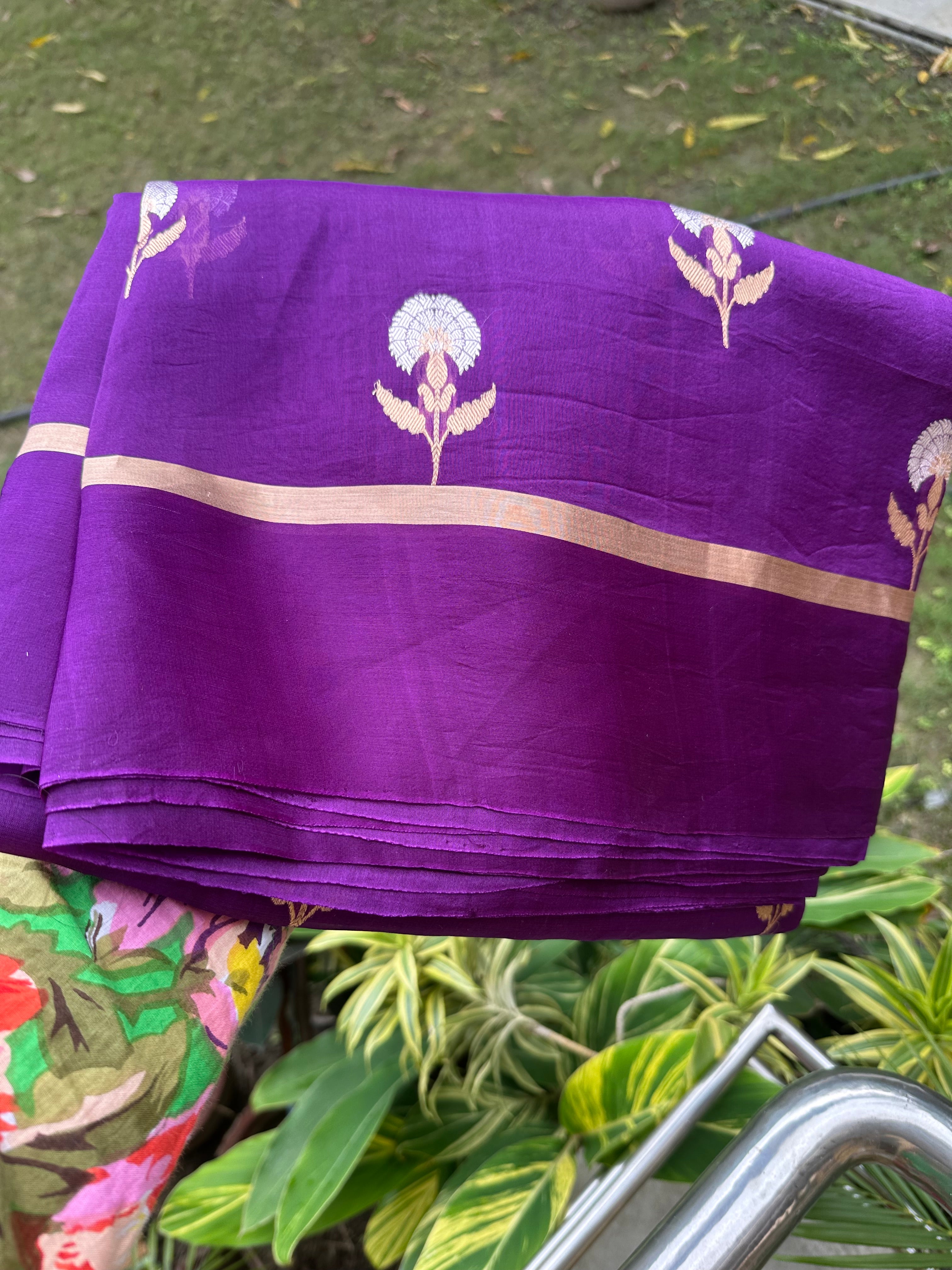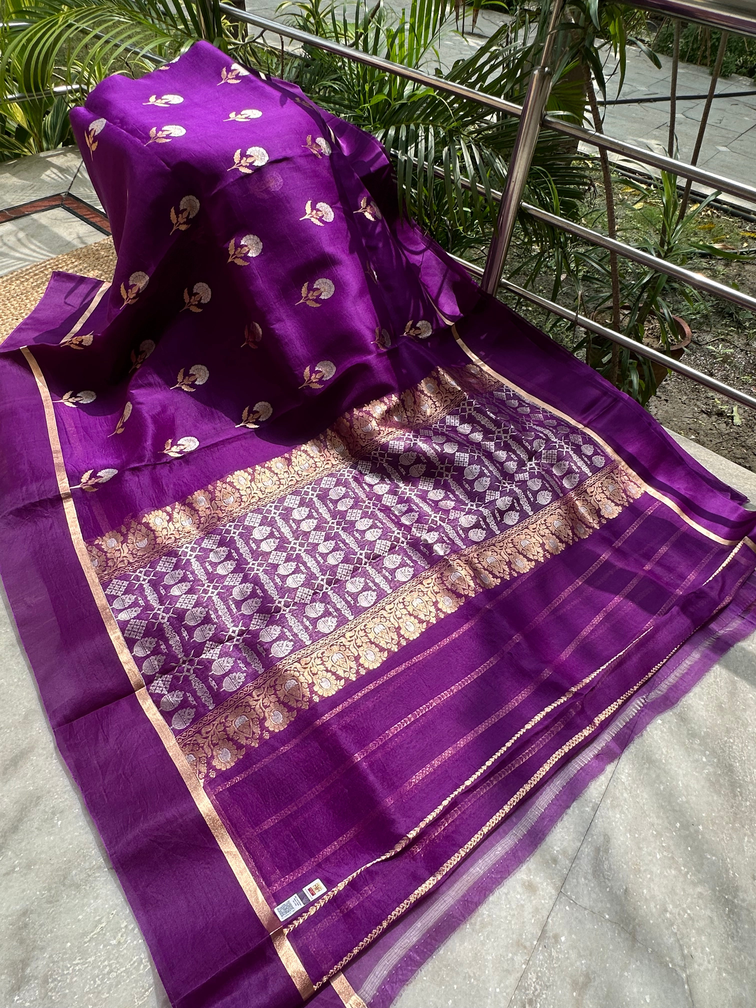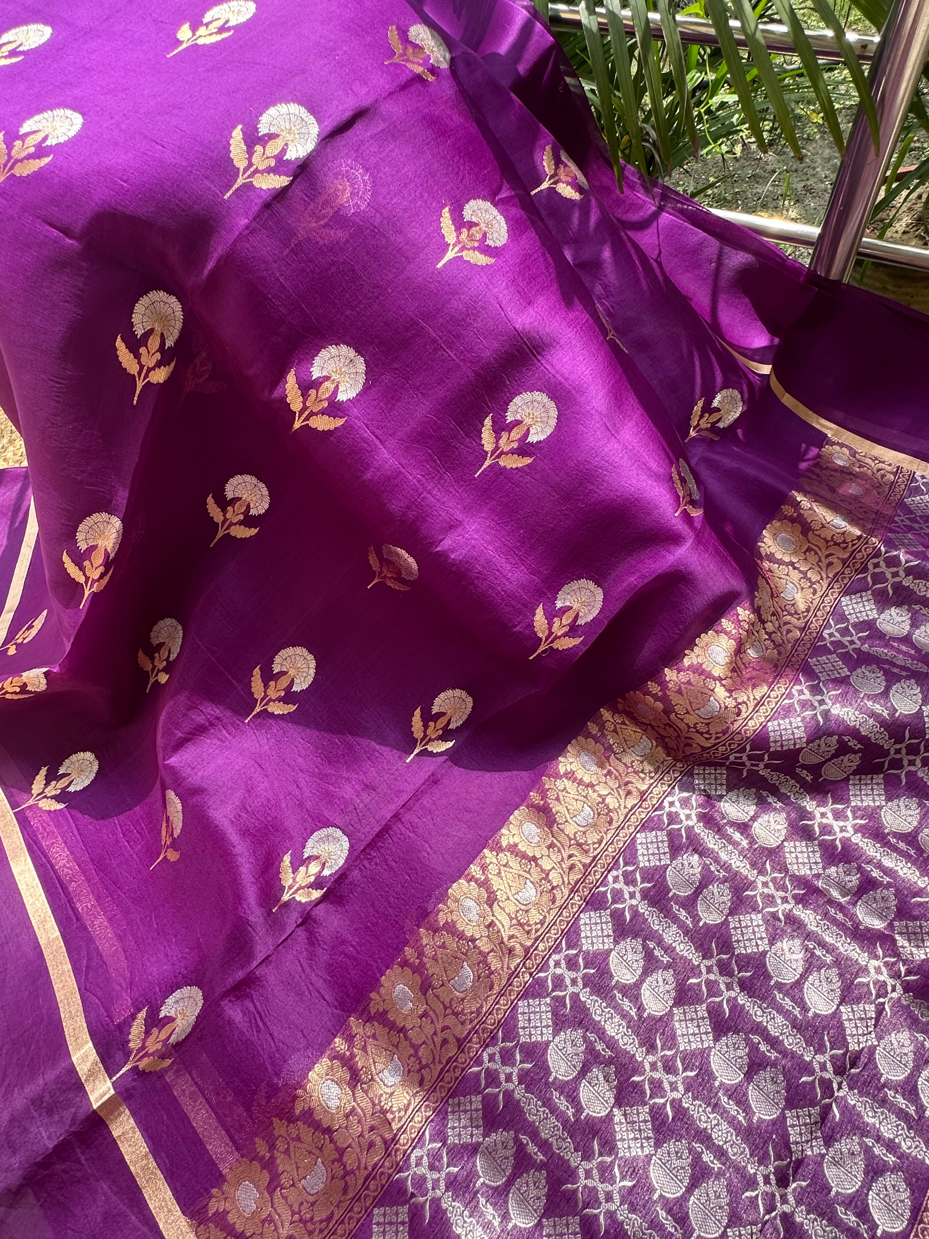 Royal Purple Pure Kora Silk Handloom Sona Rupa Kadhua Booti Saree (Silkmark certified)