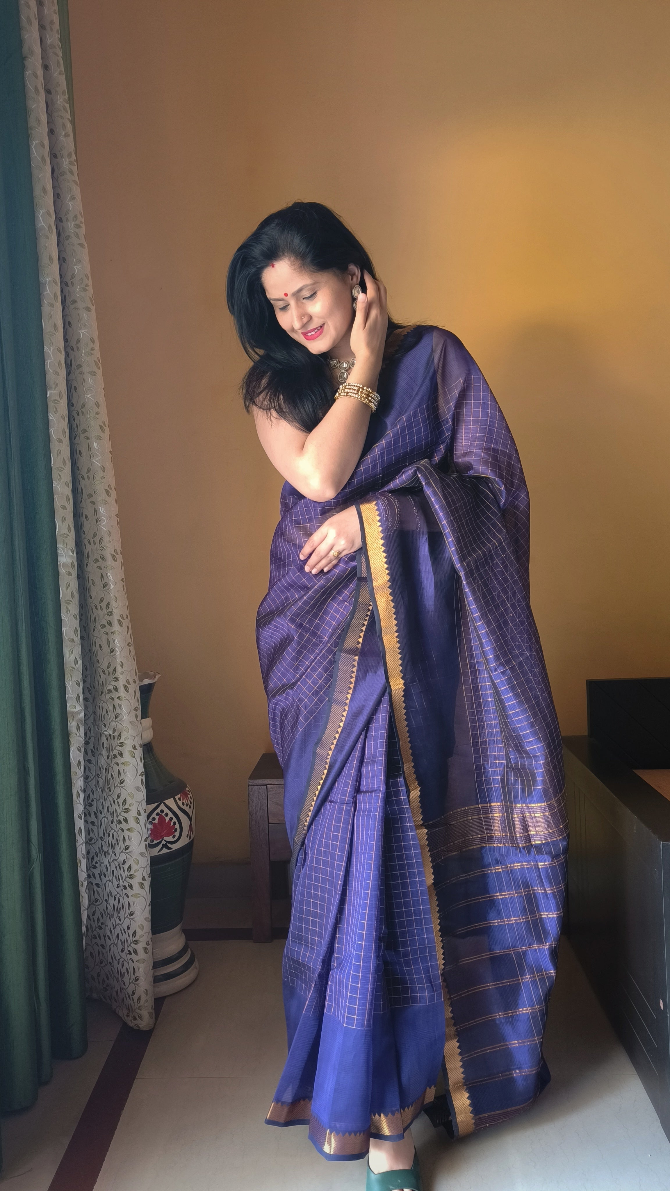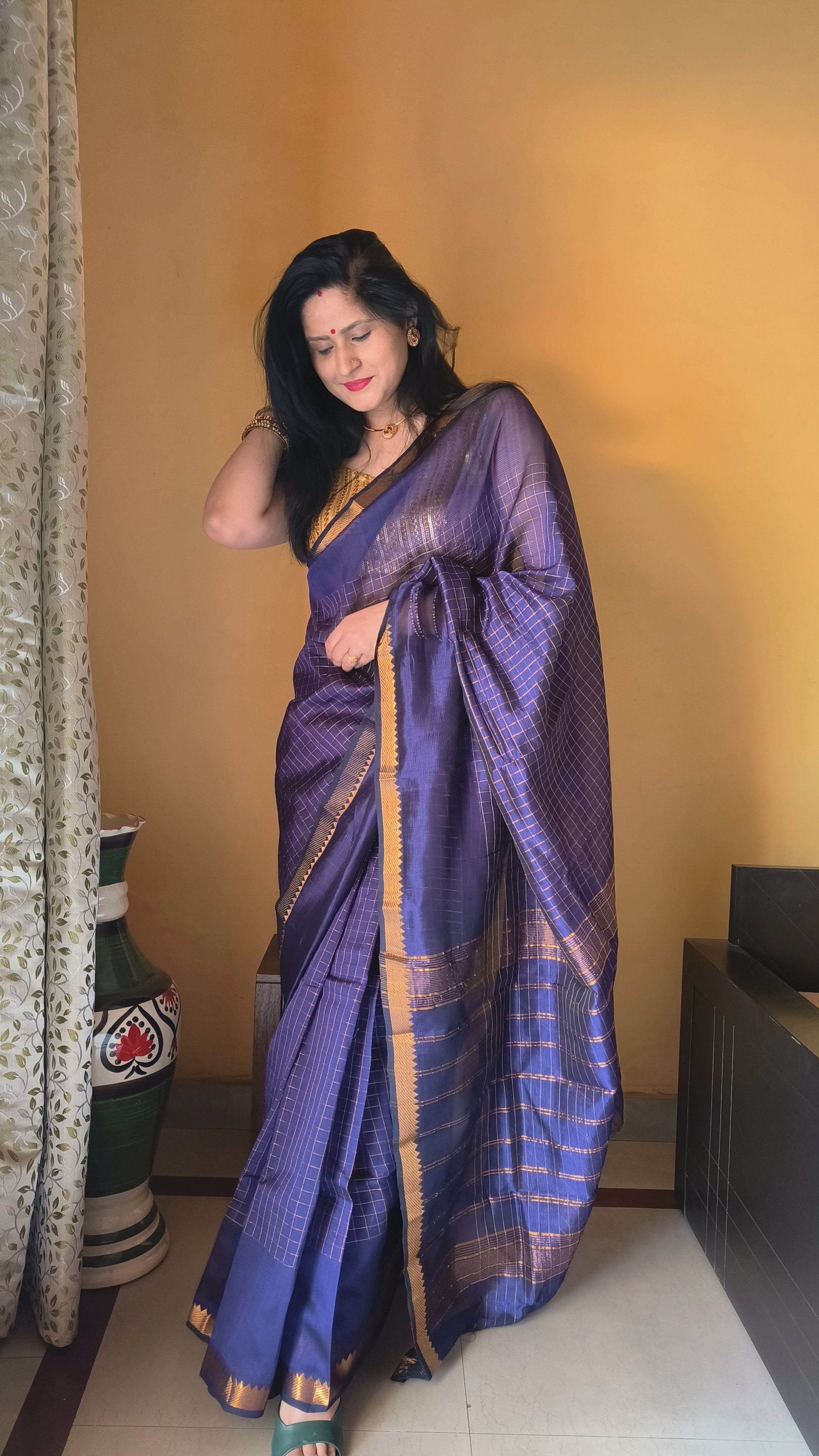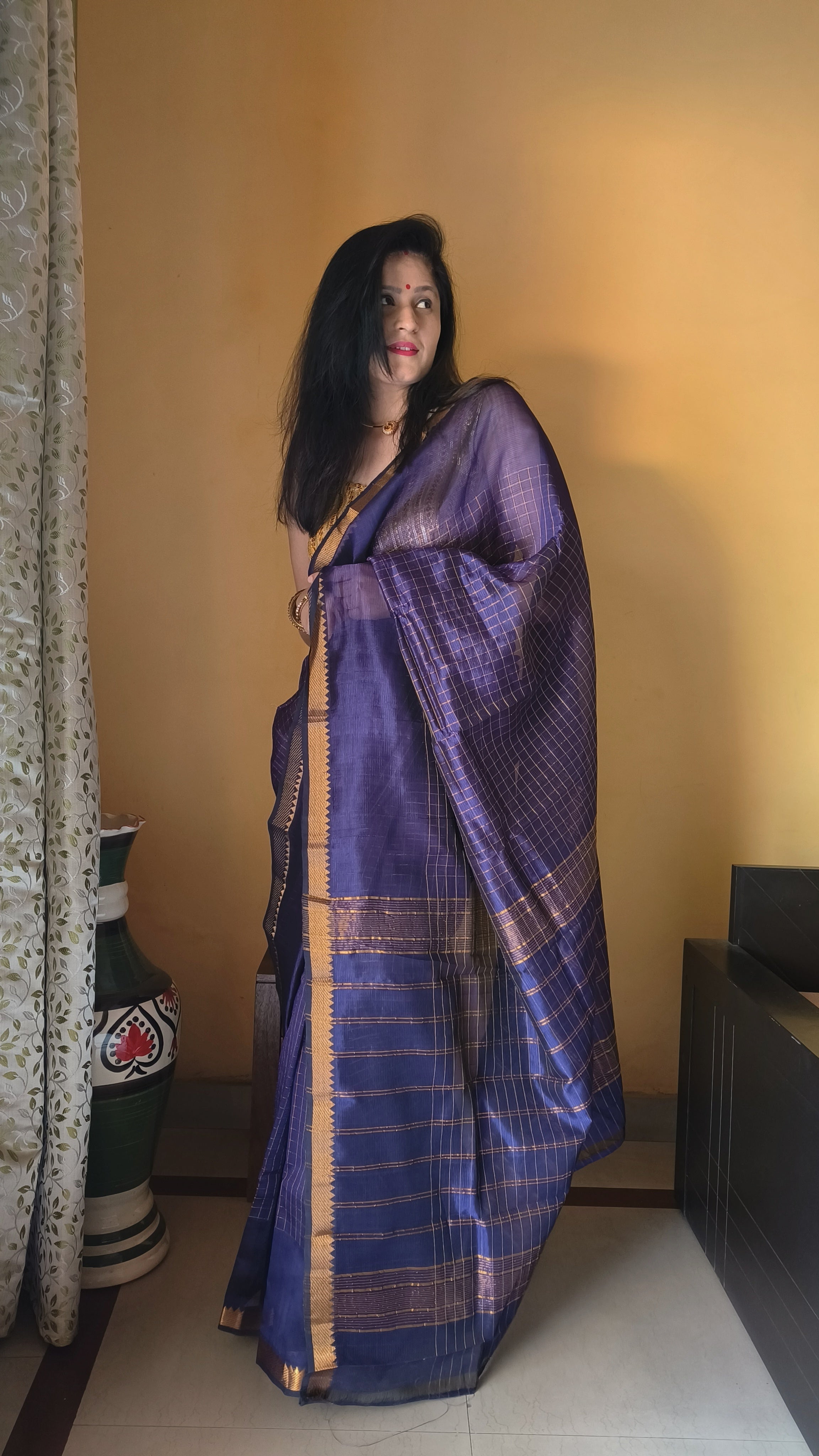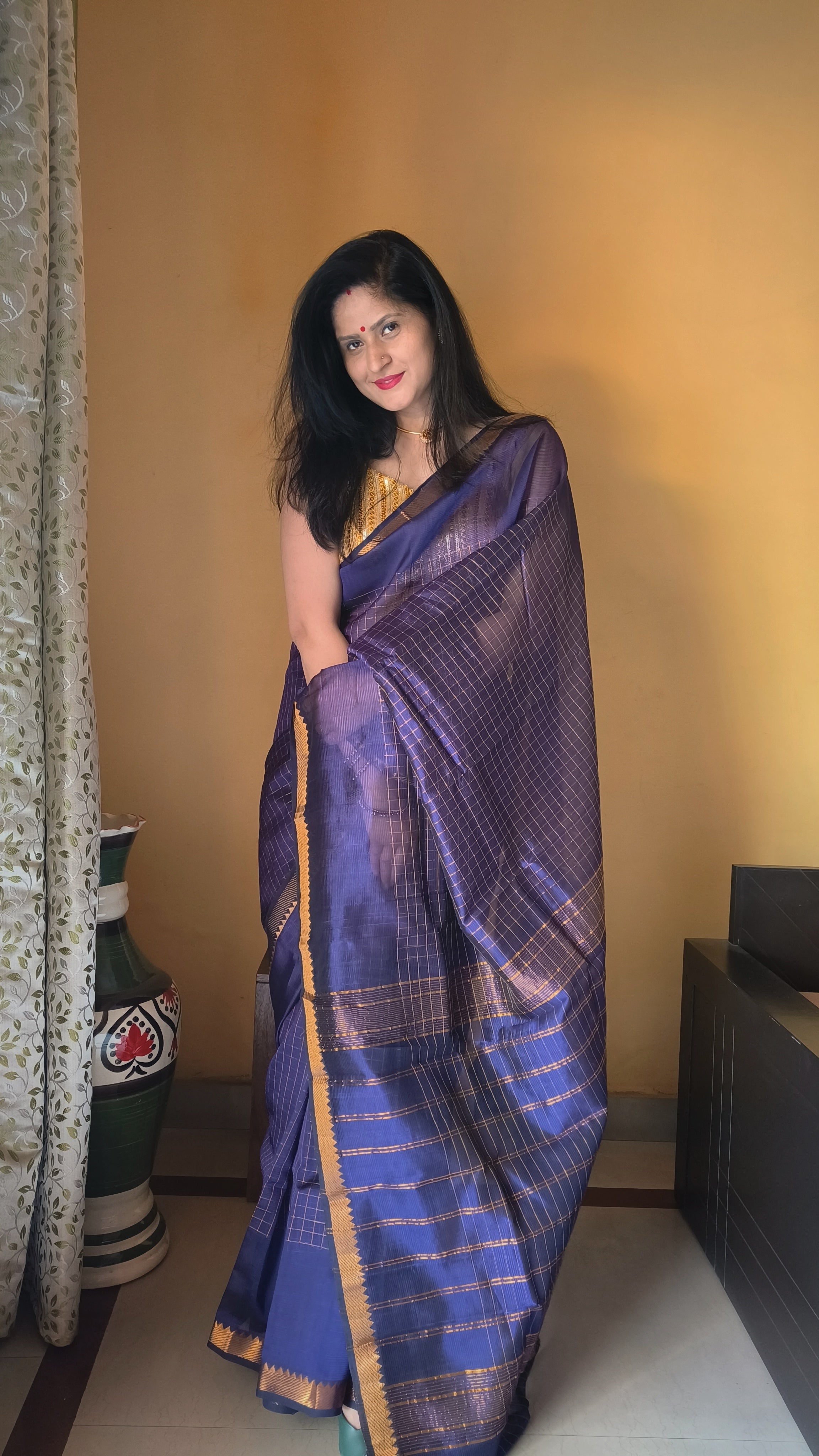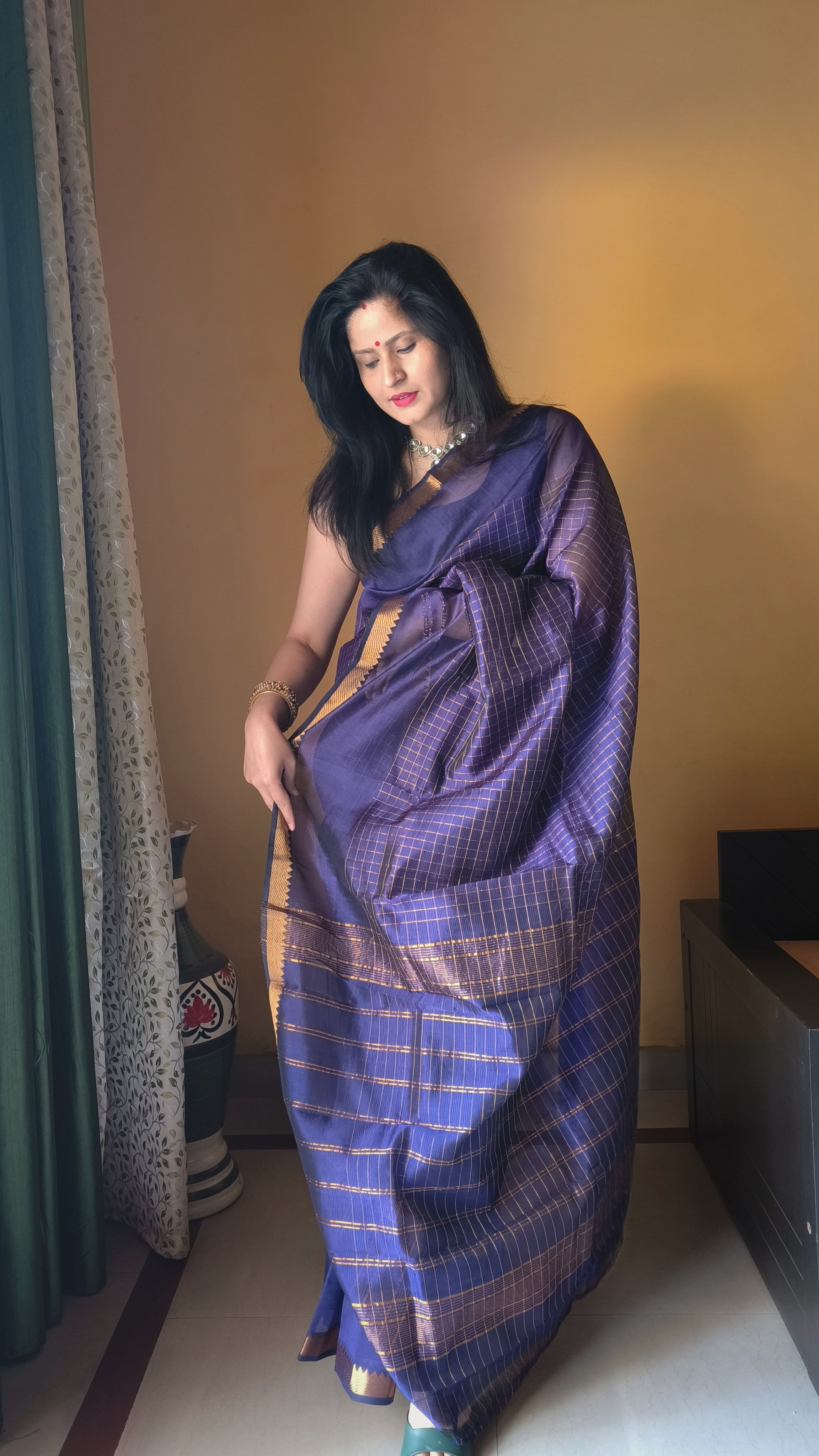 Material : Pure handloom mangalagiri sarees cotton silk. Zari checks all over. Length is 5.5 mtrs. Beautiful saree to style on any function. Temple zari border.